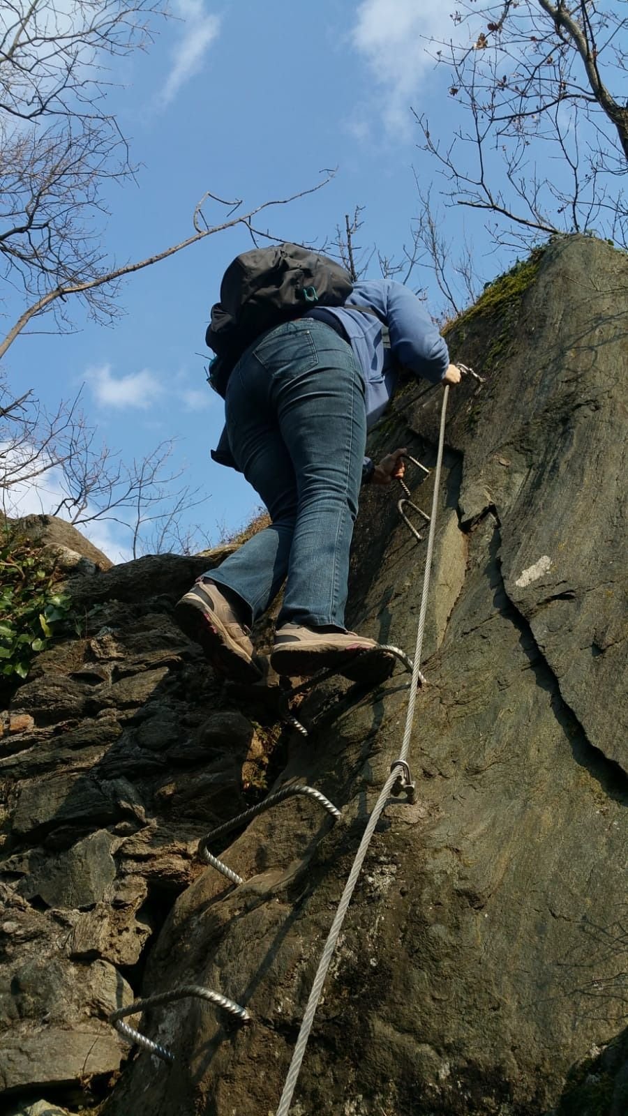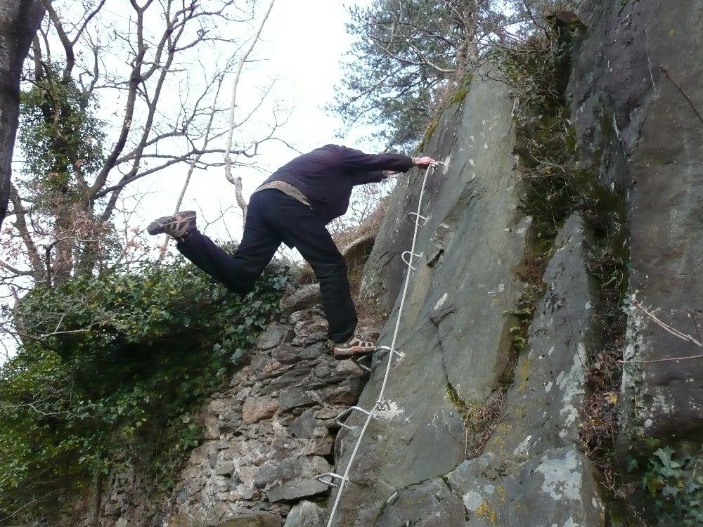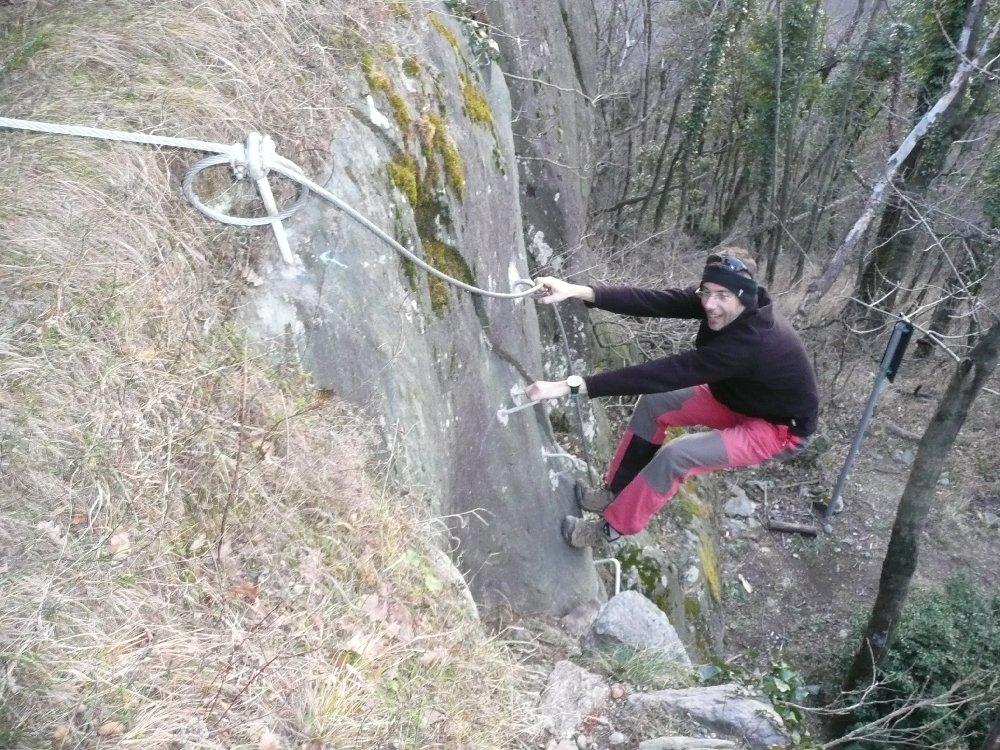 Si scende brevemente tornando nei pressi del punto in cui si era abbandonata la traccia principale. Si segue ora la traccia in discesa dove un cartello ci avverte del tratto attrezzato che dovremo affrontare.