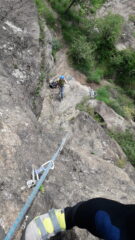 Salgo nudo all’estremita’ sinistra di questo imponente muro offre invece un arrampicata piu’ fisica. Alle braccia spetta il compito arduo di staccarsi da terra e procedere verticalmente fino alla catena, fortunatamente non lontana da raggiungere. La via non sviluppa piu’ di una 15na di metri, per cui anche se non troppo allenati, grazie anche all’abbondanza di ottime prese, molto basso e’ il rischio di cedere alla tentazione di attaccarsi al chiodo.