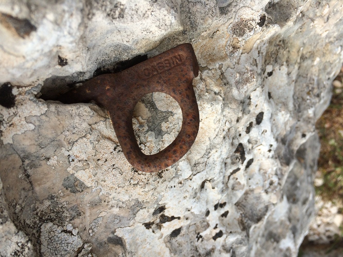 La roccia è di difficile chiodatura (fessure cieche o troppo larghe) ma ben si presta alla posa di protezioni veloci.