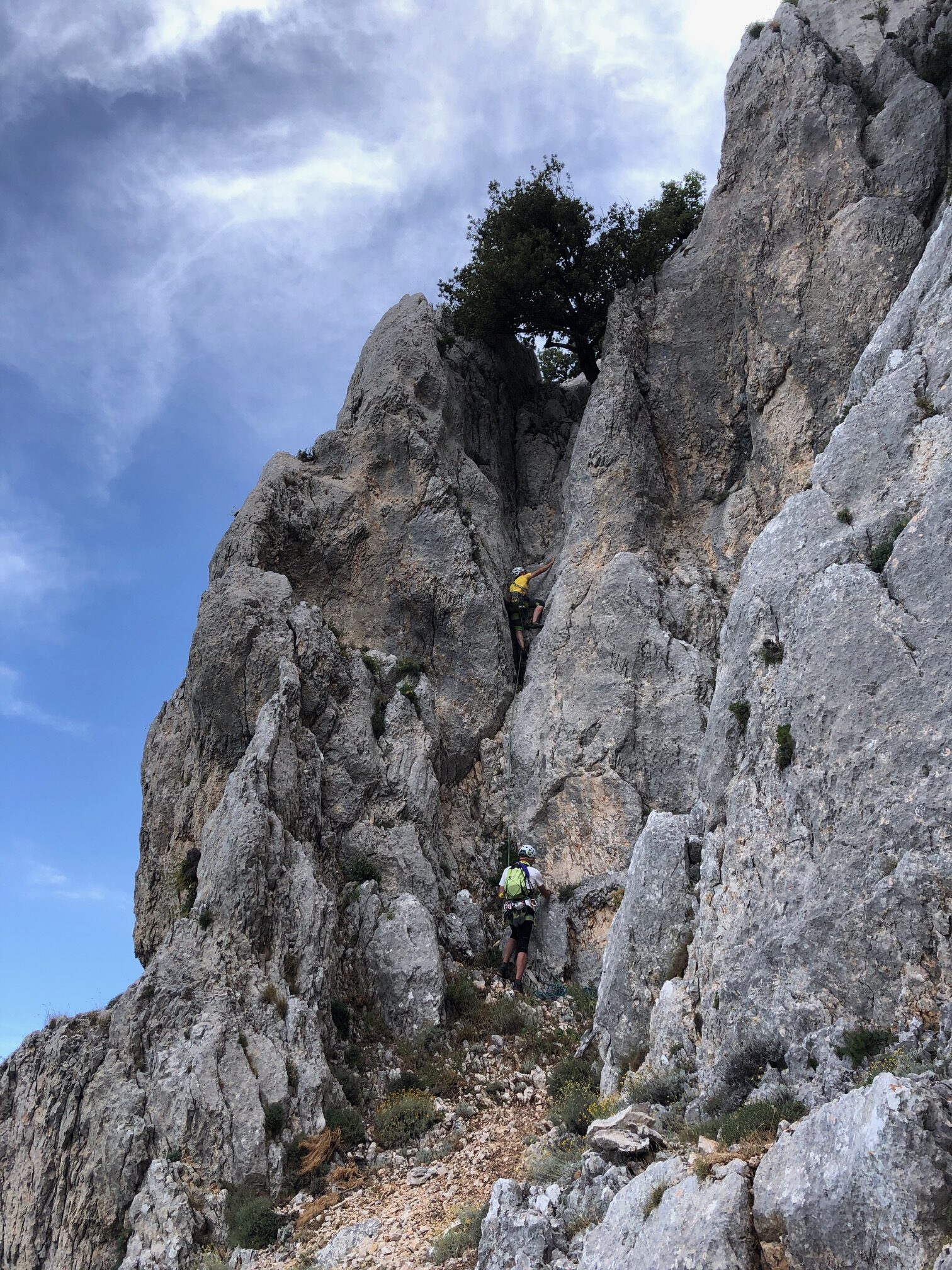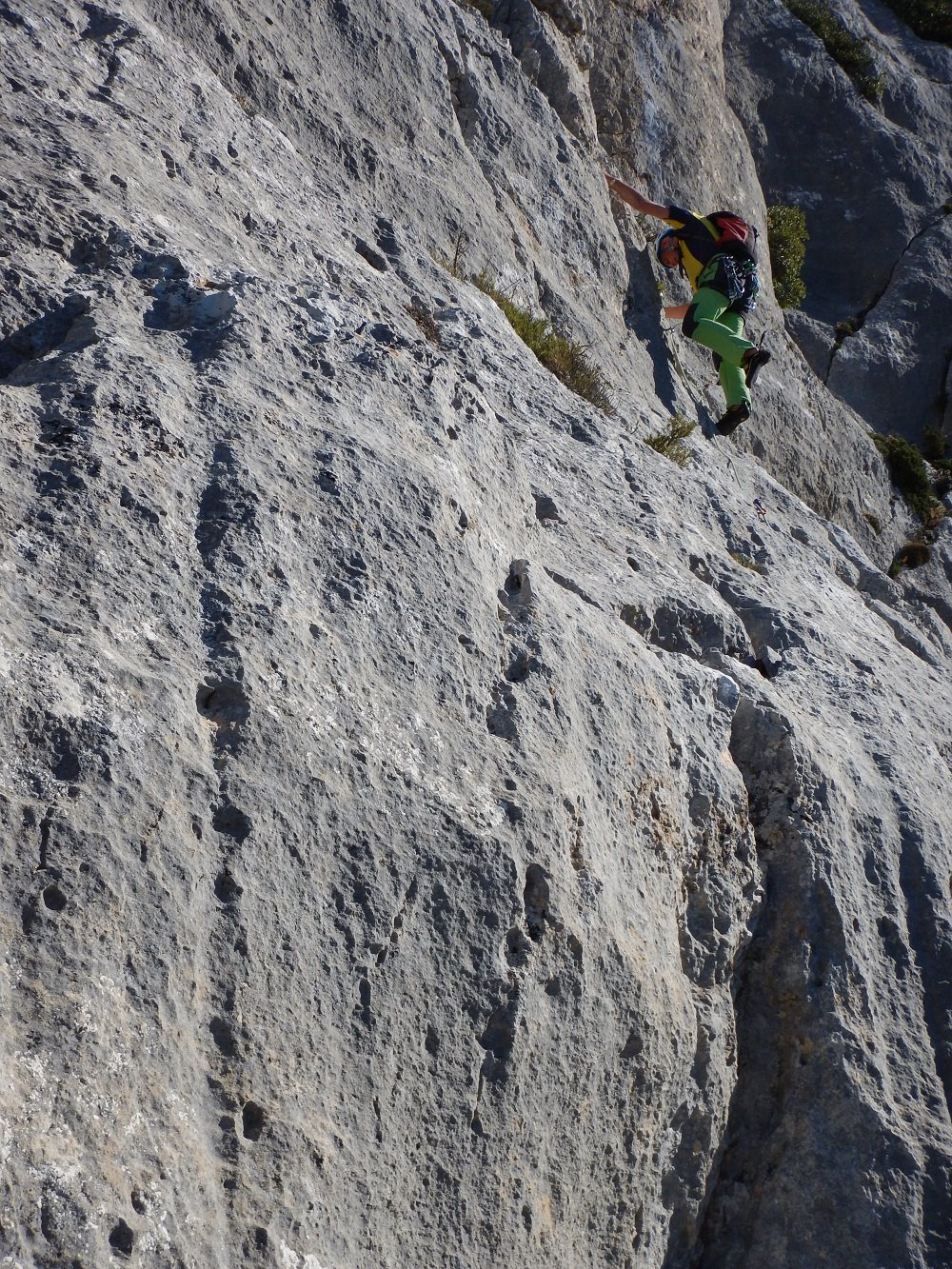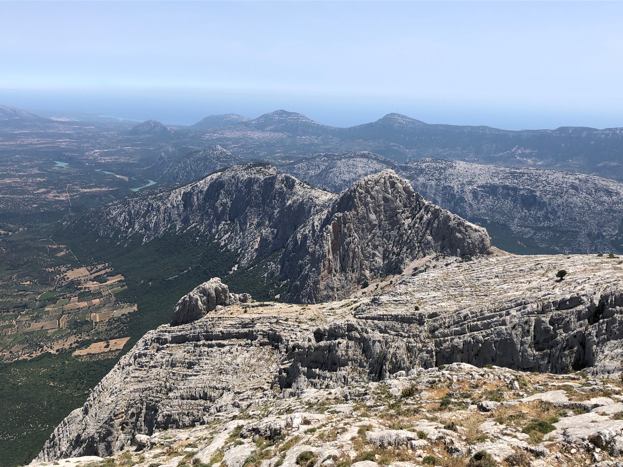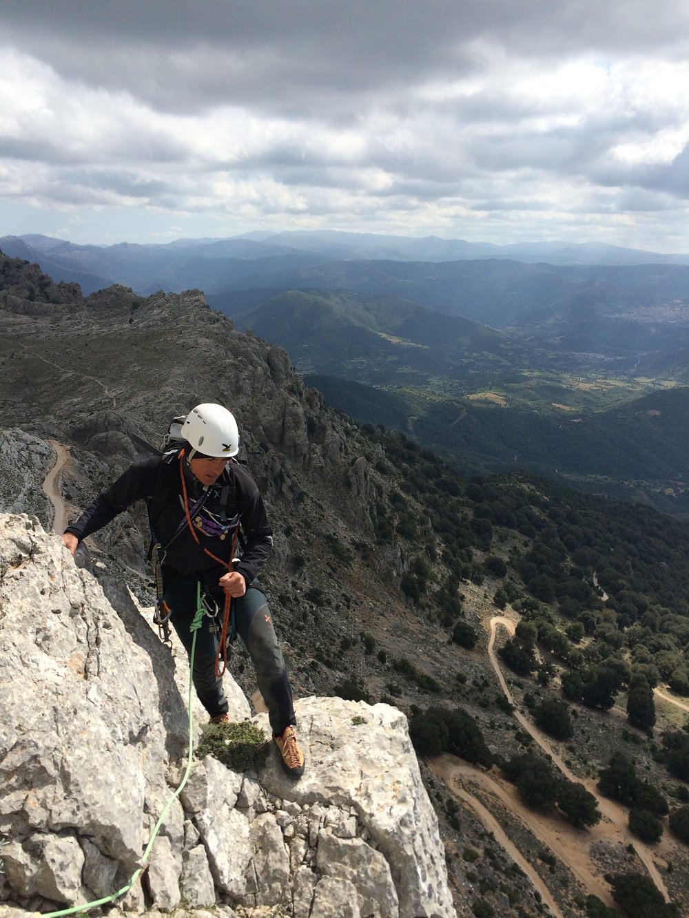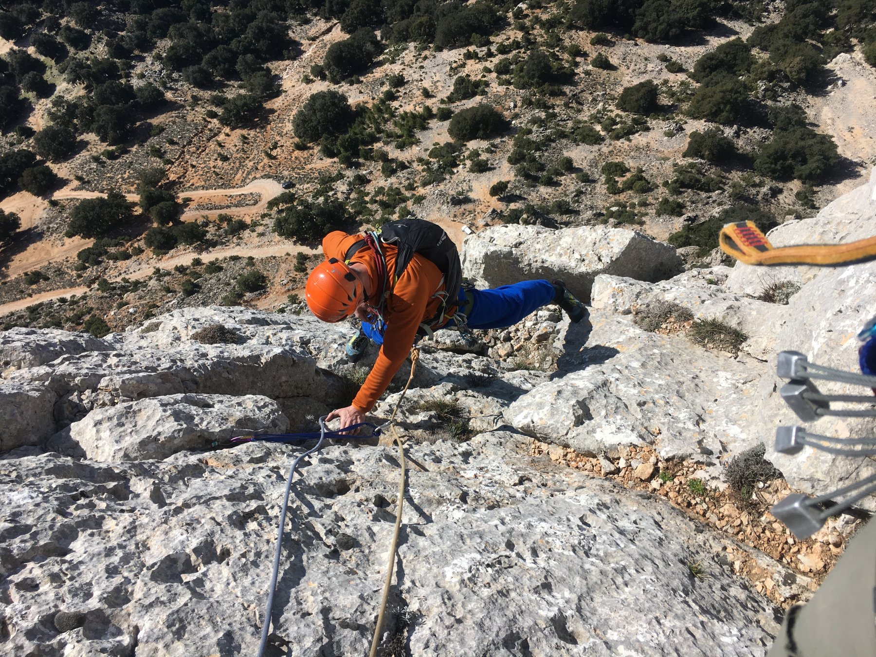 Ripresa la cresta sommitale, si scende ad una vaga selletta, da dove si riprende a salire su rocce più compatte ma sempre ben articolate, fino al termine della parete, dove lo sguardo spazia sull’intera conca del Supramonte (II e III; sosta fra i massi della cima su 1 ch. molto vecchio, da rinforzare con protezioni veloci).