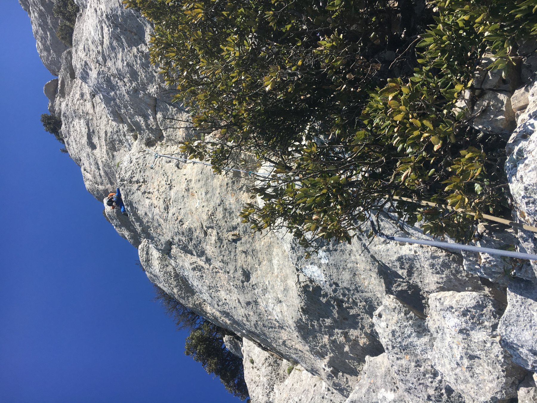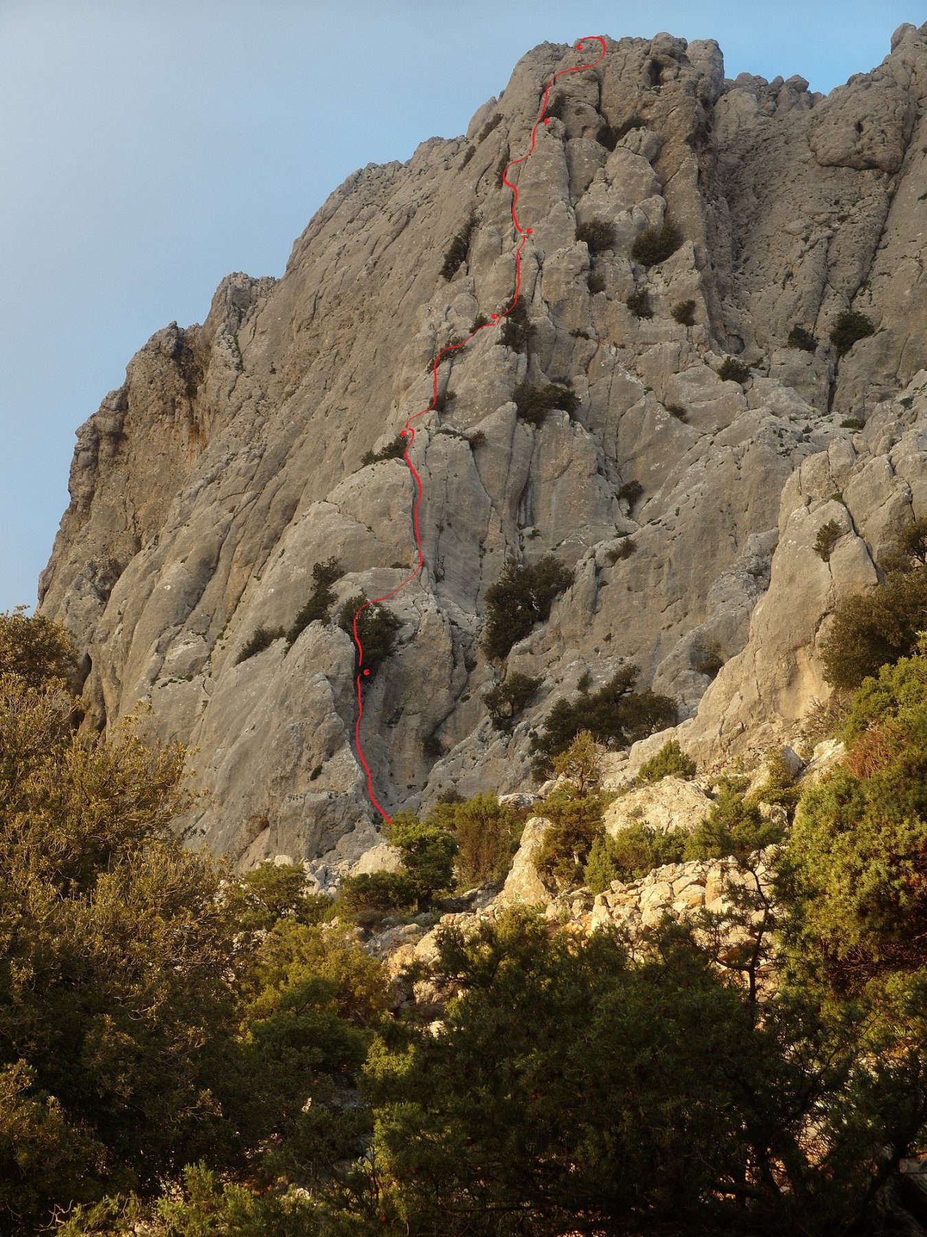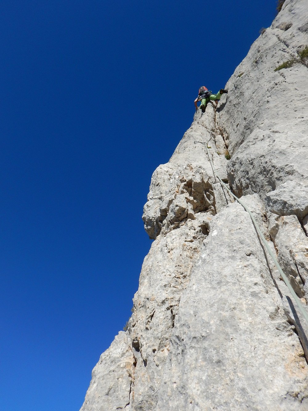 Si sale alla radice della fessura verticale, che si vince con arrampicata breve ma sostenuta (IV poi V+; bella clessidra alla radice della fessura; poi 2 ch., di cui il primo molto vecchio, e 1 spit a sx della fessura). All’uscita si prosegue verso un più alto terrazzino, a dx del margine affilato di alcuni scudi di roccia (II/III; sosta su catena).
