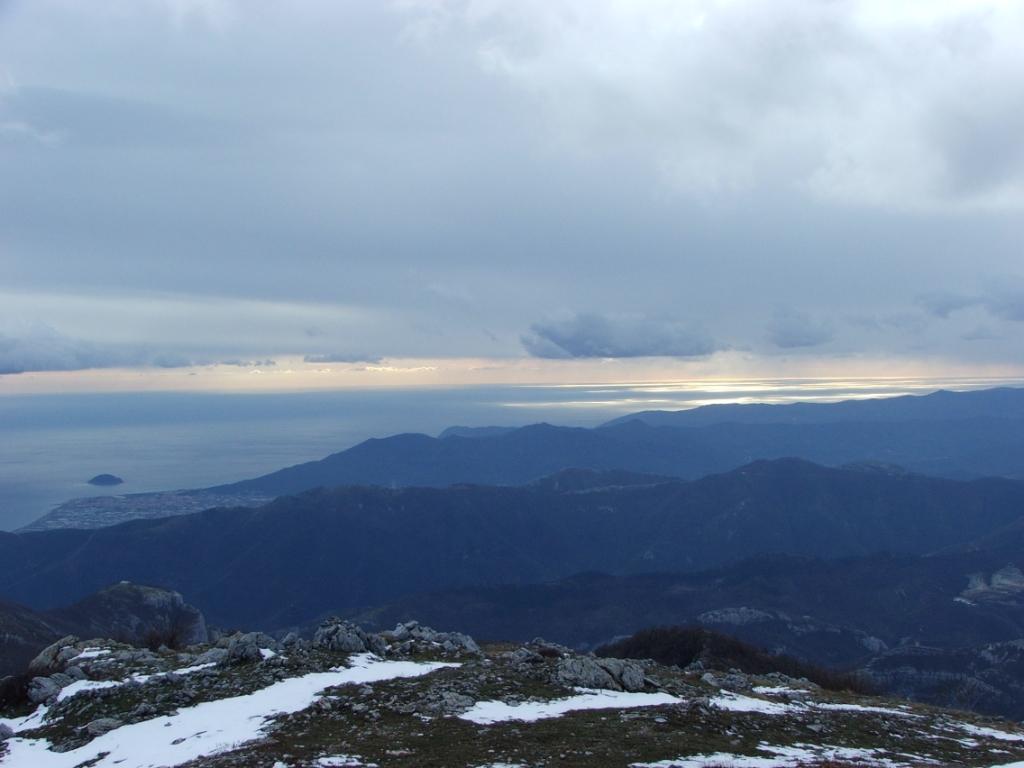 Siamo partiti alle 11 dal Giogo. Le previsioni si sono rivelate troppo ottimistiche: il tempo si è guastato quasi subito e la neve, già presente sulla parte alta del percorso, ha iniziato a scendere intorno alle 1230. Dalla vetta bellissimo panorama sul mare e sulle Alpi Liguri innevate, ma solo il tempo sufficiente per qualche foto. Bellissima discesa nel bosco innevato per i primi 150m cdi dislivello. Bella la discesa sulla strada sterrata. Riposante il tratto in piano da Principi al Giogo di Toirano.