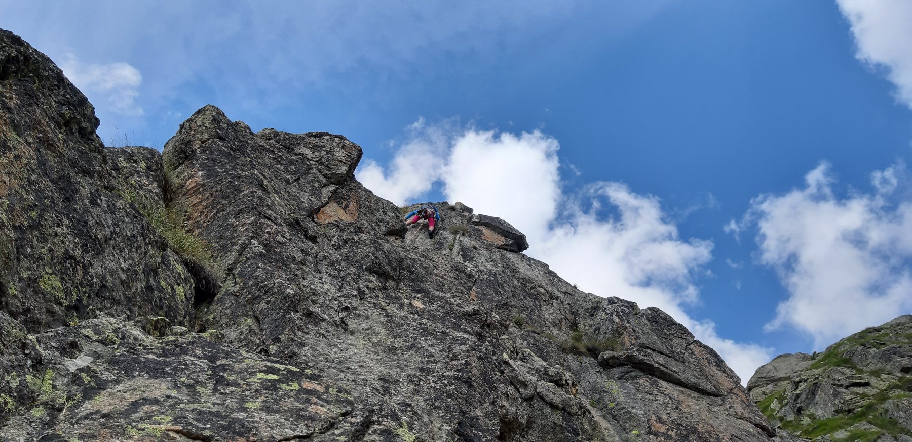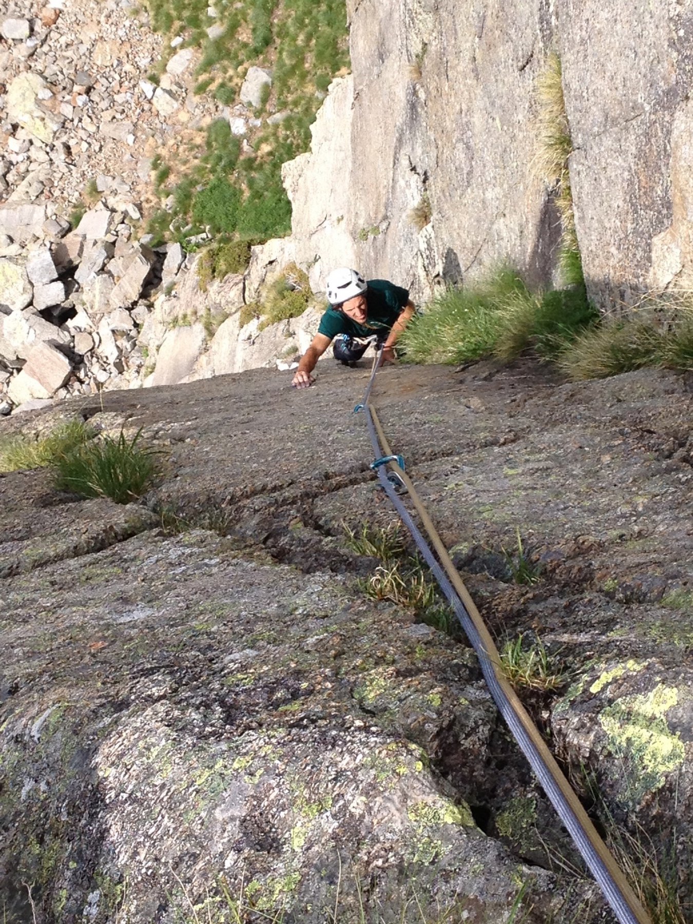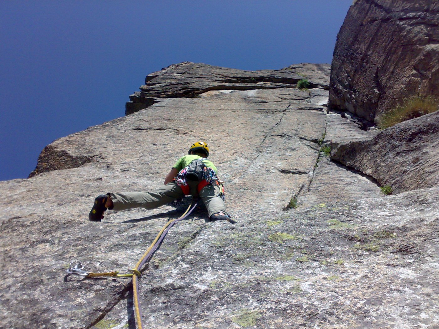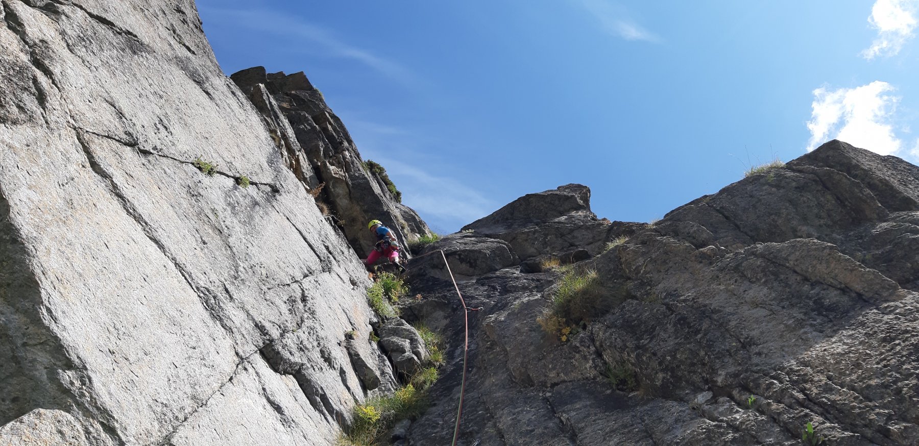 L1 muro ben ammanigliato, tettino e rampa ascendente verso destra (5+, 25 m)