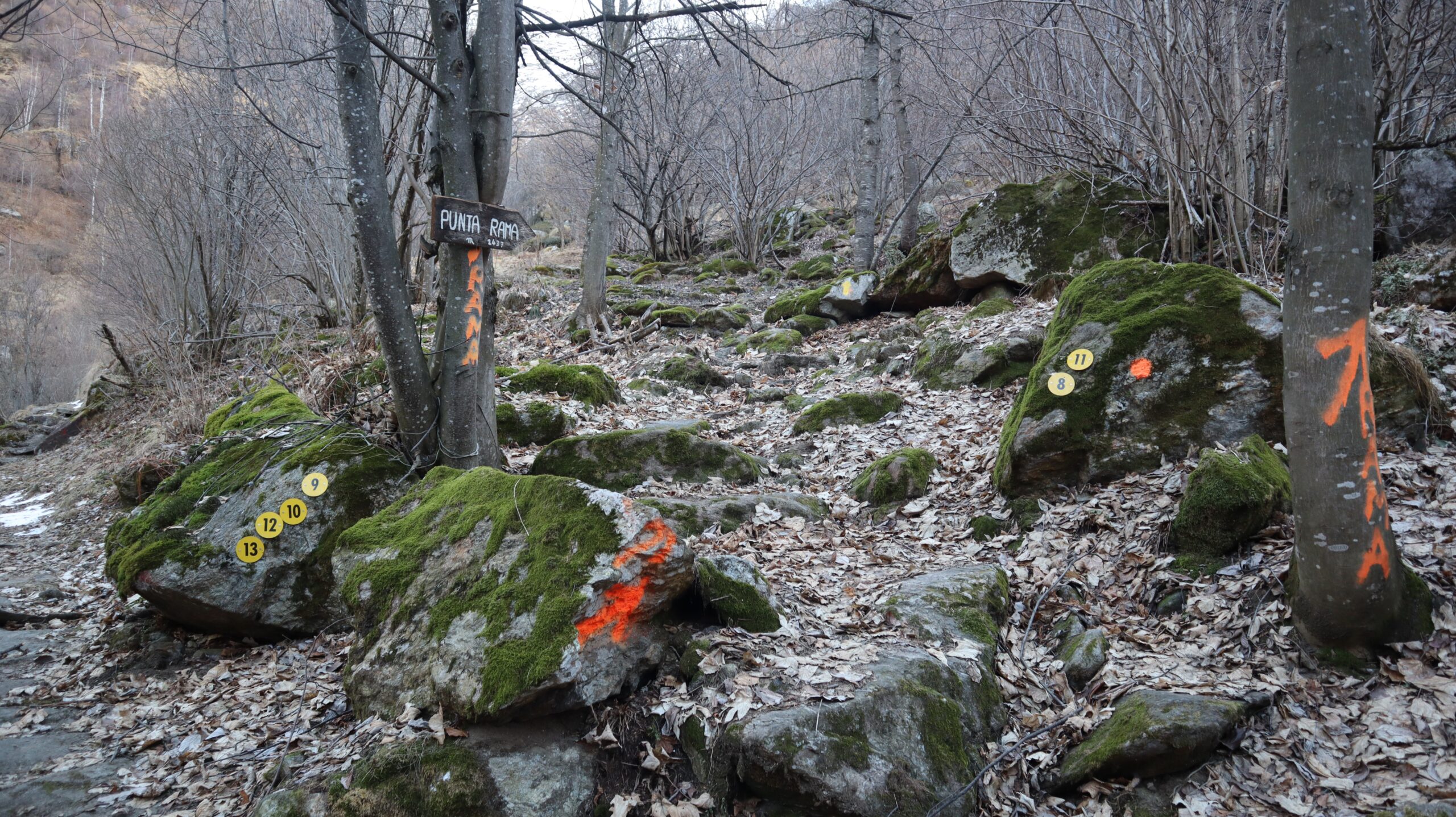 Imbocchiamo il percorso sempre evidenziato con segni di vernice bianco/rossa e cartelli indicatori al primo bivio nel bosco dopo circa 15 min. dalla partenza.