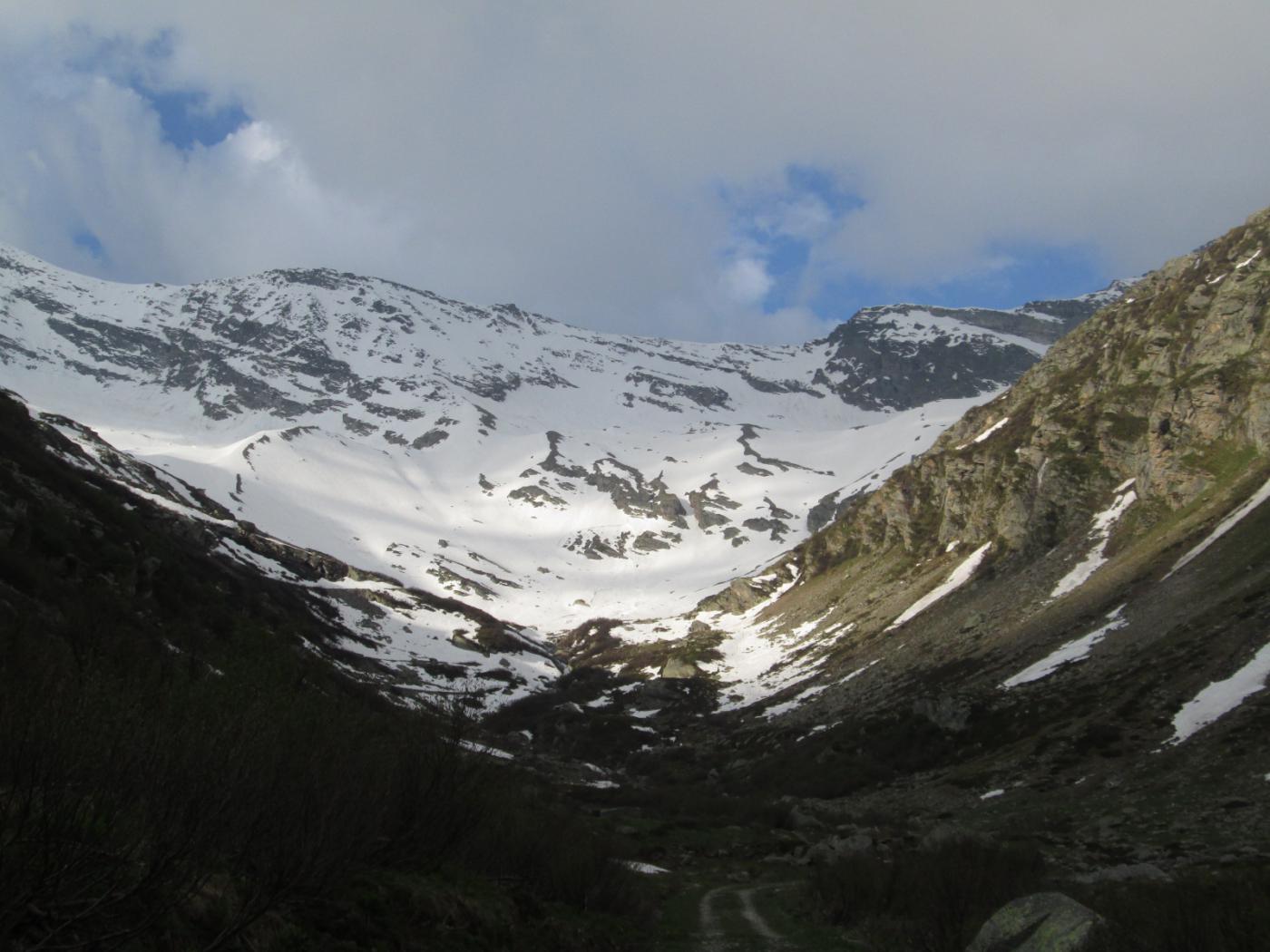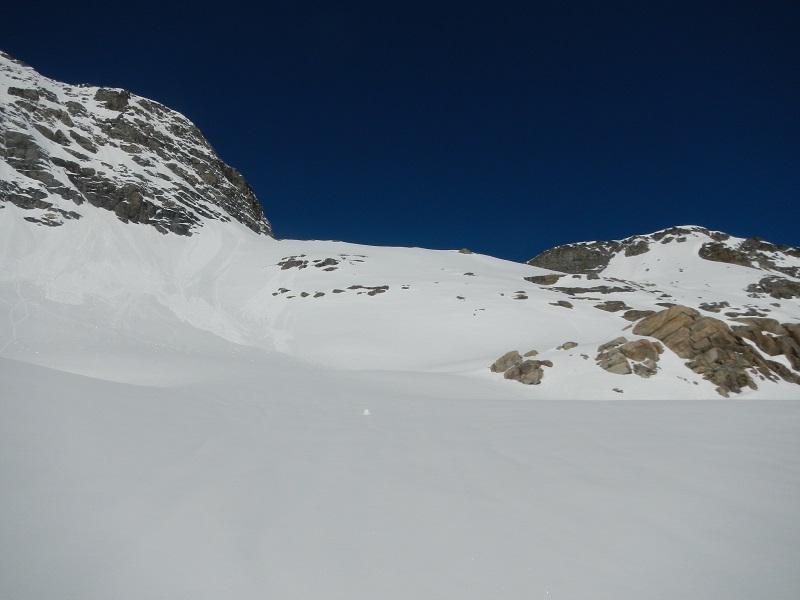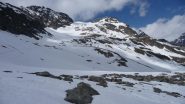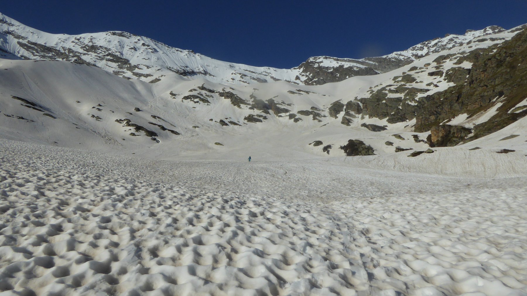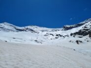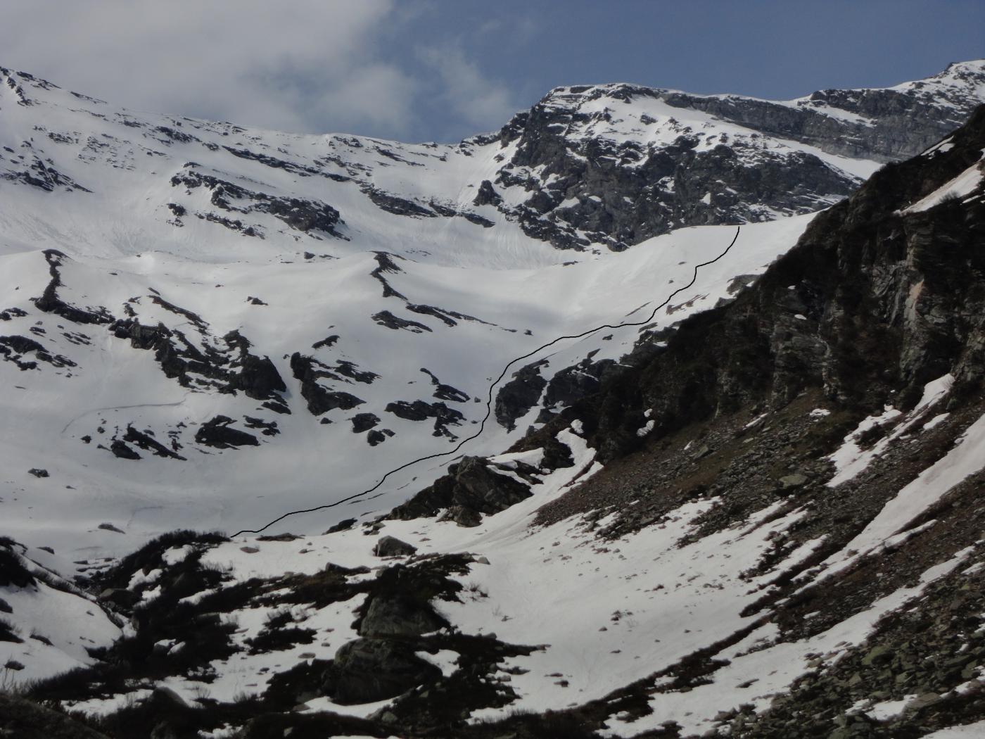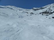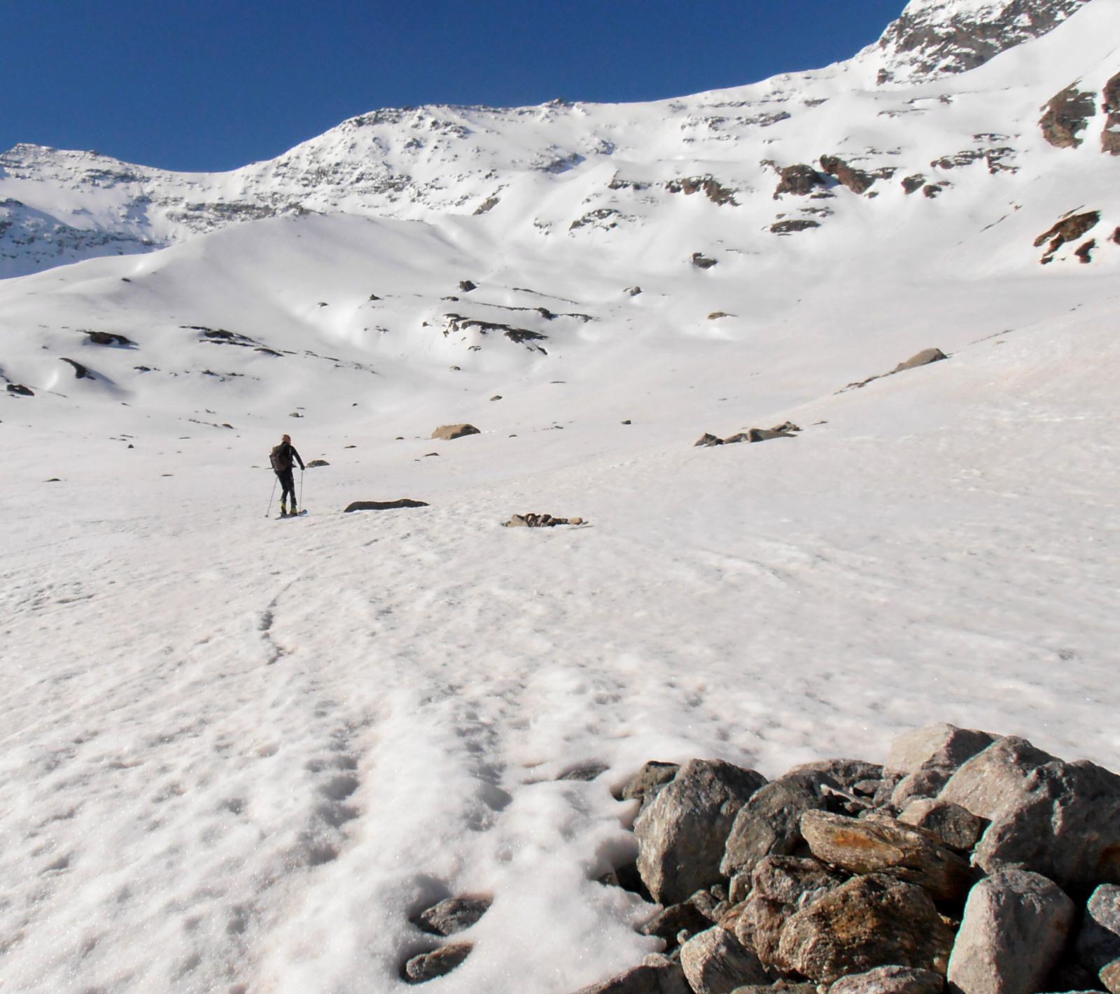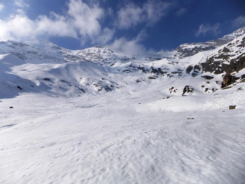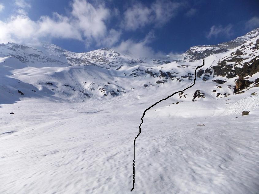 Risalire il vallone raggiungendo, dopo un breve ripido tratto, a una parte più pianeggiante (2150-2200 m). Un ripido pendio canale supera i 500 metri della parte inferiore ed adduce alle conche poste sotto al Colle del Carro. Attraversare in diagonale in direzione della rampa di altri 200-300 metri che supera quel che rimane del ghiacciaio del Carro.