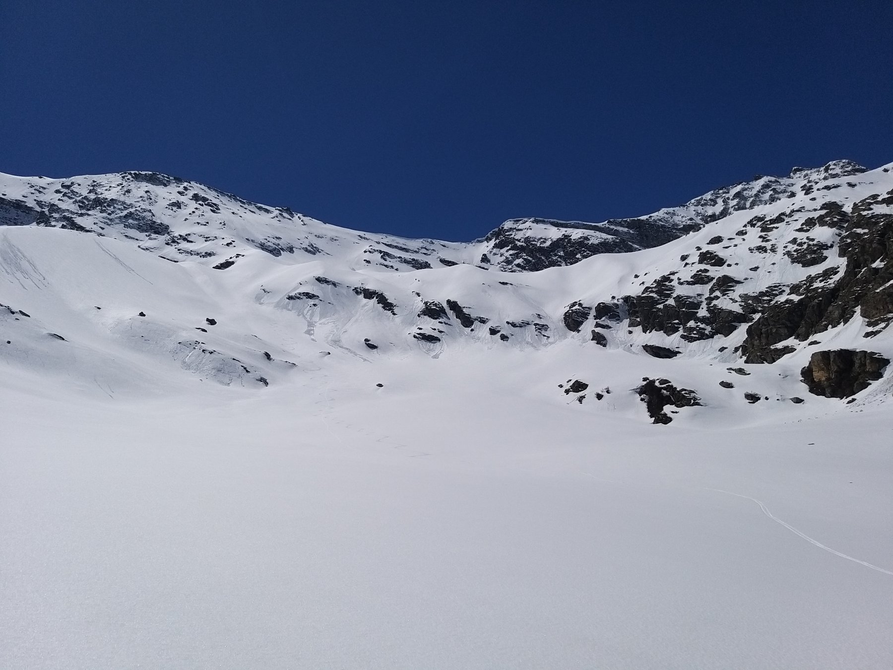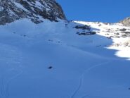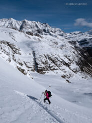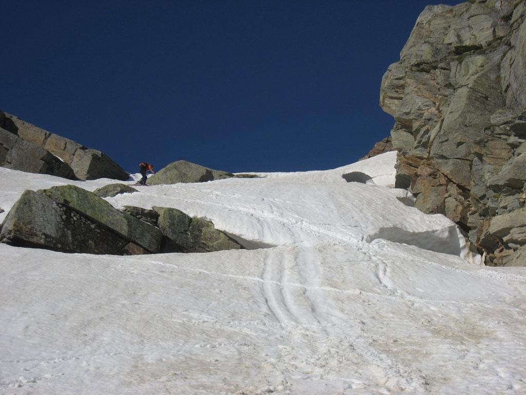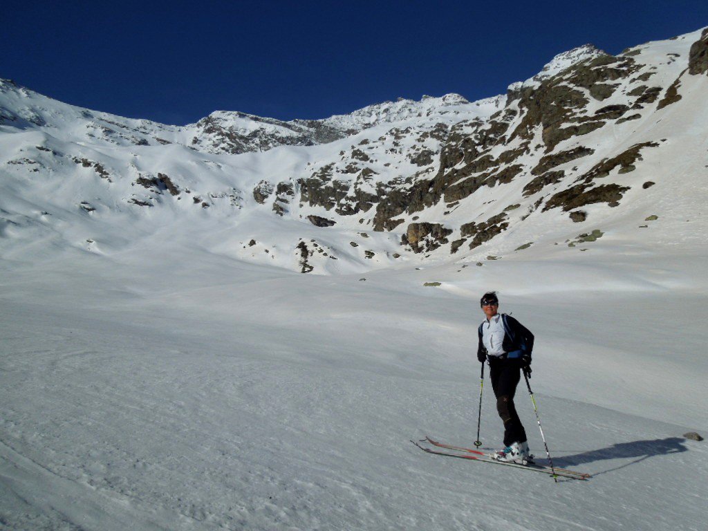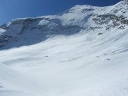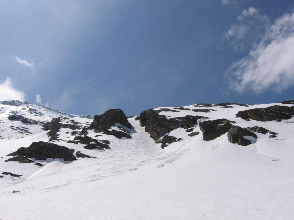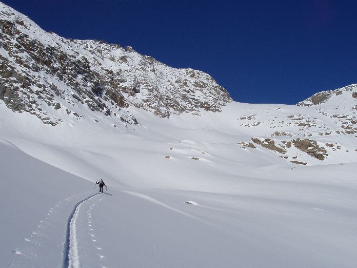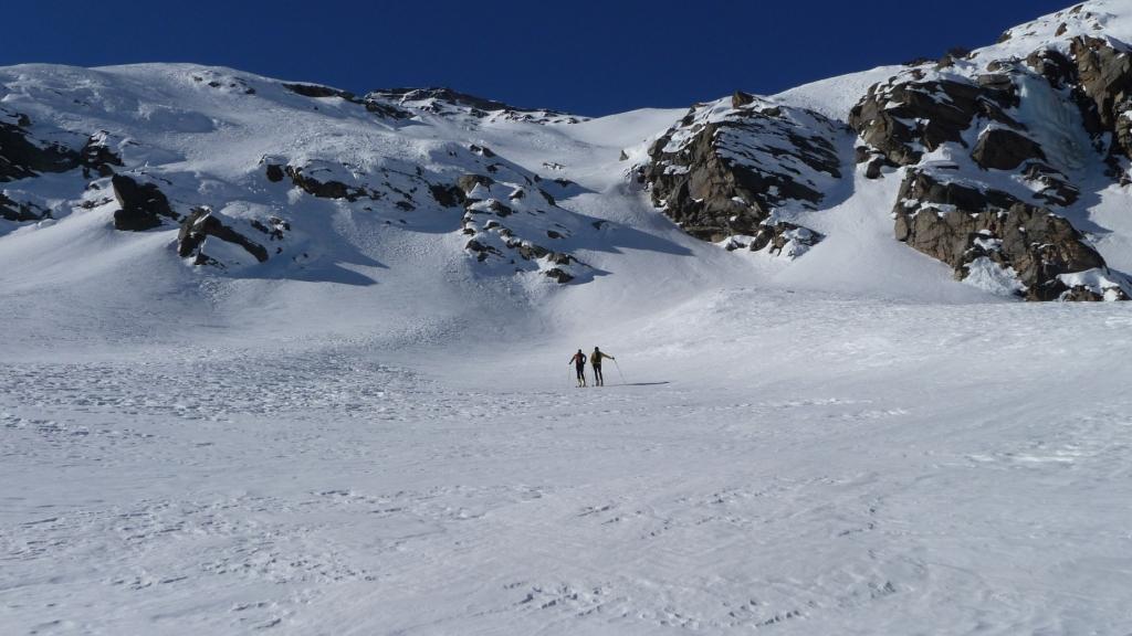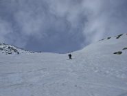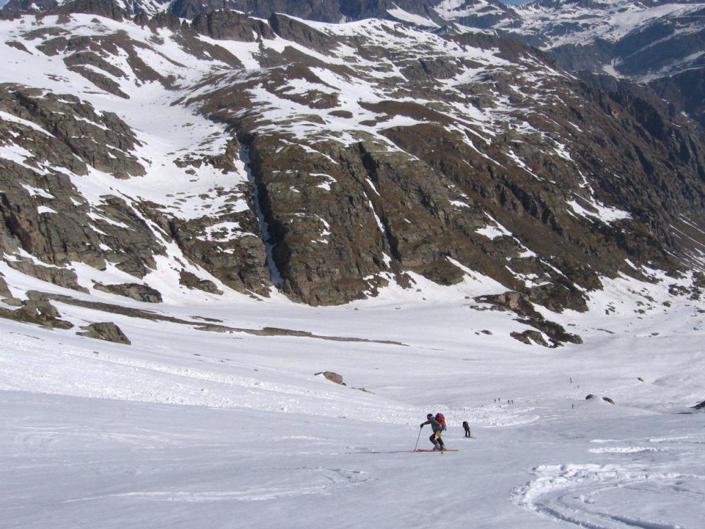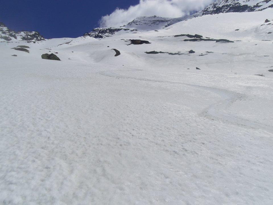 Risalire il vallone raggiungendo, dopo un breve ripido tratto, a una parte più pianeggiante (2150-2200 m). Un ripido pendio canale supera i 500 metri della parte inferiore ed adduce alle conche poste sotto al Colle del Carro. Attraversare in diagonale in direzione della rampa di altri 200-300 metri che supera quel che rimane del ghiacciaio del Carro.