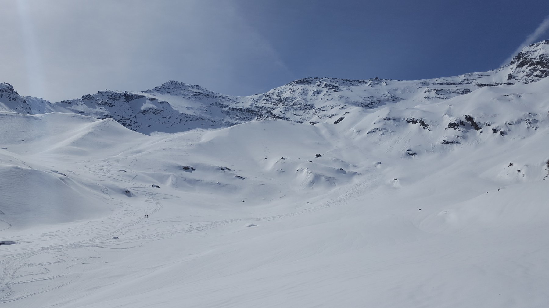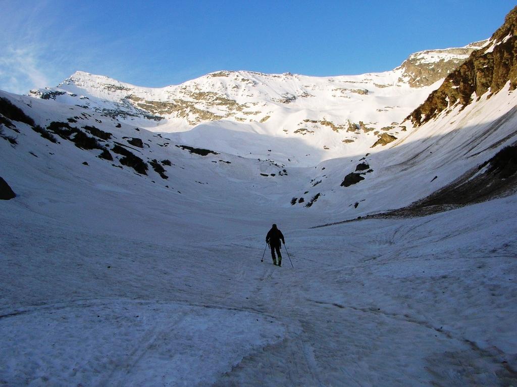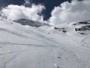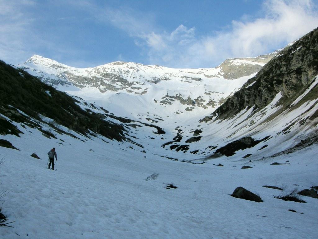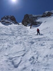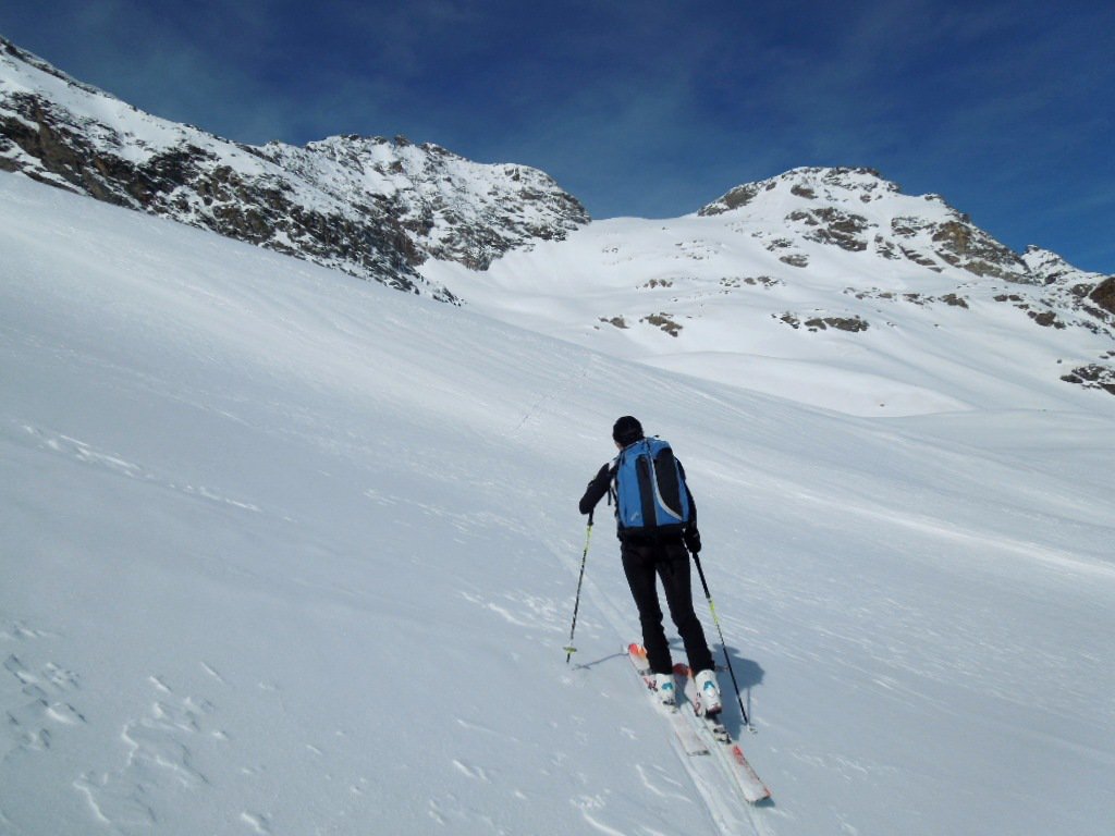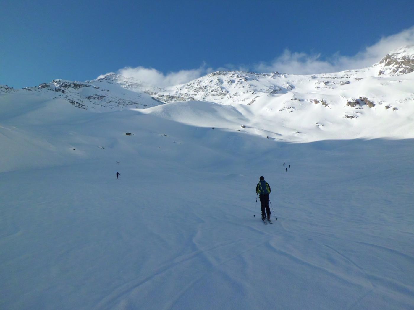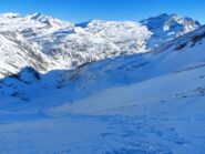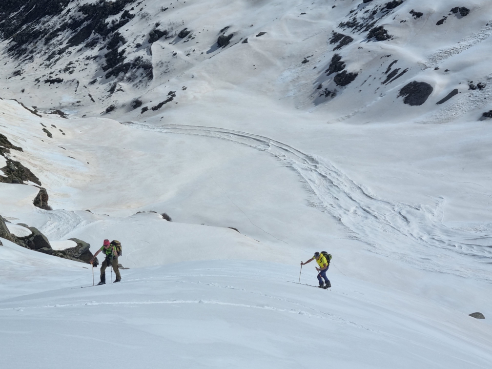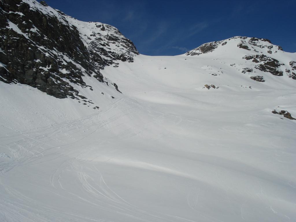 Risalire il vallone raggiungendo, dopo un breve ripido tratto, a una parte più pianeggiante (2150-2200 m). Un ripido pendio canale supera i 500 metri della parte inferiore ed adduce alle conche poste sotto al Colle del Carro. Attraversare in diagonale in direzione della rampa di altri 200-300 metri che supera quel che rimane del ghiacciaio del Carro.