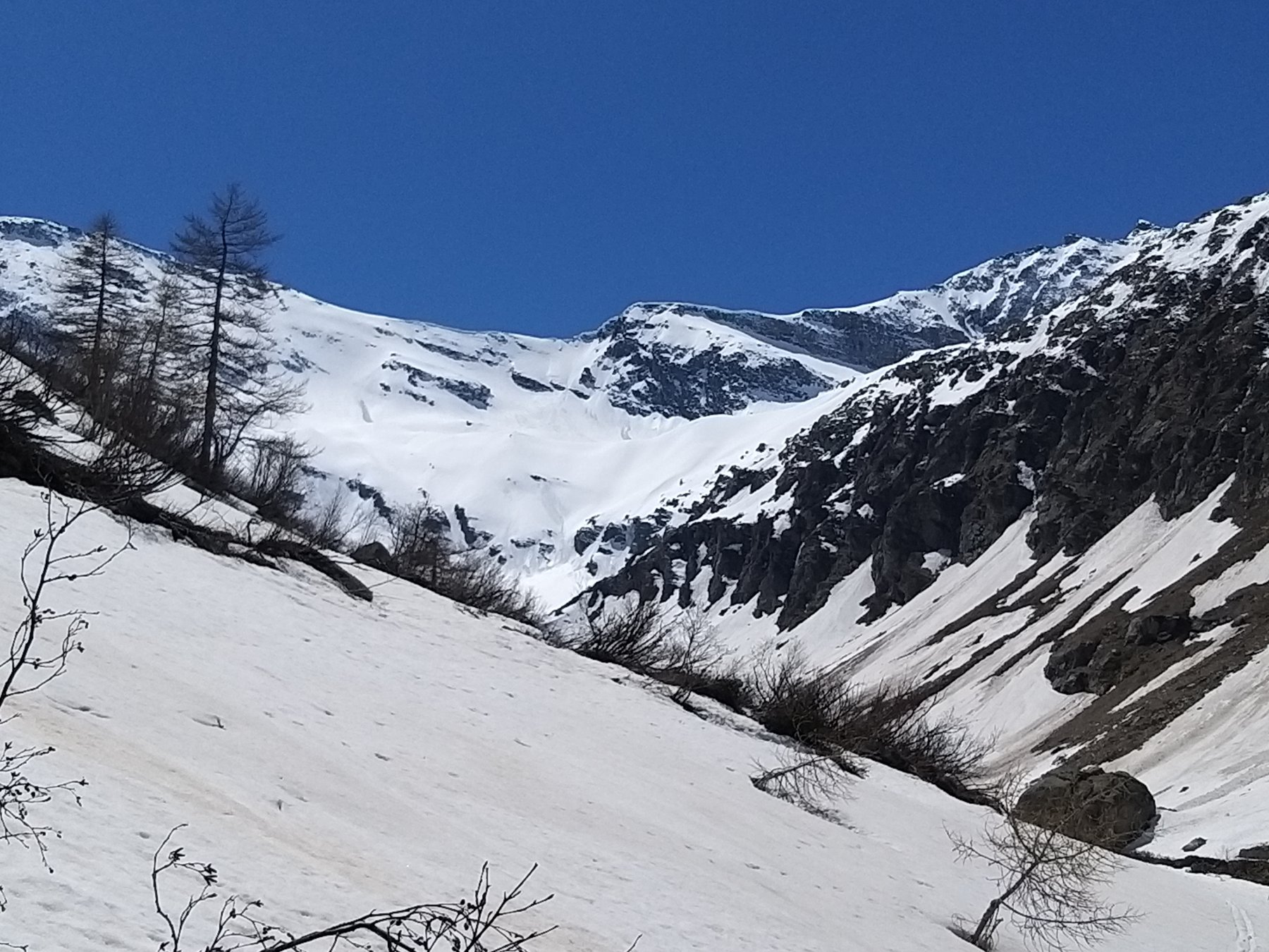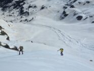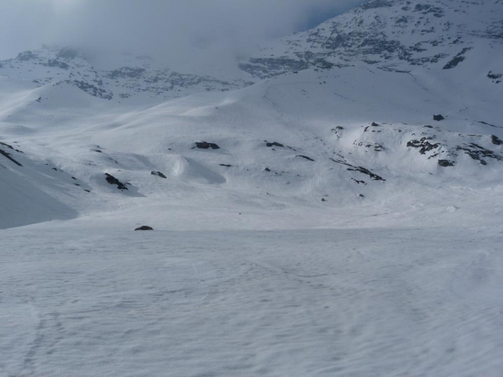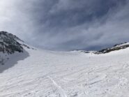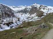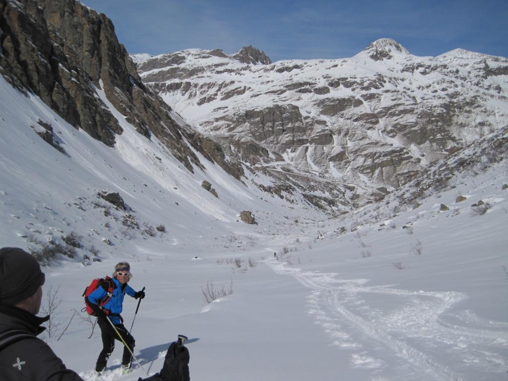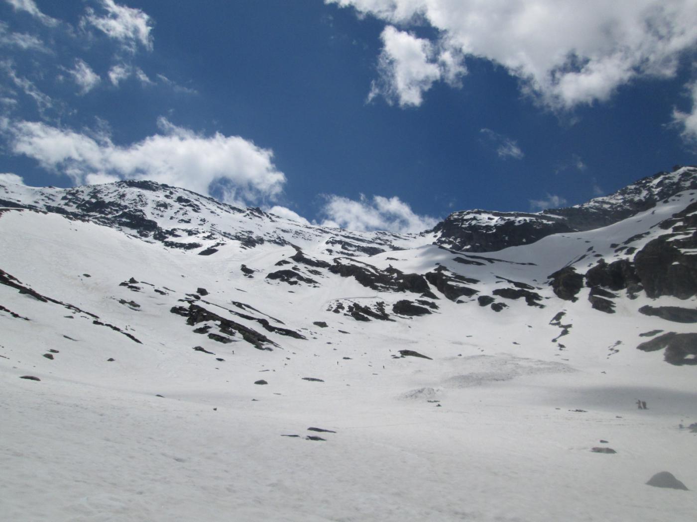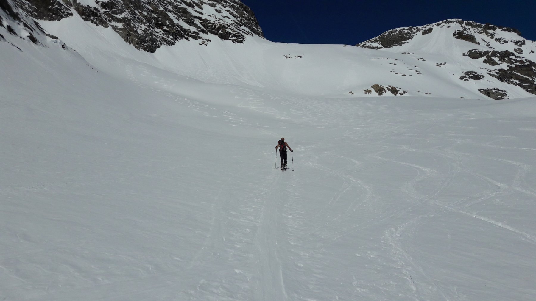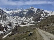 Risalire il vallone raggiungendo, dopo un breve ripido tratto, a una parte più pianeggiante (2150-2200 m). Un ripido pendio canale supera i 500 metri della parte inferiore ed adduce alle conche poste sotto al Colle del Carro. Attraversare in diagonale in direzione della rampa di altri 200-300 metri che supera quel che rimane del ghiacciaio del Carro.