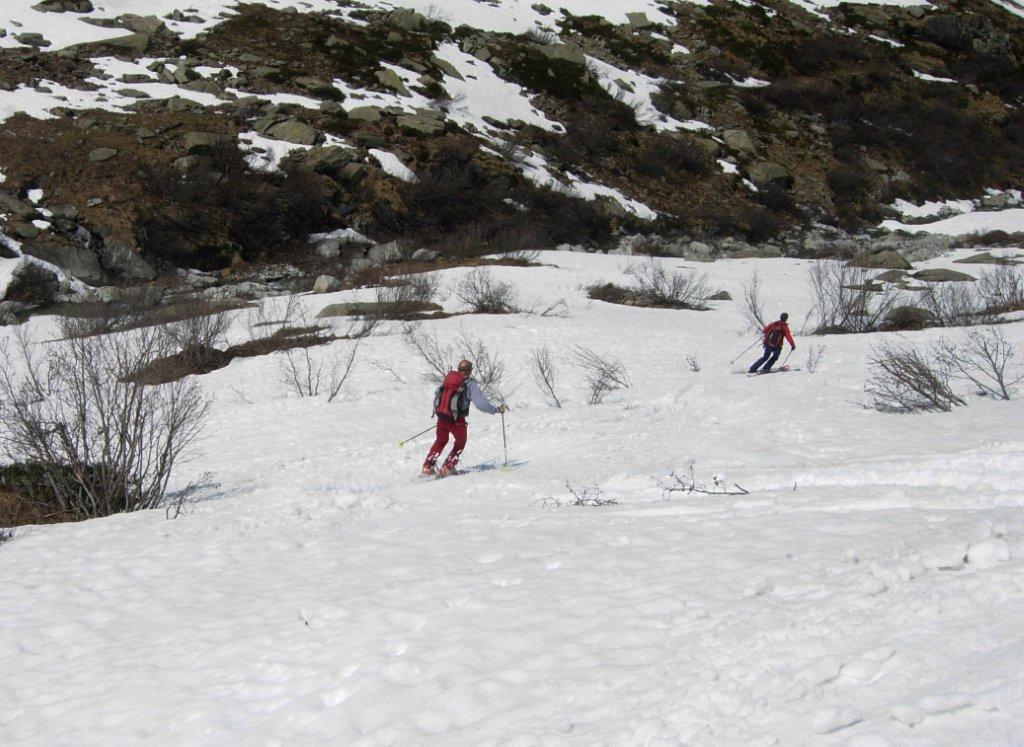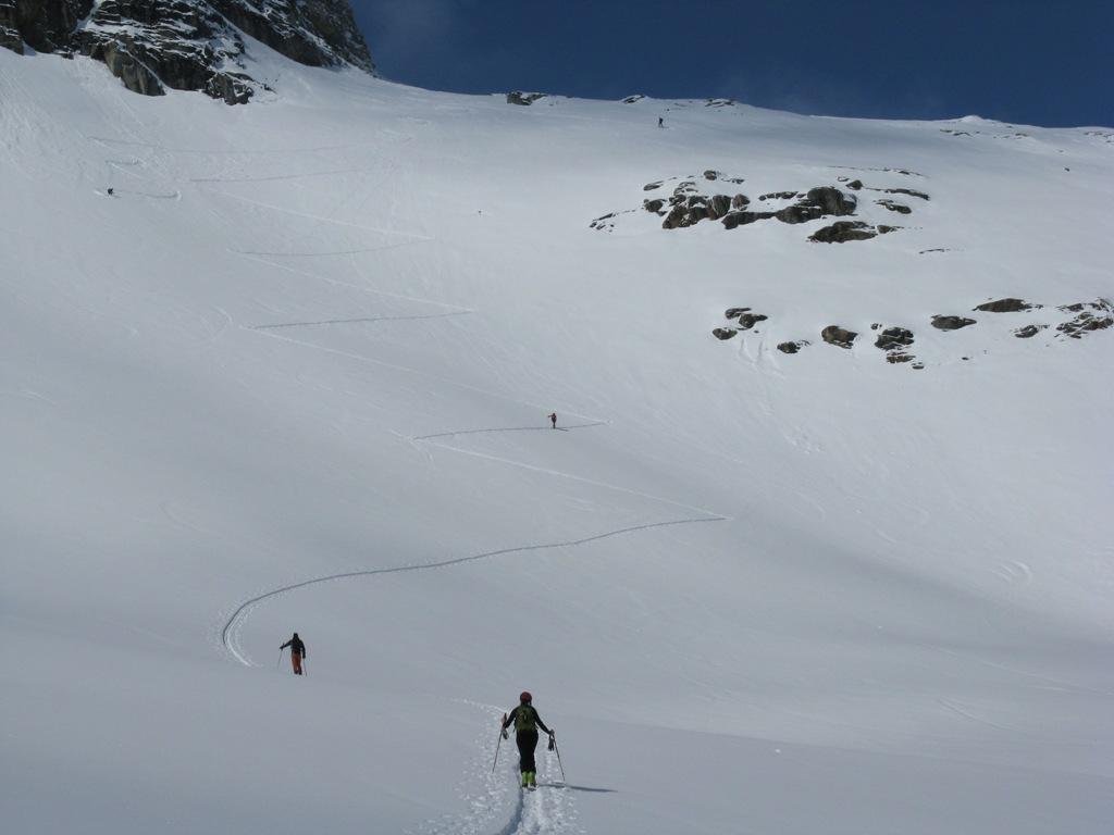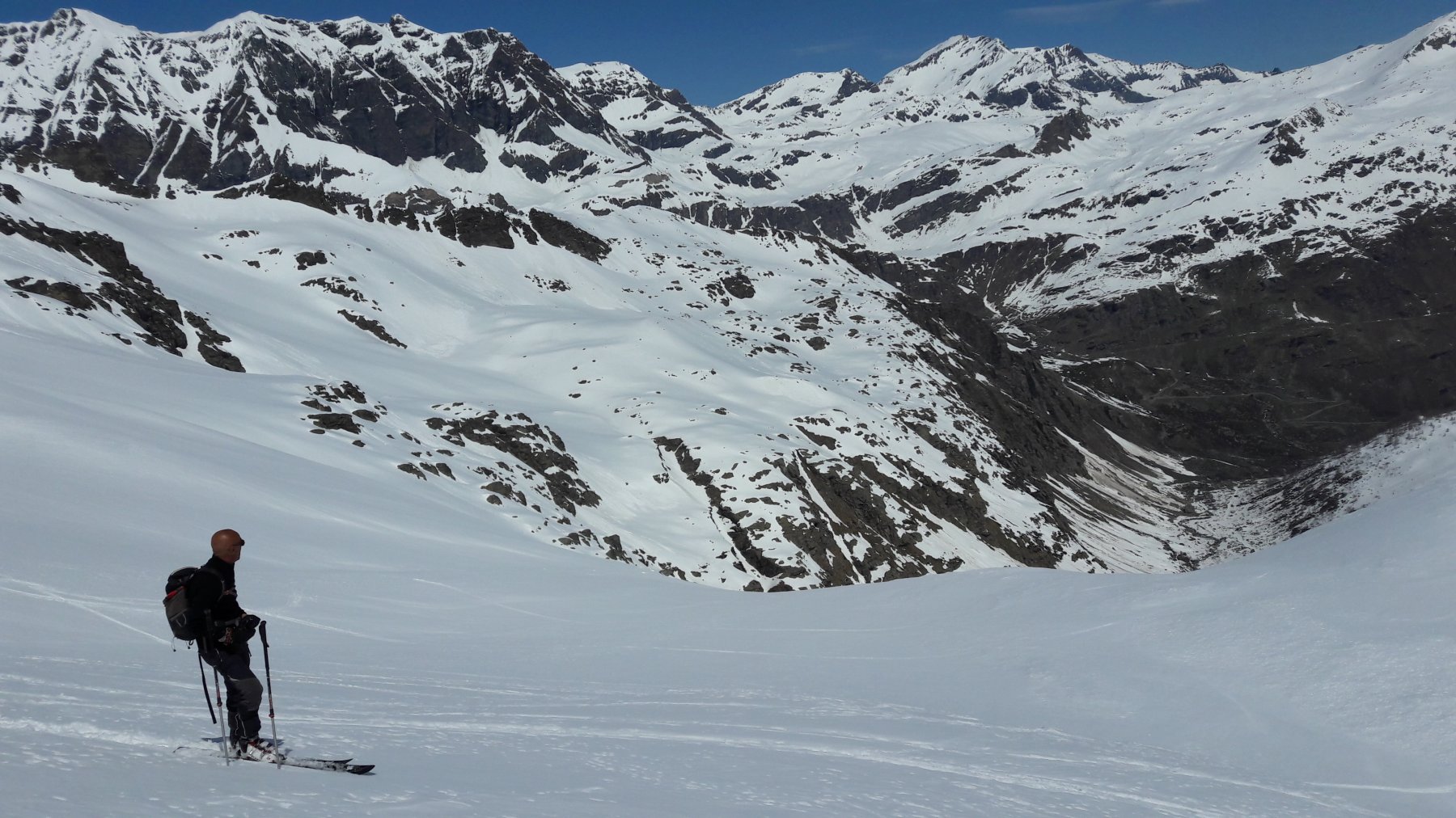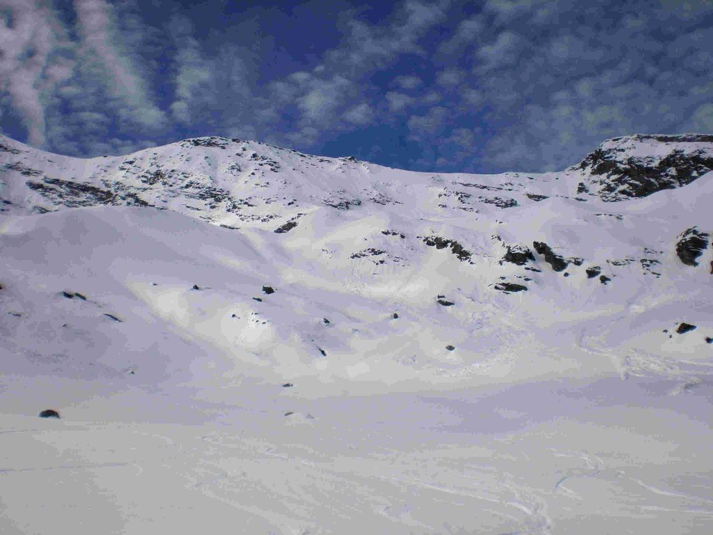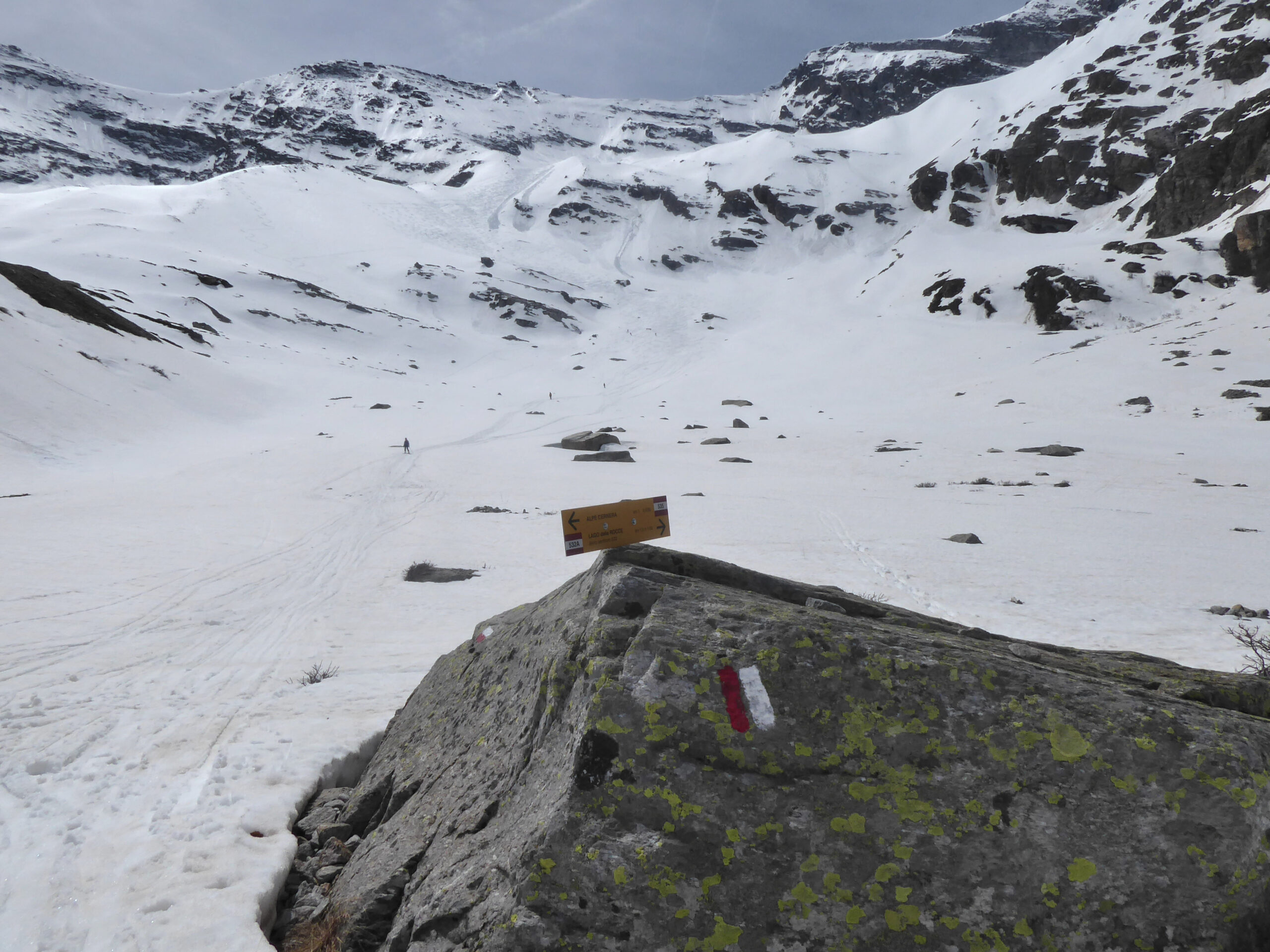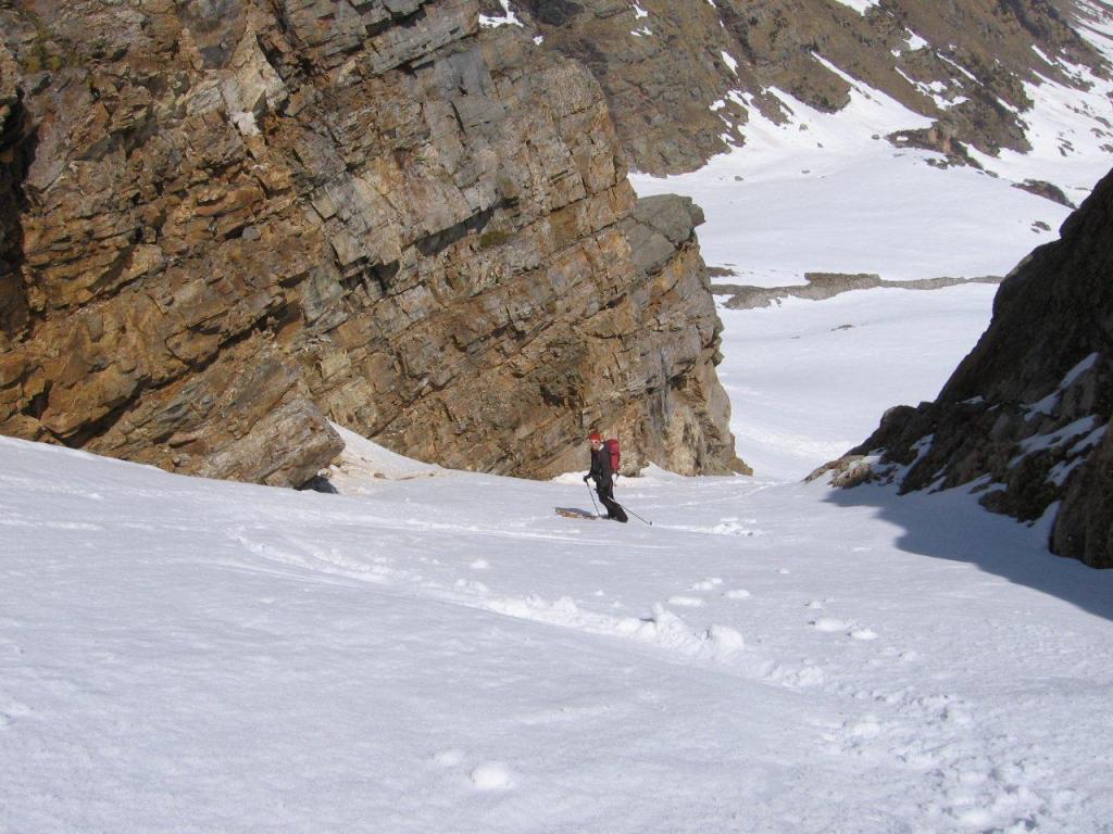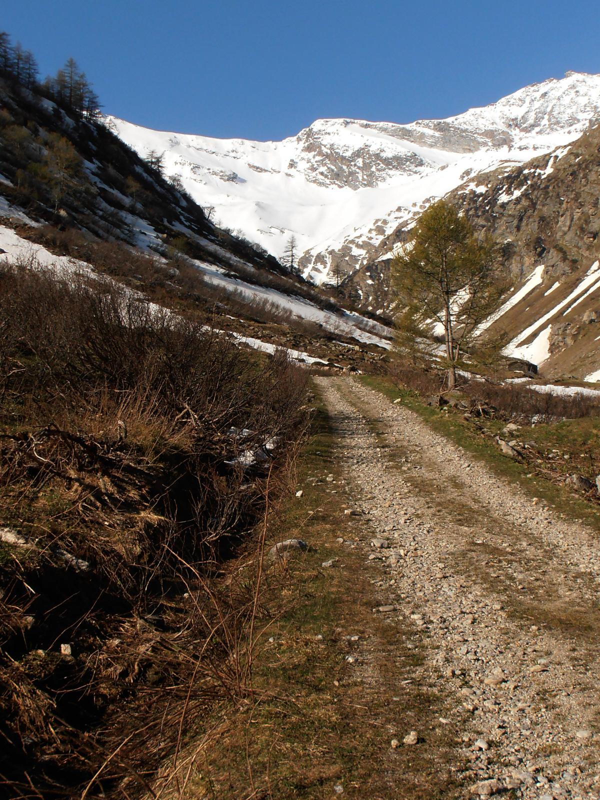 Risalire il vallone raggiungendo, dopo un breve ripido tratto, a una parte più pianeggiante (2150-2200 m). Un ripido pendio canale supera i 500 metri della parte inferiore ed adduce alle conche poste sotto al Colle del Carro. Attraversare in diagonale in direzione della rampa di altri 200-300 metri che supera quel che rimane del ghiacciaio del Carro.