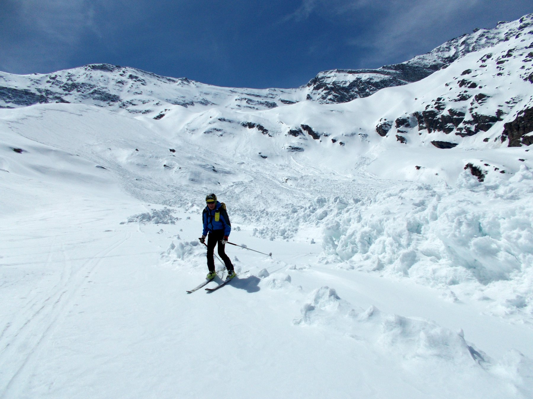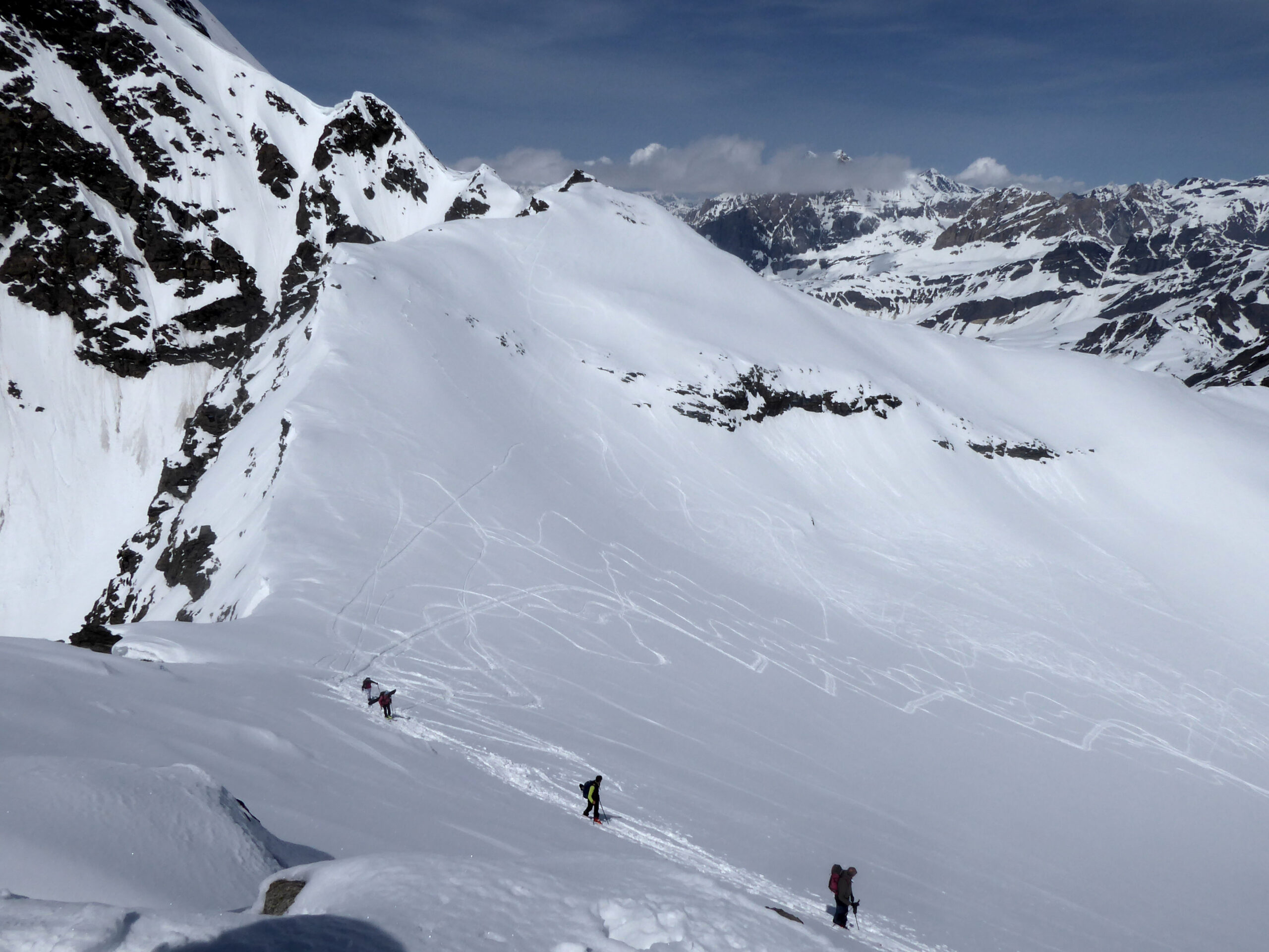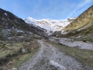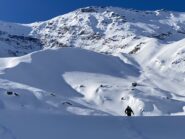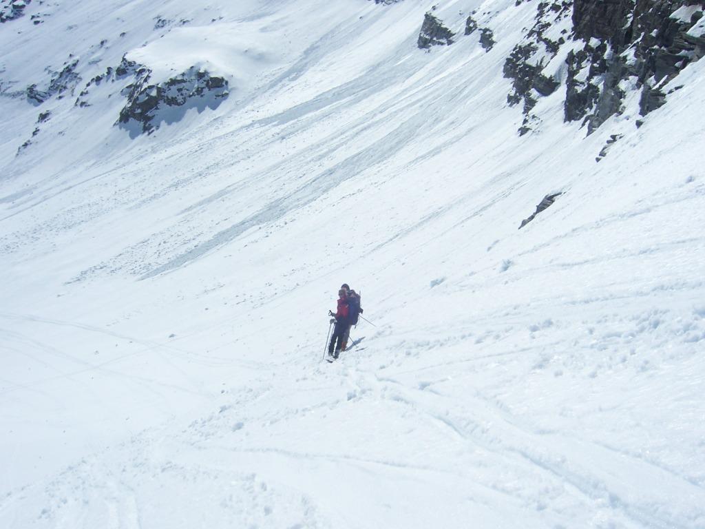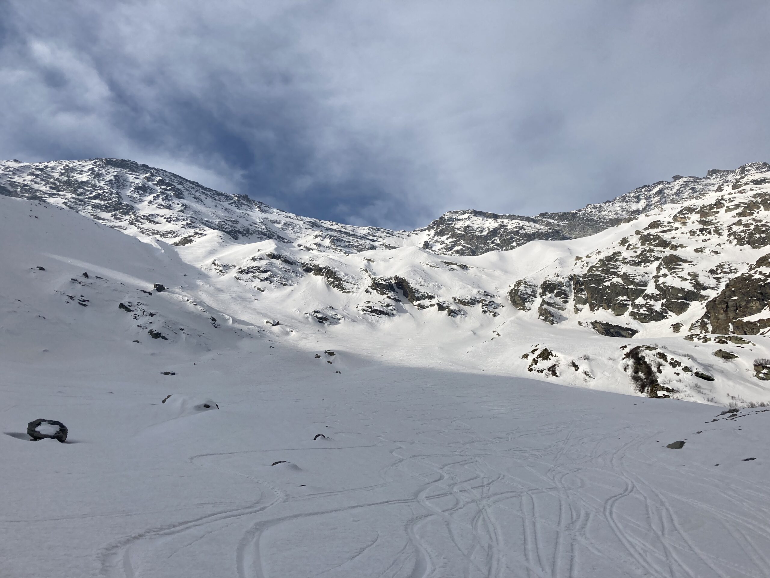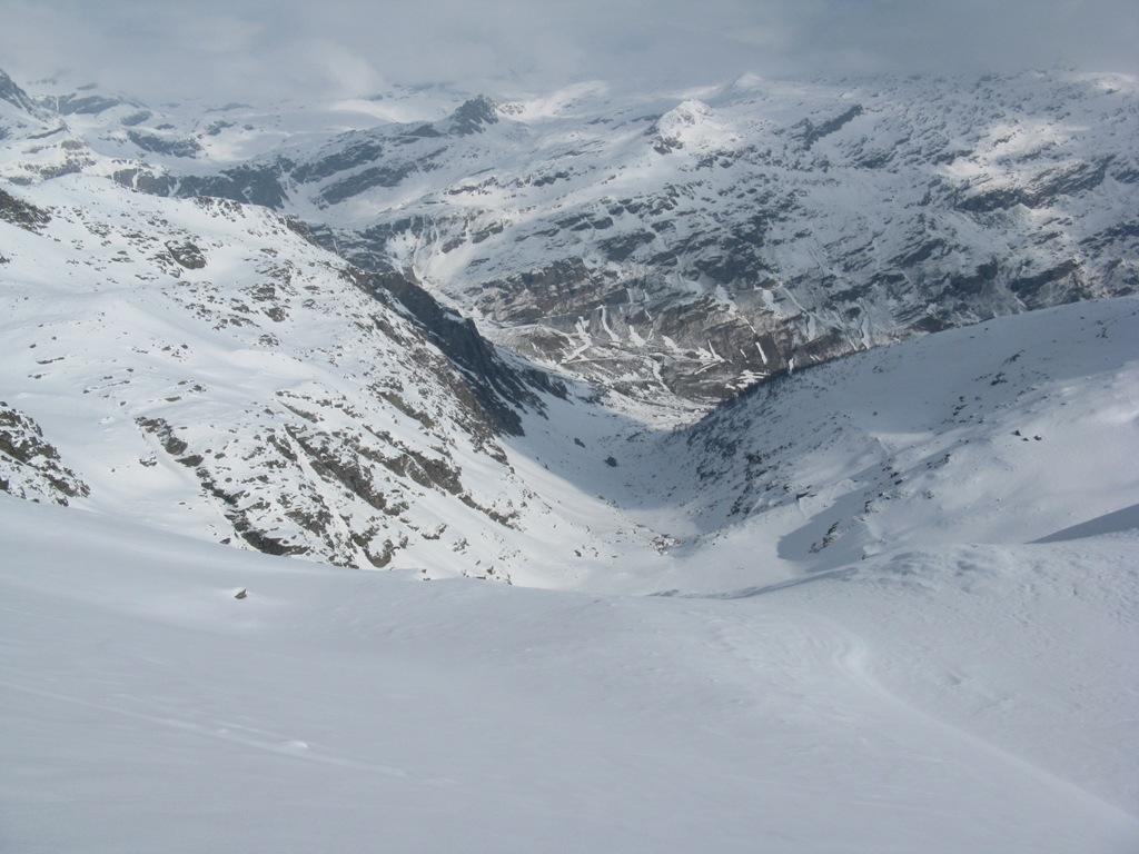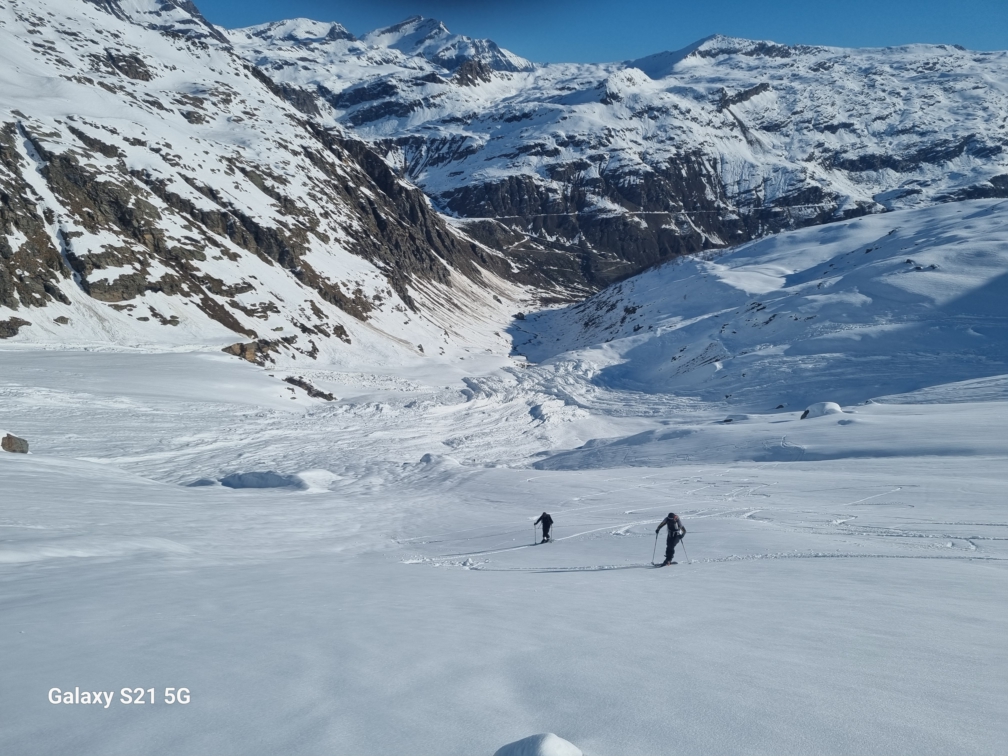 Risalire il vallone raggiungendo, dopo un breve ripido tratto, a una parte più pianeggiante (2150-2200 m). Un ripido pendio canale supera i 500 metri della parte inferiore ed adduce alle conche poste sotto al Colle del Carro. Attraversare in diagonale in direzione della rampa di altri 200-300 metri che supera quel che rimane del ghiacciaio del Carro.