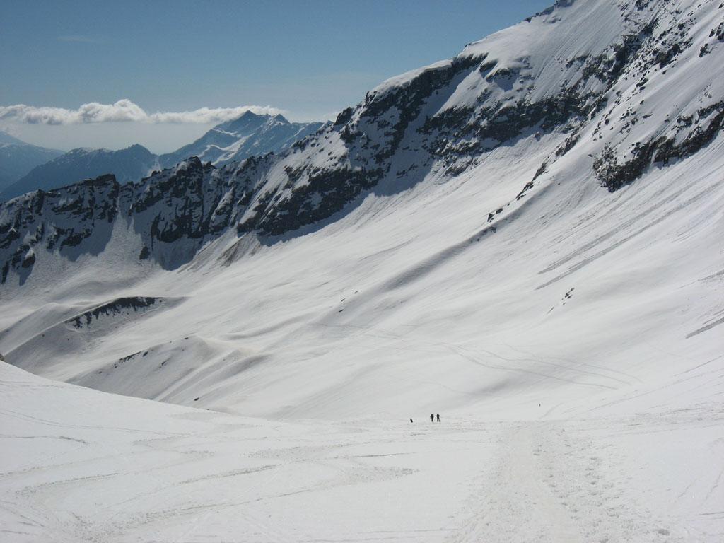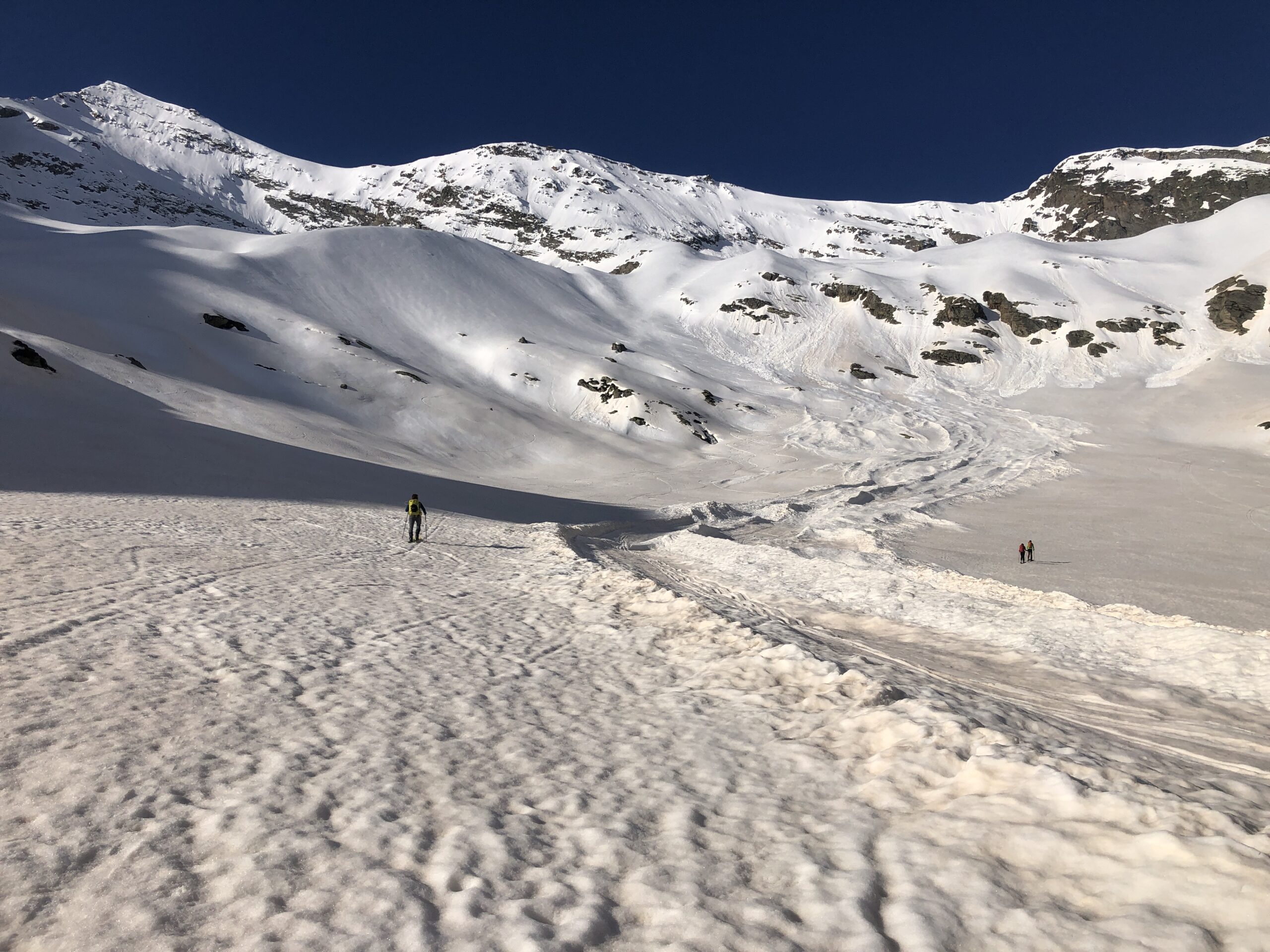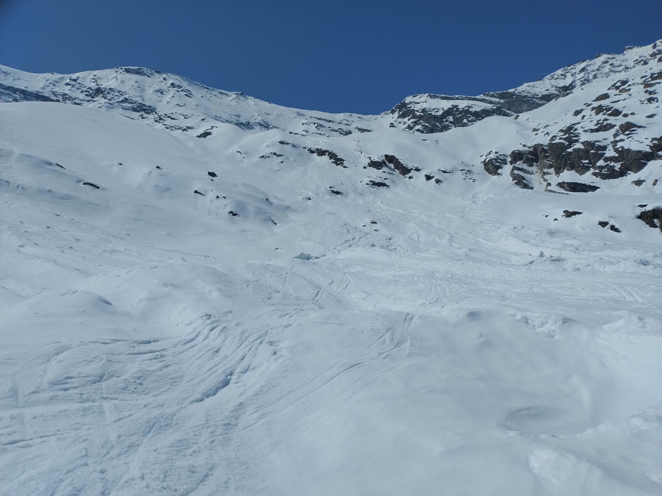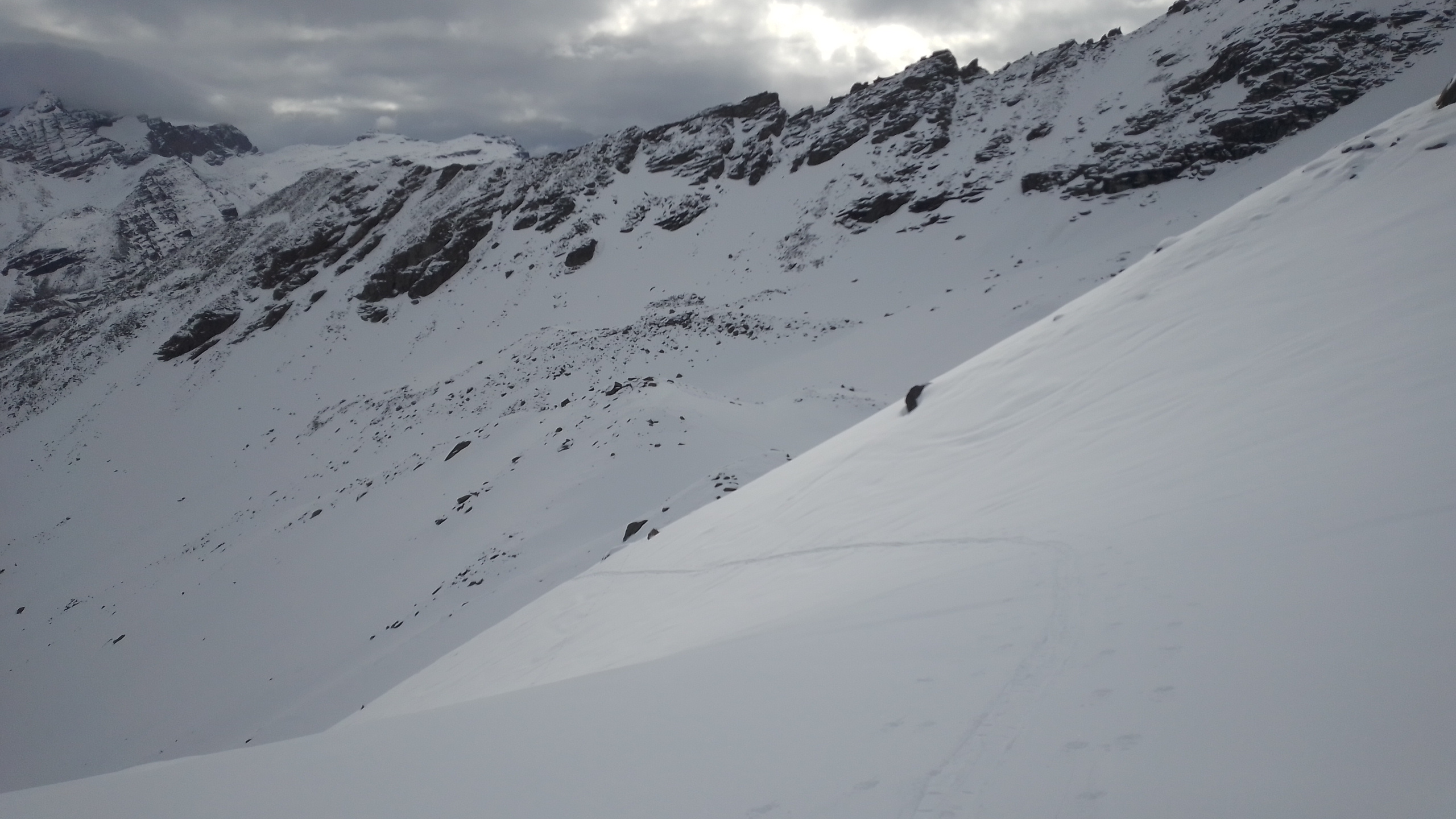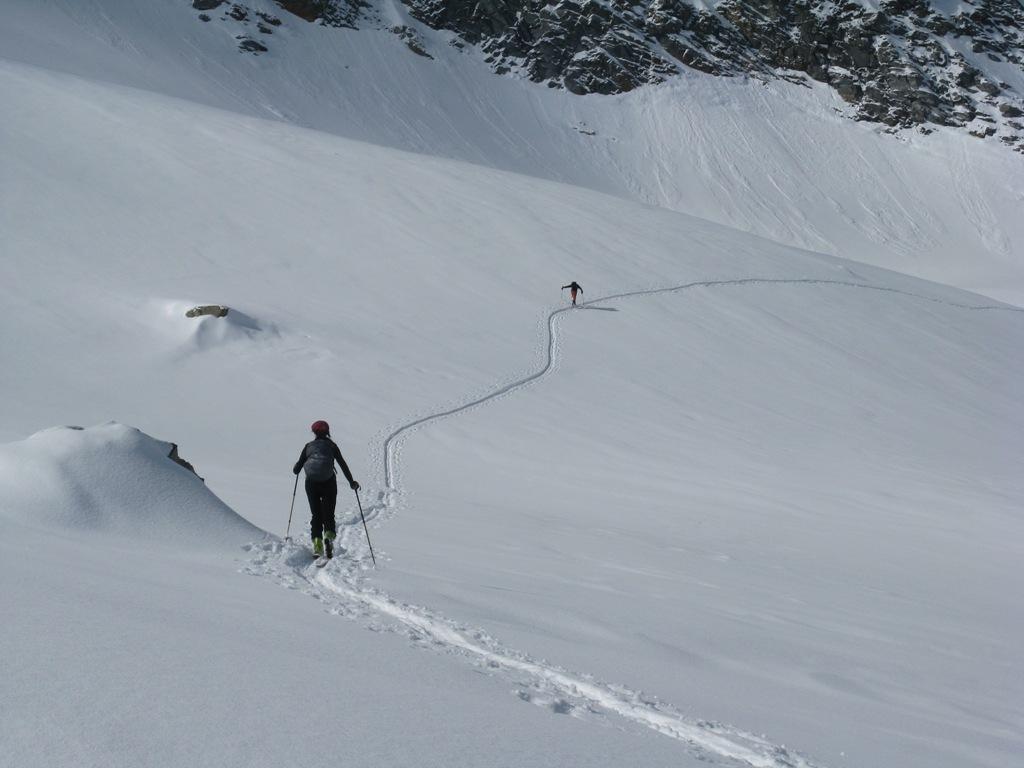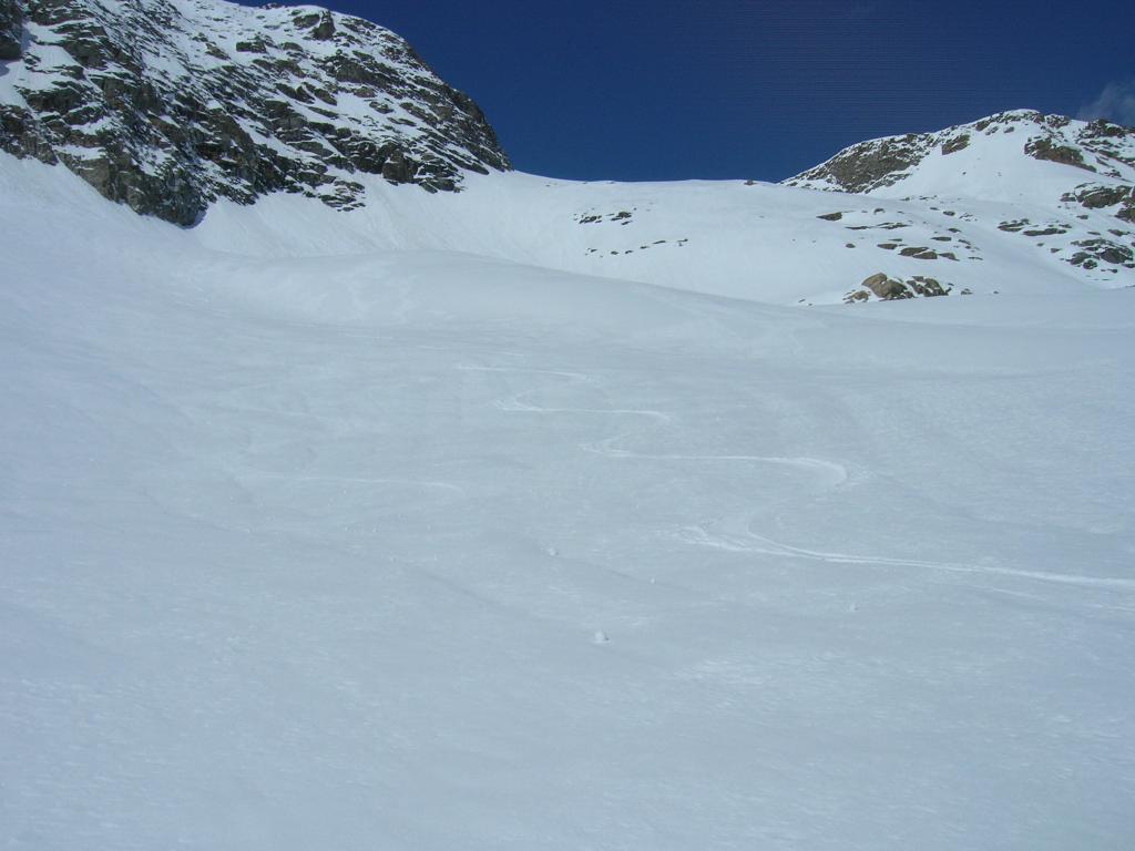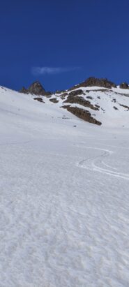 Risalire il vallone raggiungendo, dopo un breve ripido tratto, a una parte più pianeggiante (2150-2200 m). Un ripido pendio canale supera i 500 metri della parte inferiore ed adduce alle conche poste sotto al Colle del Carro. Attraversare in diagonale in direzione della rampa di altri 200-300 metri che supera quel che rimane del ghiacciaio del Carro.