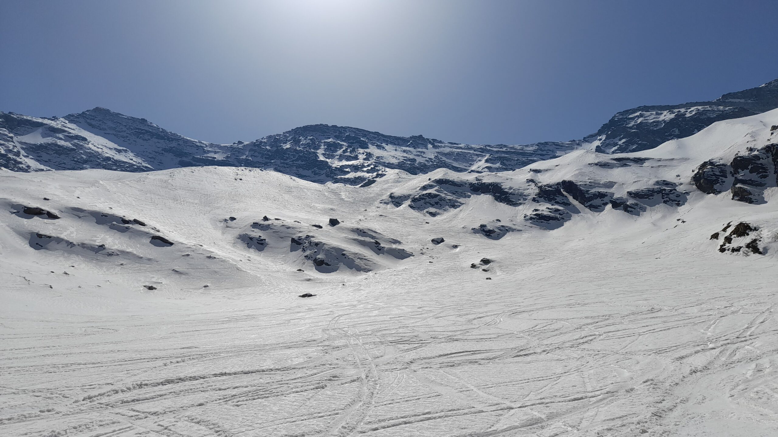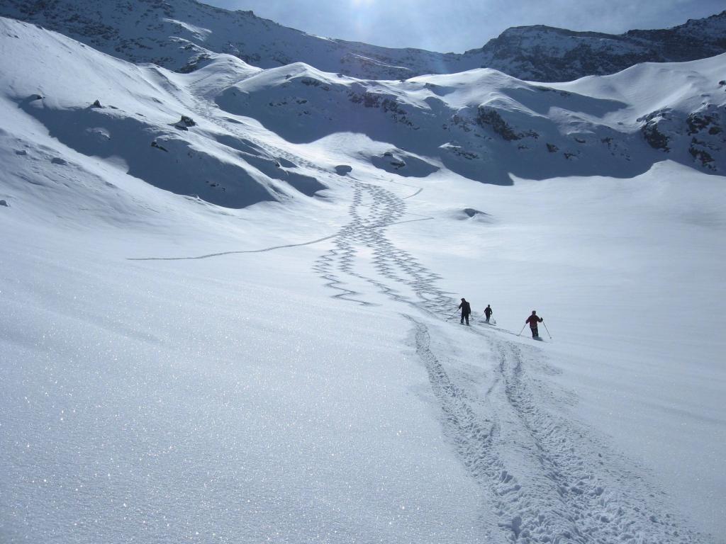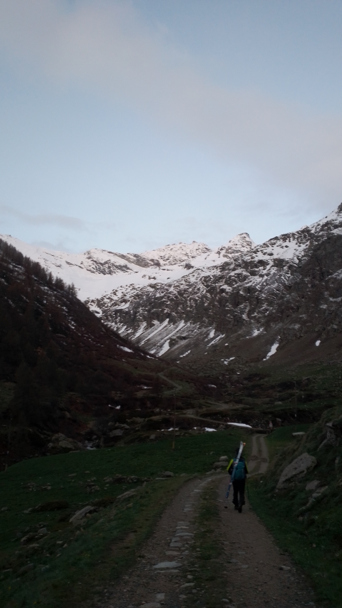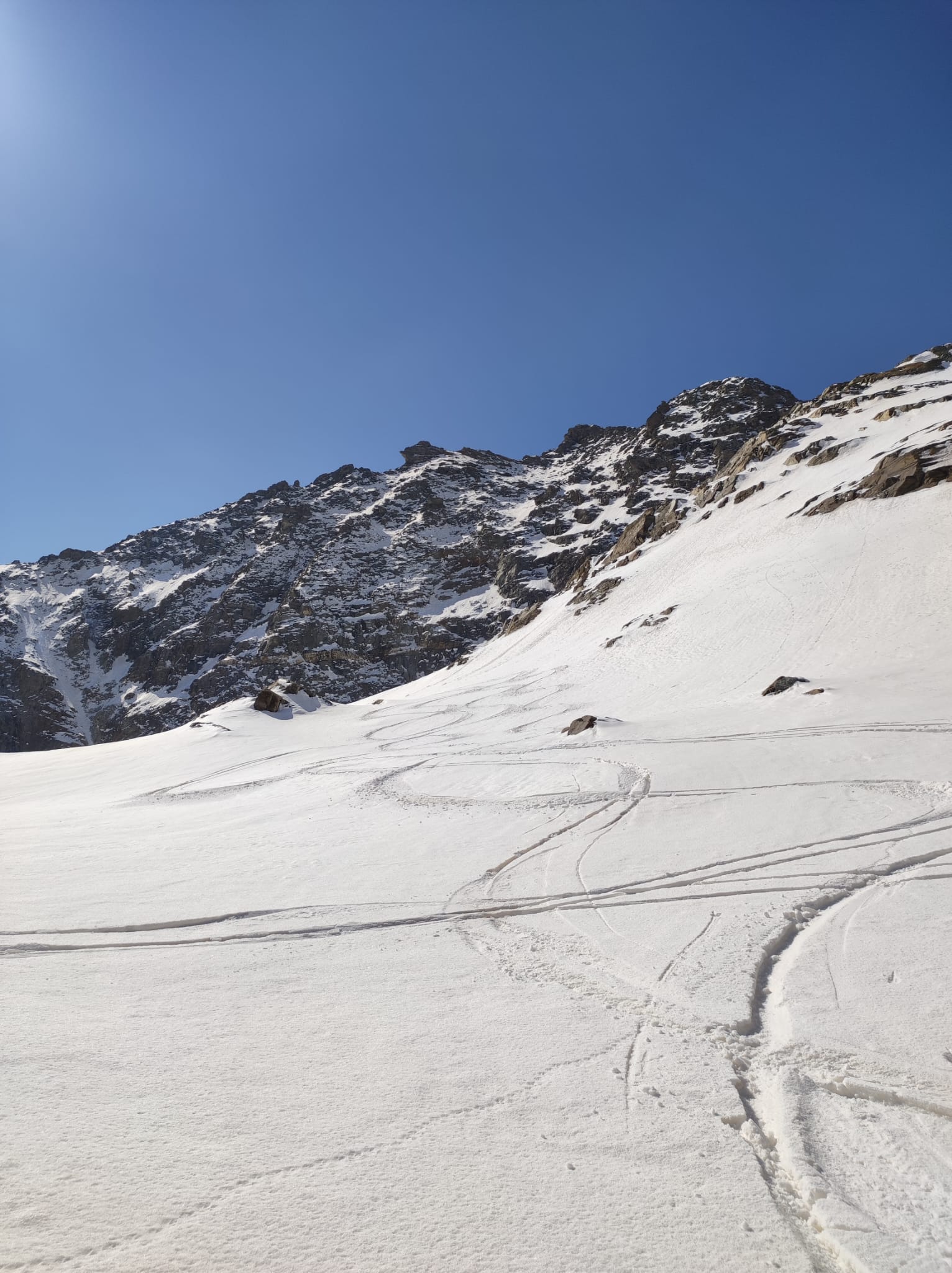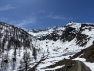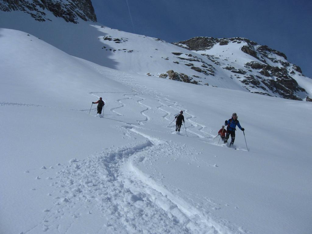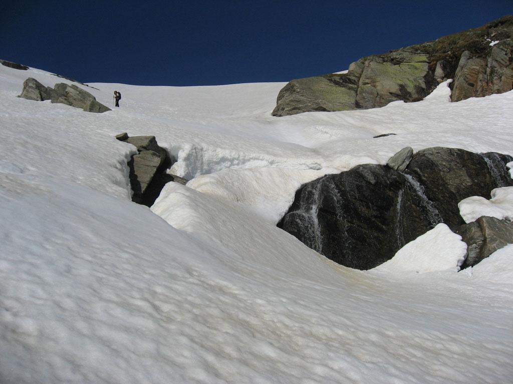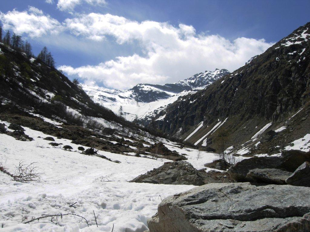 Risalire il vallone raggiungendo, dopo un breve ripido tratto, a una parte più pianeggiante (2150-2200 m). Un ripido pendio canale supera i 500 metri della parte inferiore ed adduce alle conche poste sotto al Colle del Carro. Attraversare in diagonale in direzione della rampa di altri 200-300 metri che supera quel che rimane del ghiacciaio del Carro.