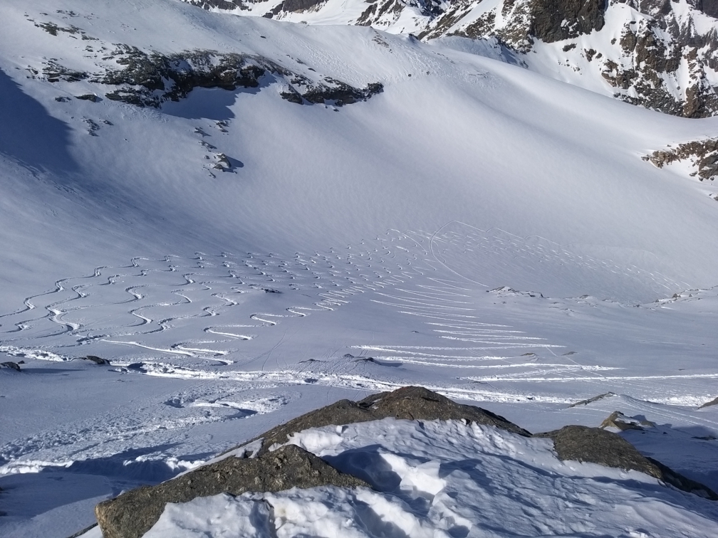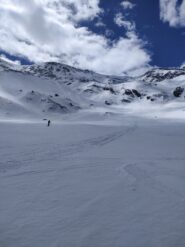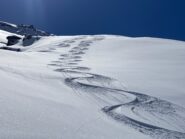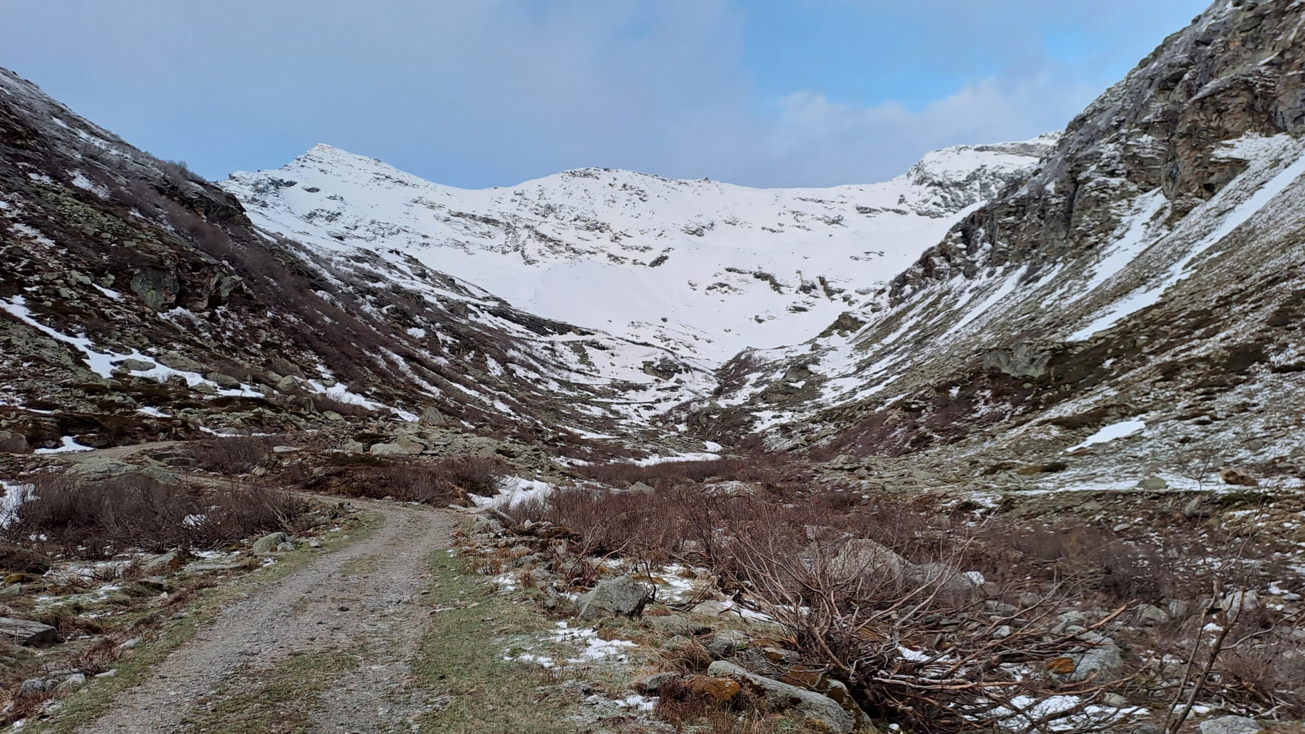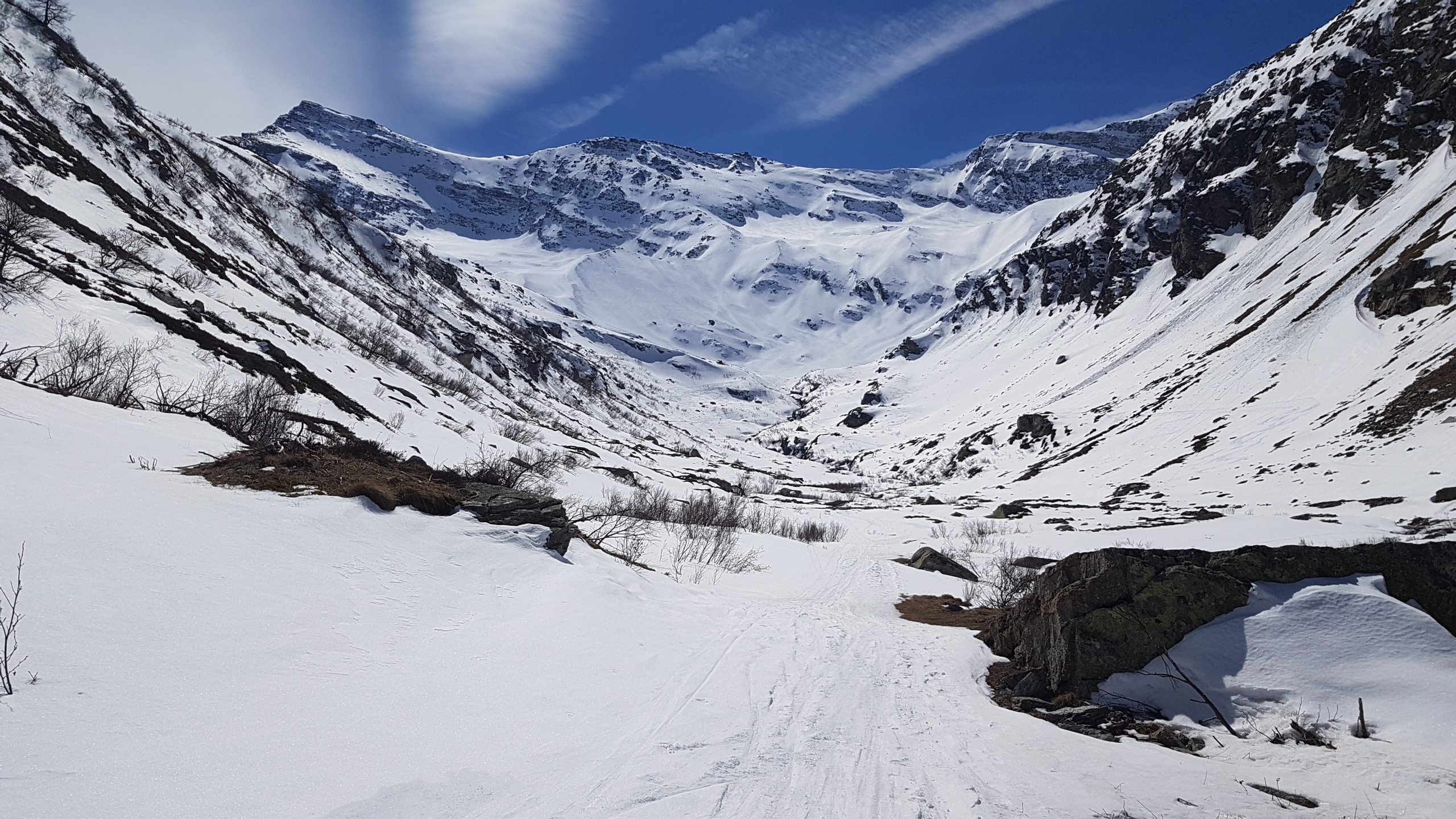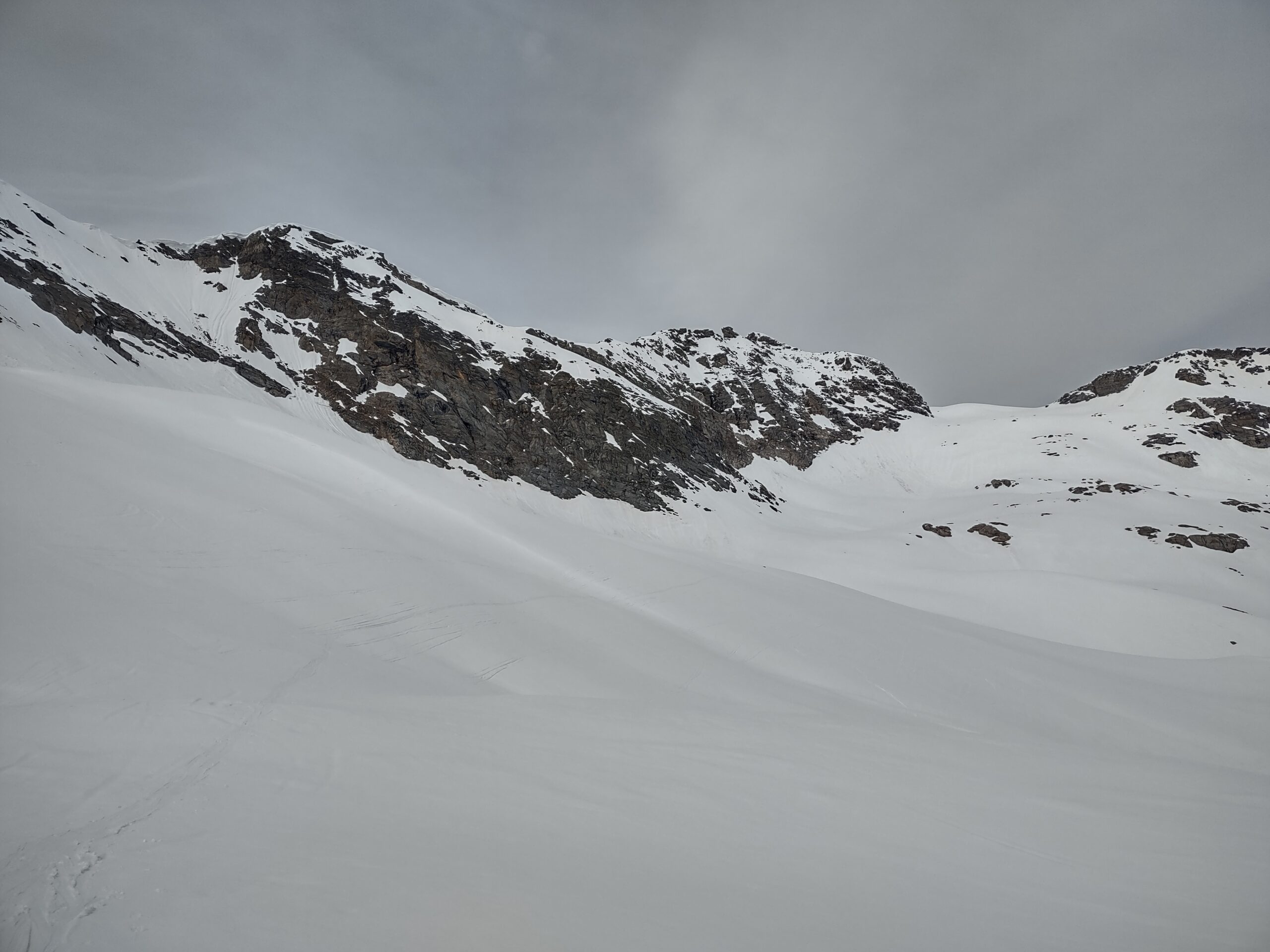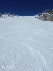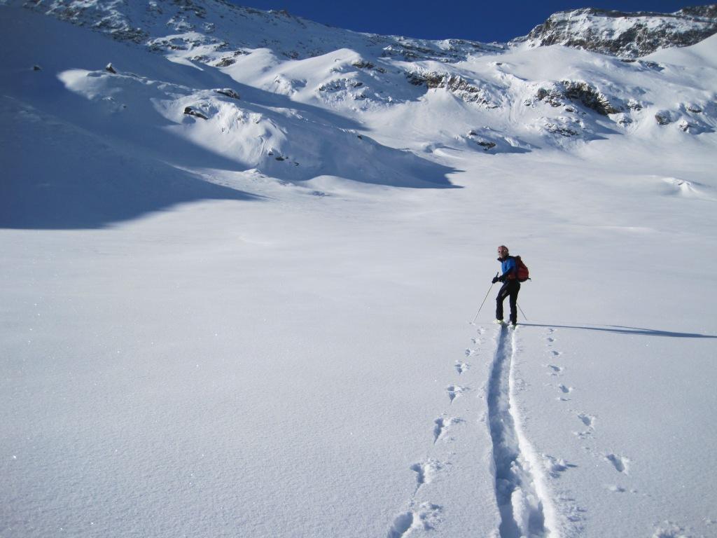 Risalire il vallone raggiungendo, dopo un breve ripido tratto, a una parte più pianeggiante (2150-2200 m). Un ripido pendio canale supera i 500 metri della parte inferiore ed adduce alle conche poste sotto al Colle del Carro. Attraversare in diagonale in direzione della rampa di altri 200-300 metri che supera quel che rimane del ghiacciaio del Carro.