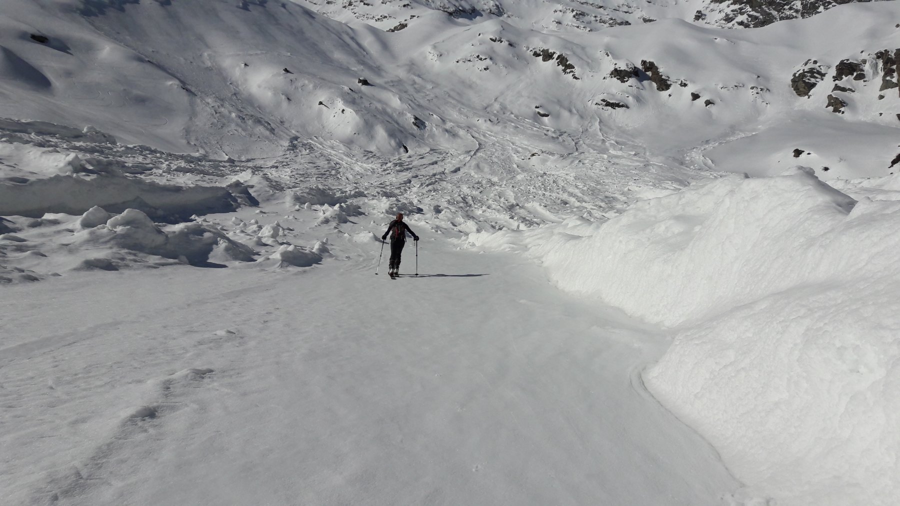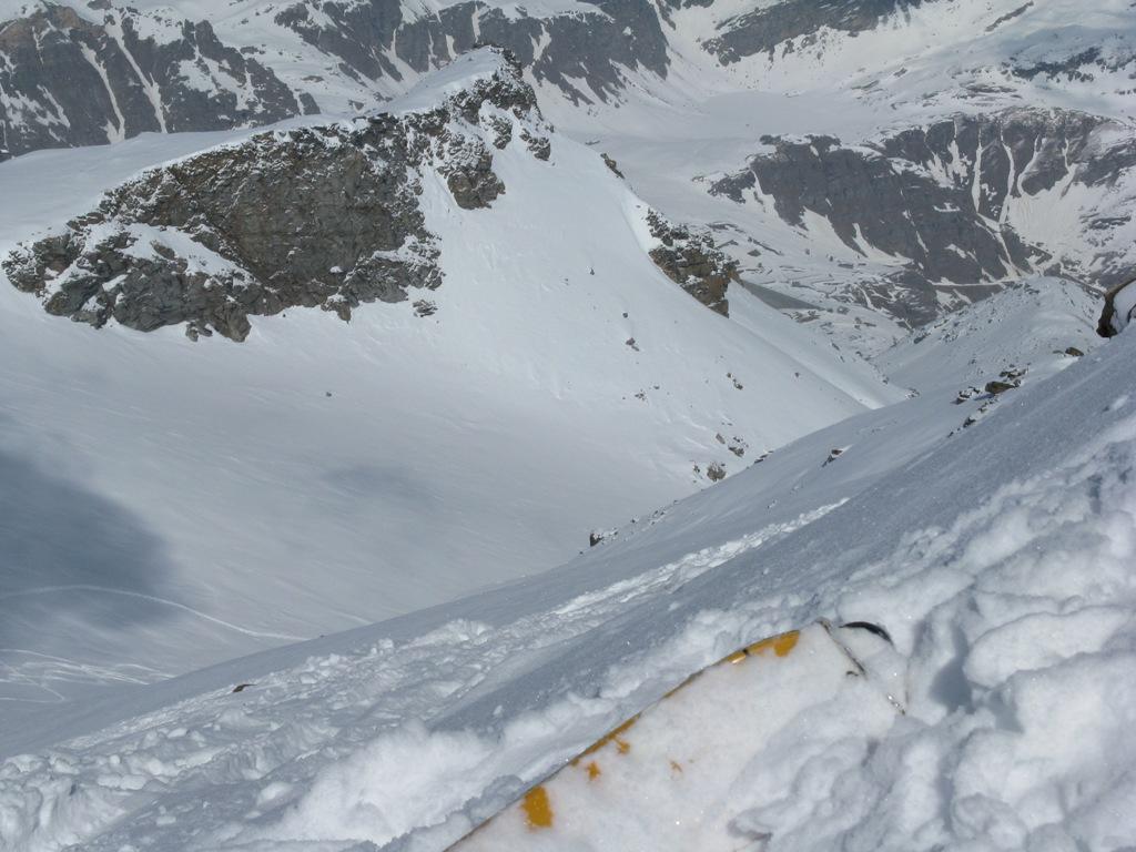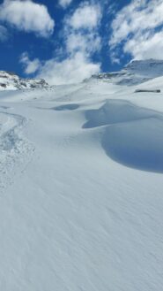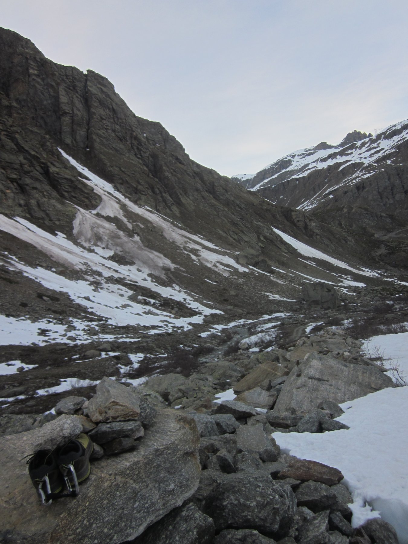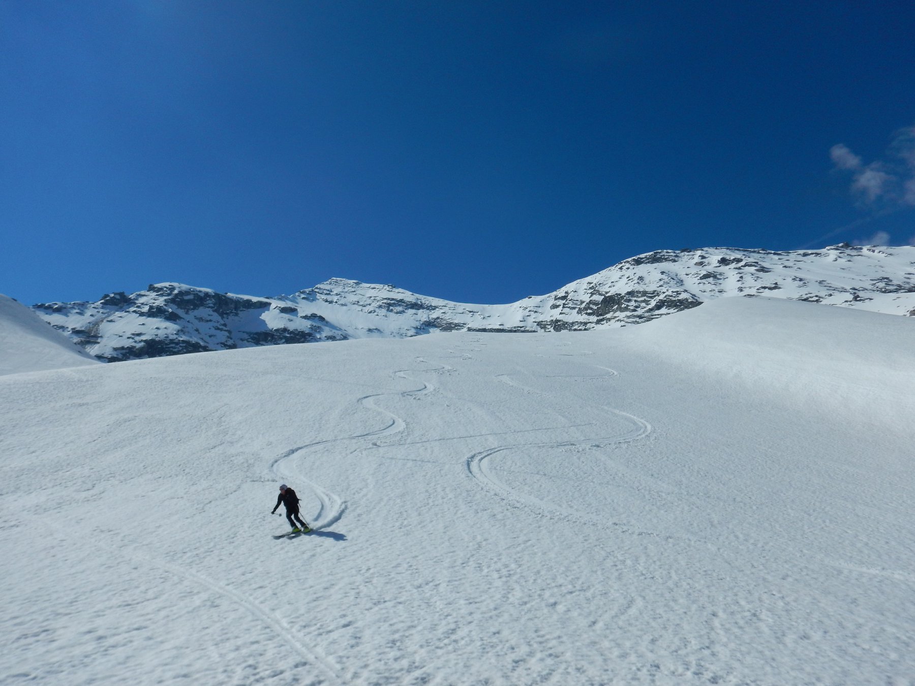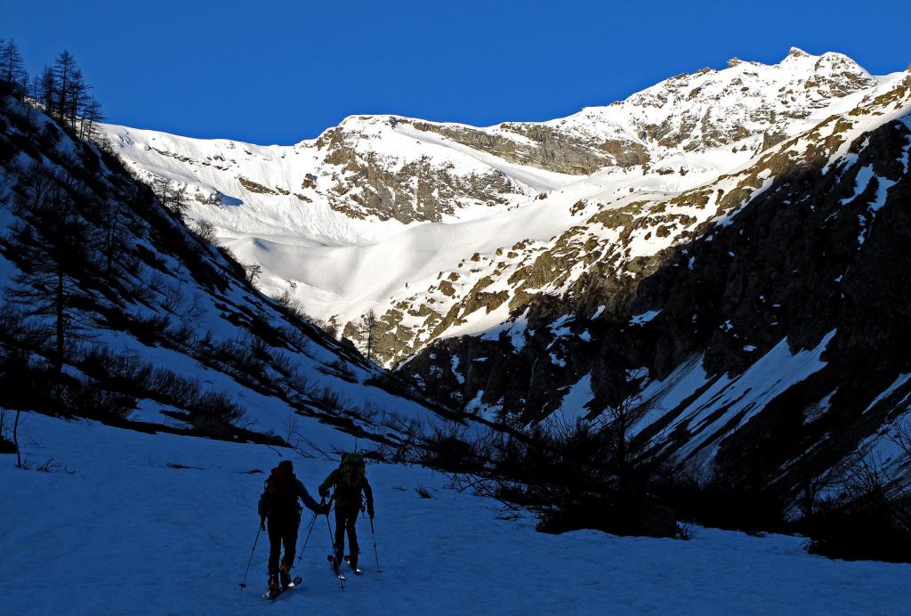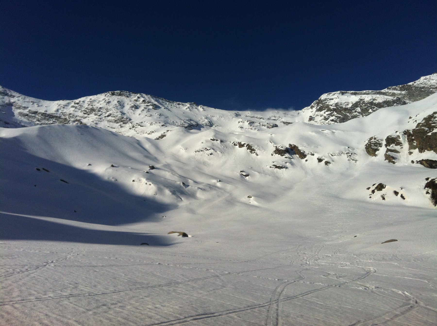 Risalire il vallone raggiungendo, dopo un breve ripido tratto, a una parte più pianeggiante (2150-2200 m). Un ripido pendio canale supera i 500 metri della parte inferiore ed adduce alle conche poste sotto al Colle del Carro. Attraversare in diagonale in direzione della rampa di altri 200-300 metri che supera quel che rimane del ghiacciaio del Carro.