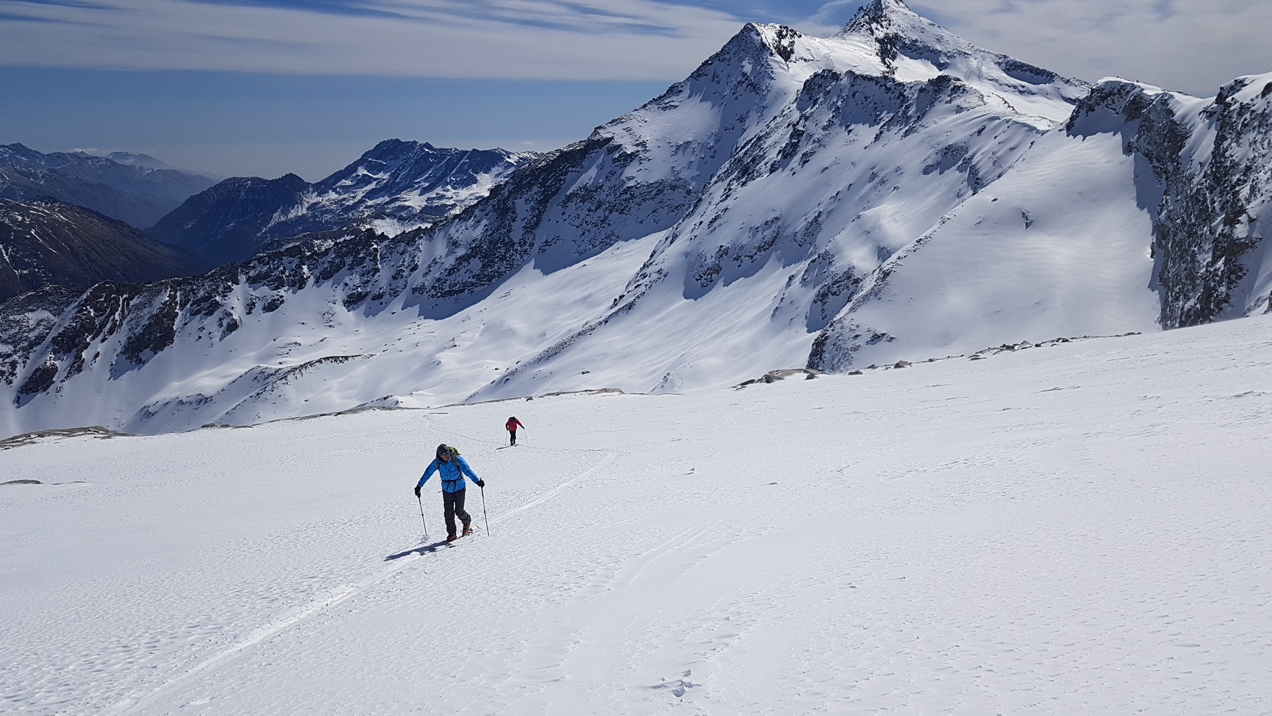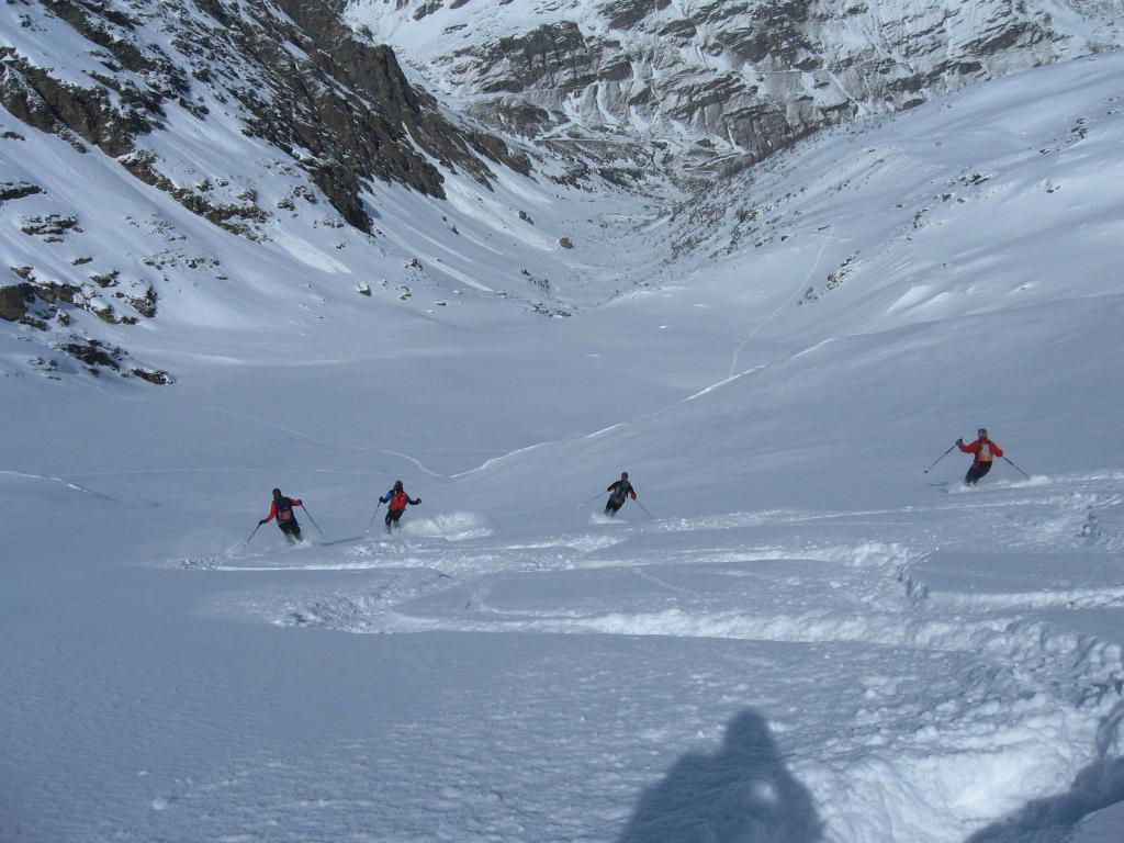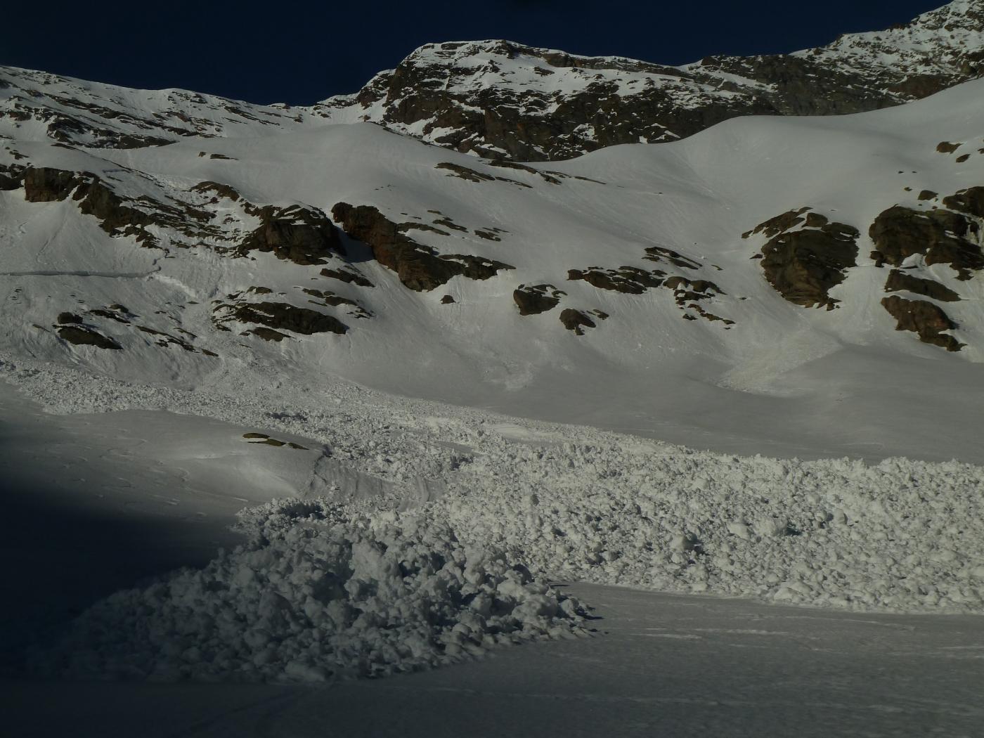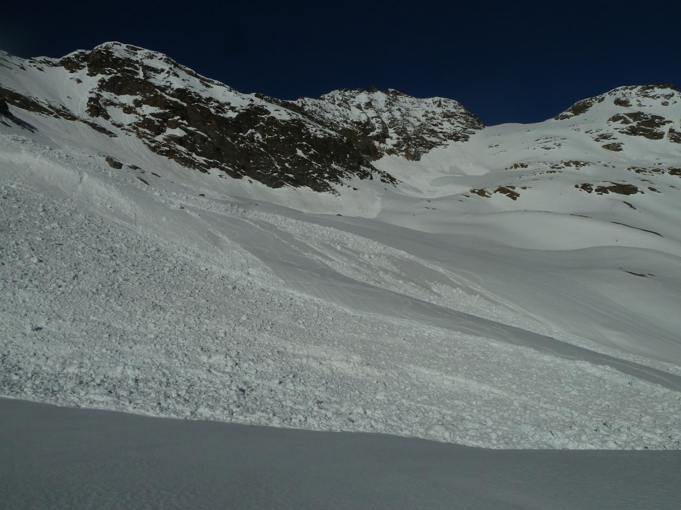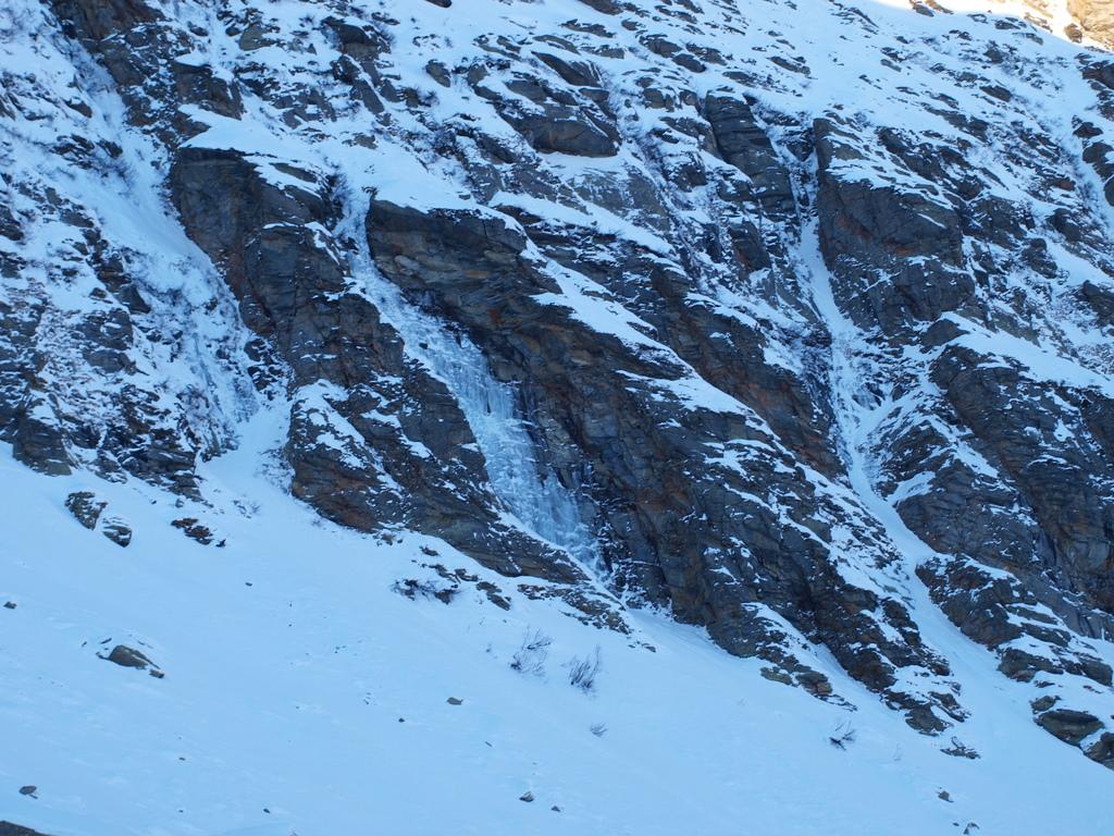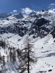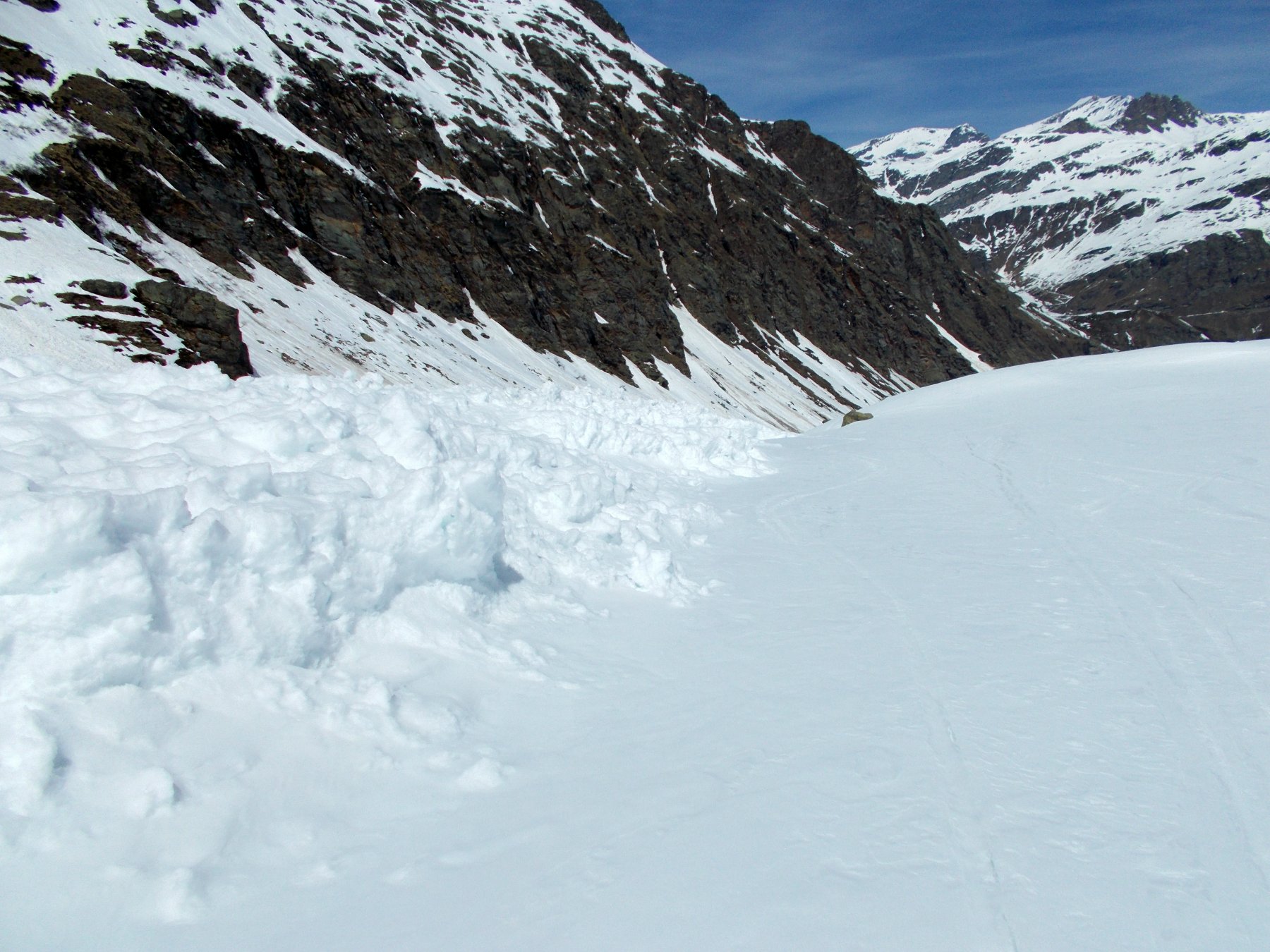Risalire il vallone raggiungendo, dopo un breve ripido tratto, a una parte più pianeggiante (2150-2200 m). Un ripido pendio canale supera i 500 metri della parte inferiore ed adduce alle conche poste sotto al Colle del Carro. Attraversare in diagonale in direzione della rampa di altri 200-300 metri che supera quel che rimane del ghiacciaio del Carro.