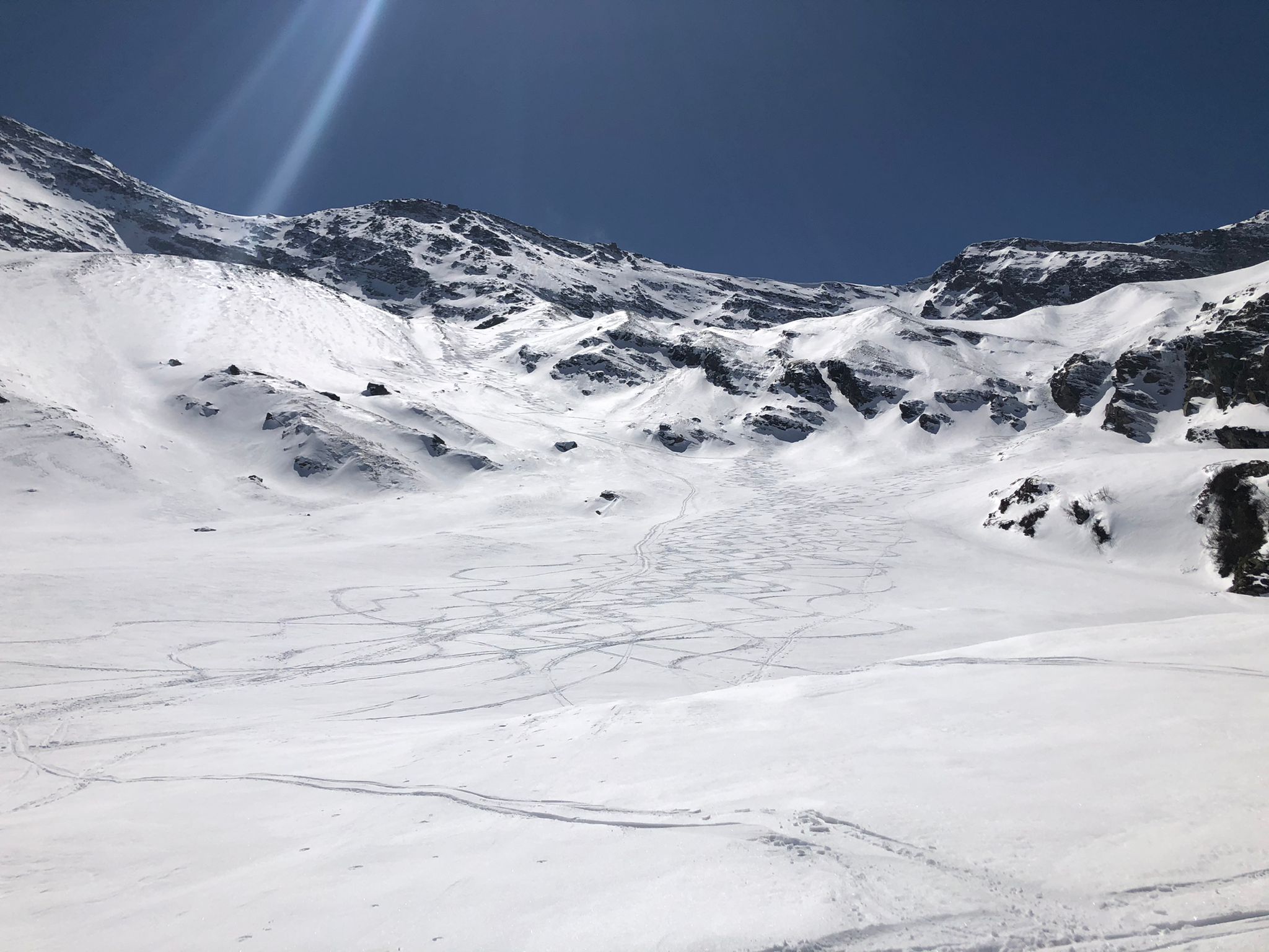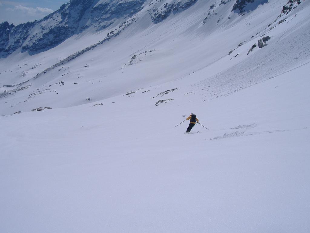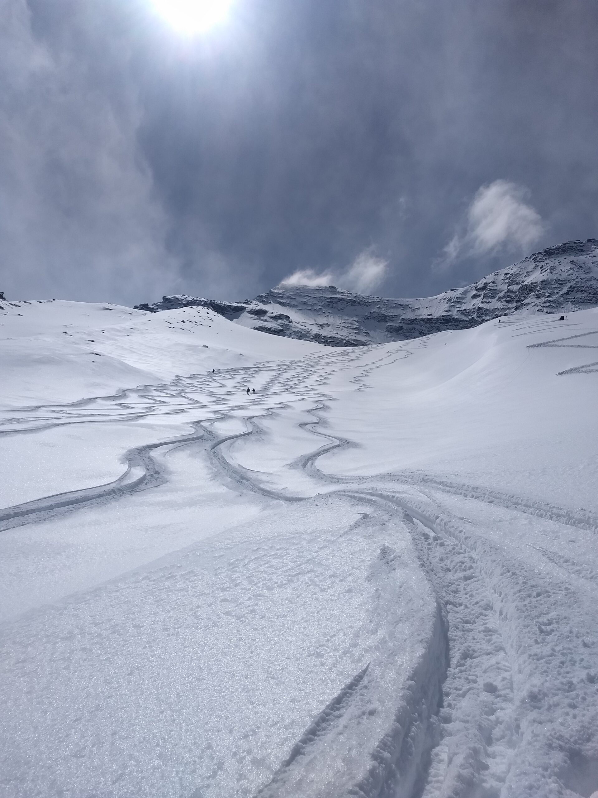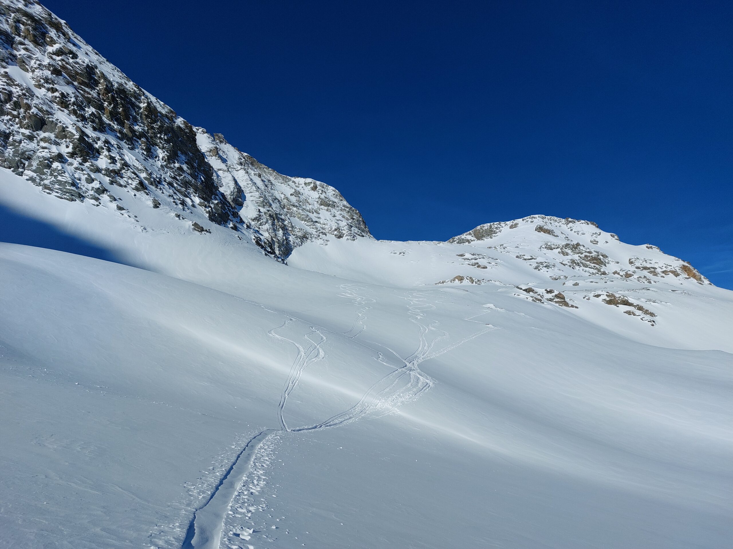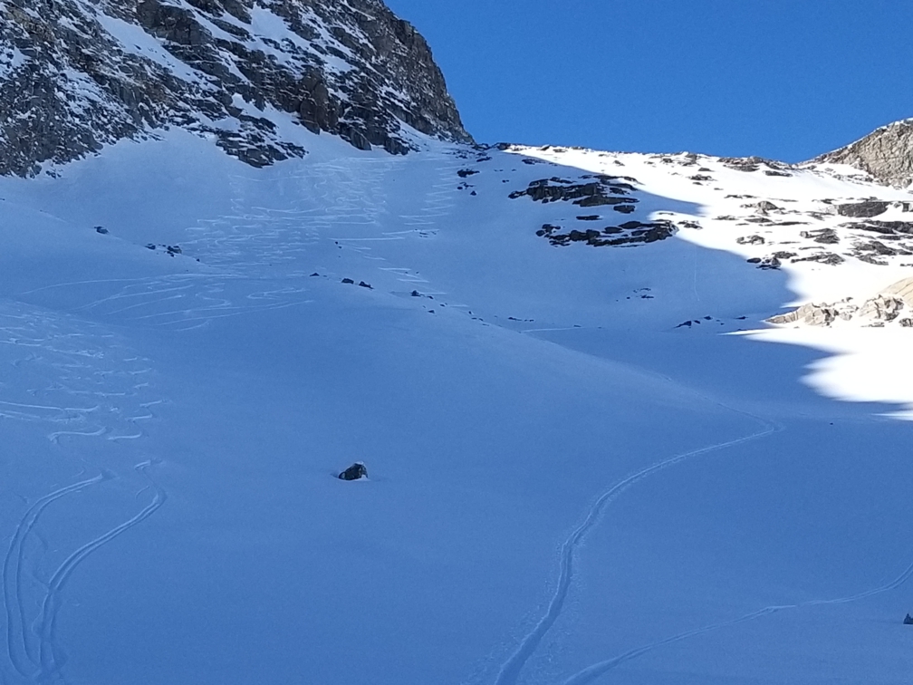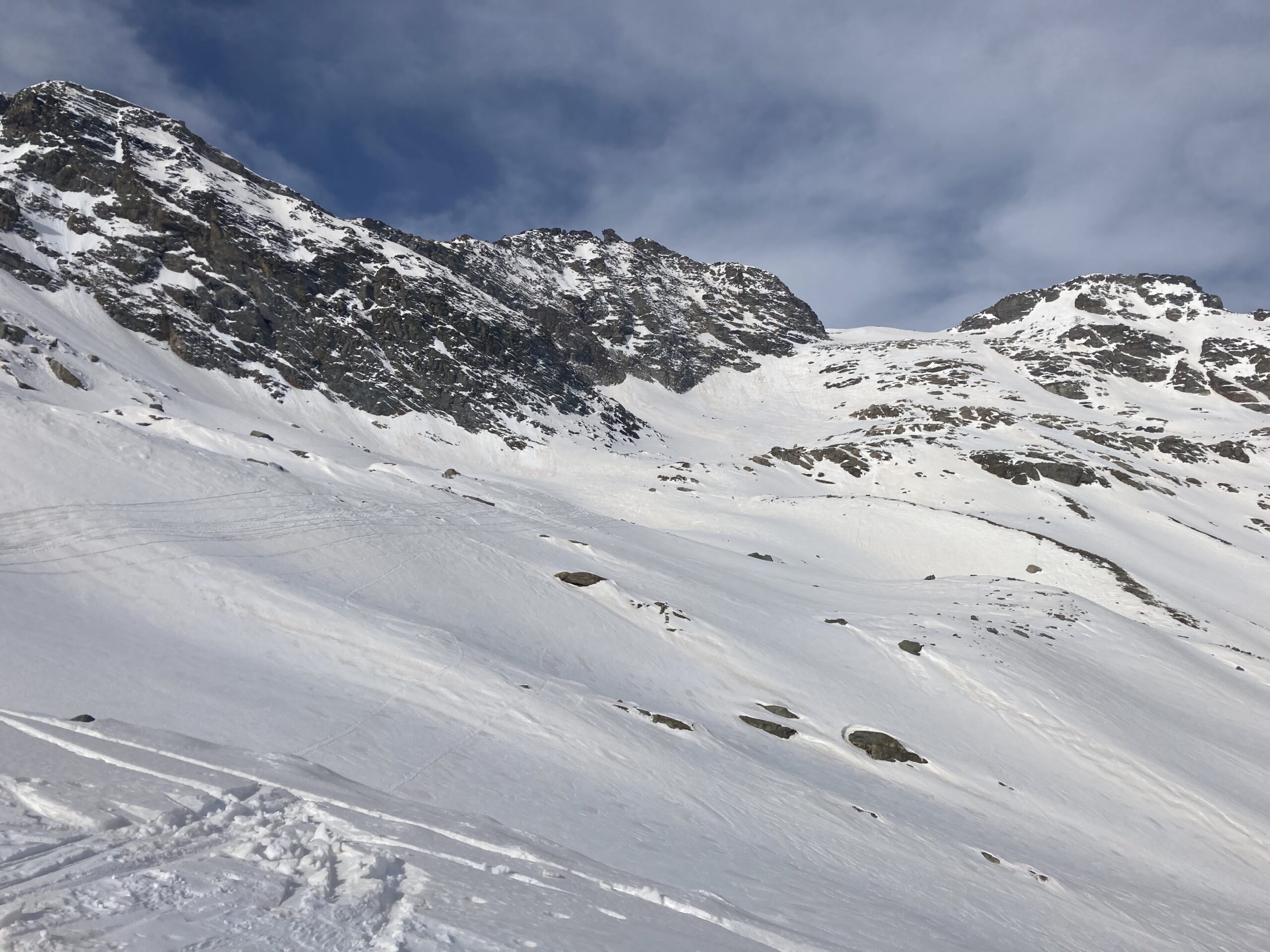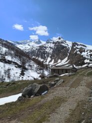 Risalire il vallone raggiungendo, dopo un breve ripido tratto, a una parte più pianeggiante (2150-2200 m). Un ripido pendio canale supera i 500 metri della parte inferiore ed adduce alle conche poste sotto al Colle del Carro. Attraversare in diagonale in direzione della rampa di altri 200-300 metri che supera quel che rimane del ghiacciaio del Carro.