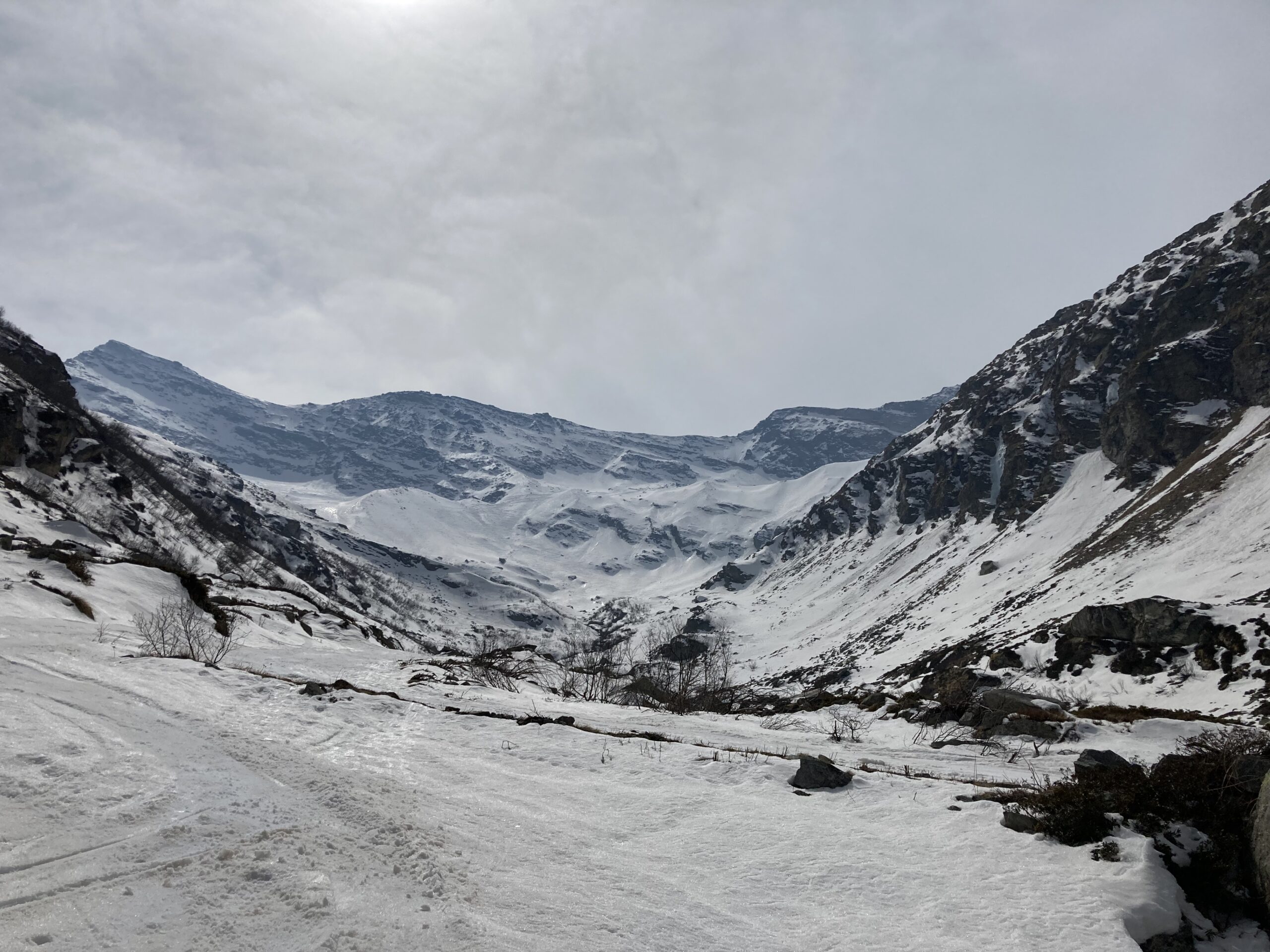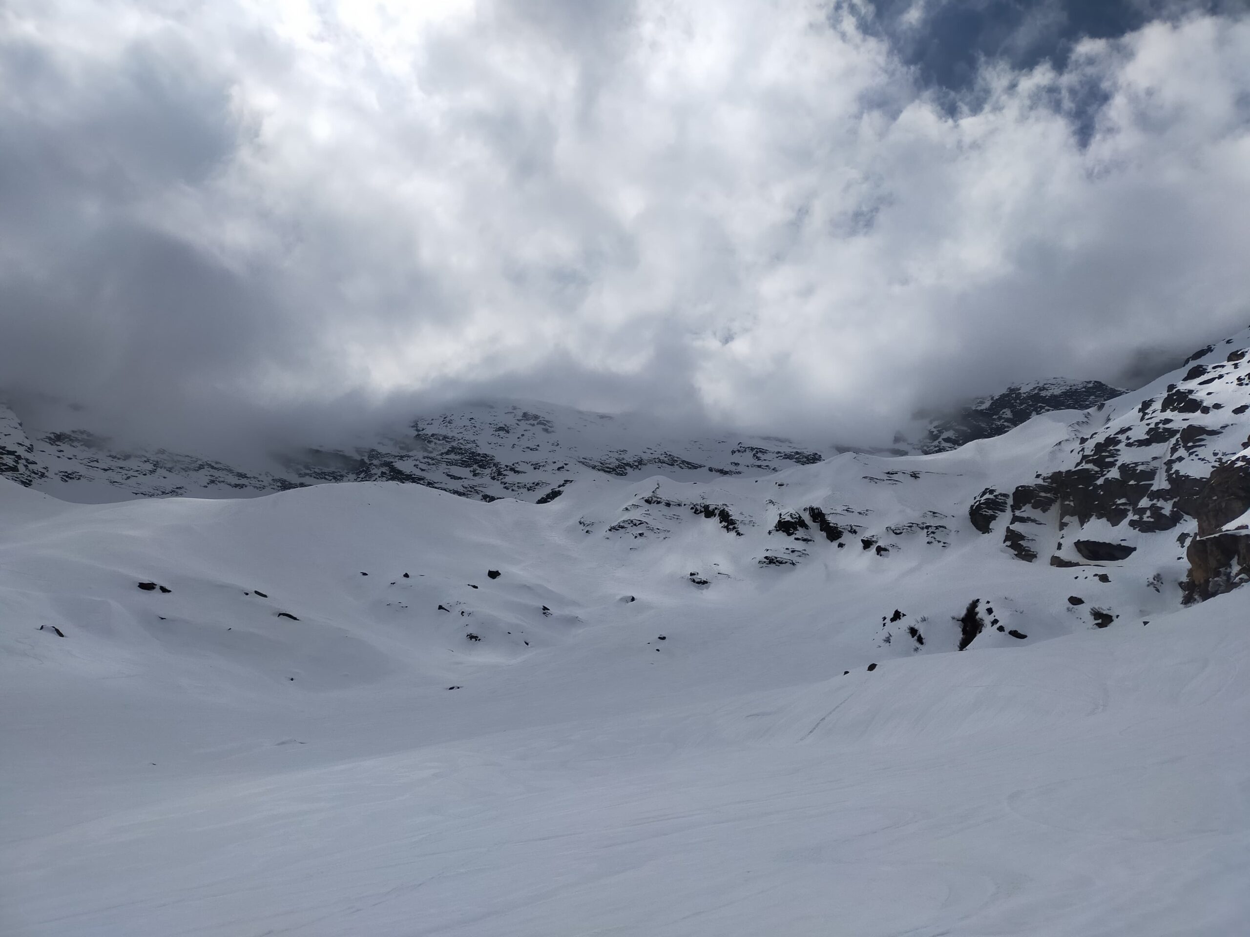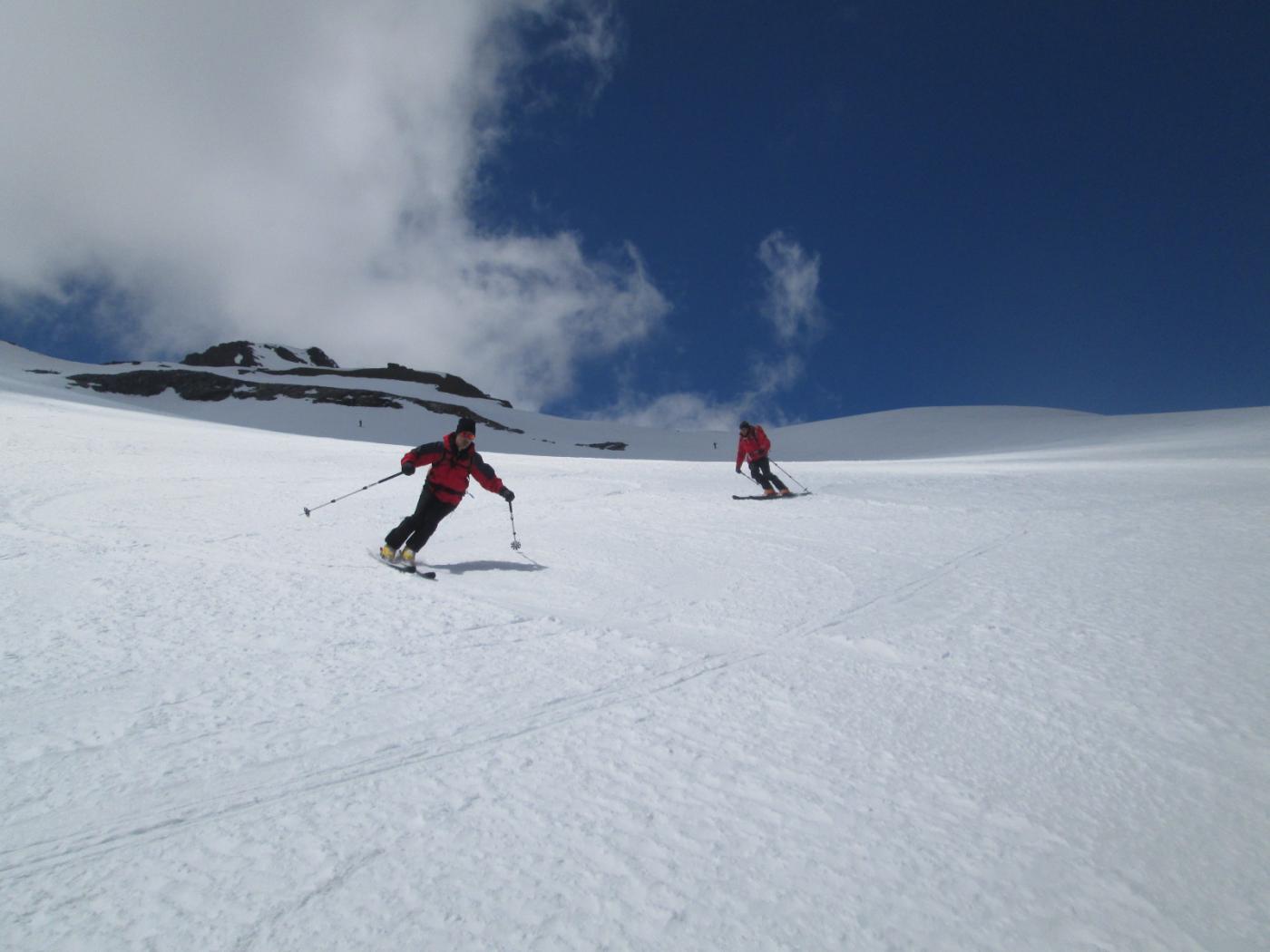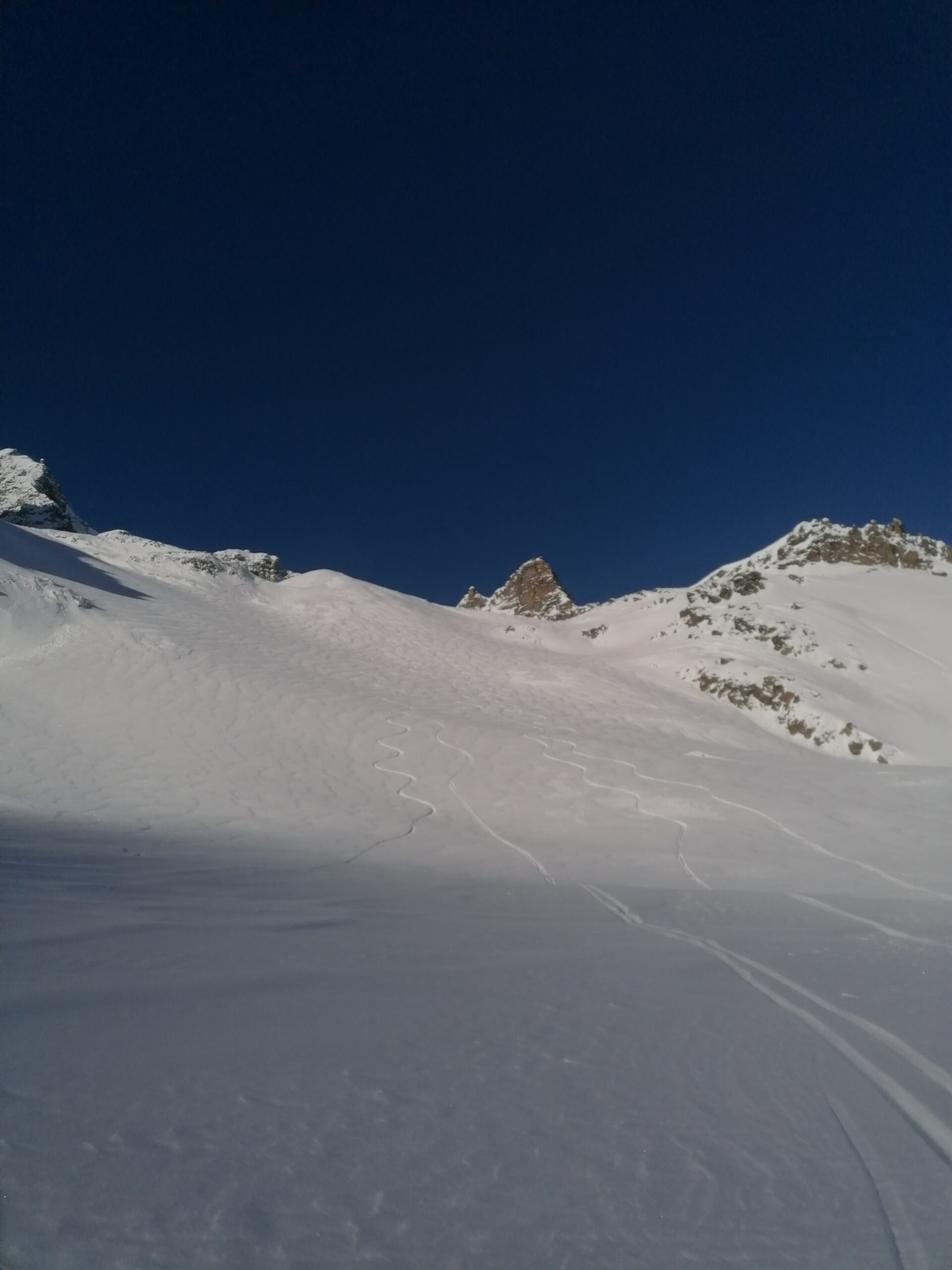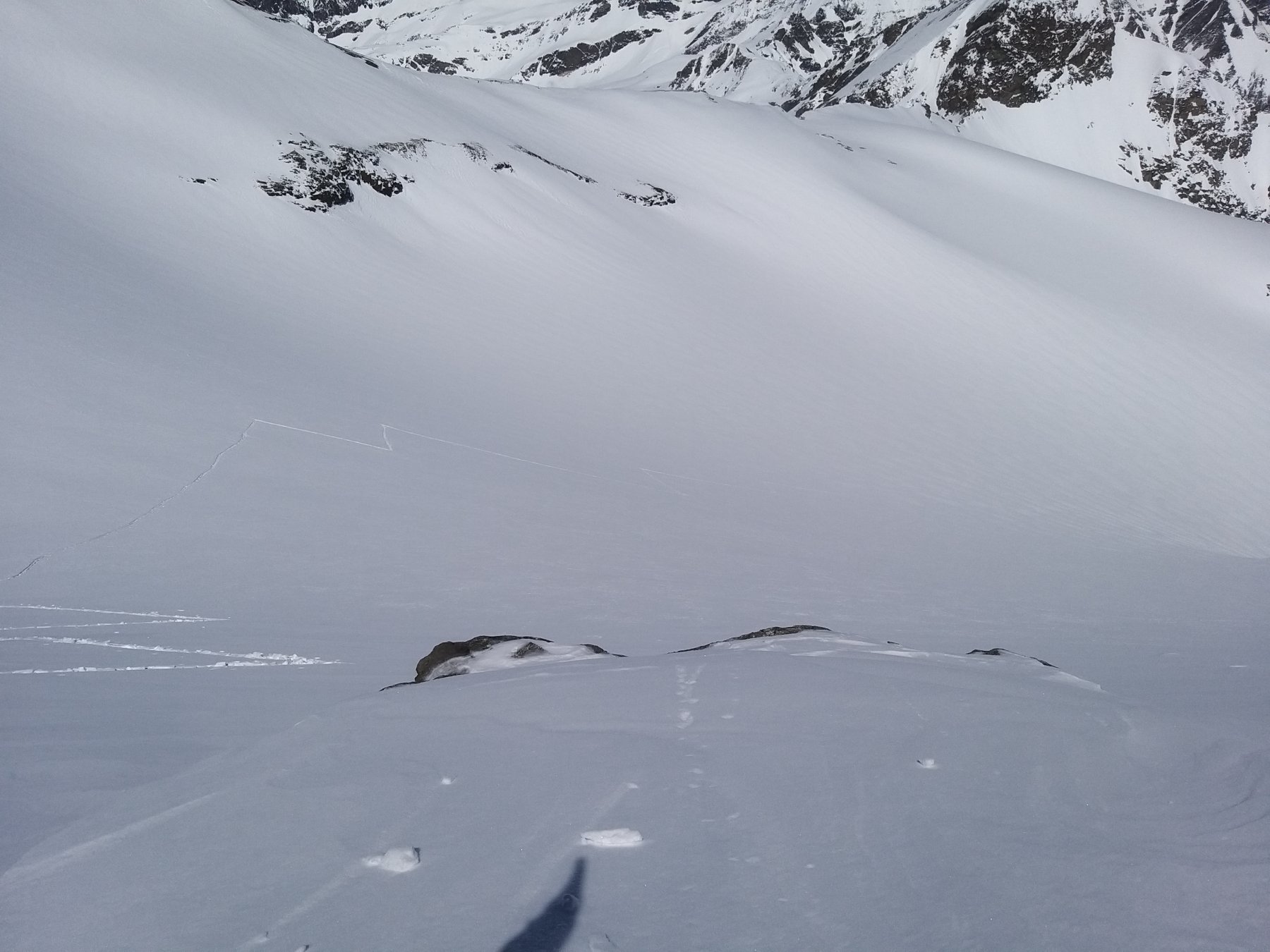 Risalire il vallone raggiungendo, dopo un breve ripido tratto, a una parte più pianeggiante (2150-2200 m). Un ripido pendio canale supera i 500 metri della parte inferiore ed adduce alle conche poste sotto al Colle del Carro. Attraversare in diagonale in direzione della rampa di altri 200-300 metri che supera quel che rimane del ghiacciaio del Carro.