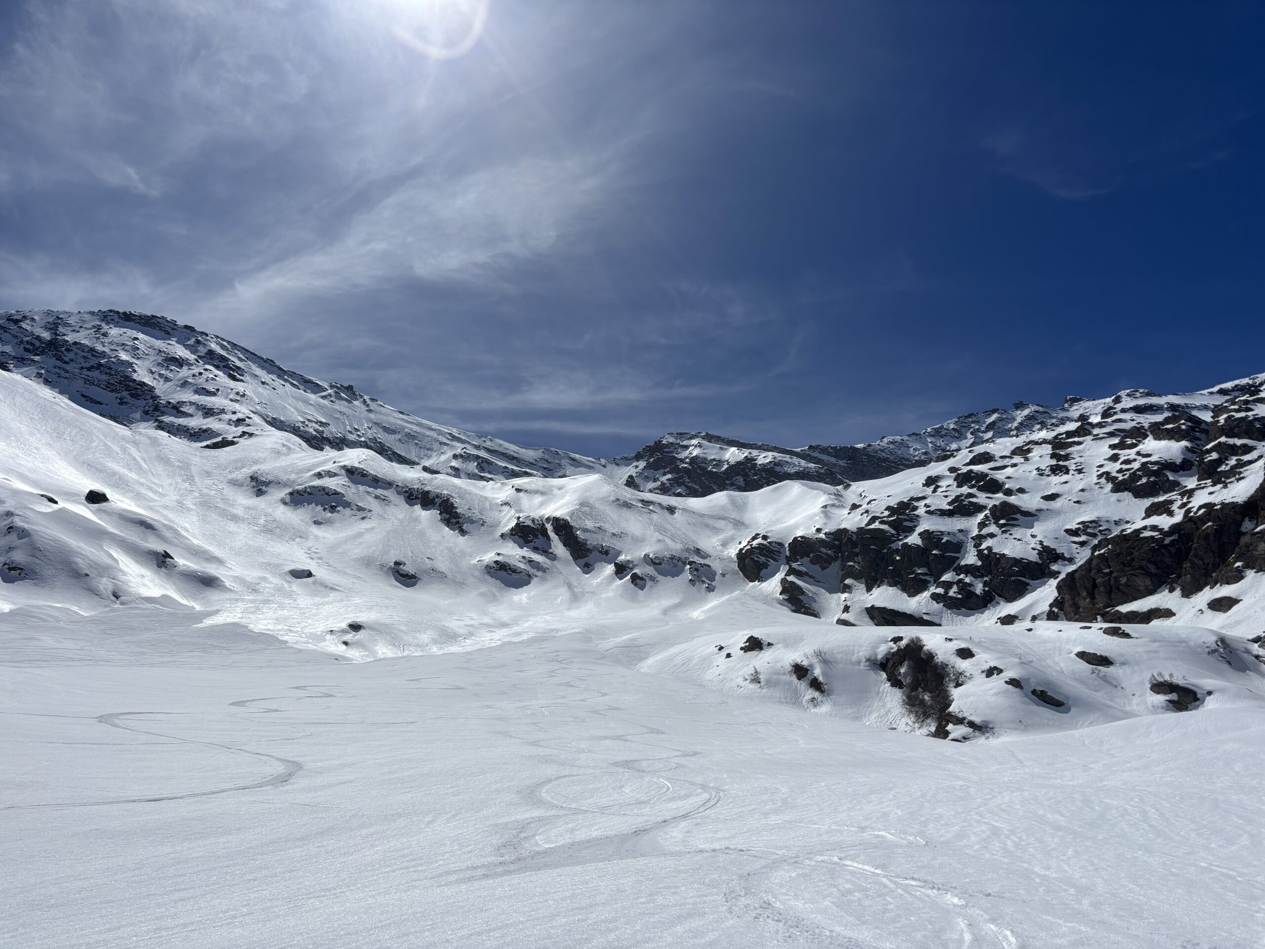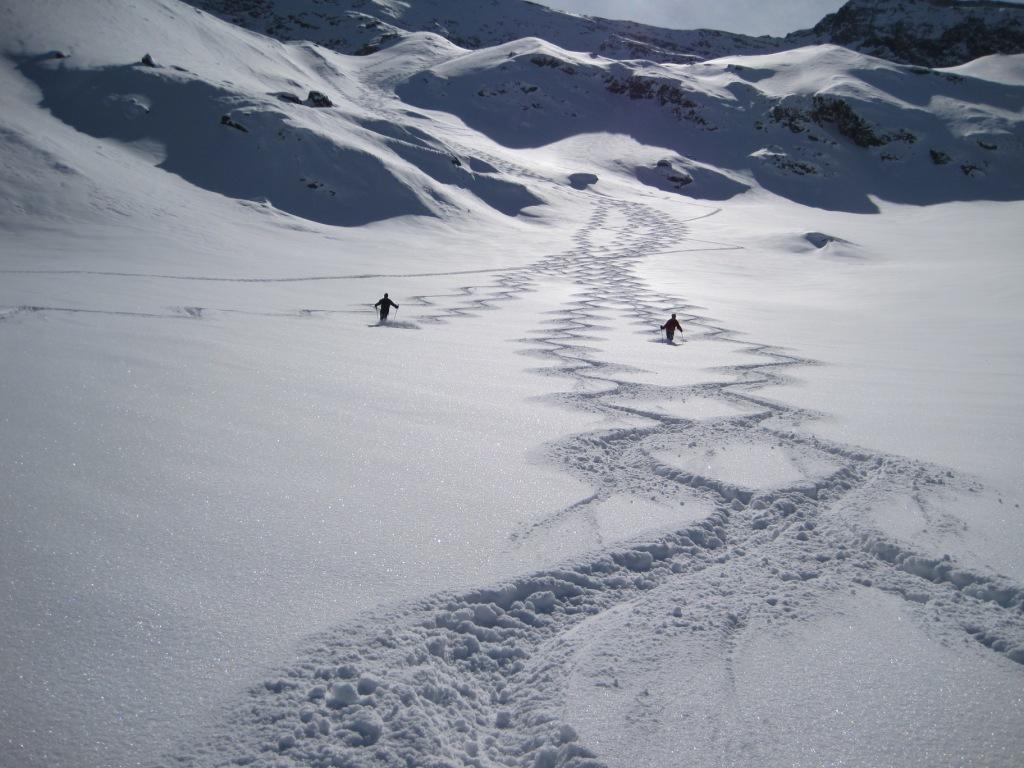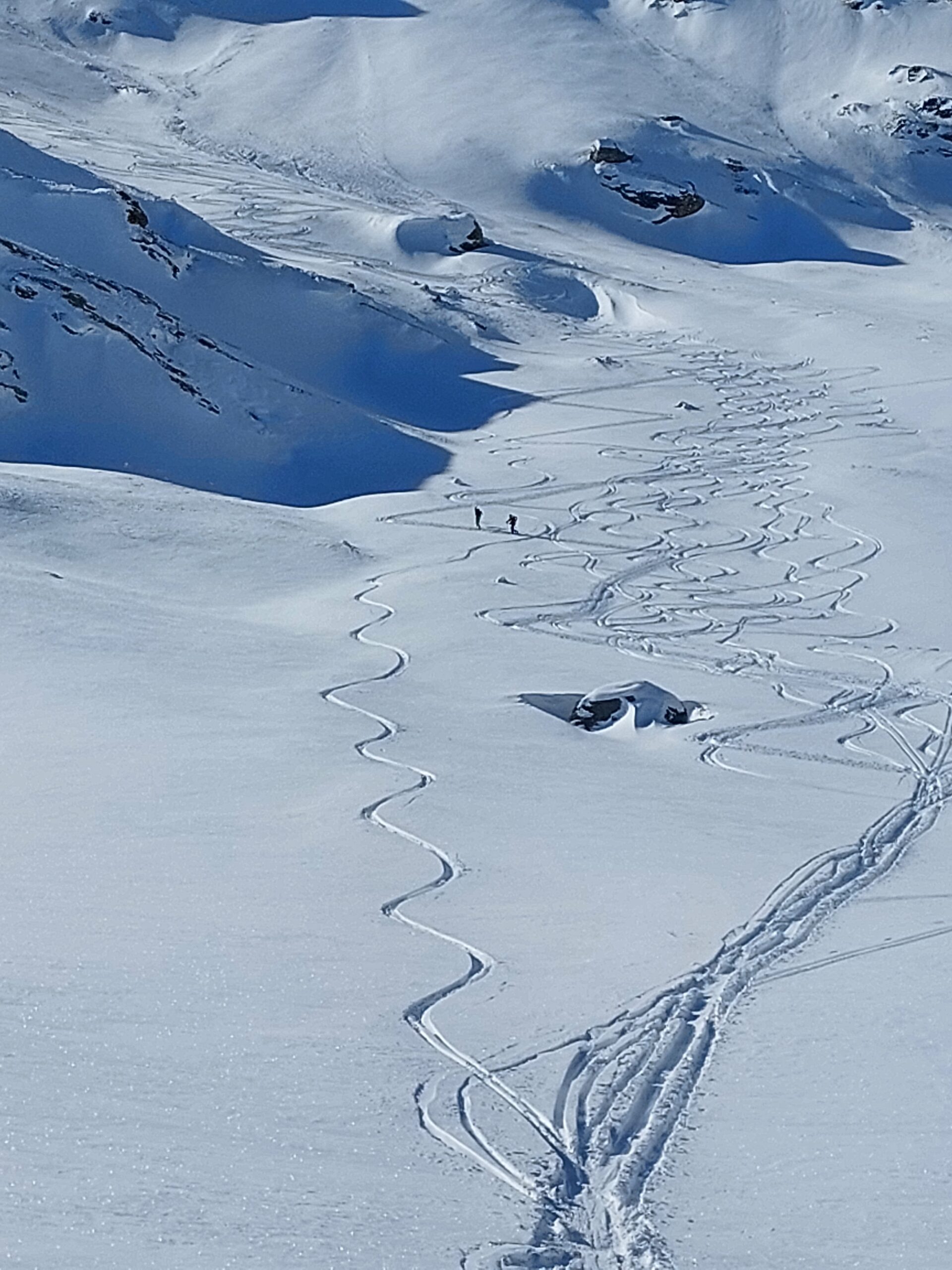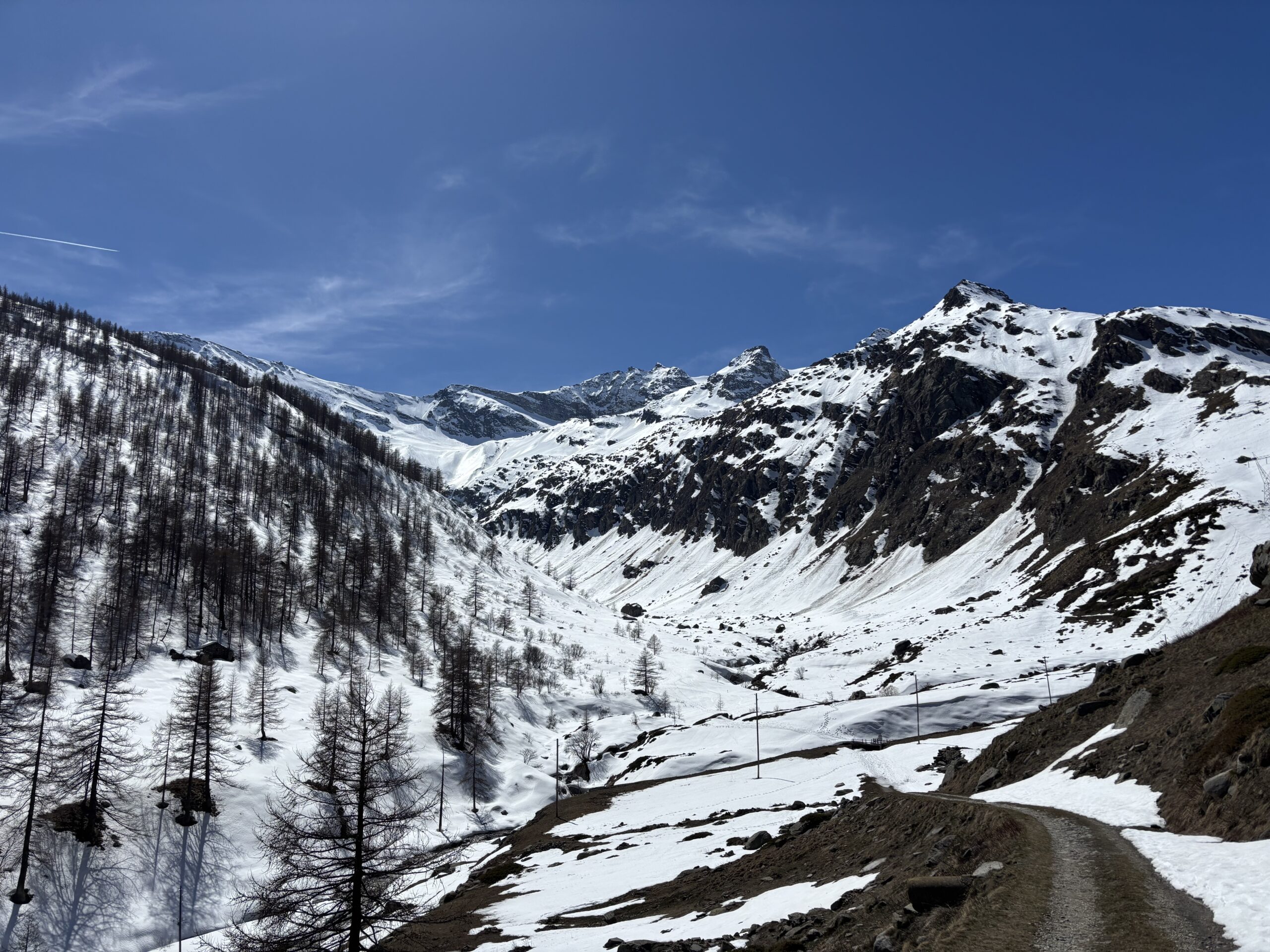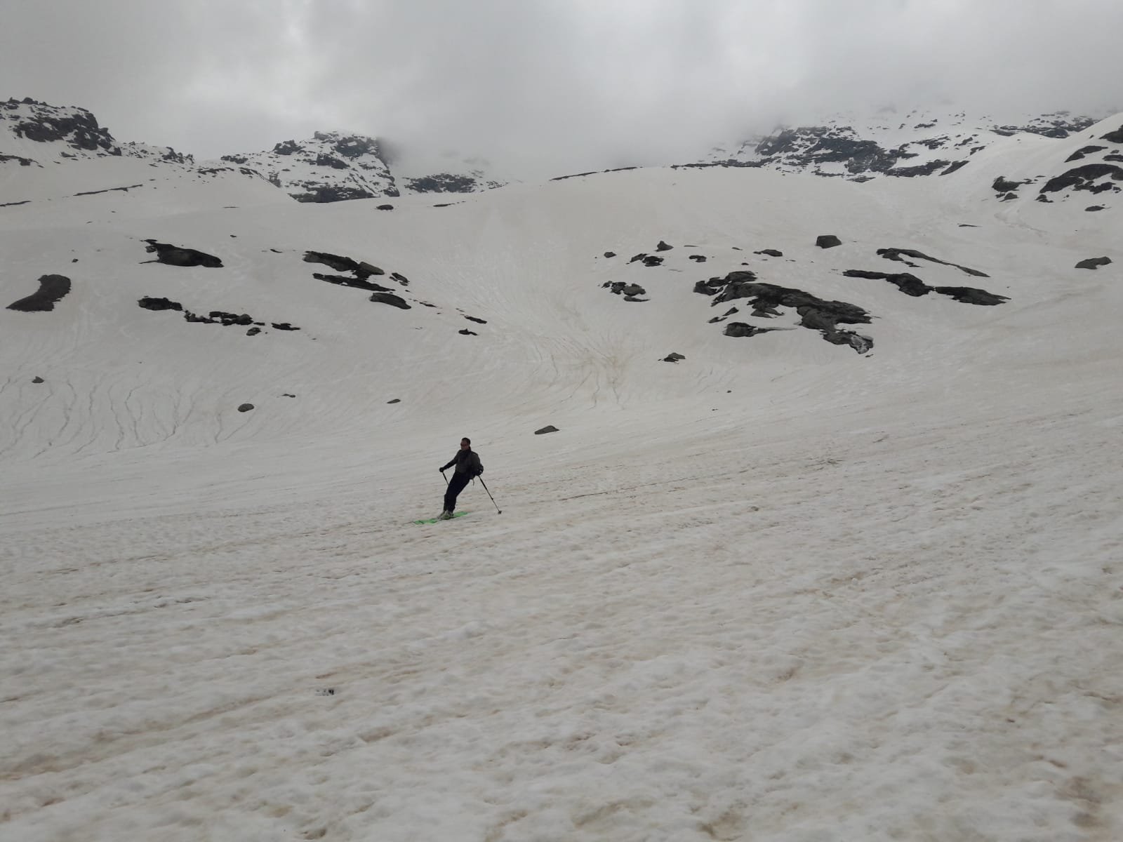 Risalire il vallone raggiungendo, dopo un breve ripido tratto, a una parte più pianeggiante (2150-2200 m). Un ripido pendio canale supera i 500 metri della parte inferiore ed adduce alle conche poste sotto al Colle del Carro. Attraversare in diagonale in direzione della rampa di altri 200-300 metri che supera quel che rimane del ghiacciaio del Carro.