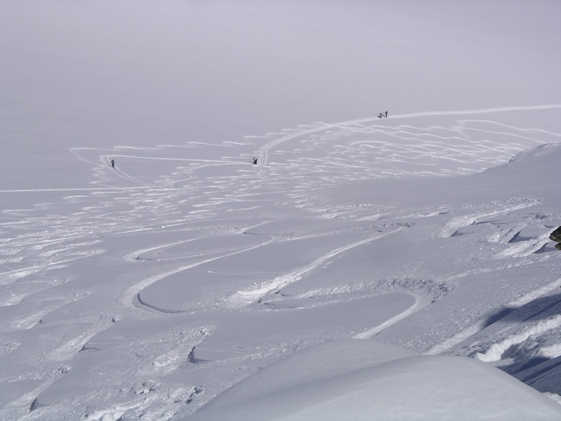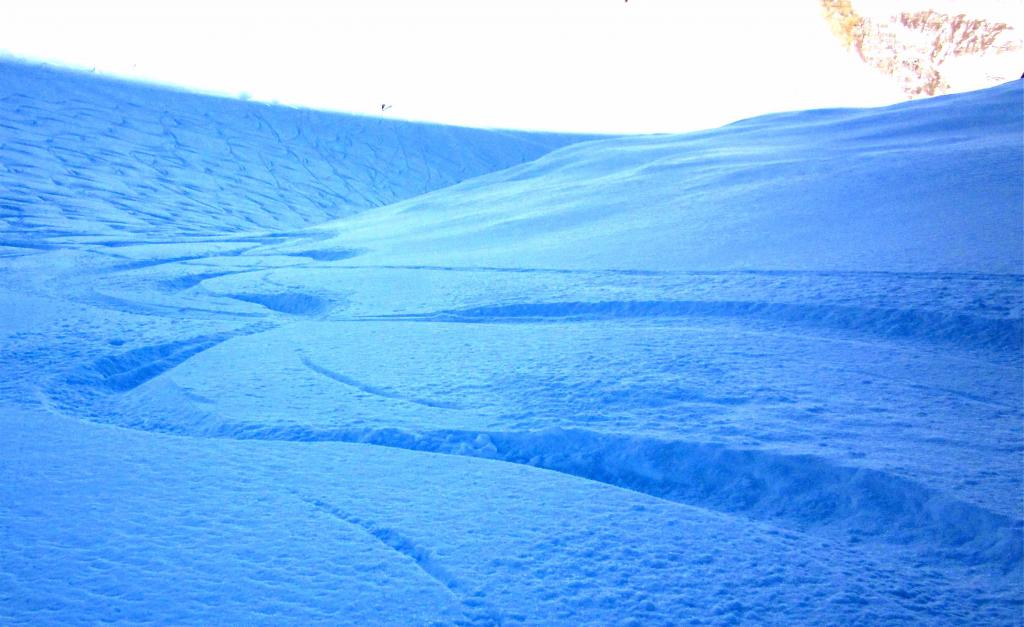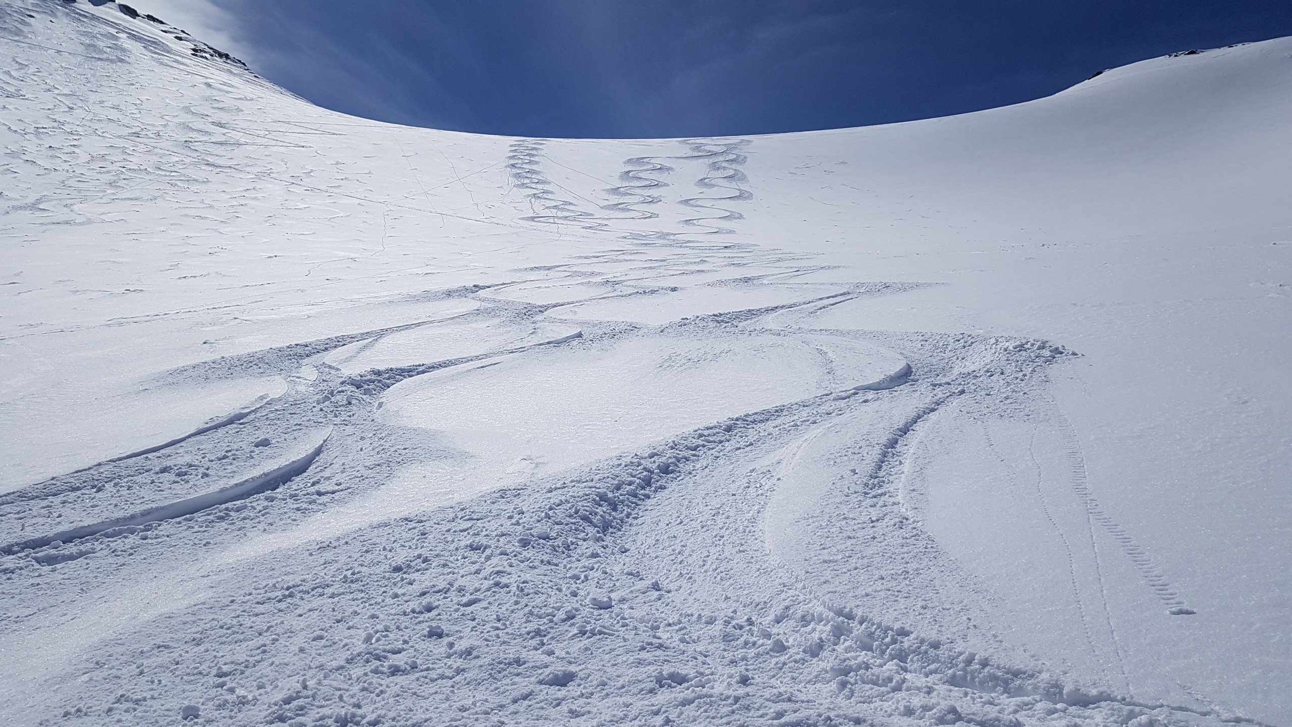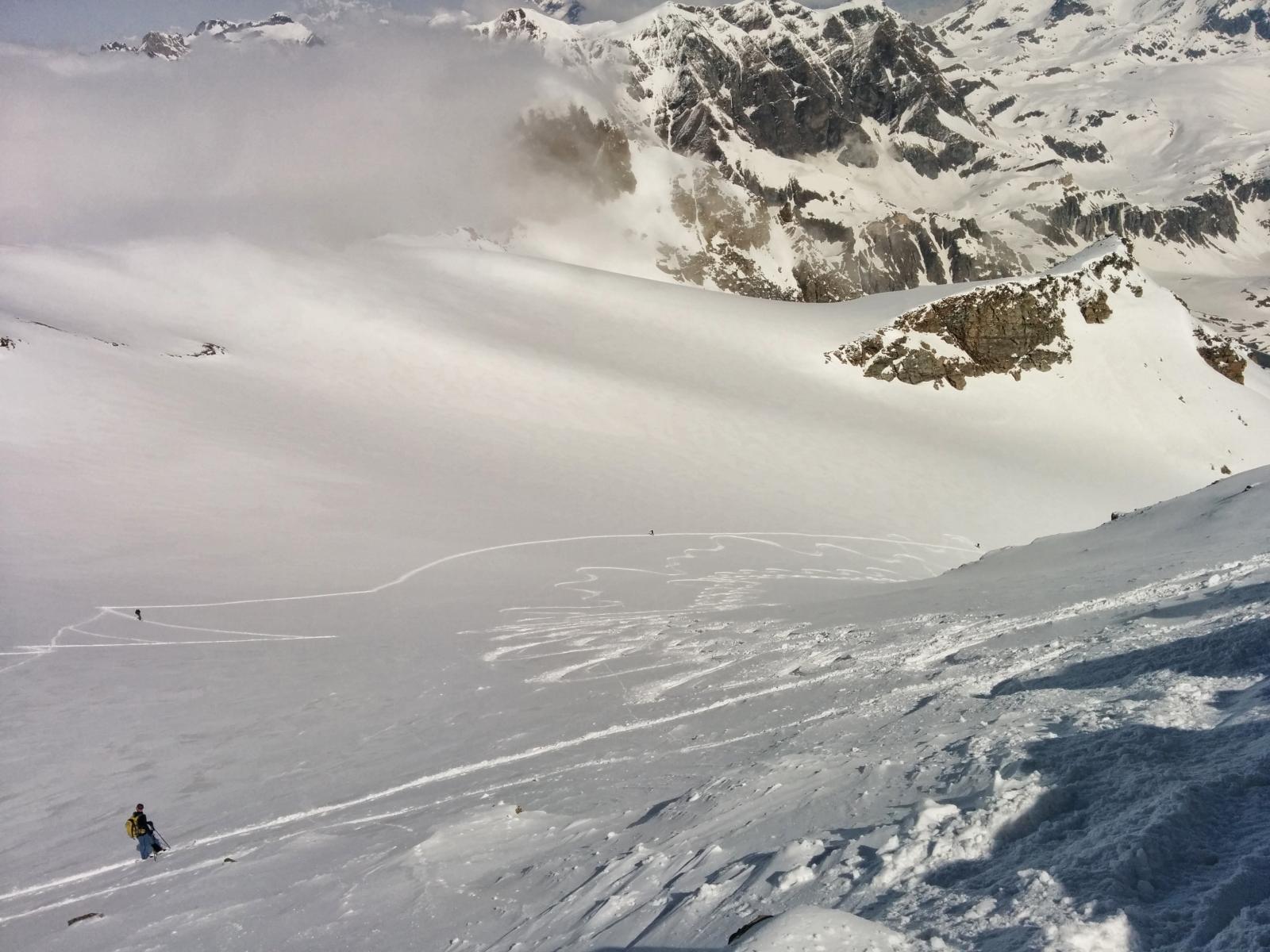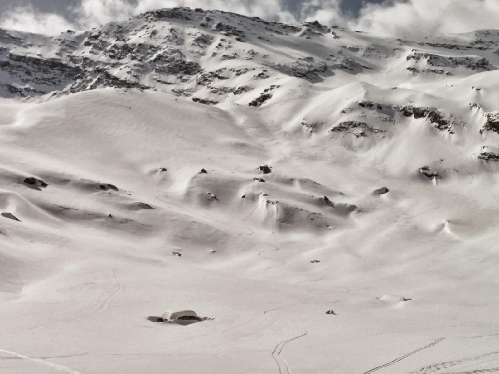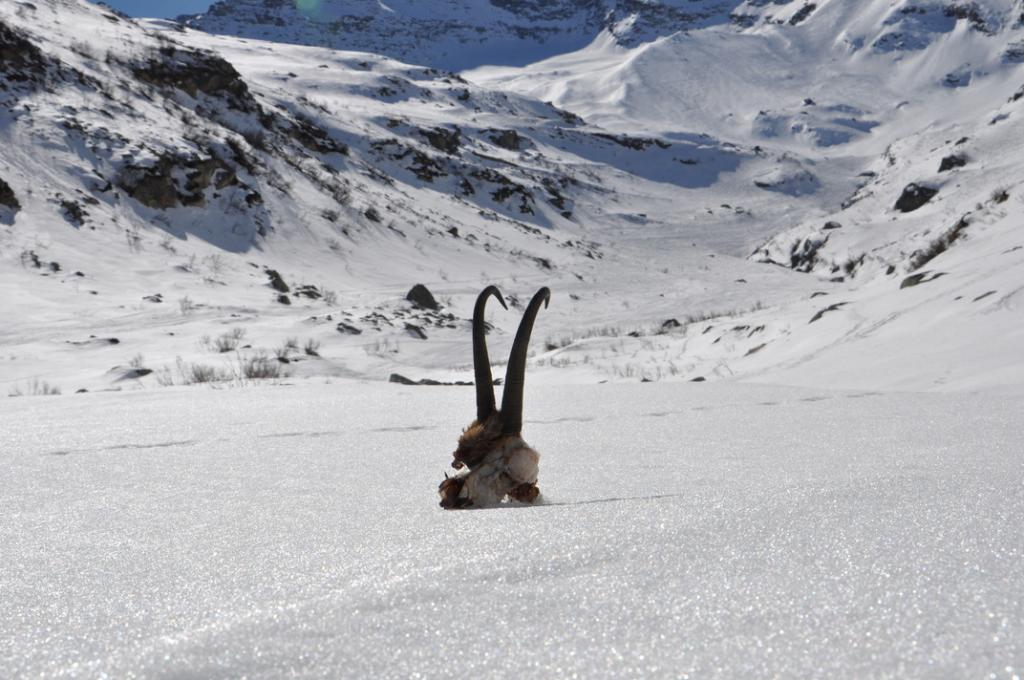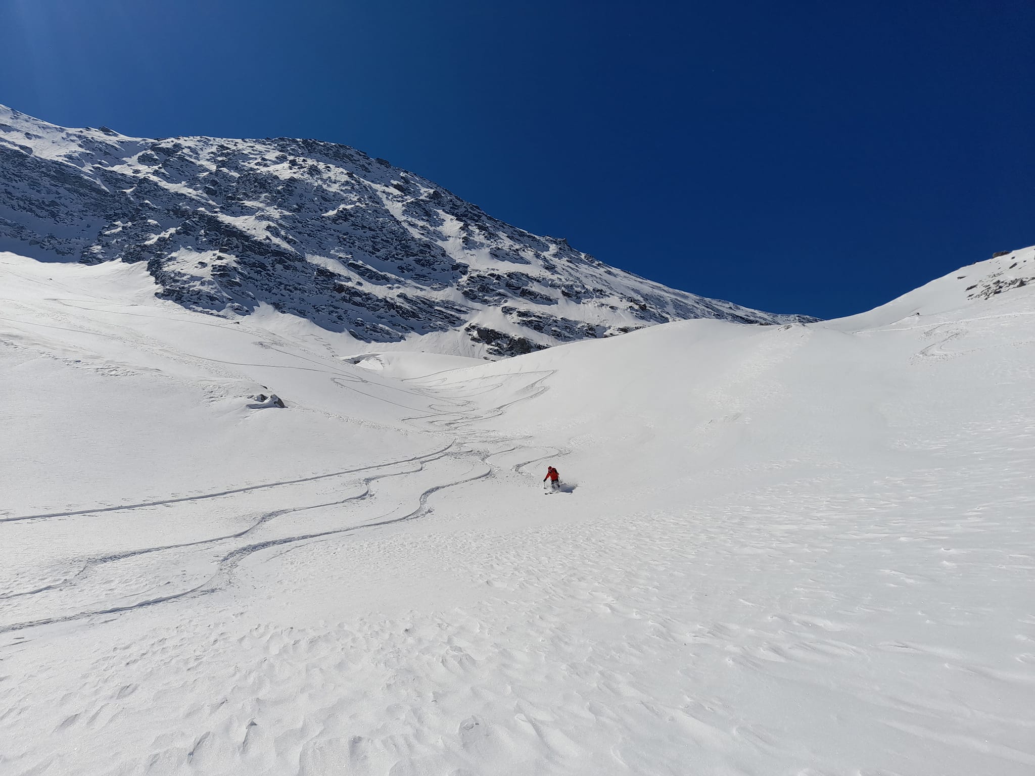 Risalire il vallone raggiungendo, dopo un breve ripido tratto, a una parte più pianeggiante (2150-2200 m). Un ripido pendio canale supera i 500 metri della parte inferiore ed adduce alle conche poste sotto al Colle del Carro. Attraversare in diagonale in direzione della rampa di altri 200-300 metri che supera quel che rimane del ghiacciaio del Carro.