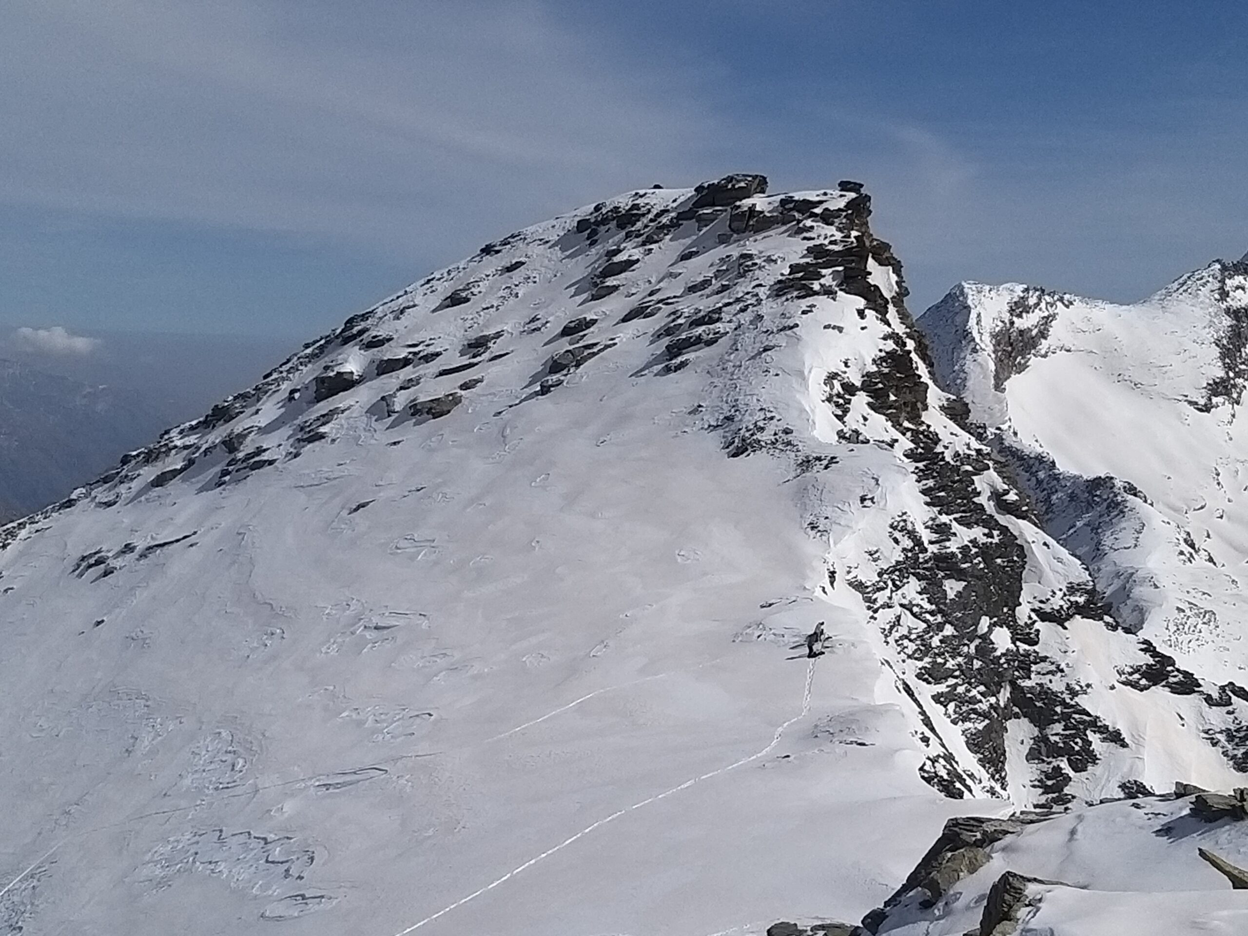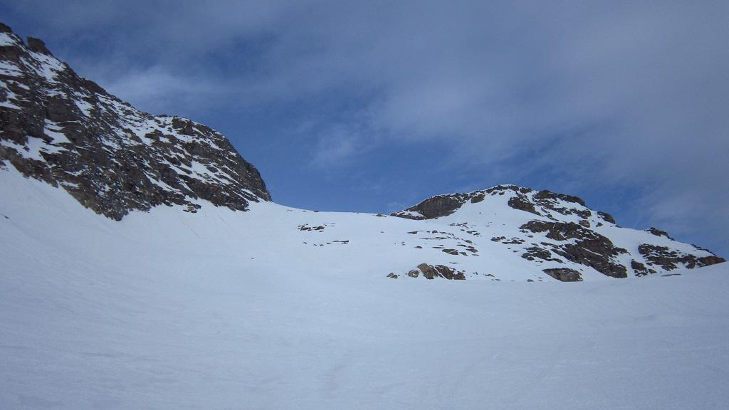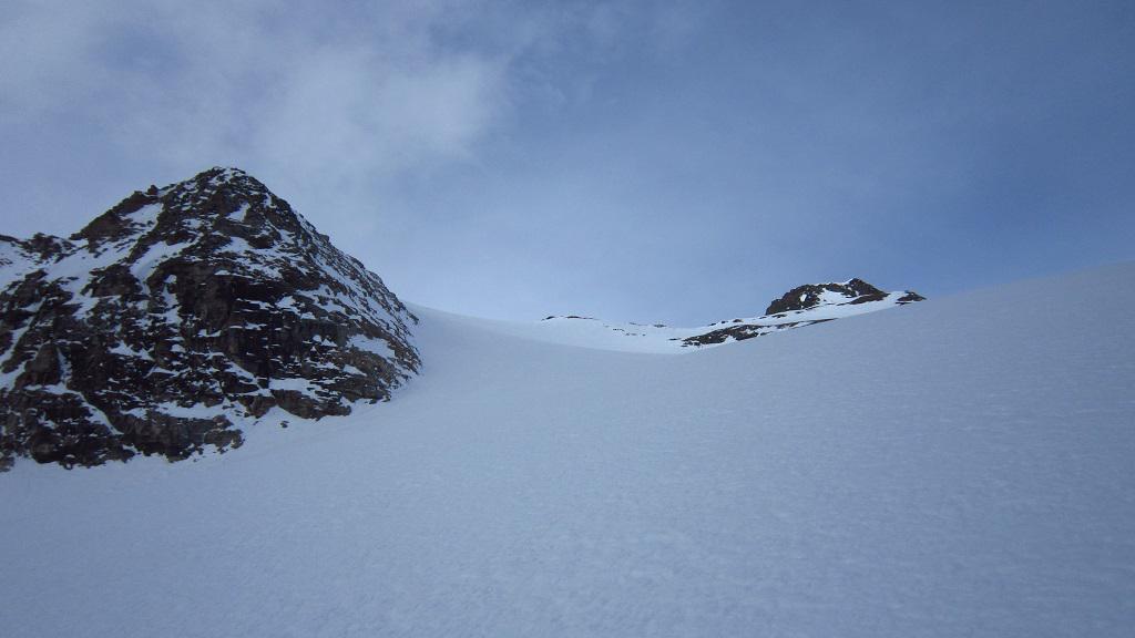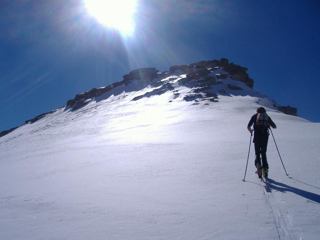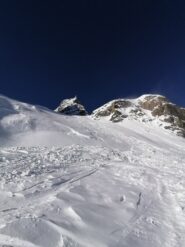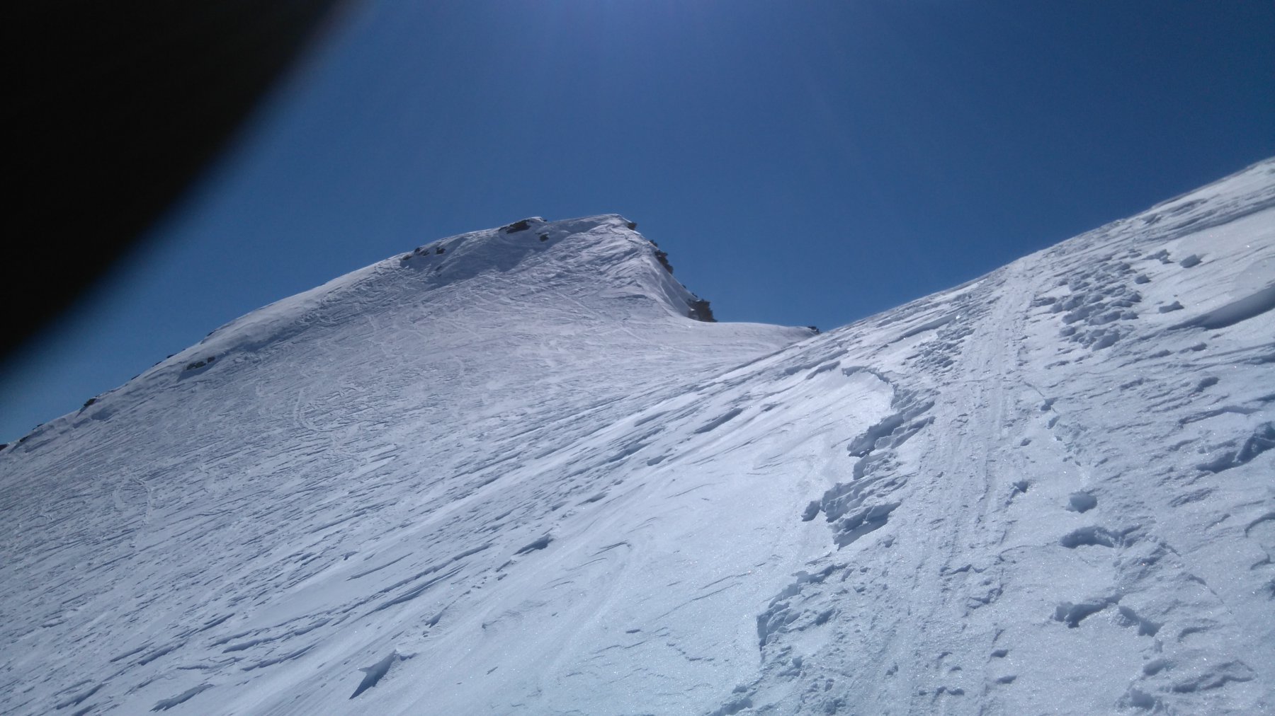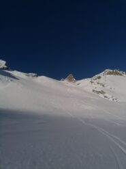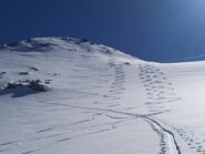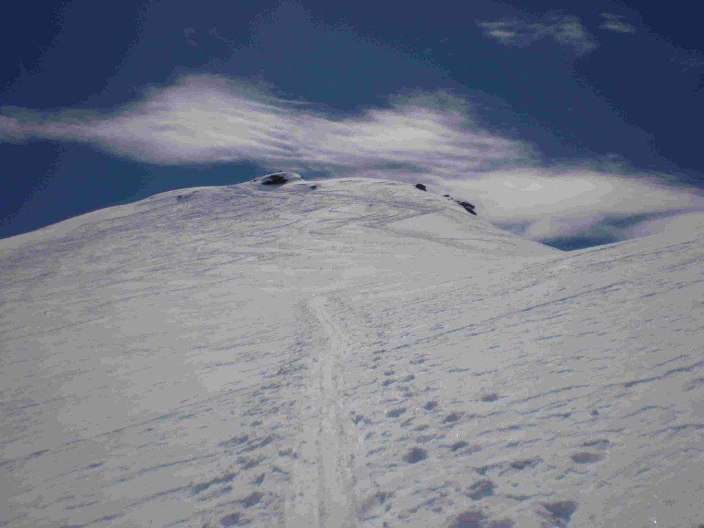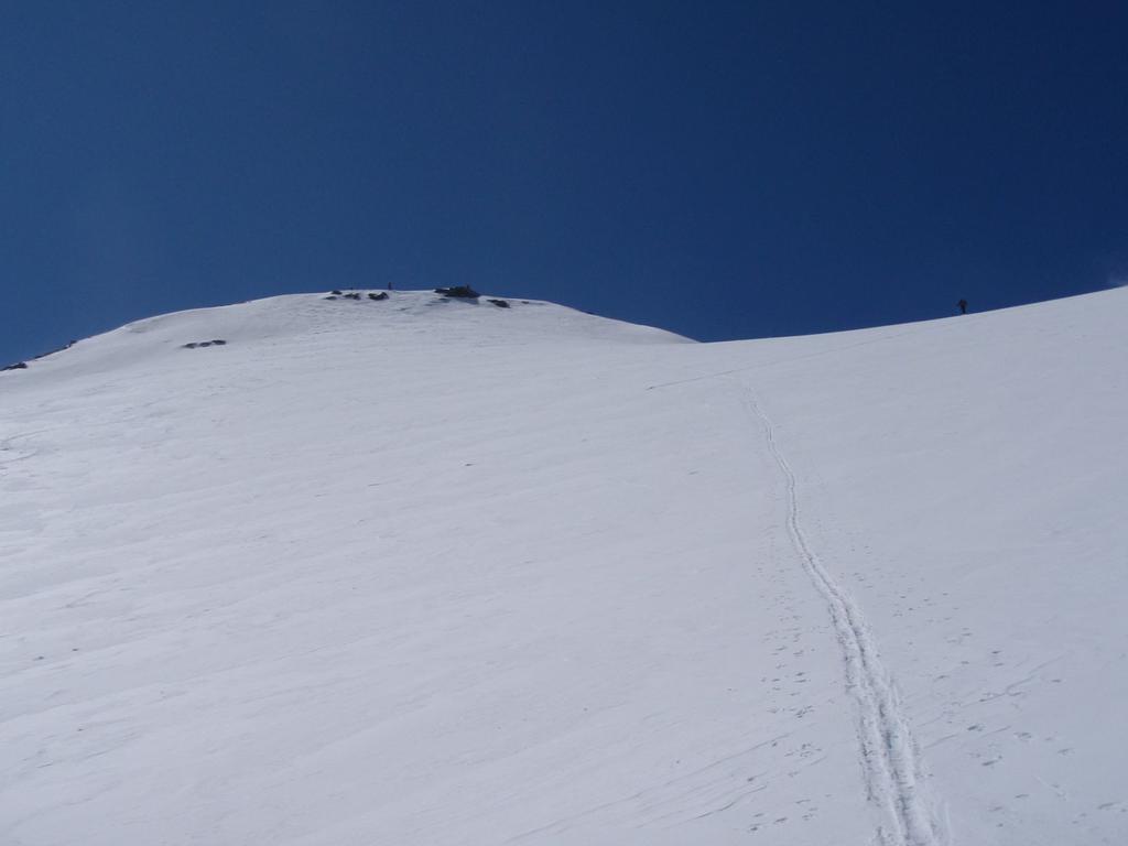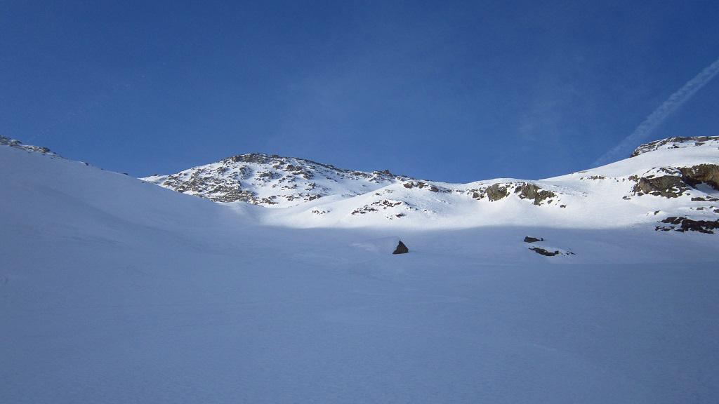 Al termine di questa rampa la pendenza diminuisce e si piega a sinistra in direzione della cima che si raggiunge agevolmente, direttamente o per la cresta di frontiera.