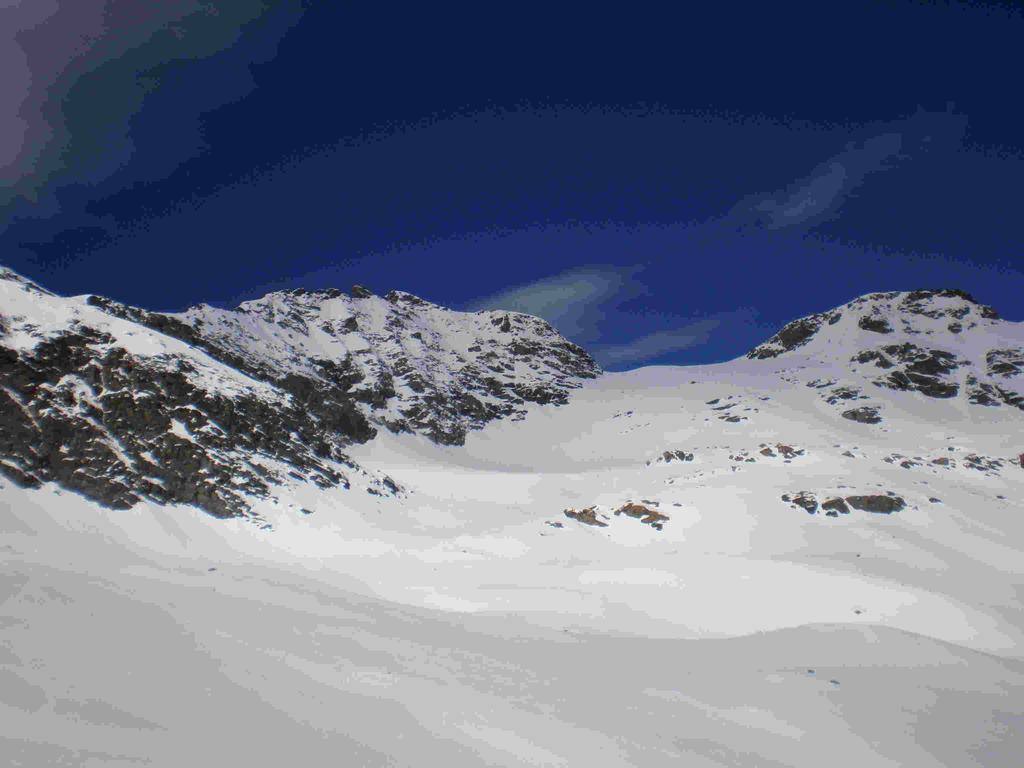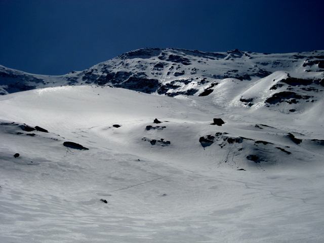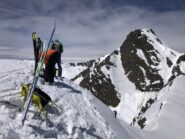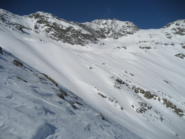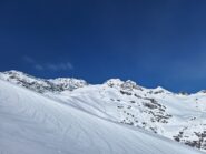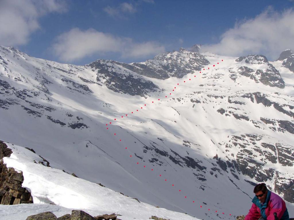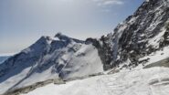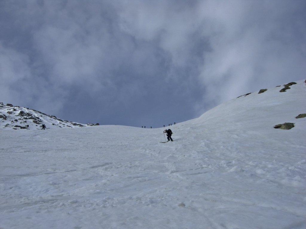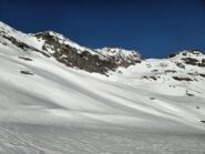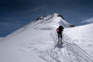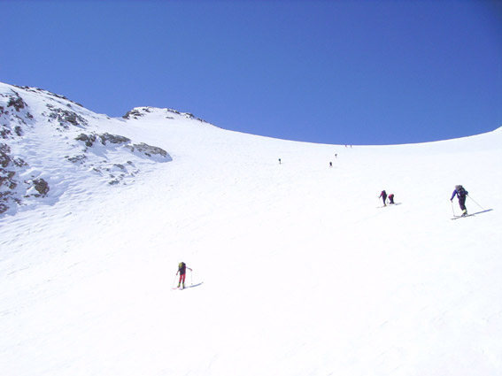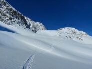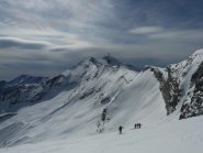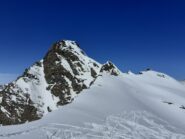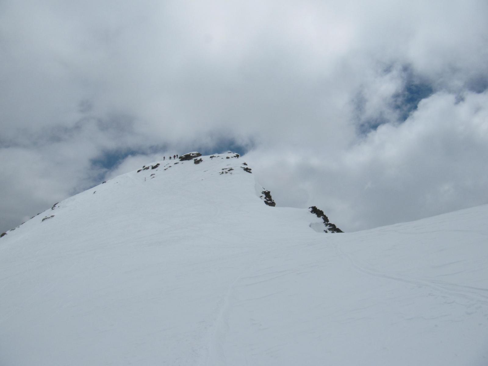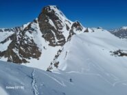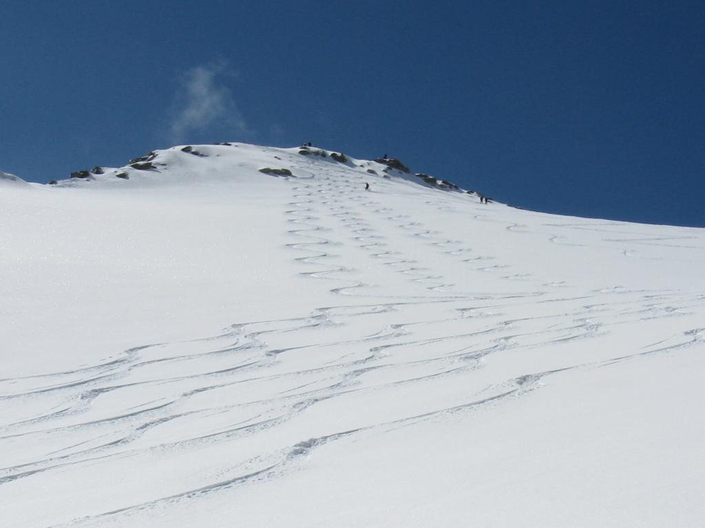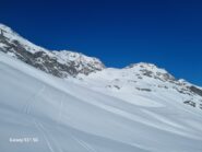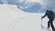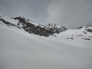 Al termine di questa rampa la pendenza diminuisce e si piega a sinistra in direzione della cima che si raggiunge agevolmente, direttamente o per la cresta di frontiera.