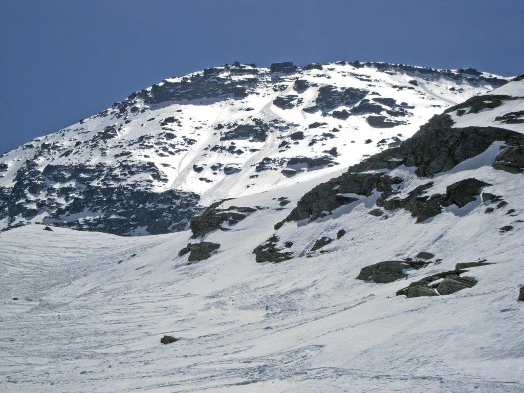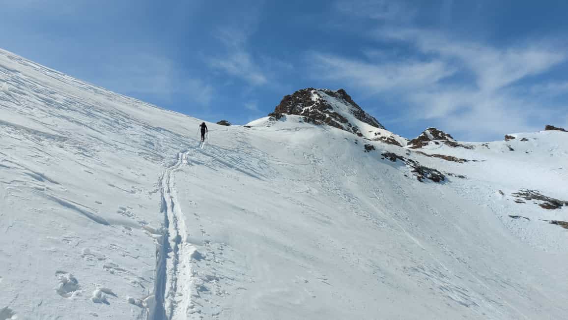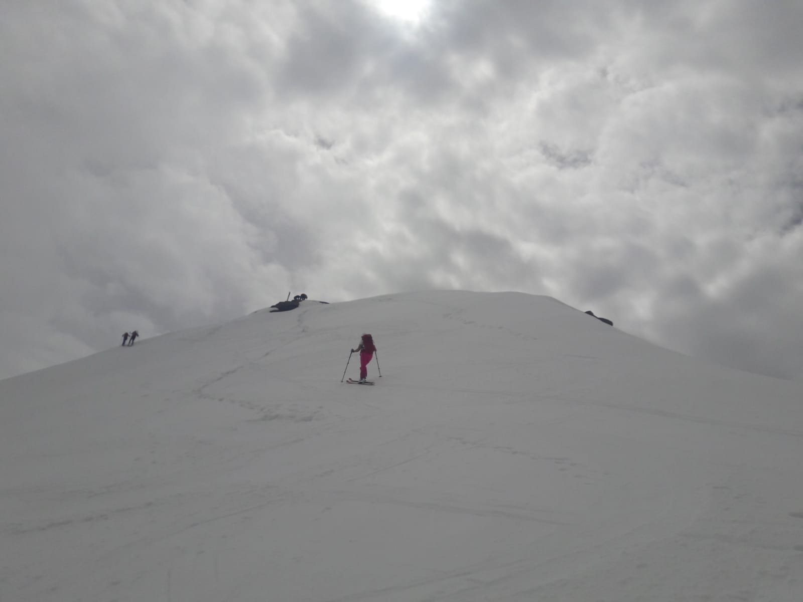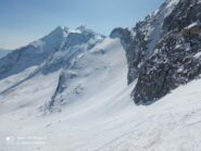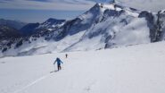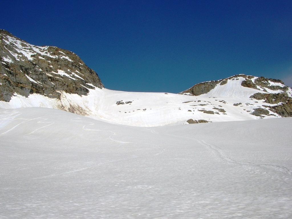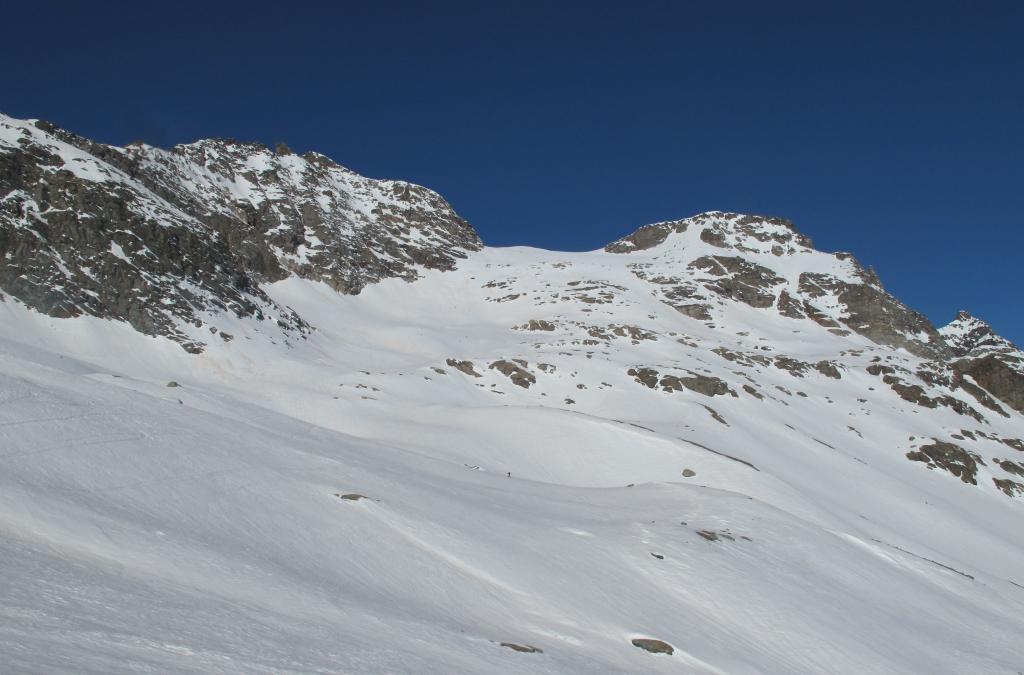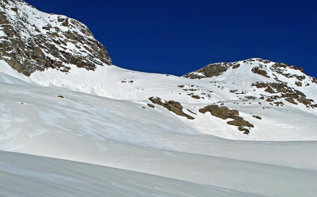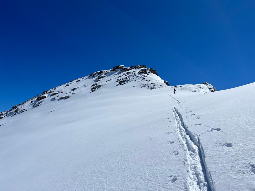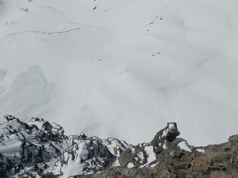 Al termine di questa rampa la pendenza diminuisce e si piega a sinistra in direzione della cima che si raggiunge agevolmente, direttamente o per la cresta di frontiera.