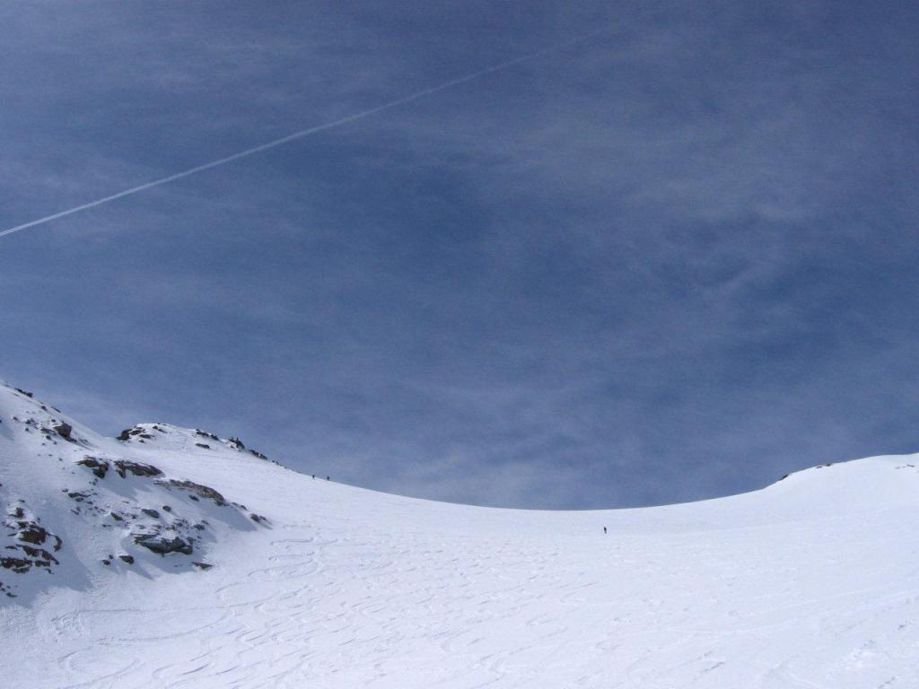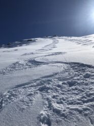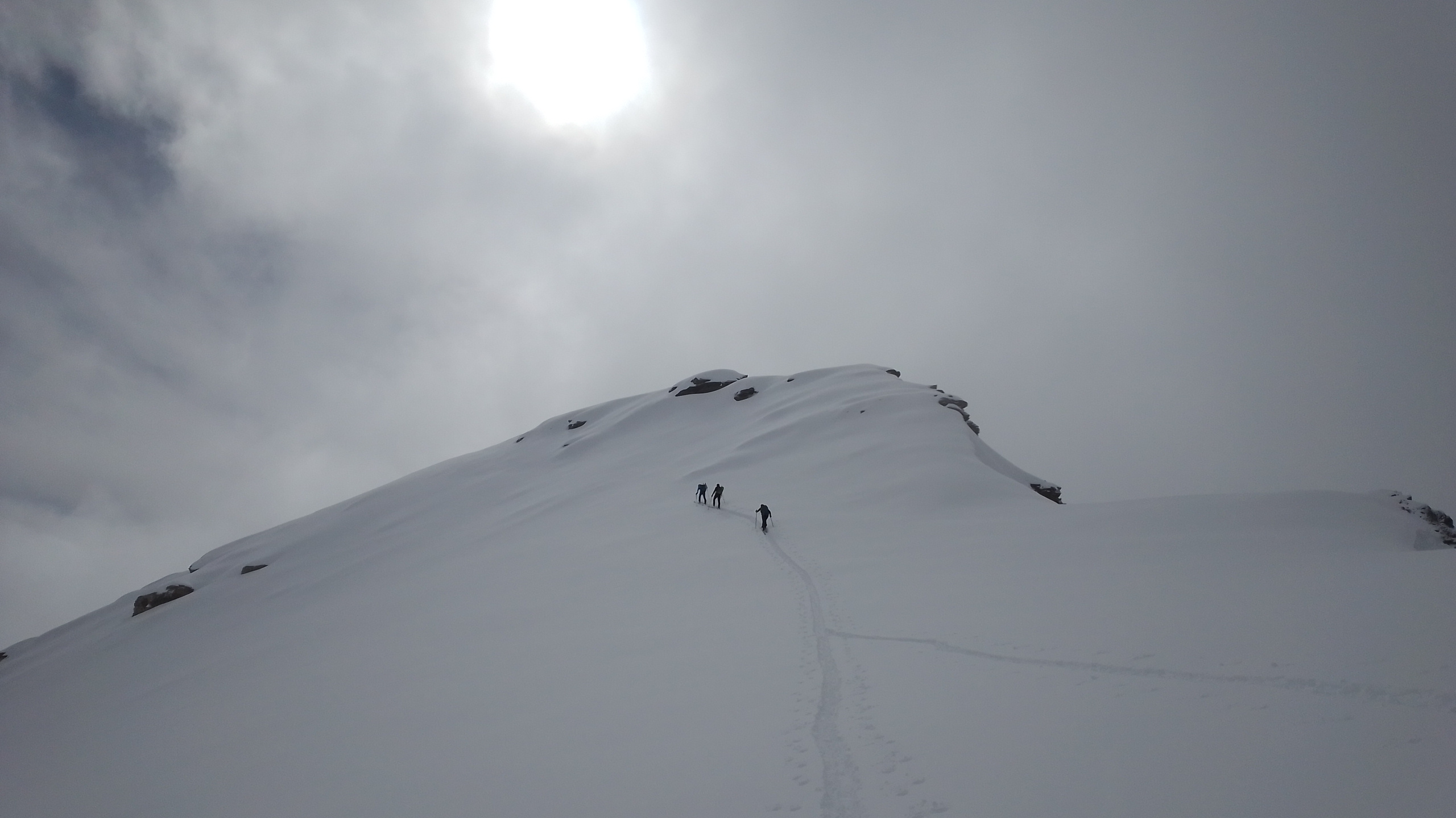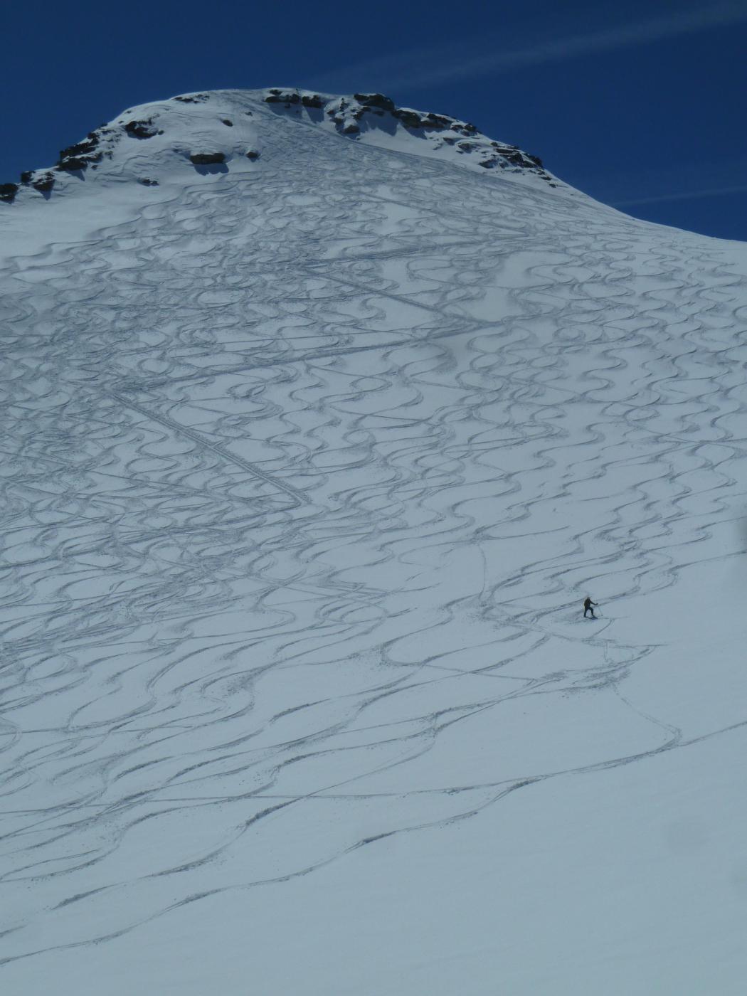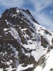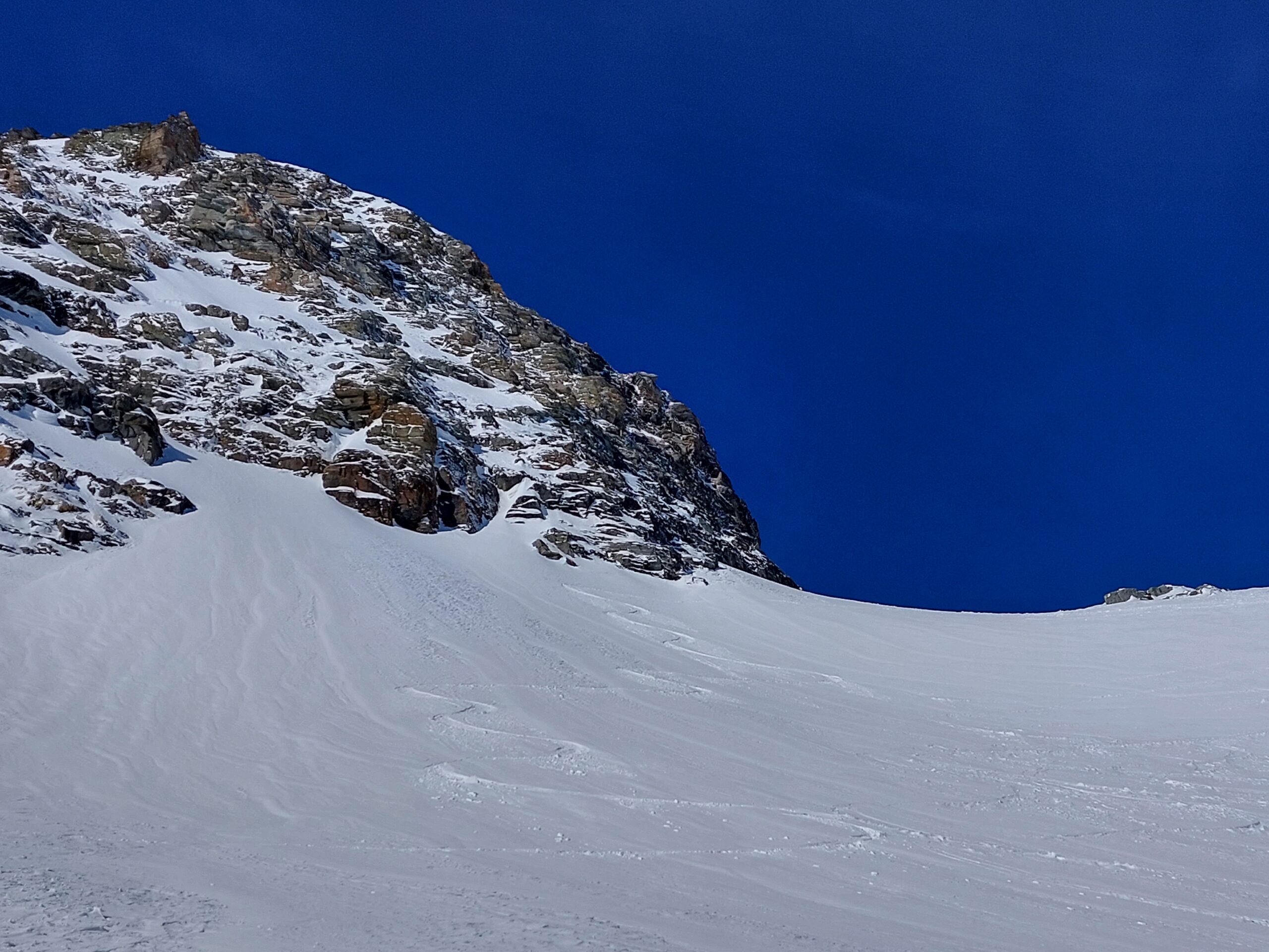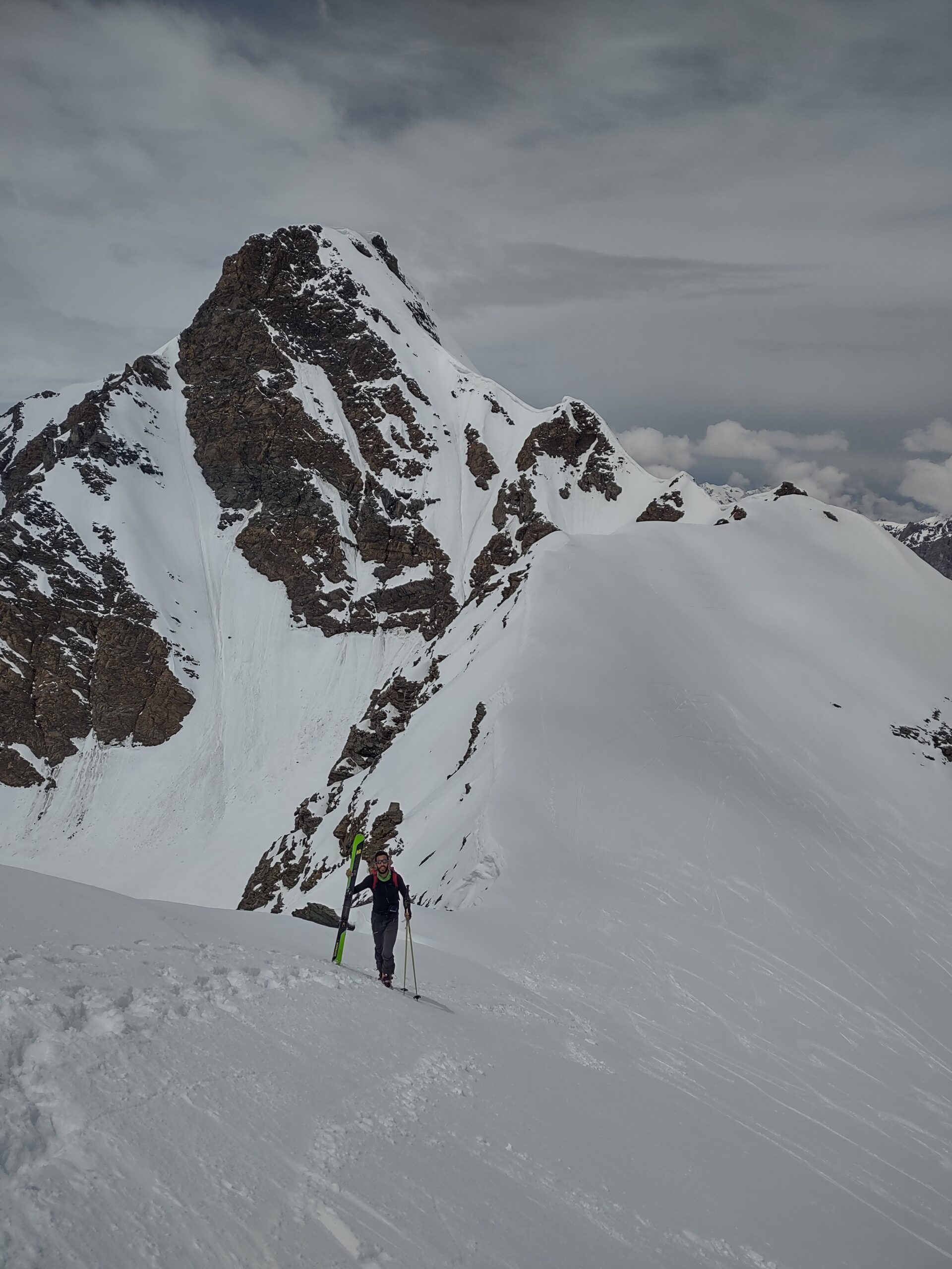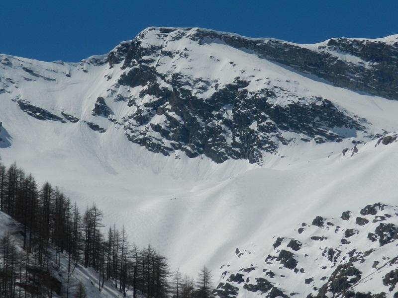 Al termine di questa rampa la pendenza diminuisce e si piega a sinistra in direzione della cima che si raggiunge agevolmente, direttamente o per la cresta di frontiera.
