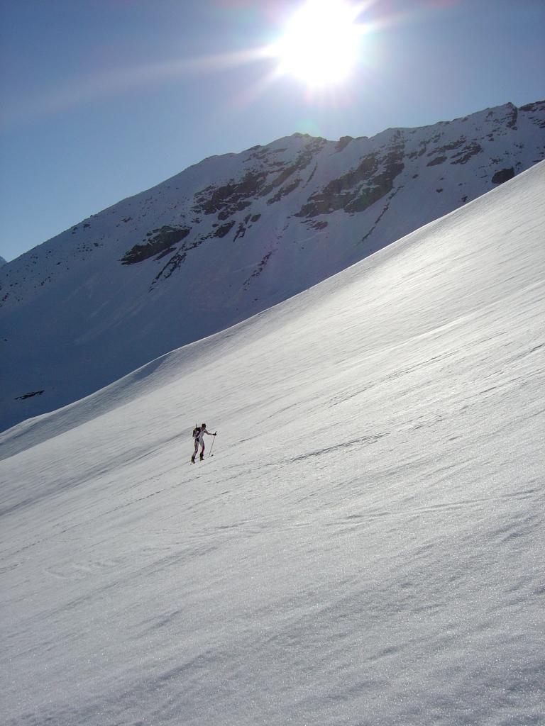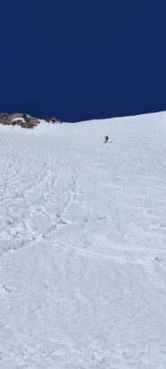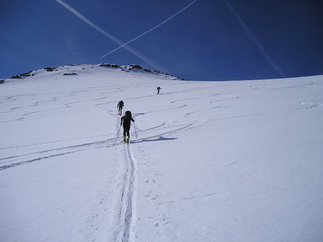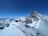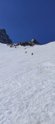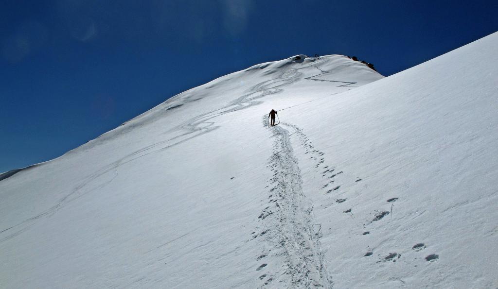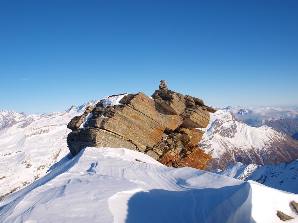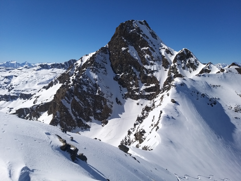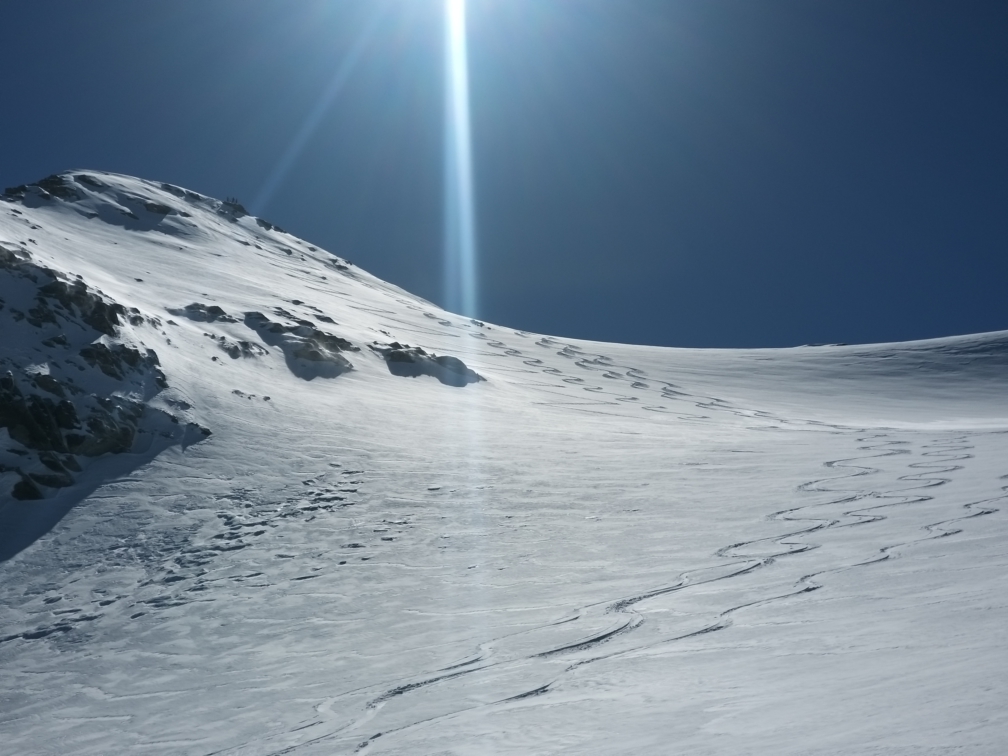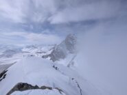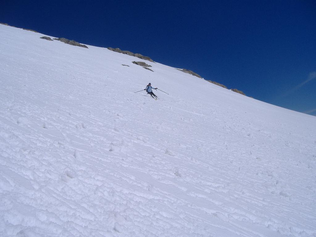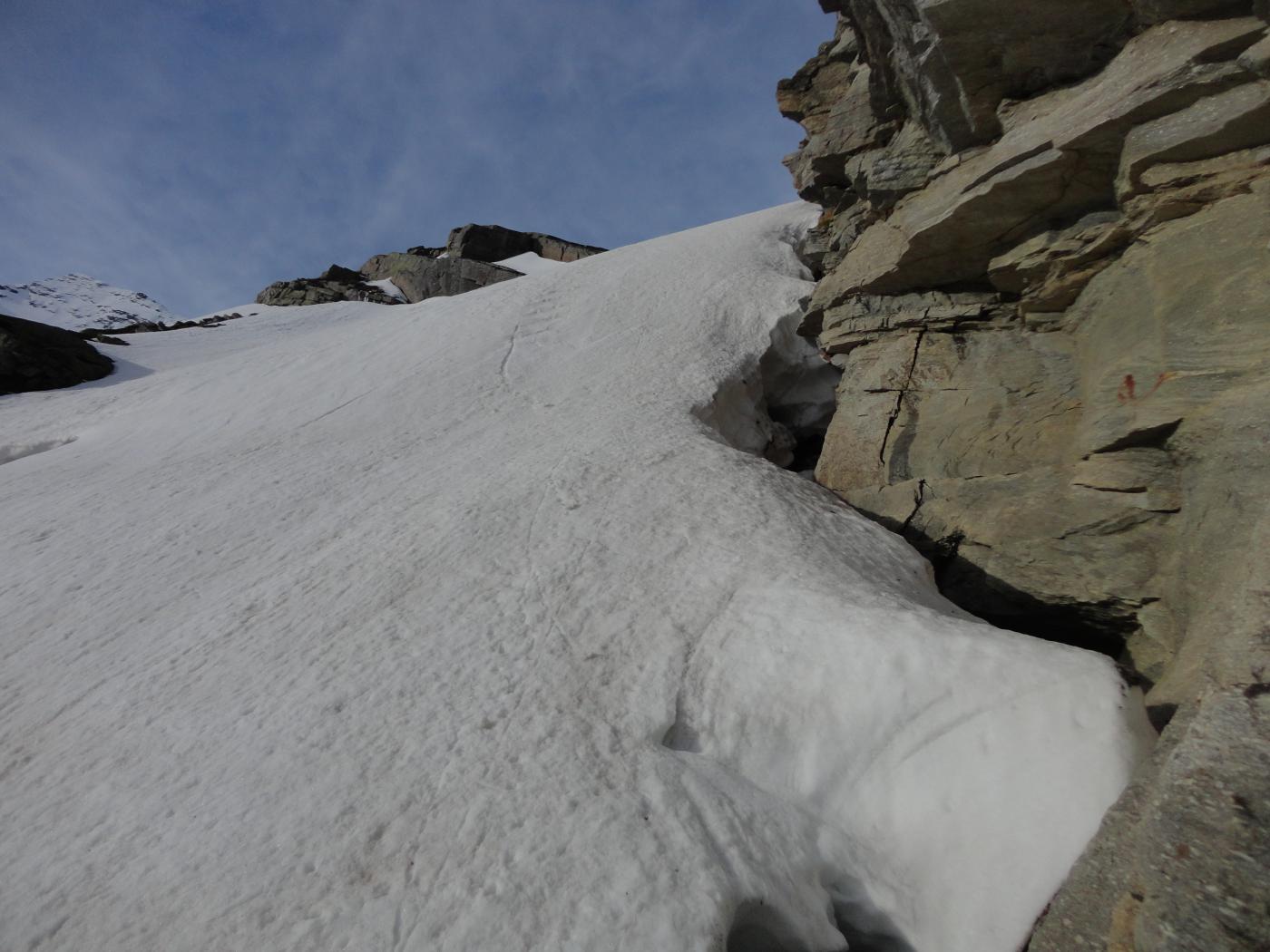 Al termine di questa rampa la pendenza diminuisce e si piega a sinistra in direzione della cima che si raggiunge agevolmente, direttamente o per la cresta di frontiera.