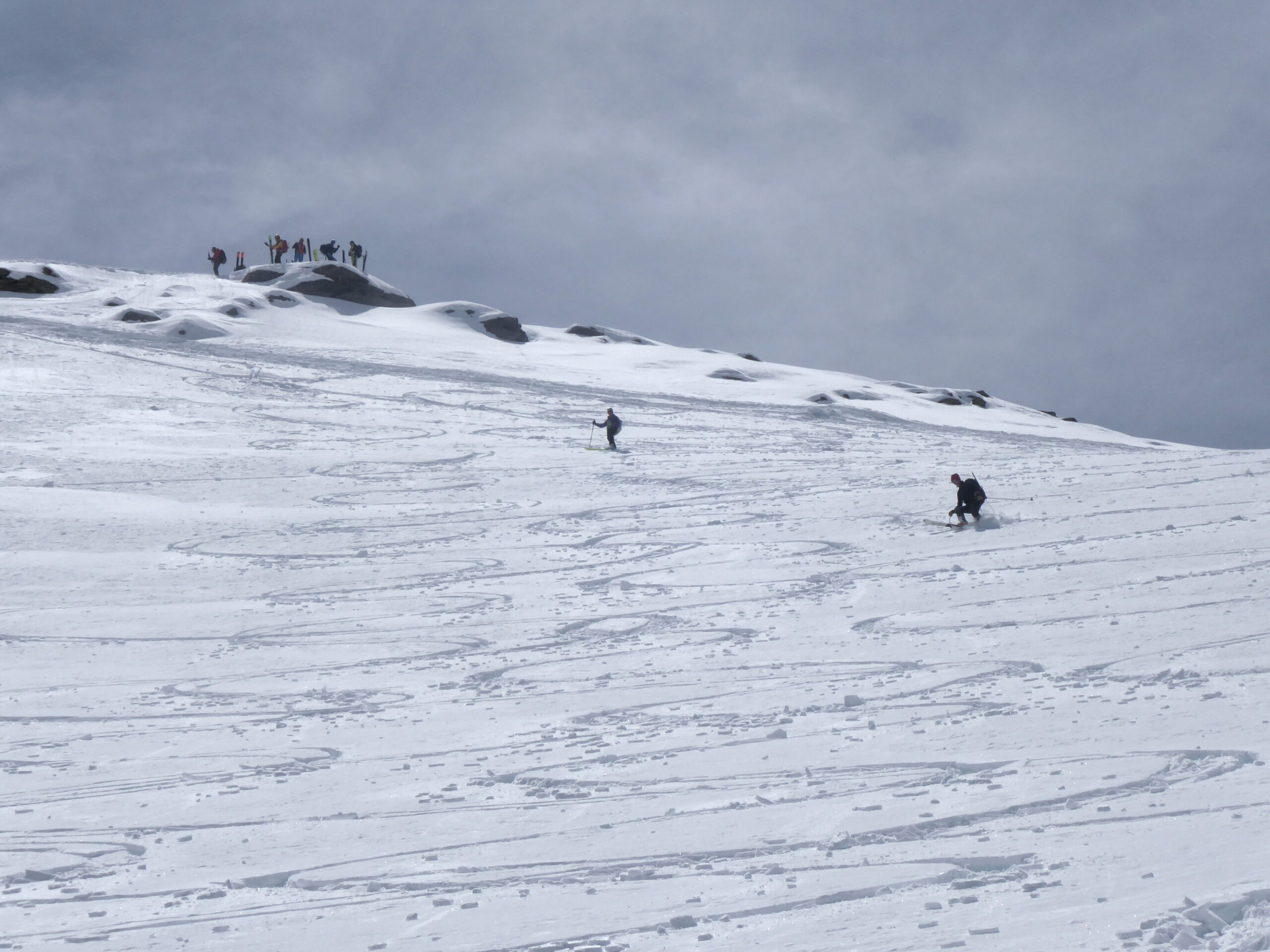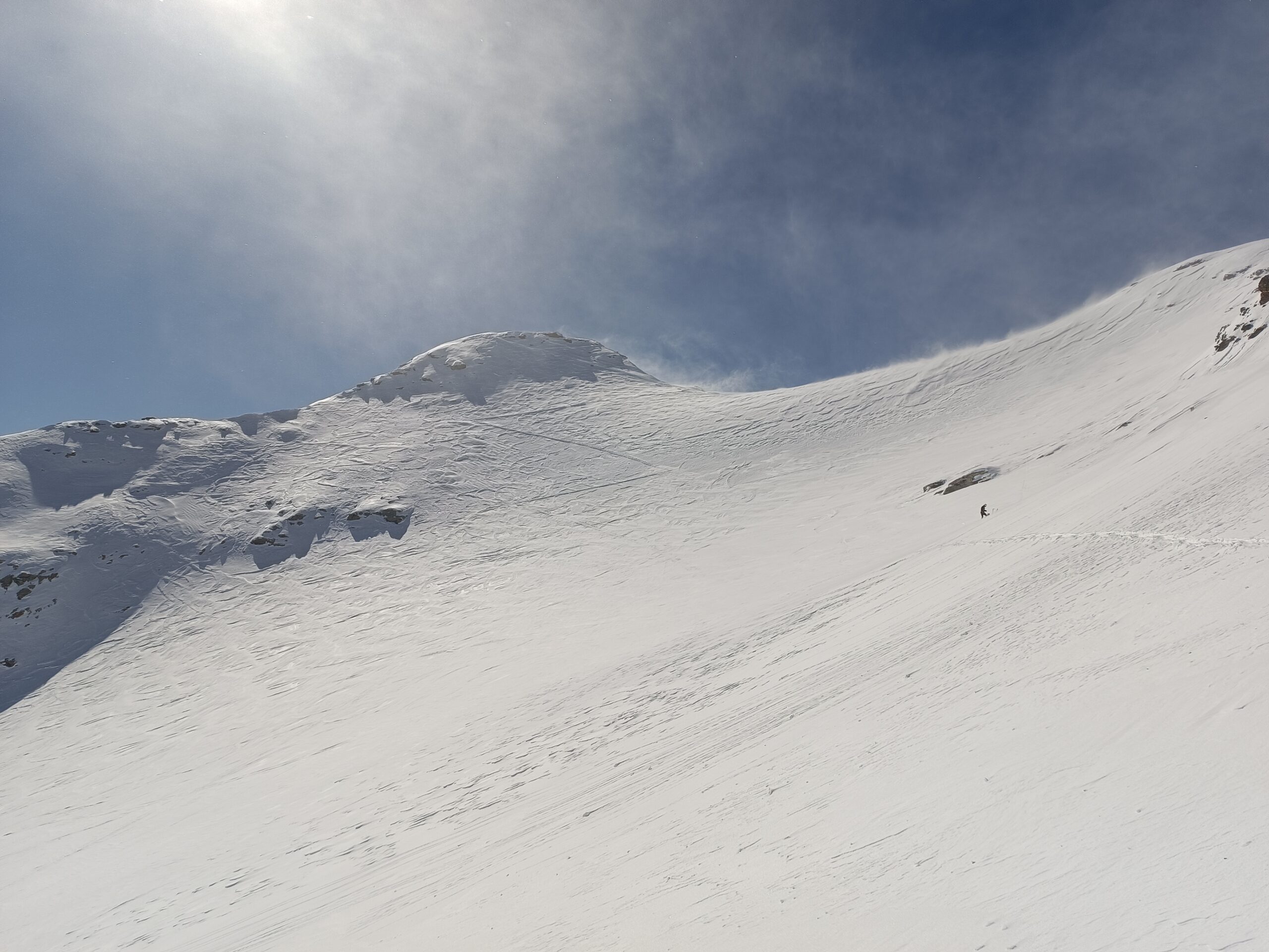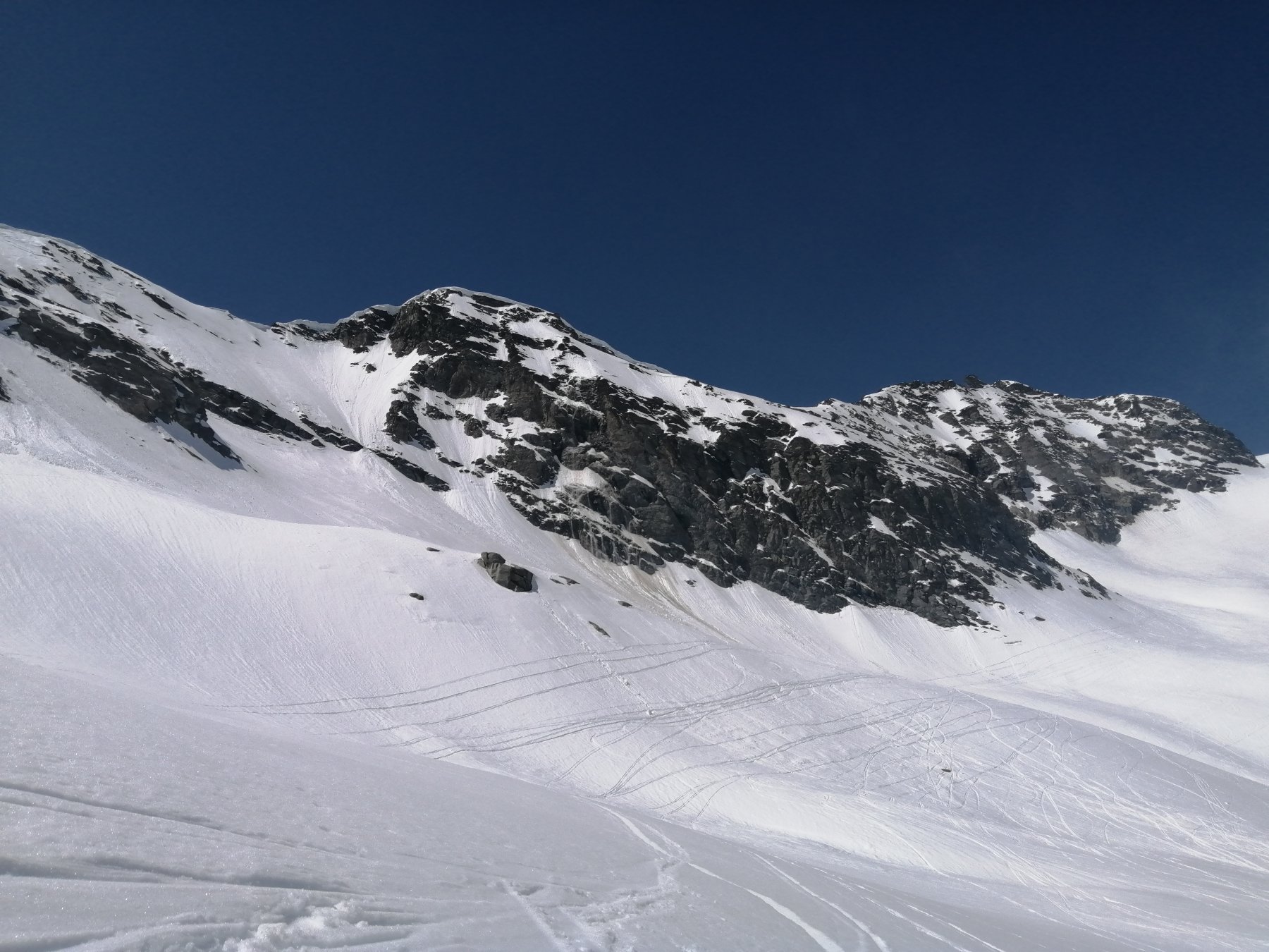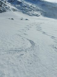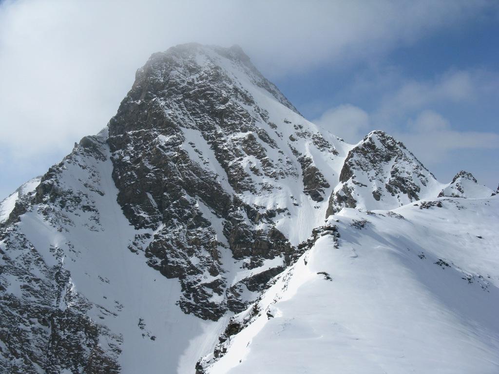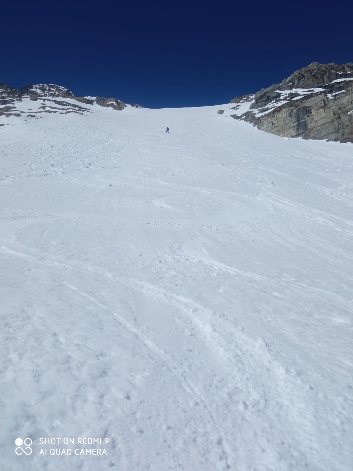 Al termine di questa rampa la pendenza diminuisce e si piega a sinistra in direzione della cima che si raggiunge agevolmente, direttamente o per la cresta di frontiera.