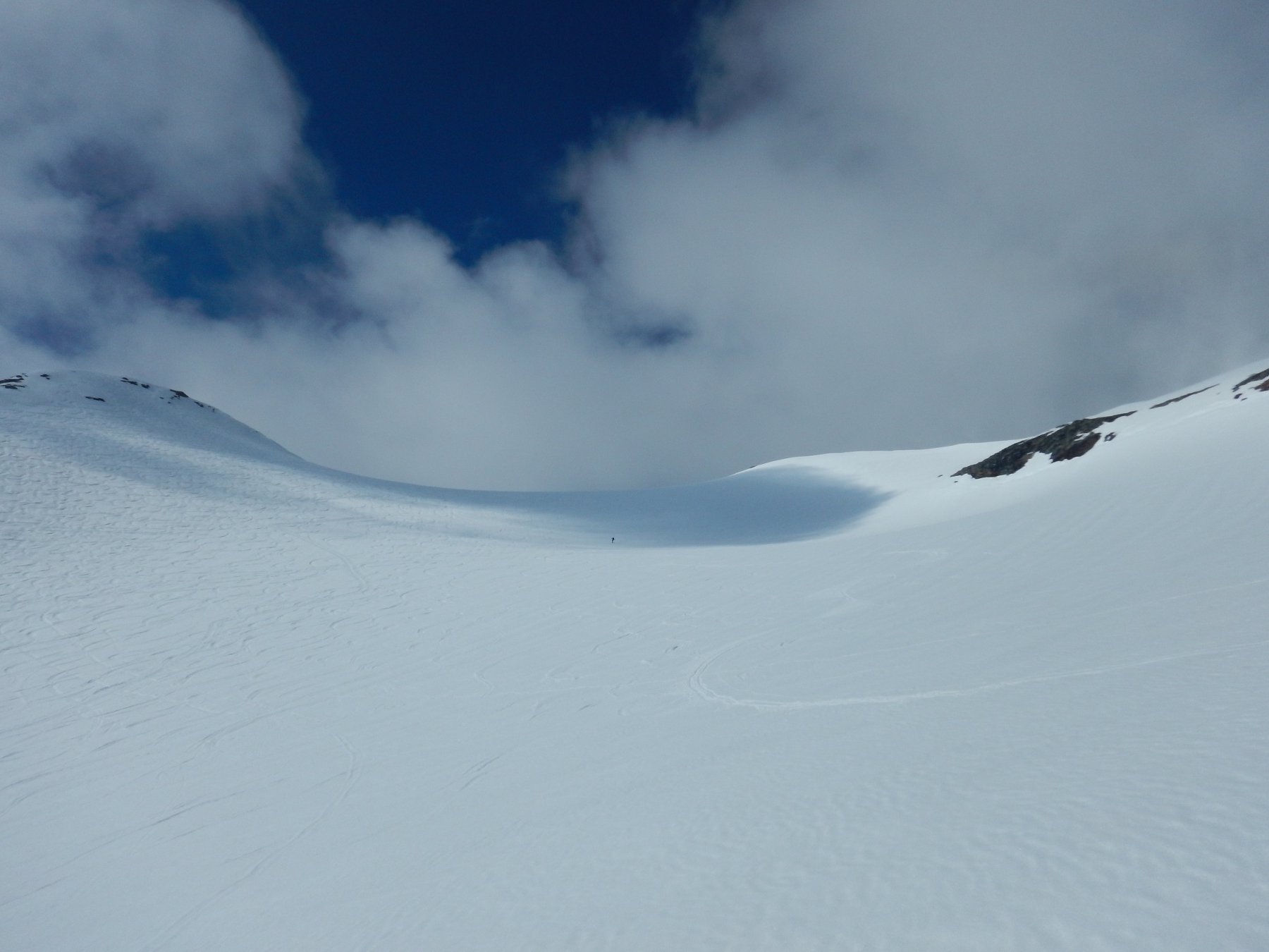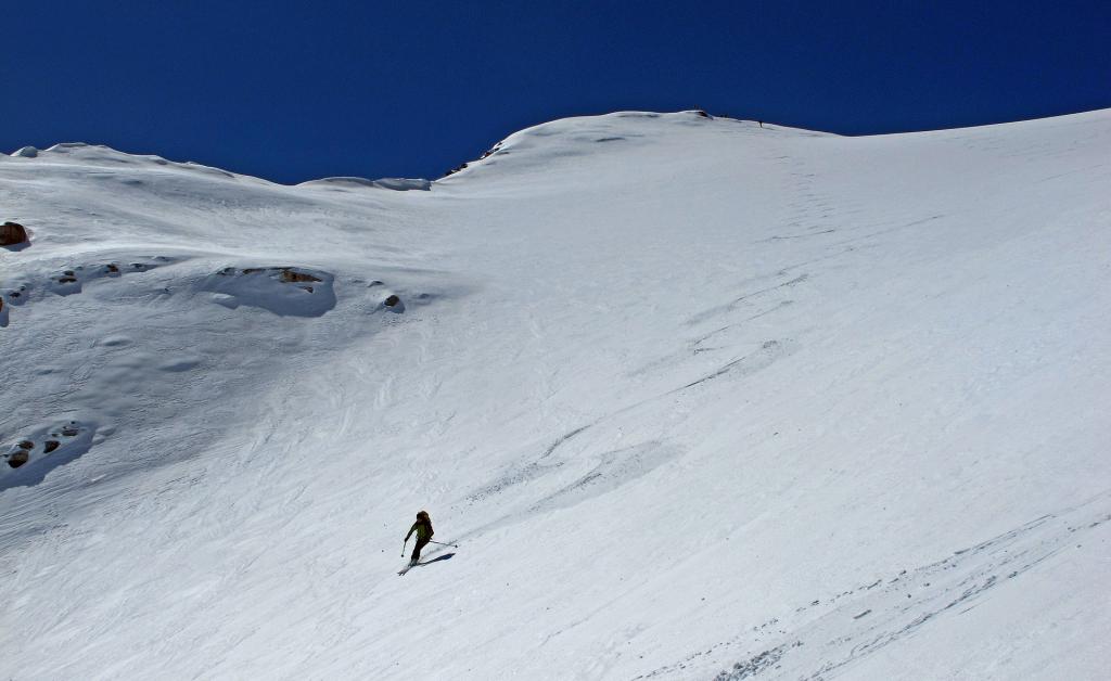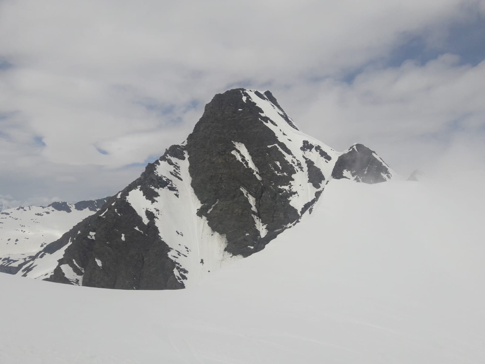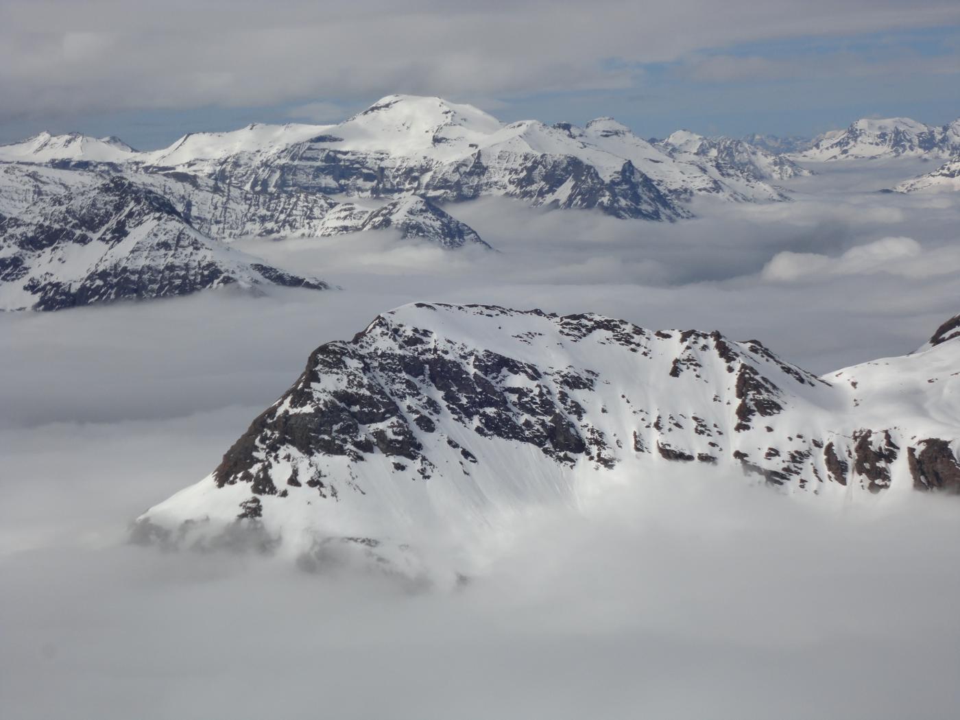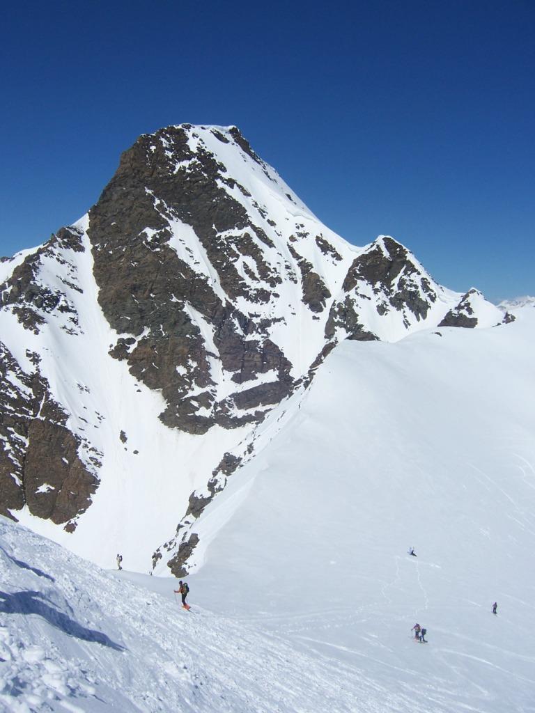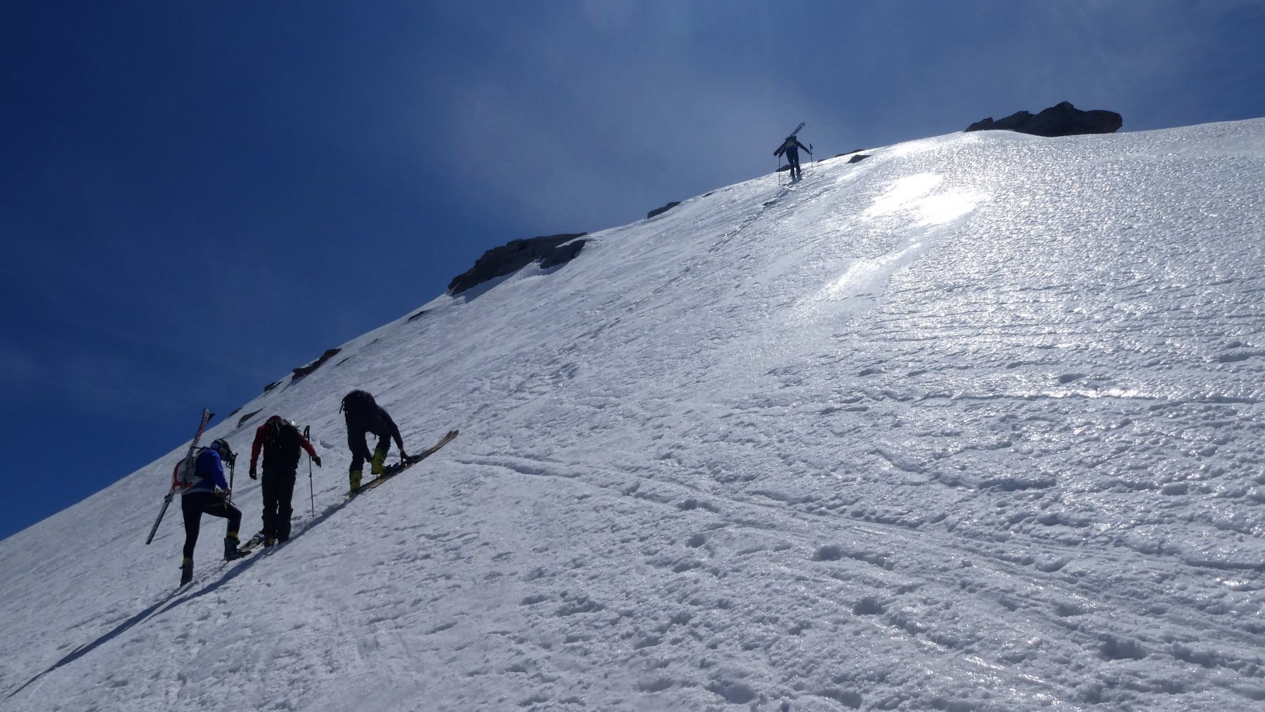 Al termine di questa rampa la pendenza diminuisce e si piega a sinistra in direzione della cima che si raggiunge agevolmente, direttamente o per la cresta di frontiera.