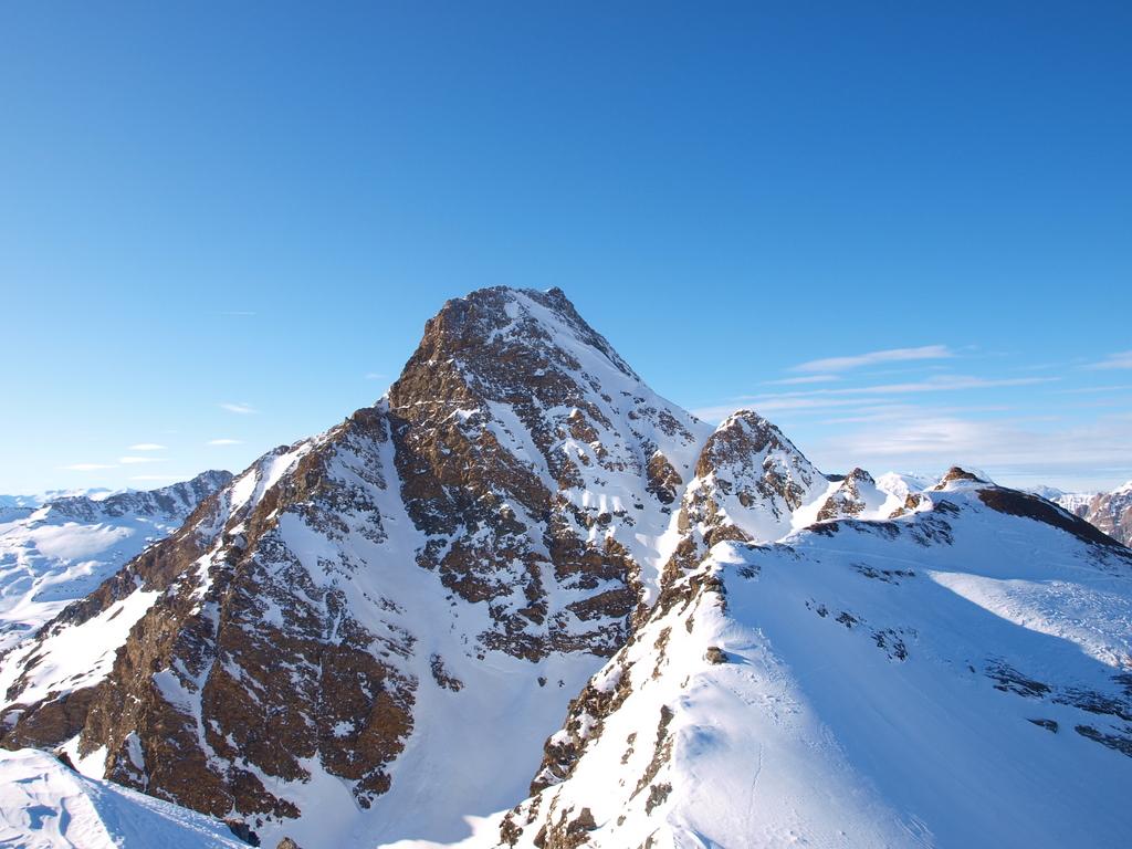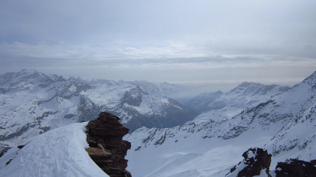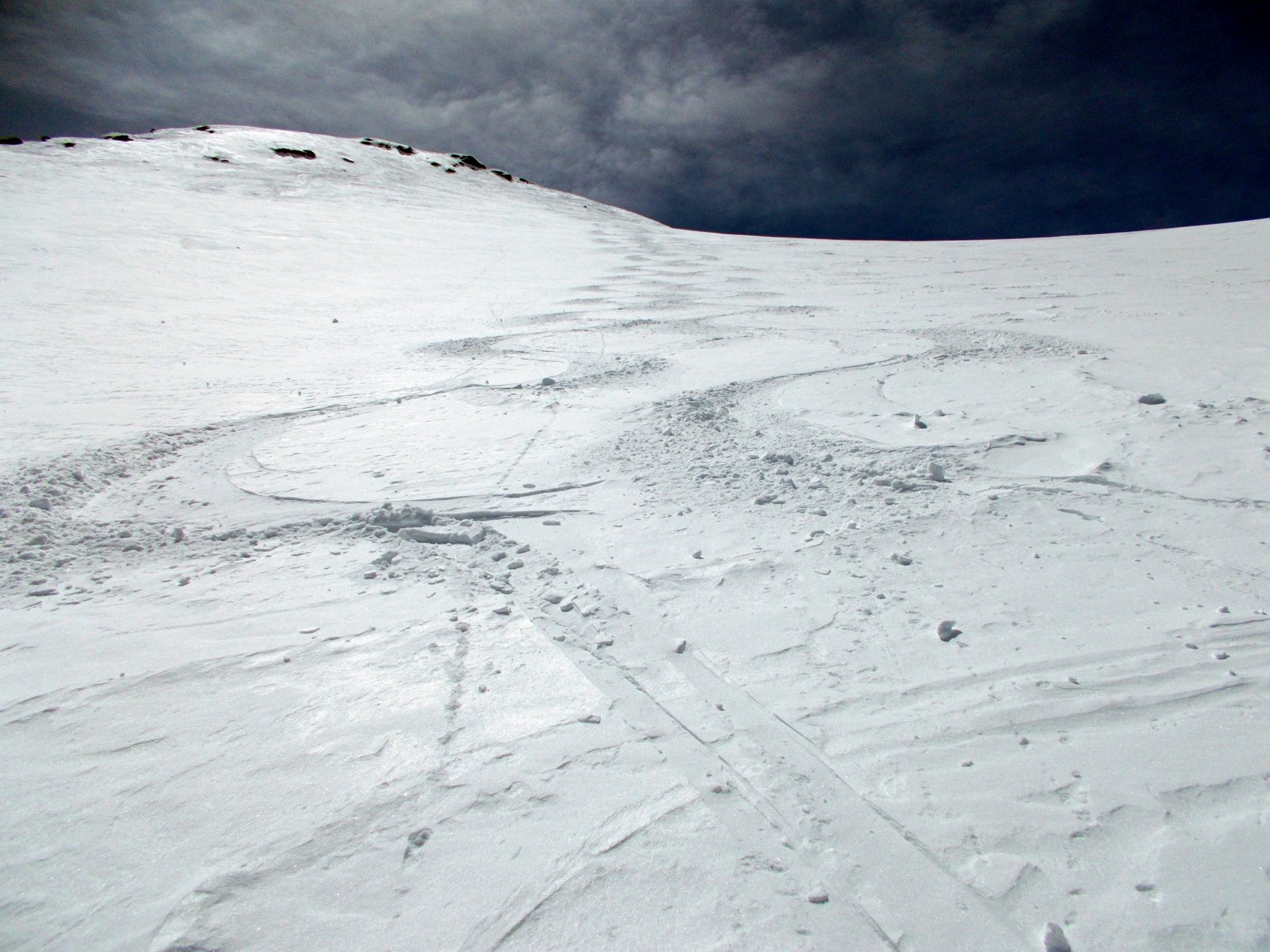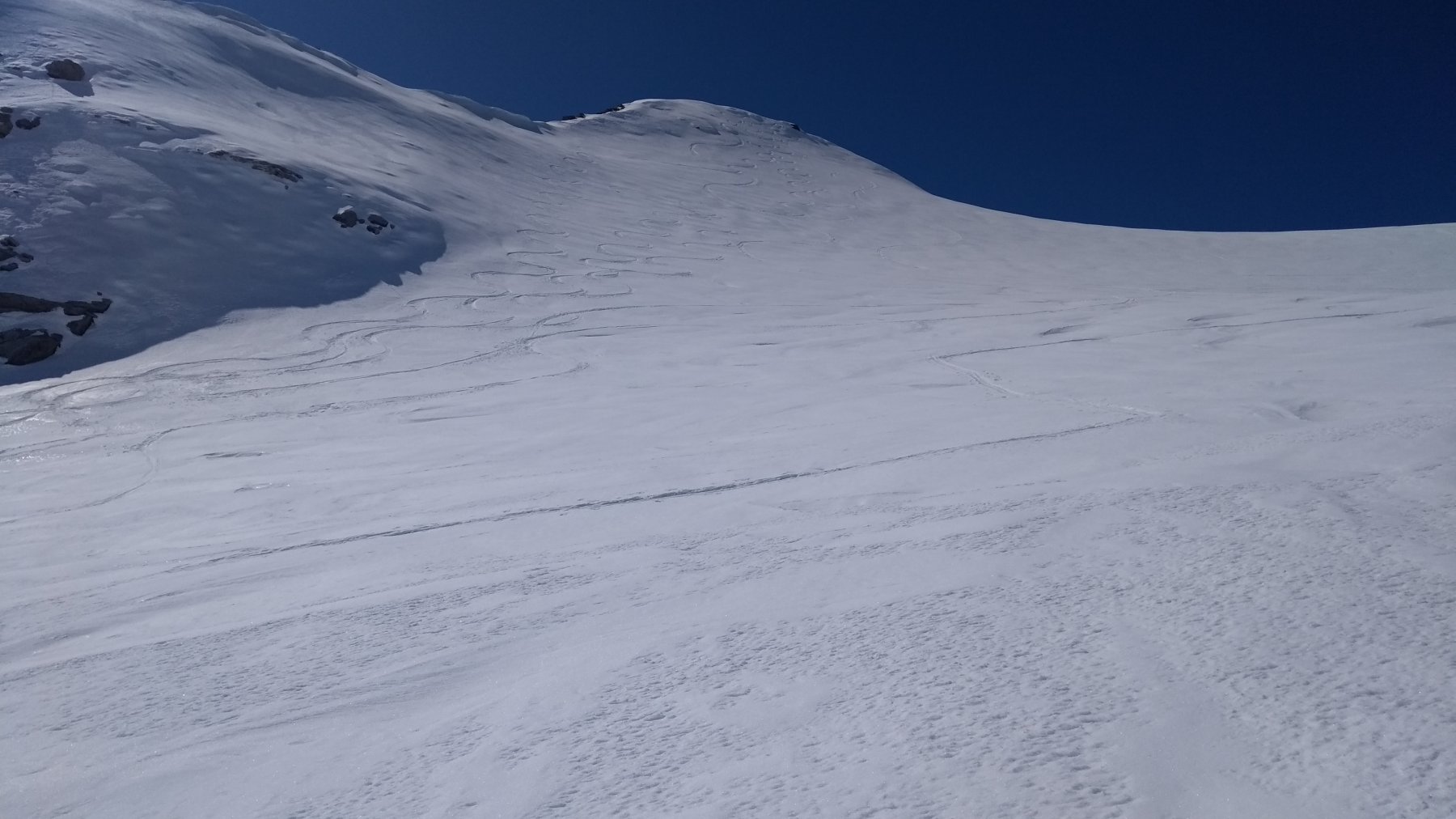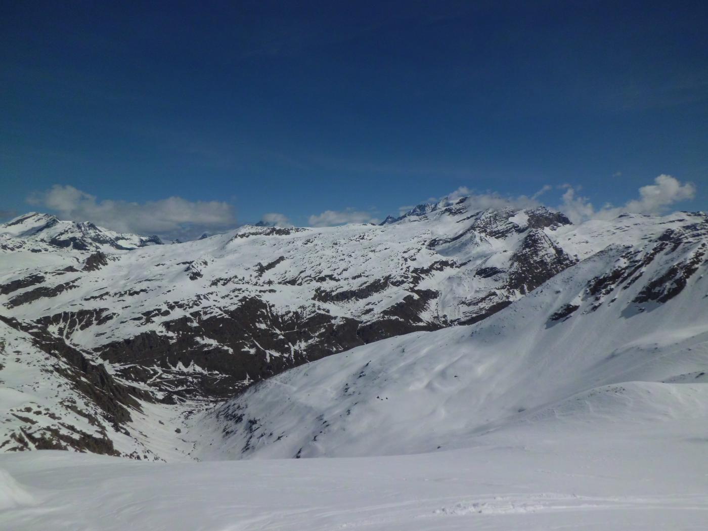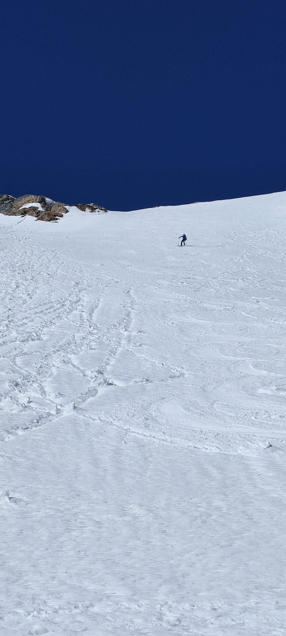 Al termine di questa rampa la pendenza diminuisce e si piega a sinistra in direzione della cima che si raggiunge agevolmente, direttamente o per la cresta di frontiera.