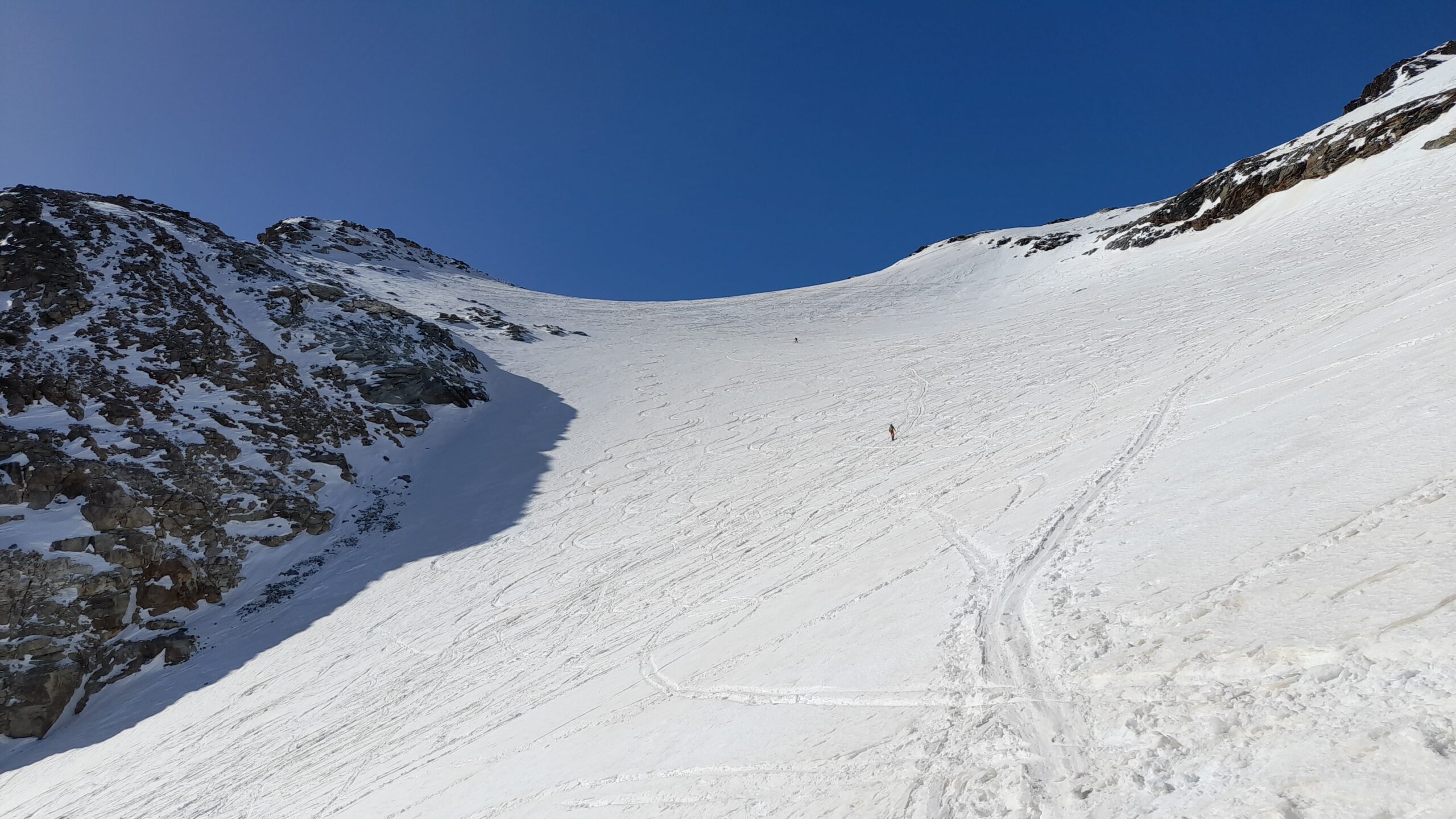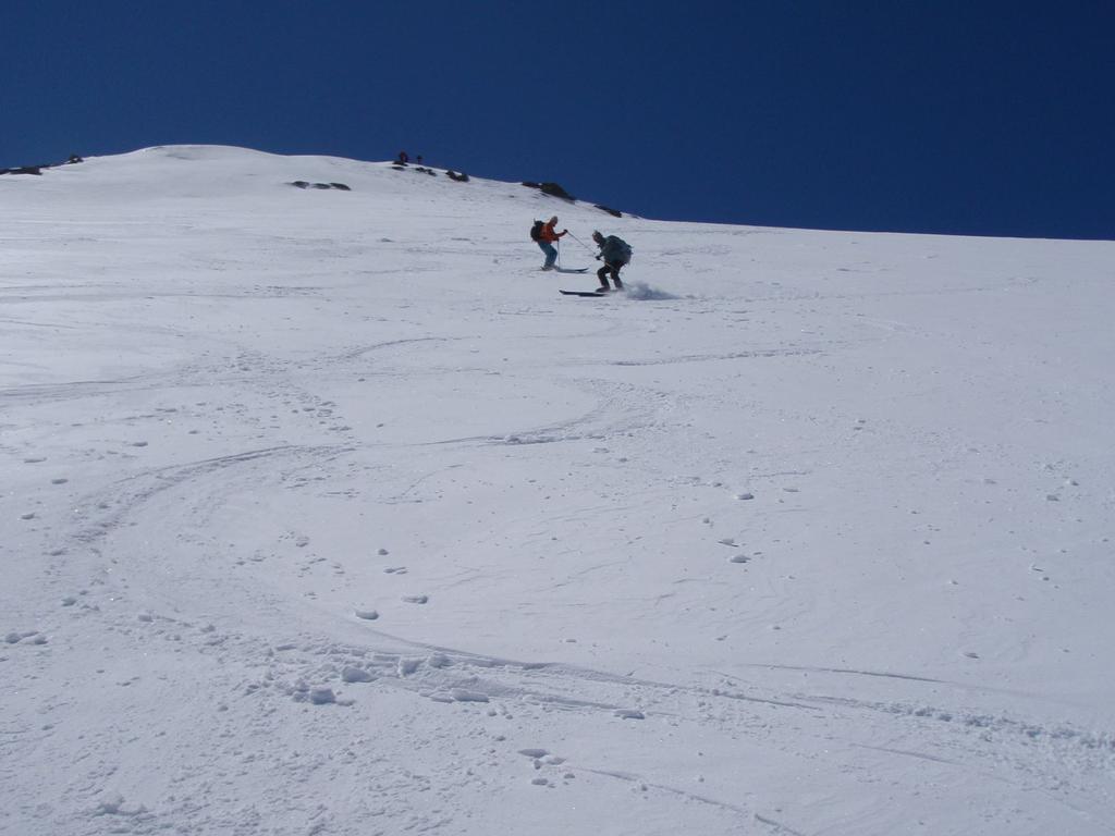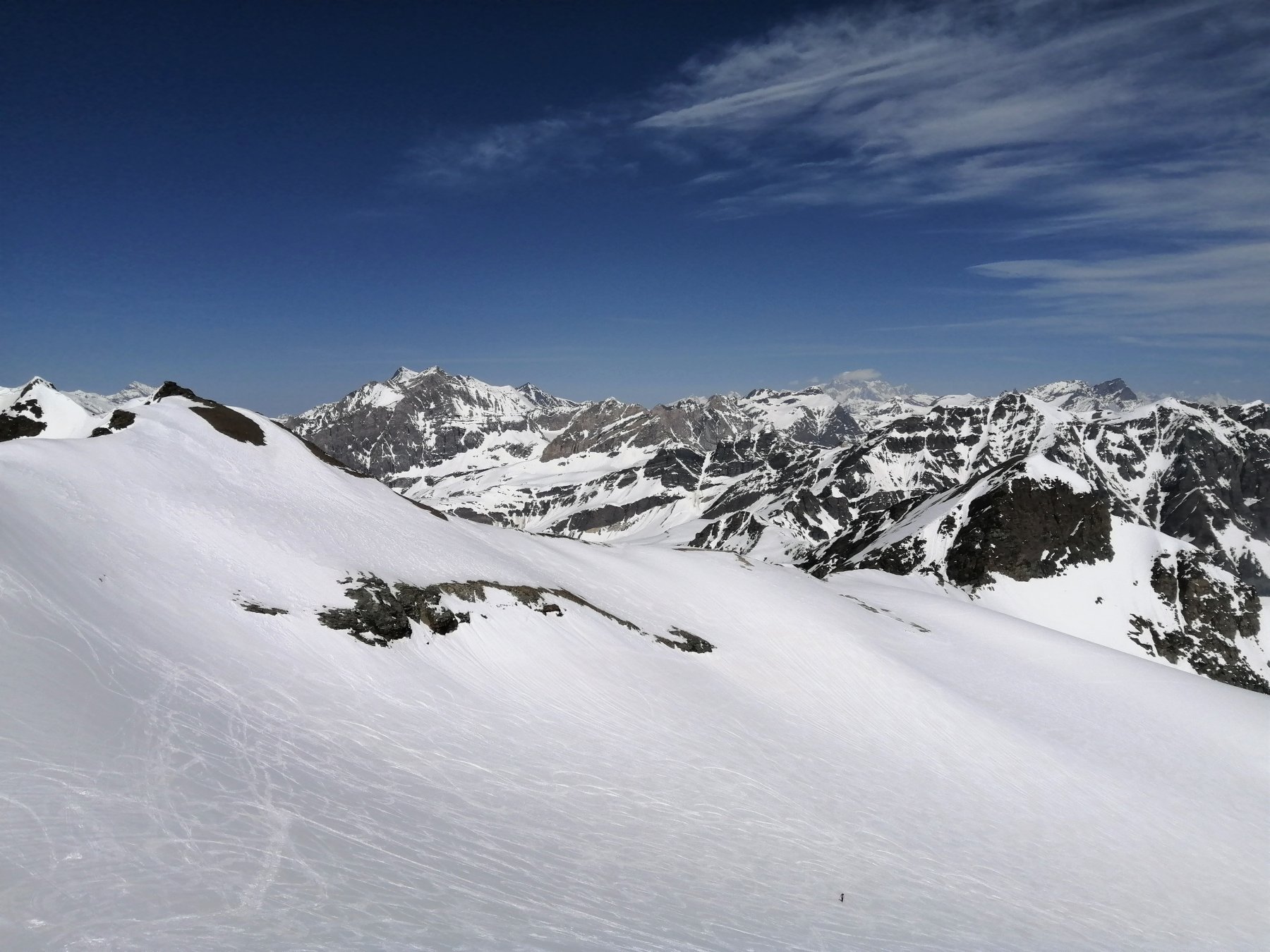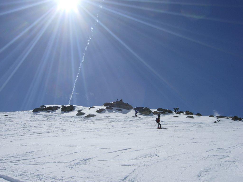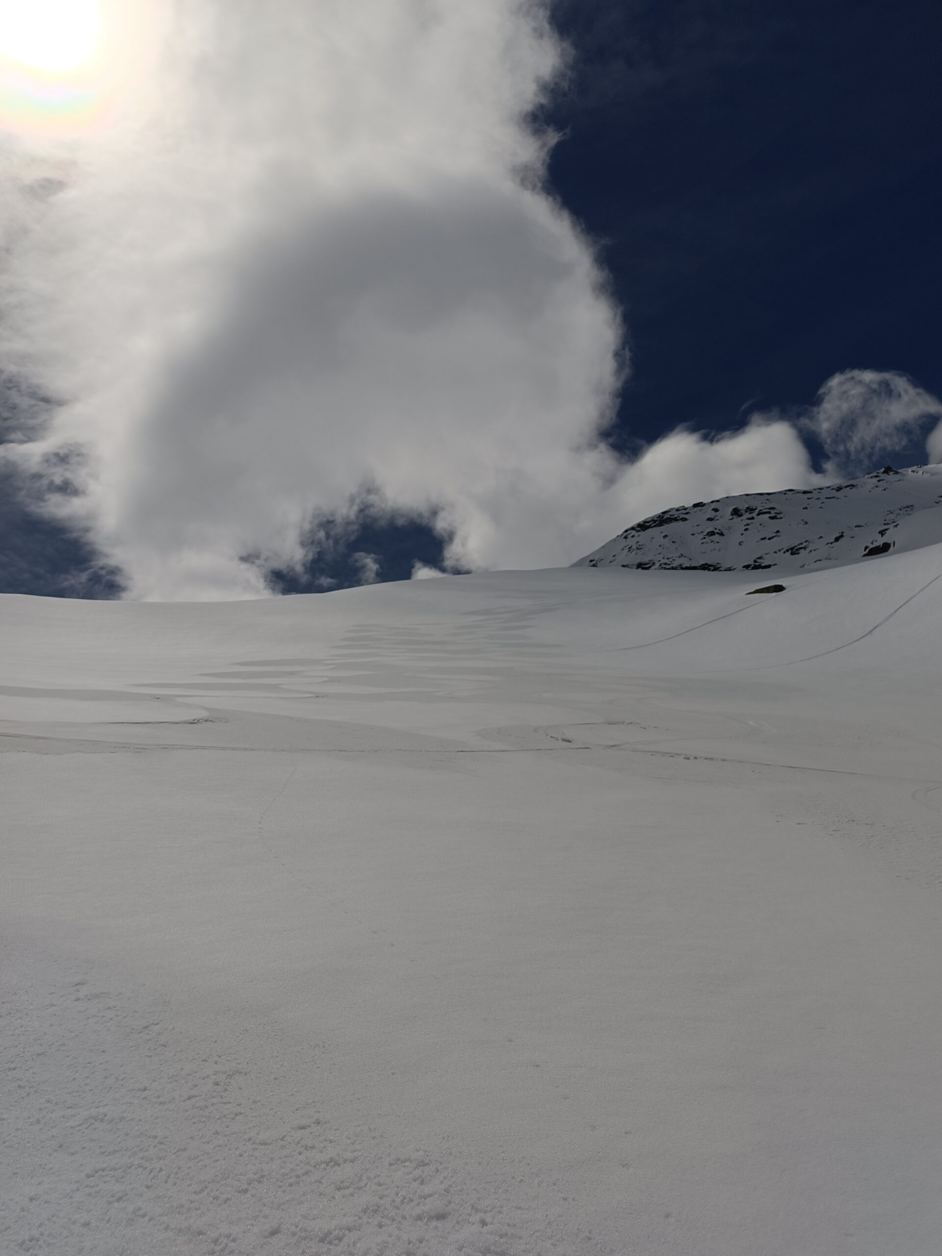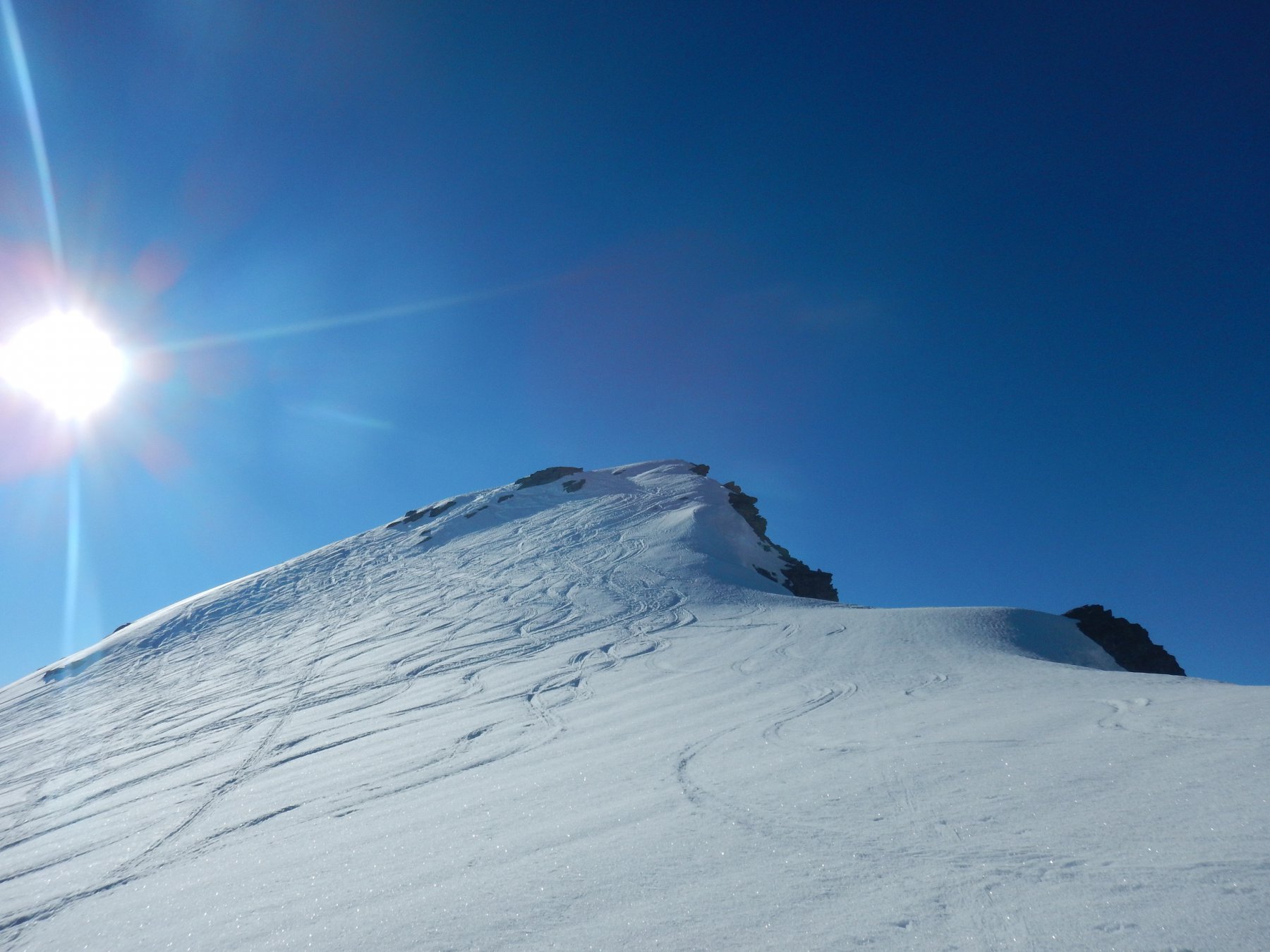 Al termine di questa rampa la pendenza diminuisce e si piega a sinistra in direzione della cima che si raggiunge agevolmente, direttamente o per la cresta di frontiera.