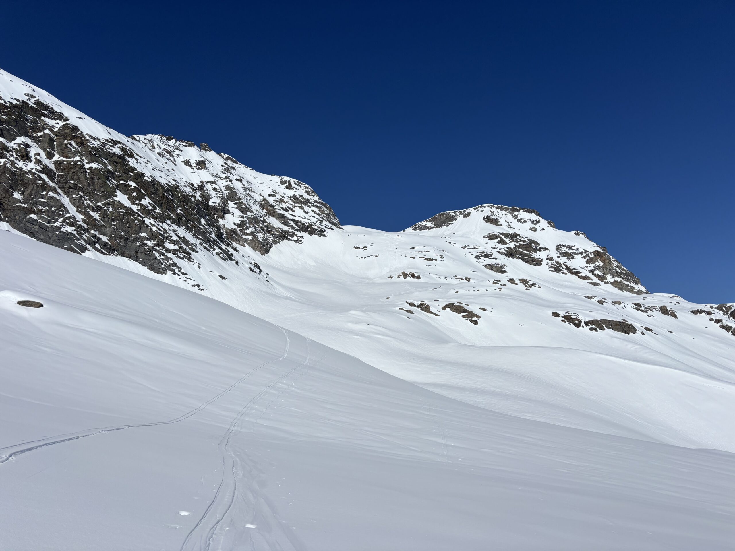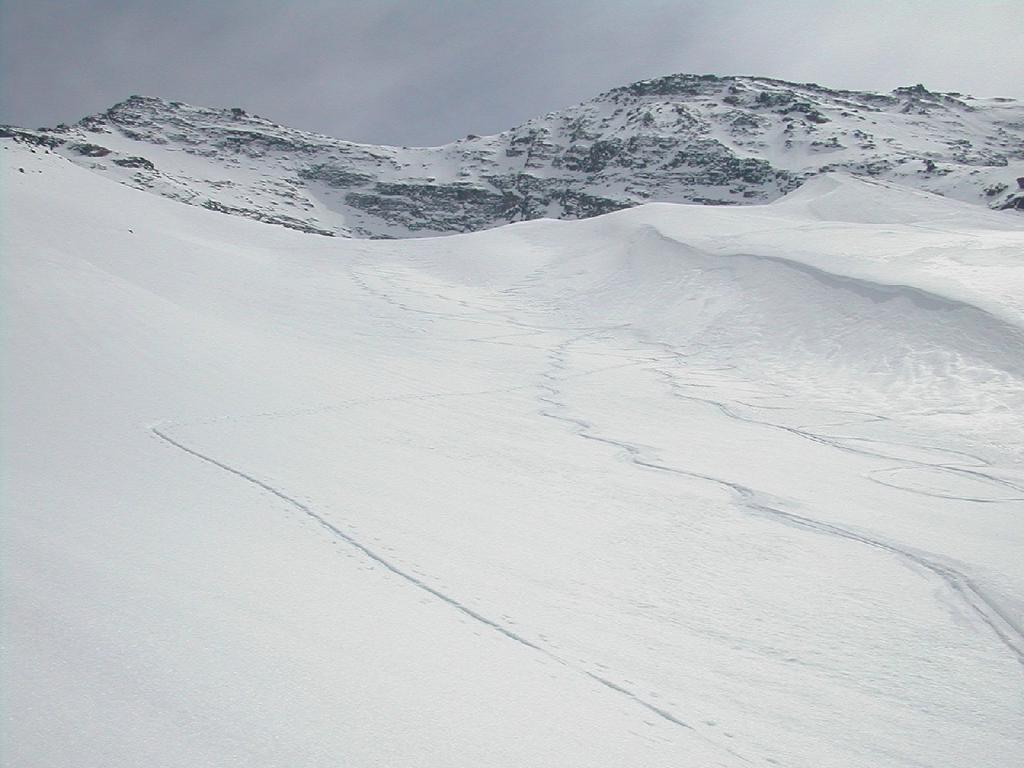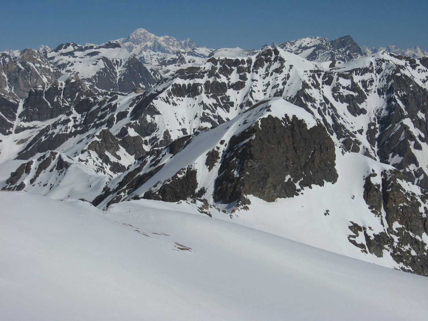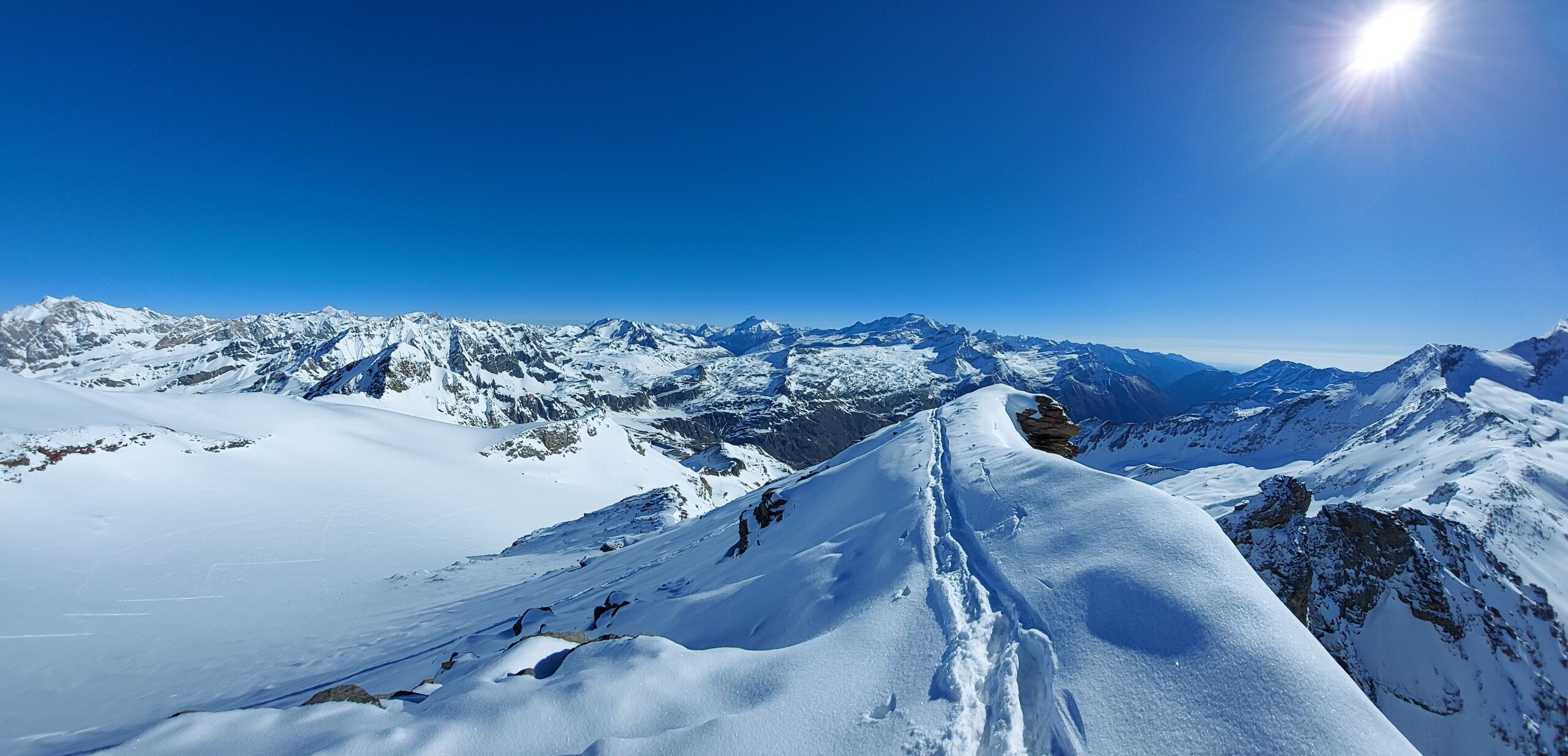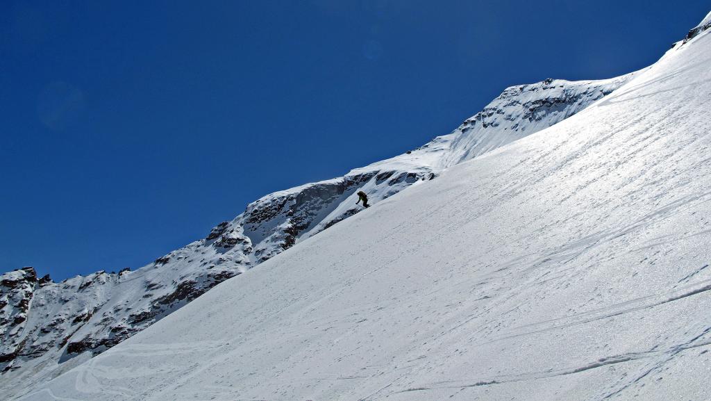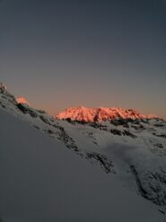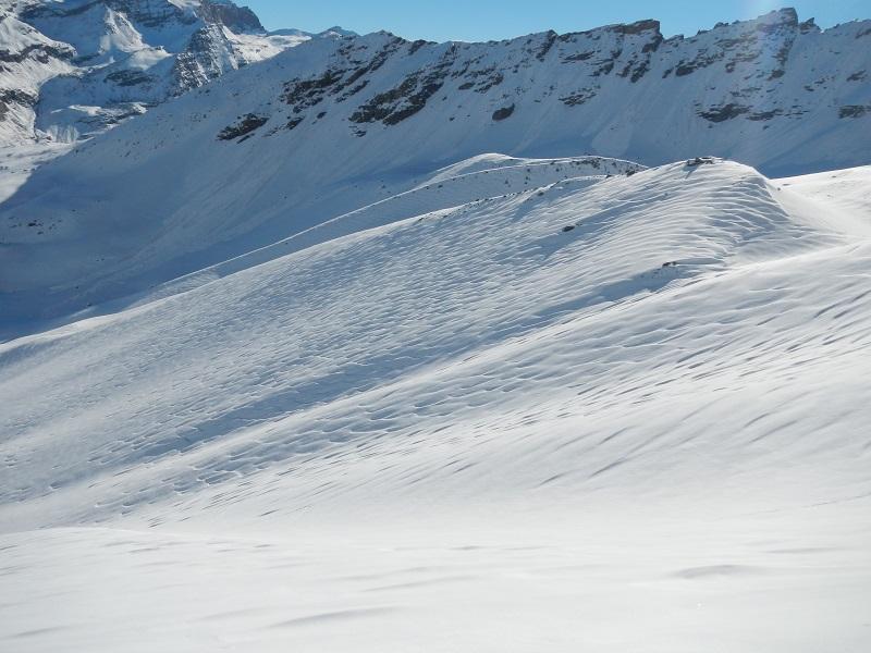 Al termine di questa rampa la pendenza diminuisce e si piega a sinistra in direzione della cima che si raggiunge agevolmente, direttamente o per la cresta di frontiera.