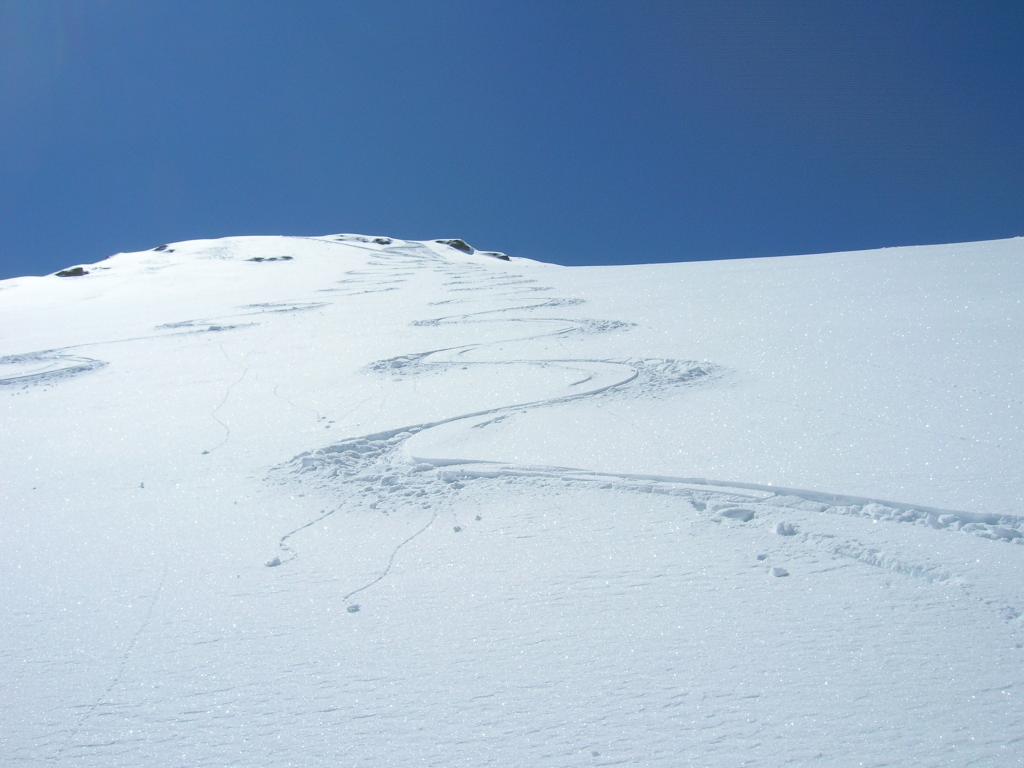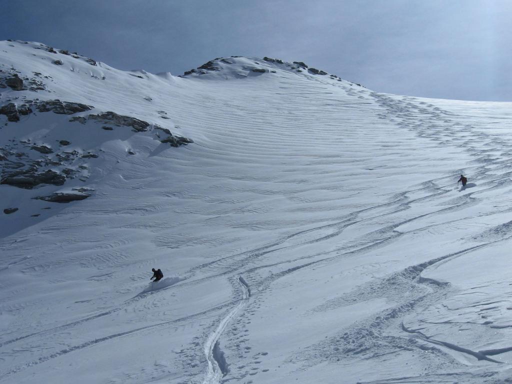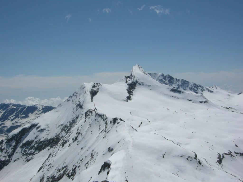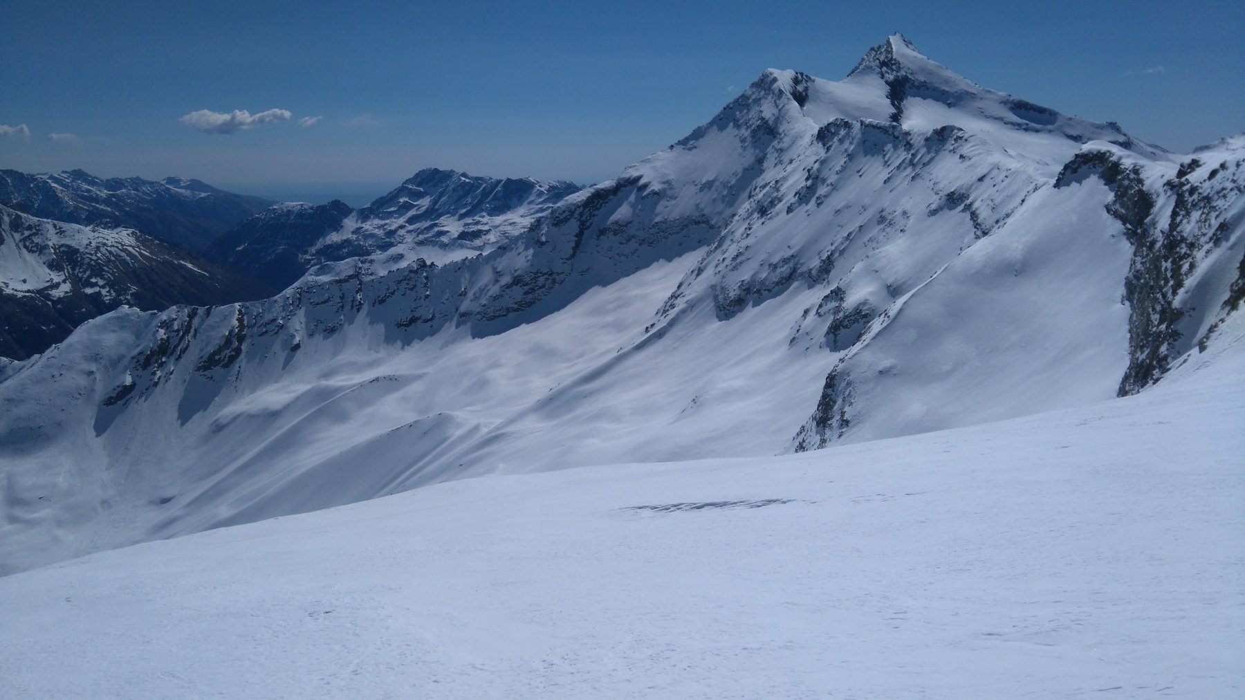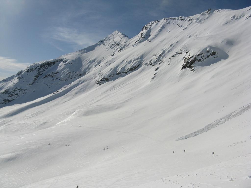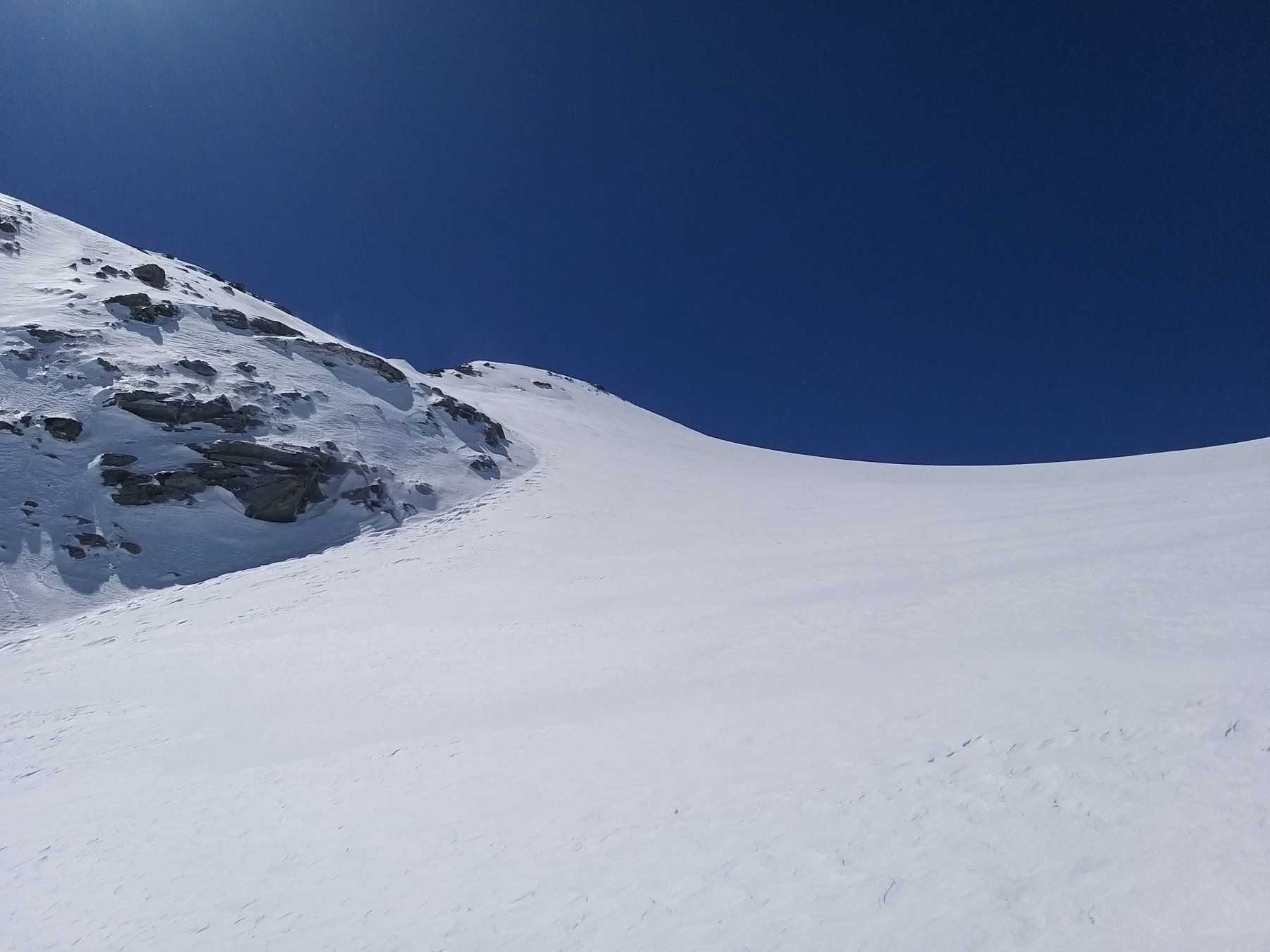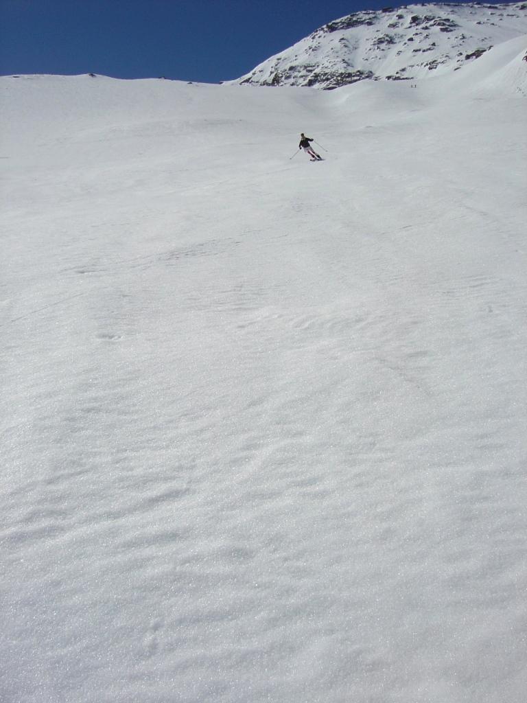 Al termine di questa rampa la pendenza diminuisce e si piega a sinistra in direzione della cima che si raggiunge agevolmente, direttamente o per la cresta di frontiera.