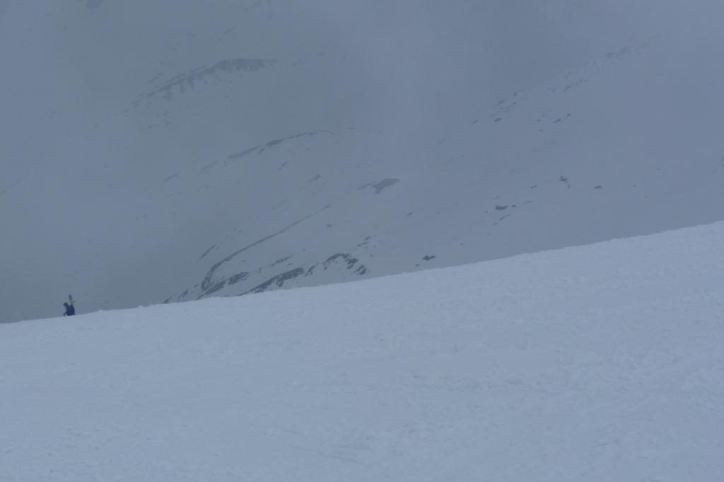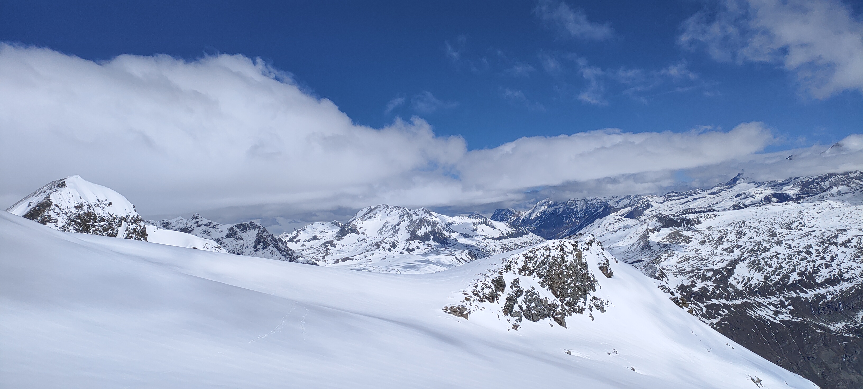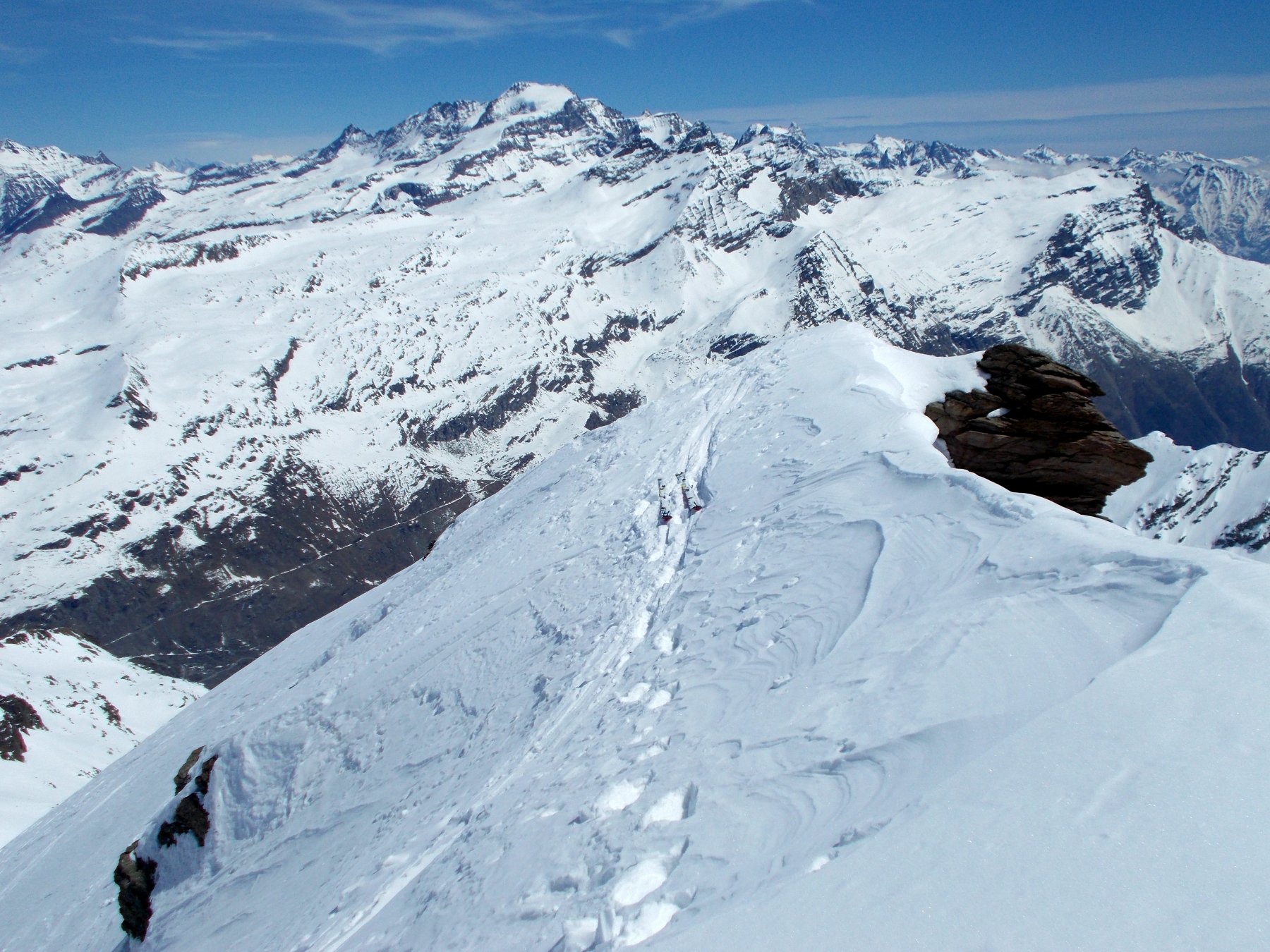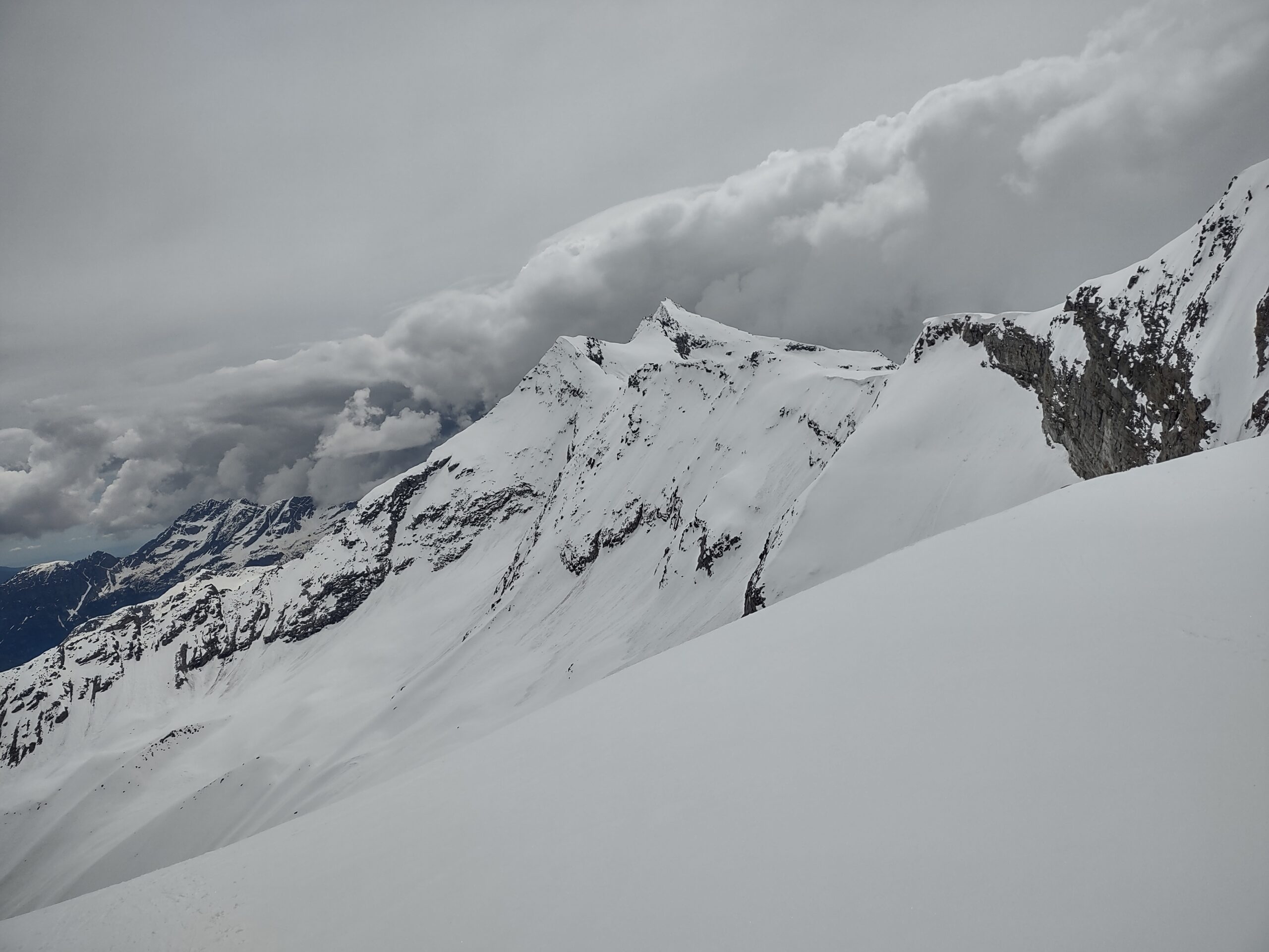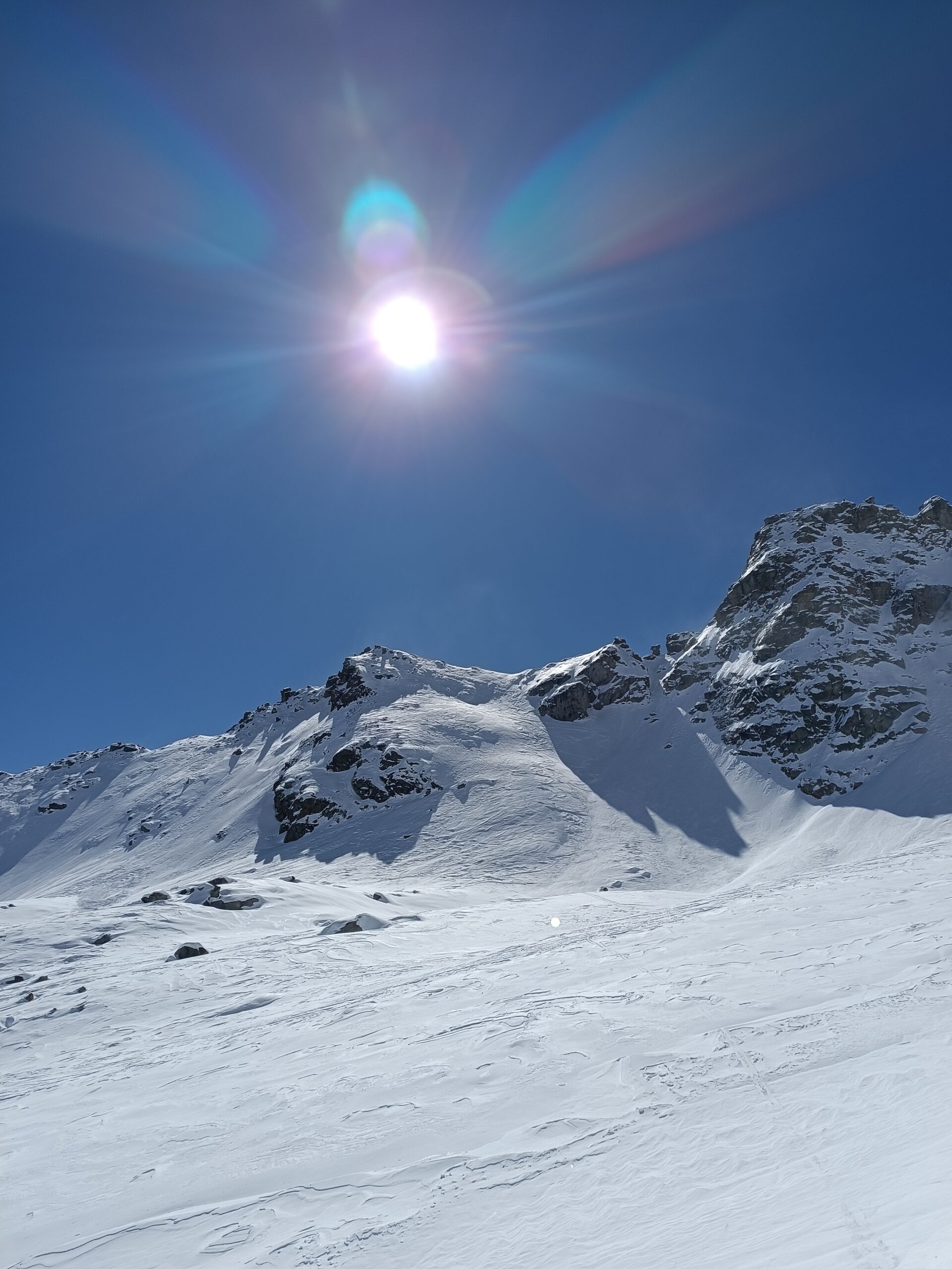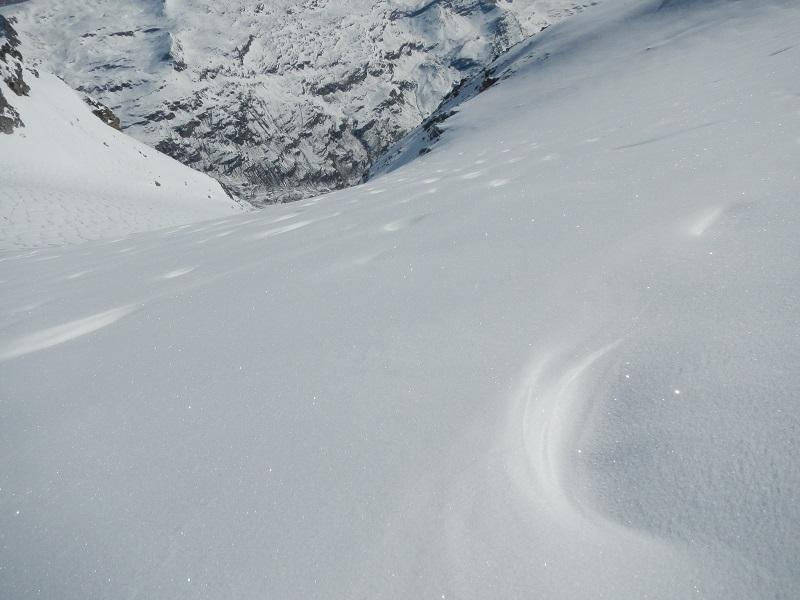 Al termine di questa rampa la pendenza diminuisce e si piega a sinistra in direzione della cima che si raggiunge agevolmente, direttamente o per la cresta di frontiera.