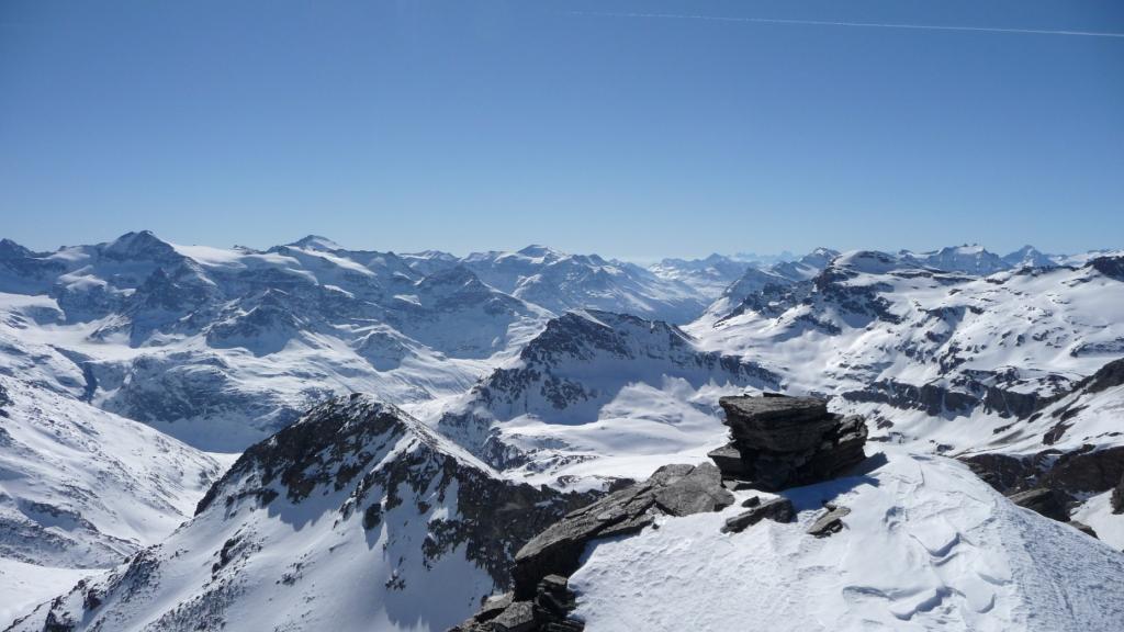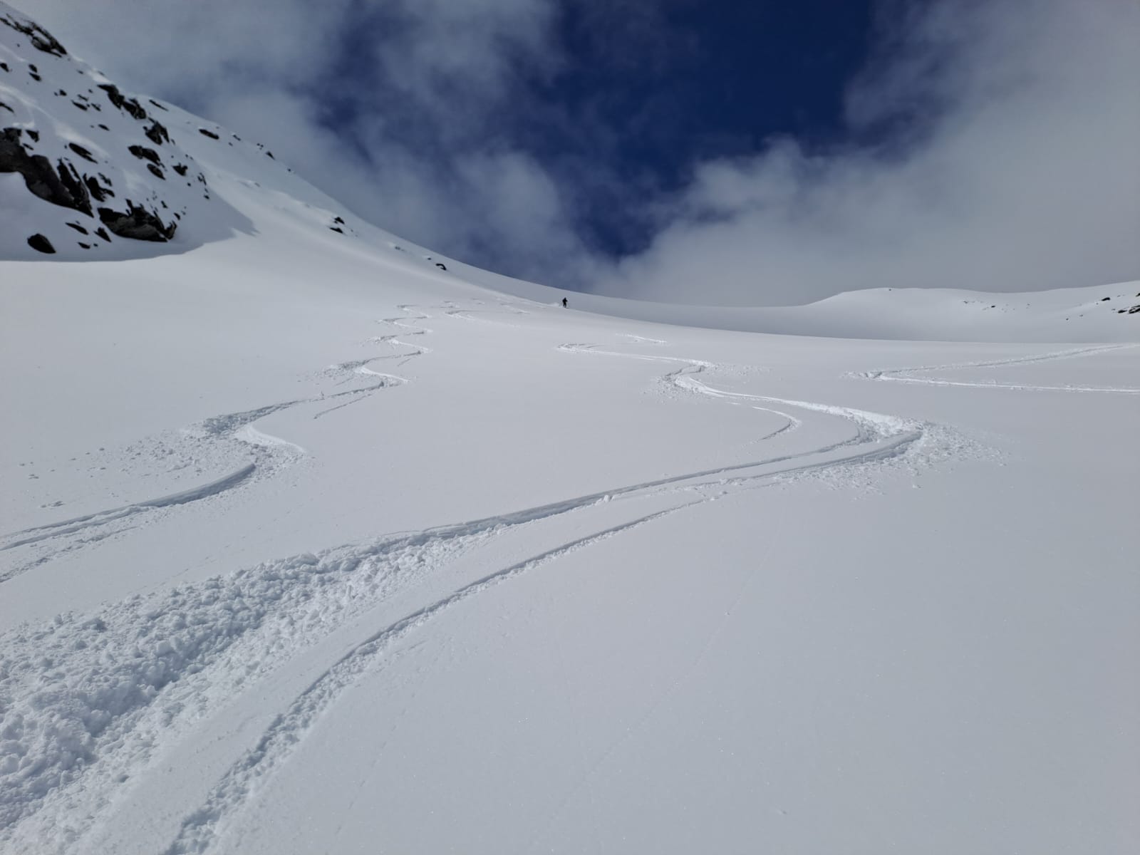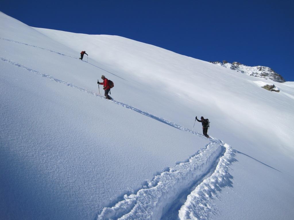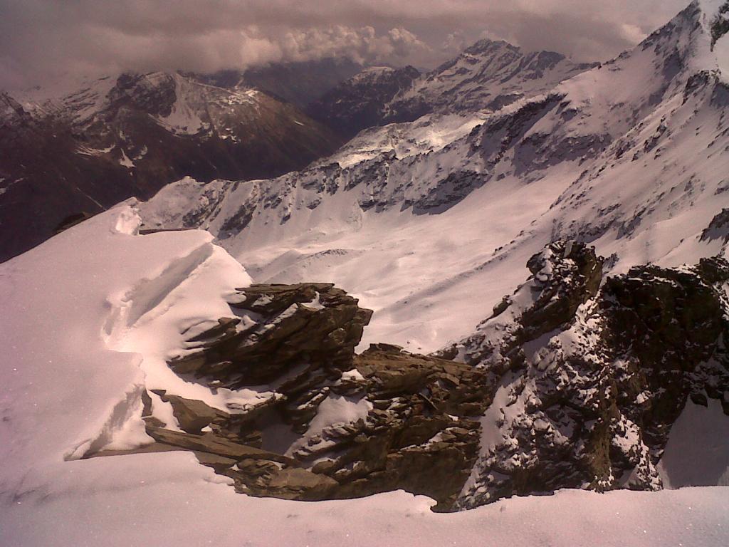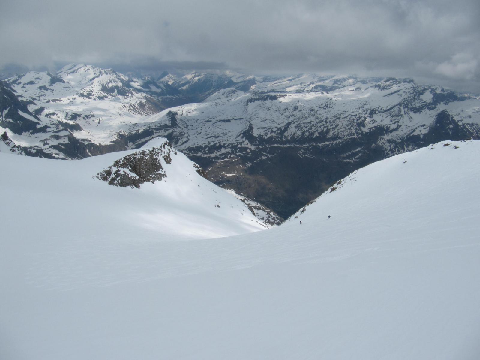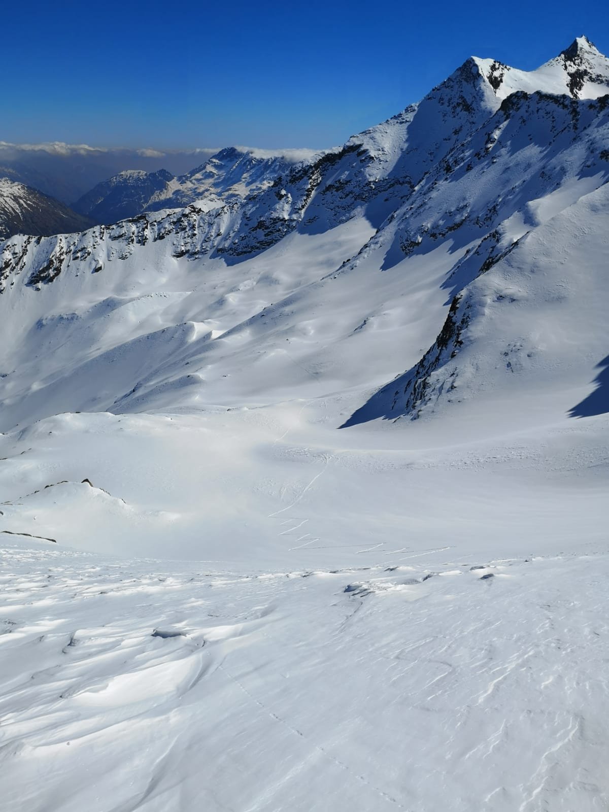 Al termine di questa rampa la pendenza diminuisce e si piega a sinistra in direzione della cima che si raggiunge agevolmente, direttamente o per la cresta di frontiera.