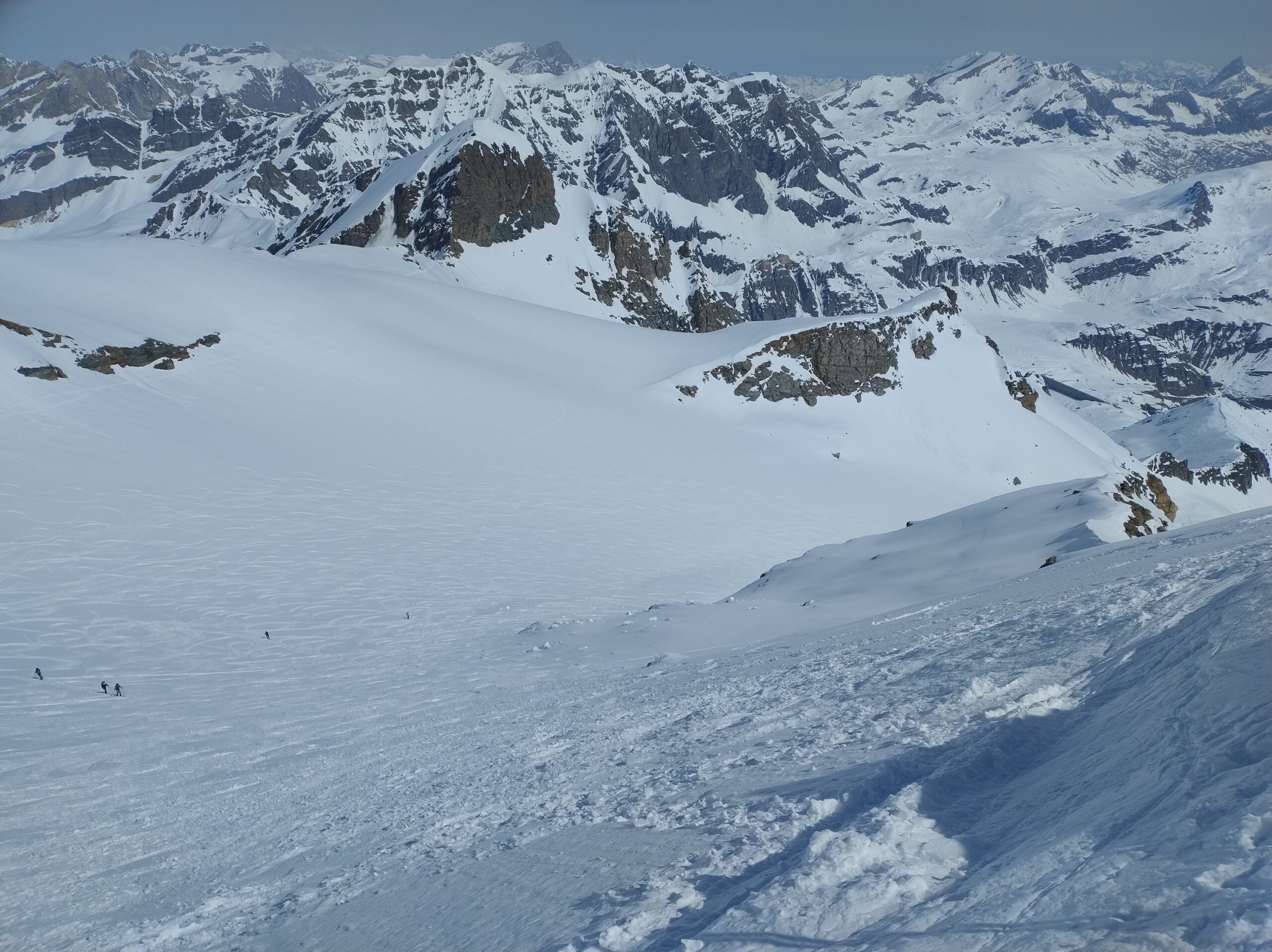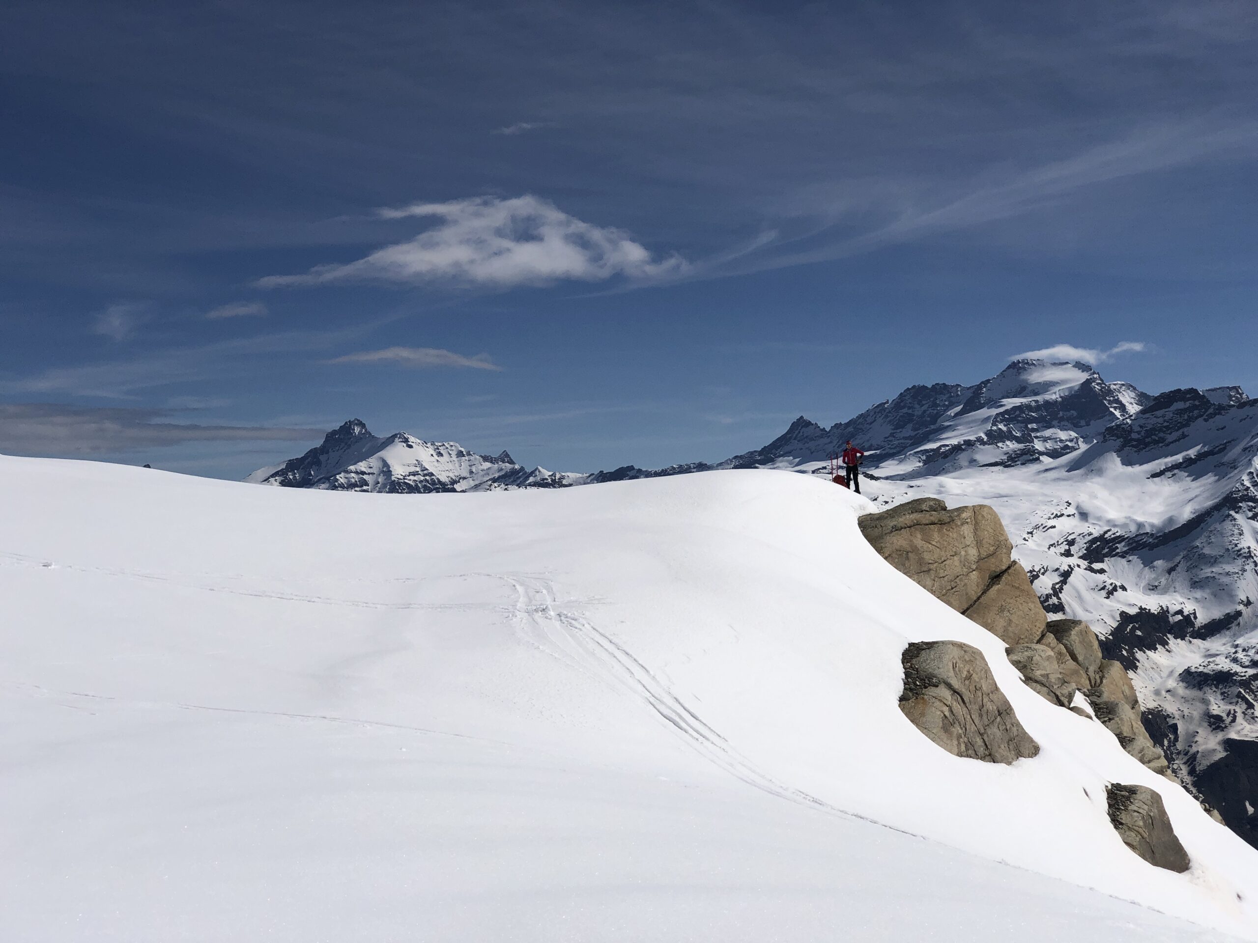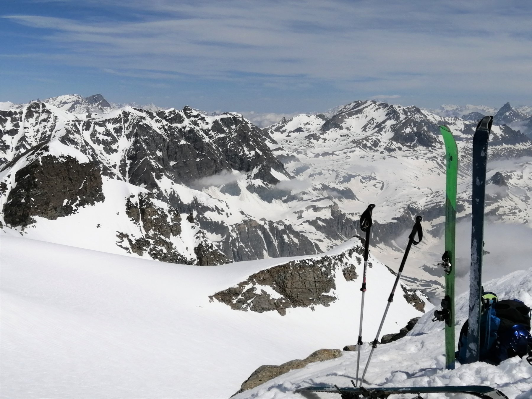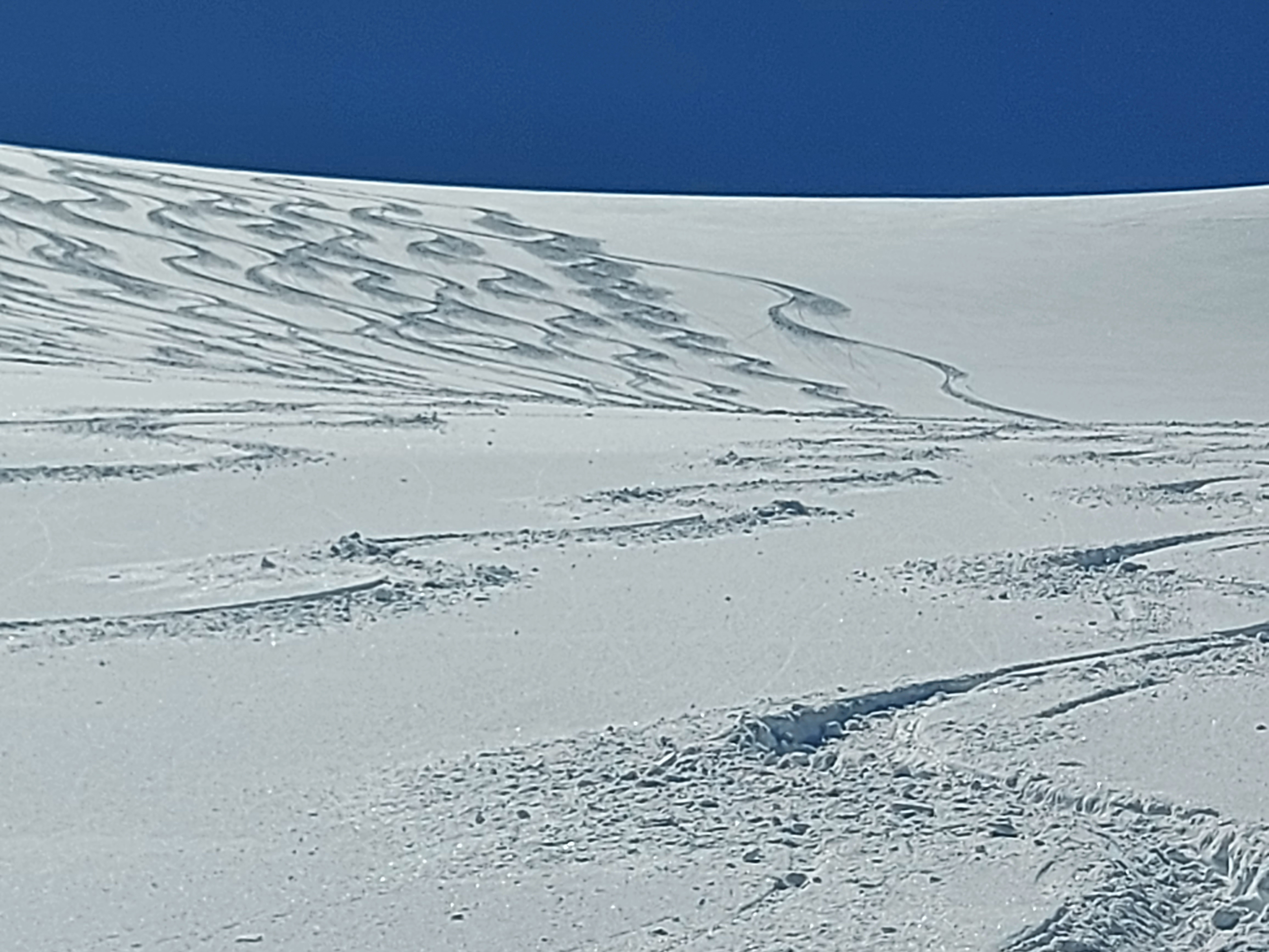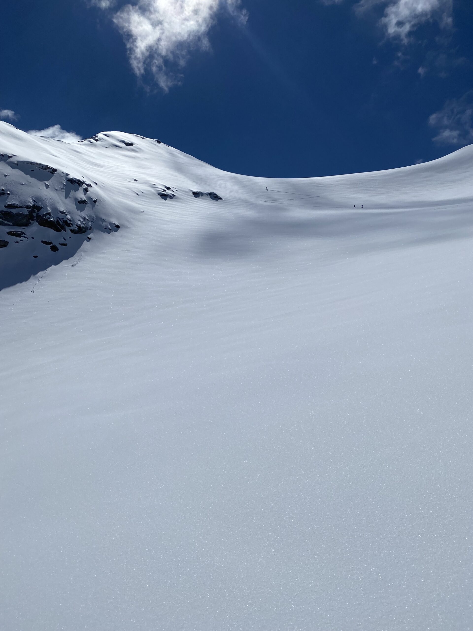 Al termine di questa rampa la pendenza diminuisce e si piega a sinistra in direzione della cima che si raggiunge agevolmente, direttamente o per la cresta di frontiera.
