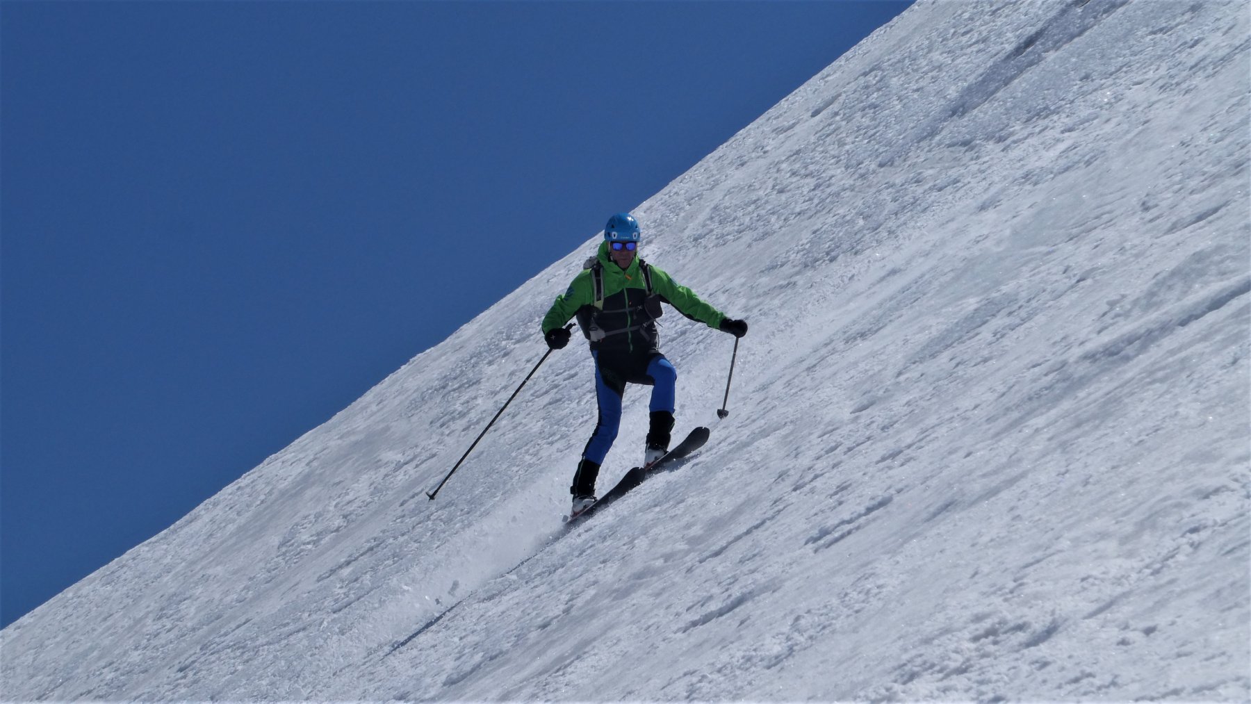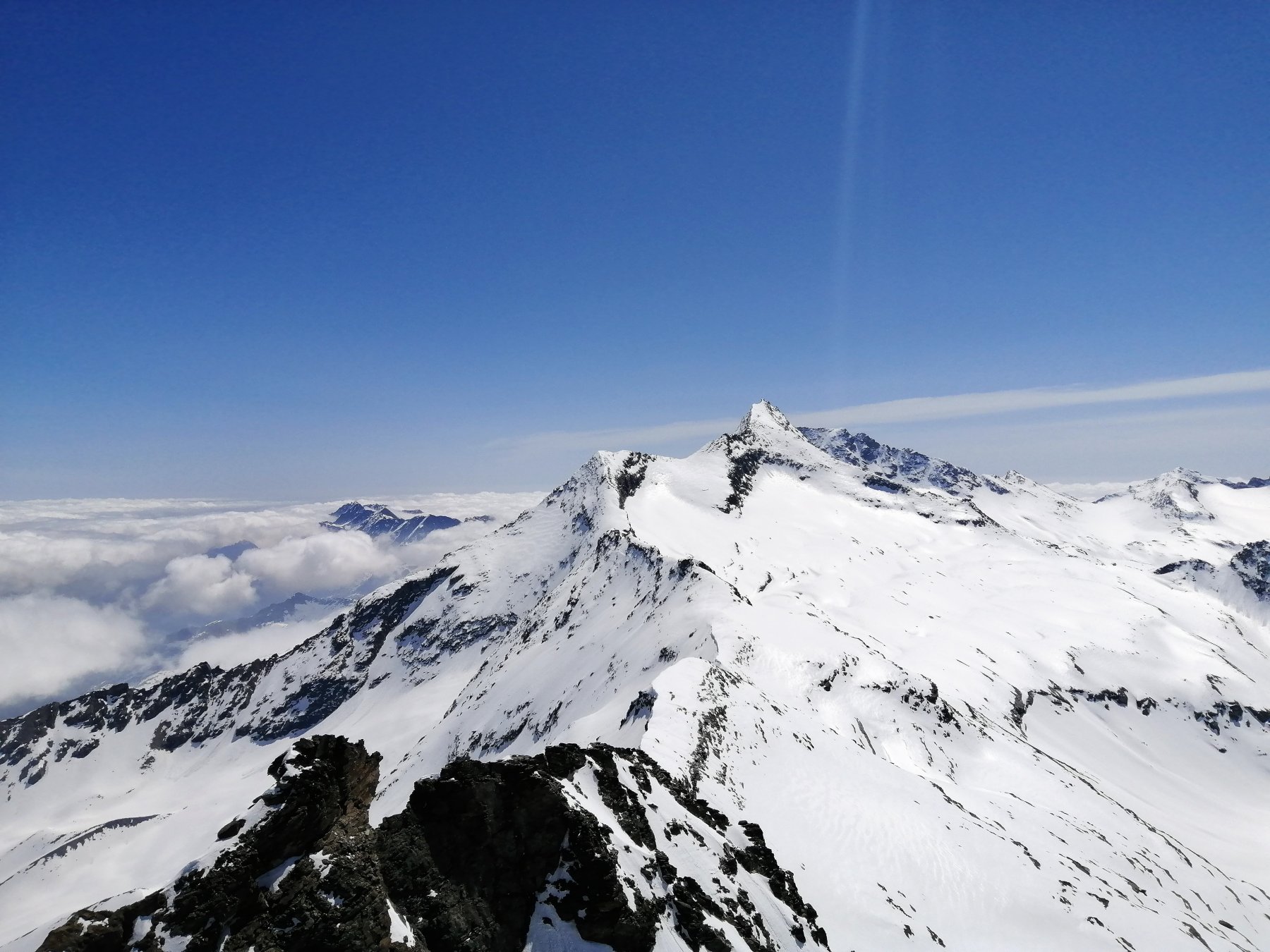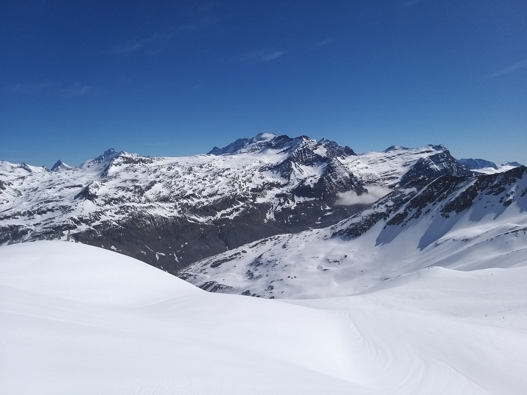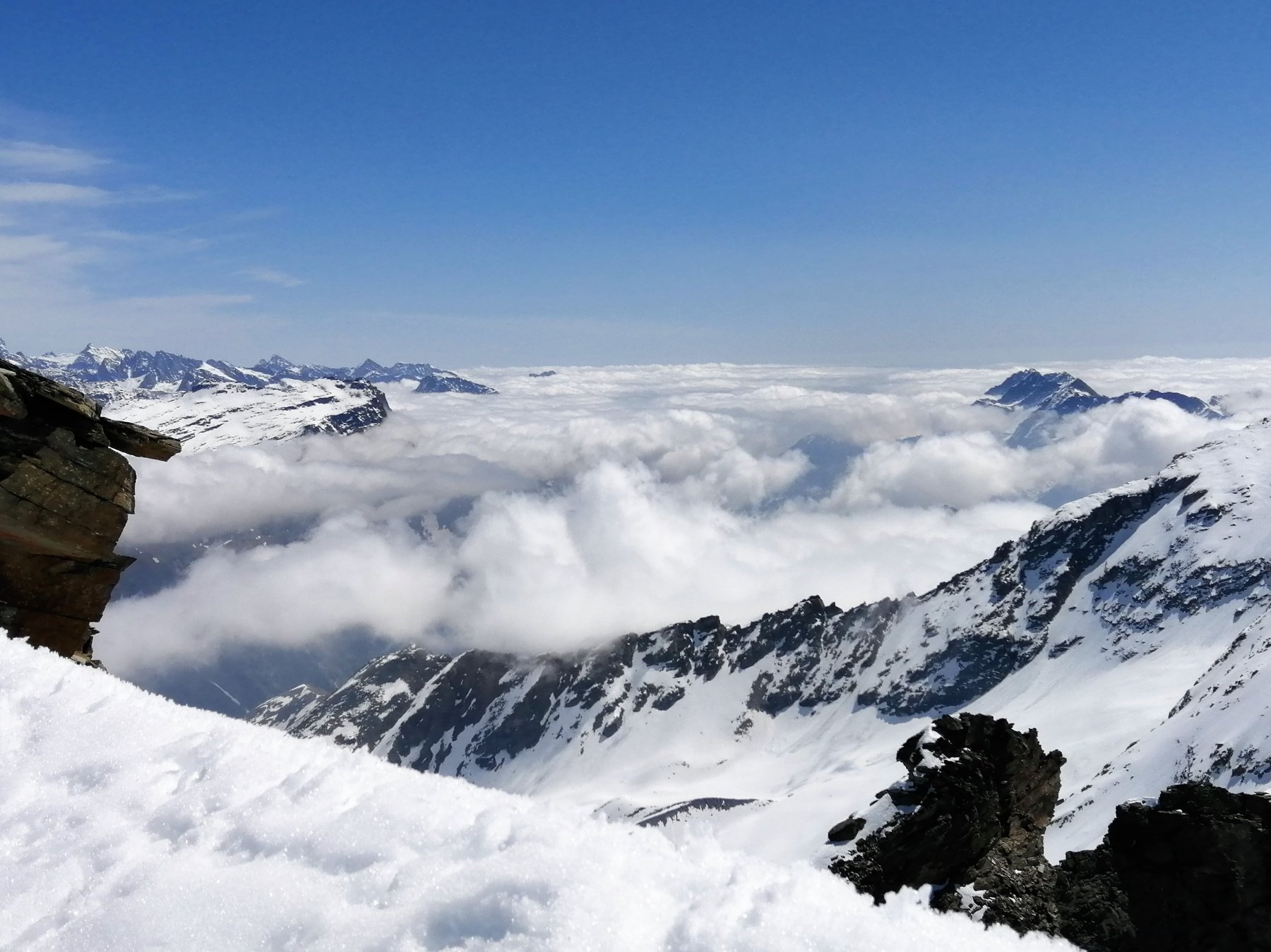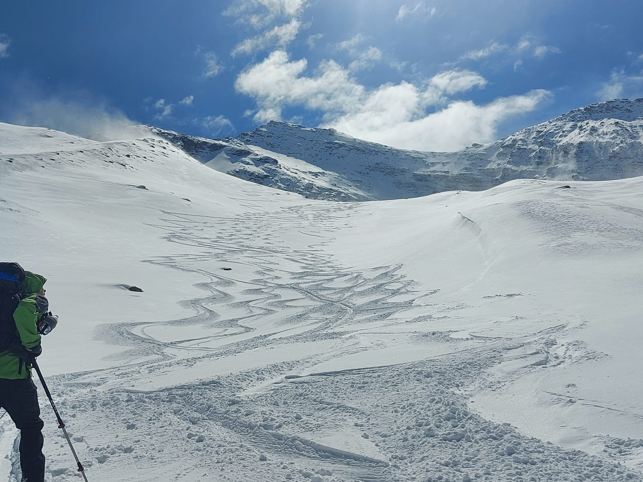 Al termine di questa rampa la pendenza diminuisce e si piega a sinistra in direzione della cima che si raggiunge agevolmente, direttamente o per la cresta di frontiera.