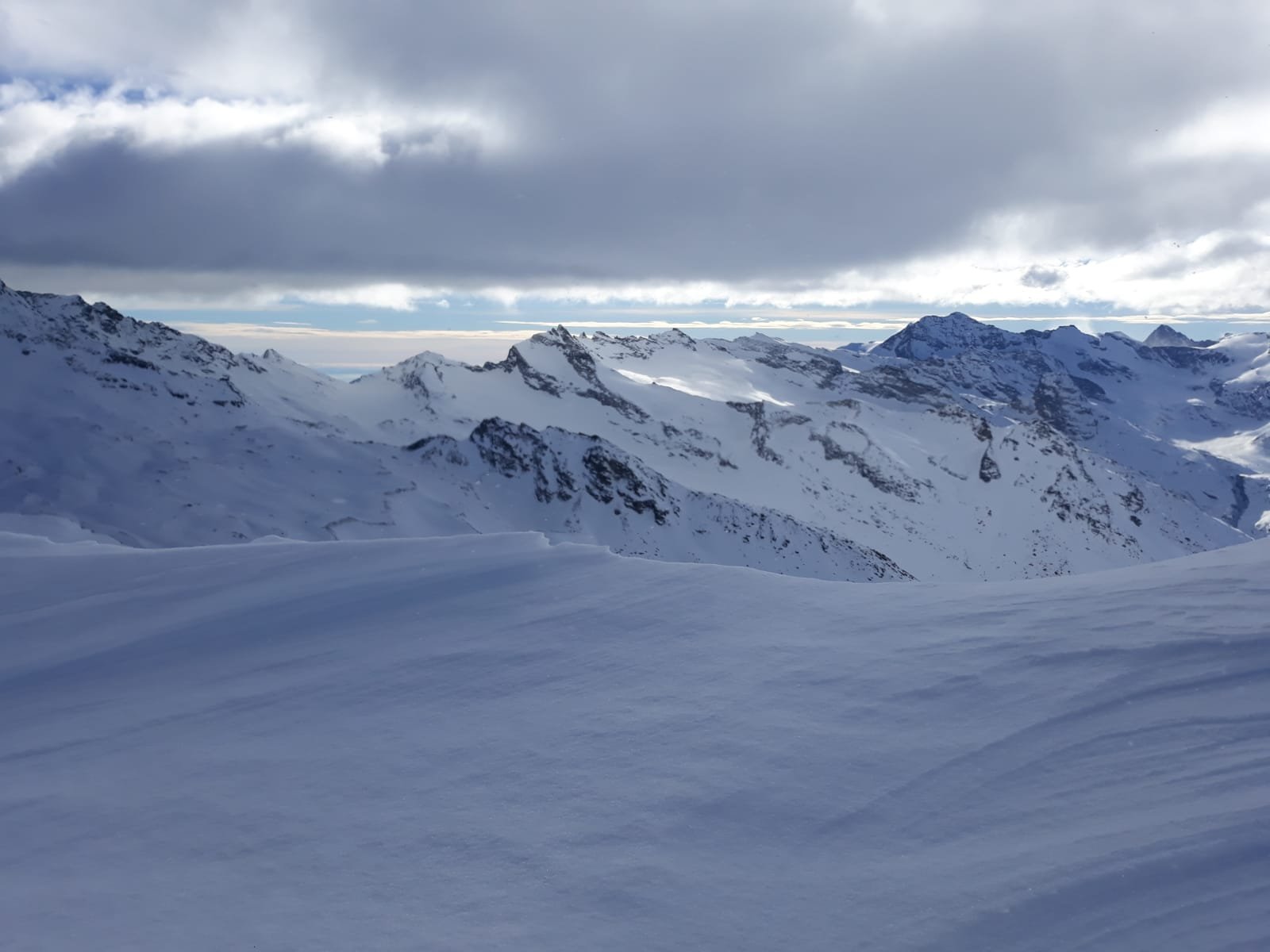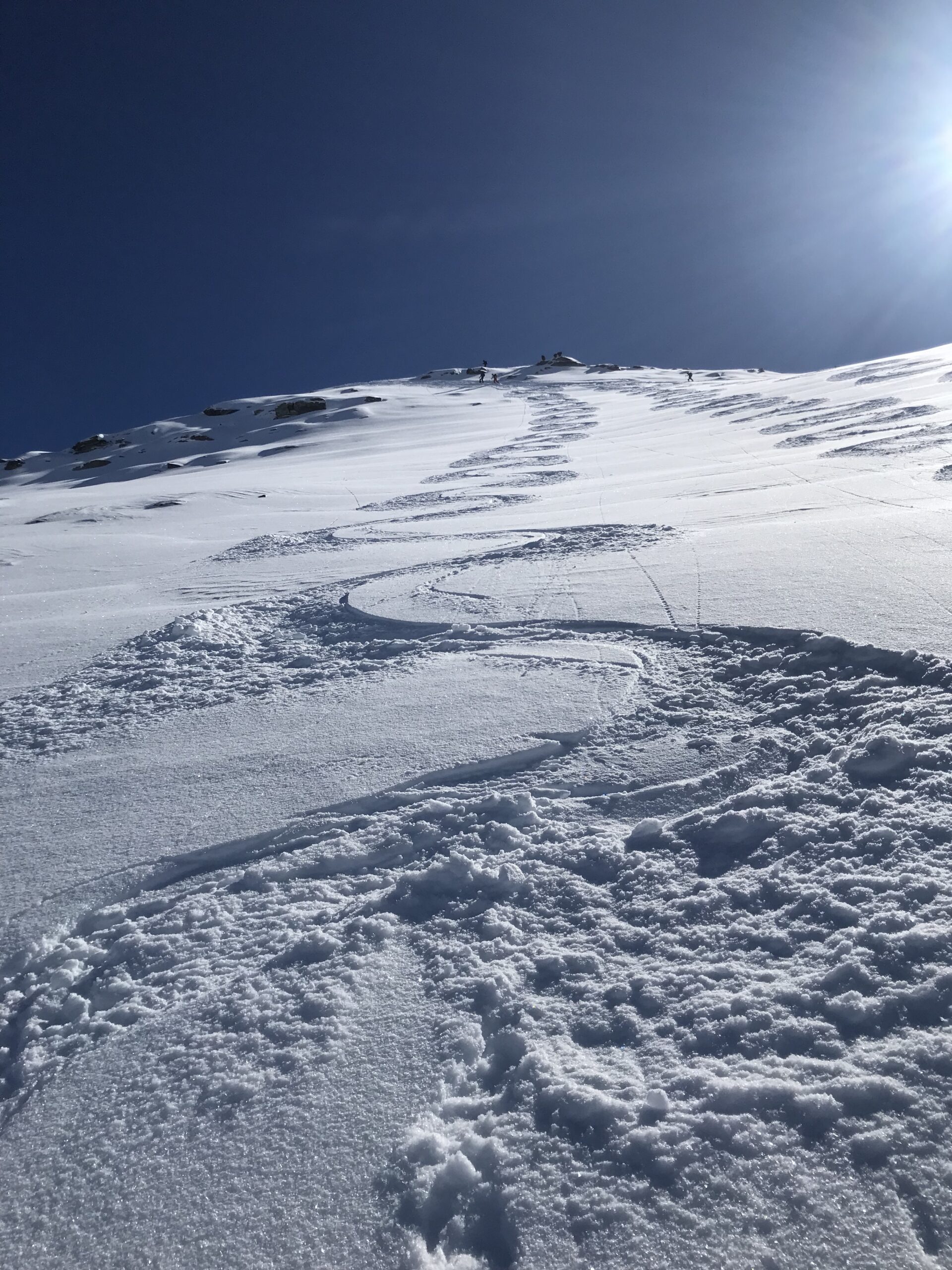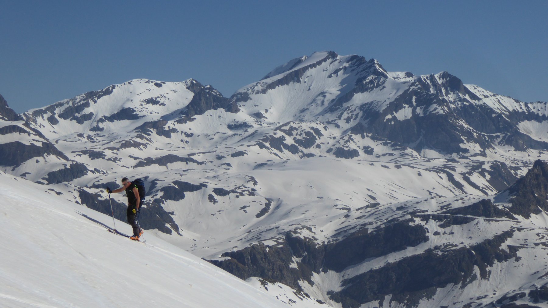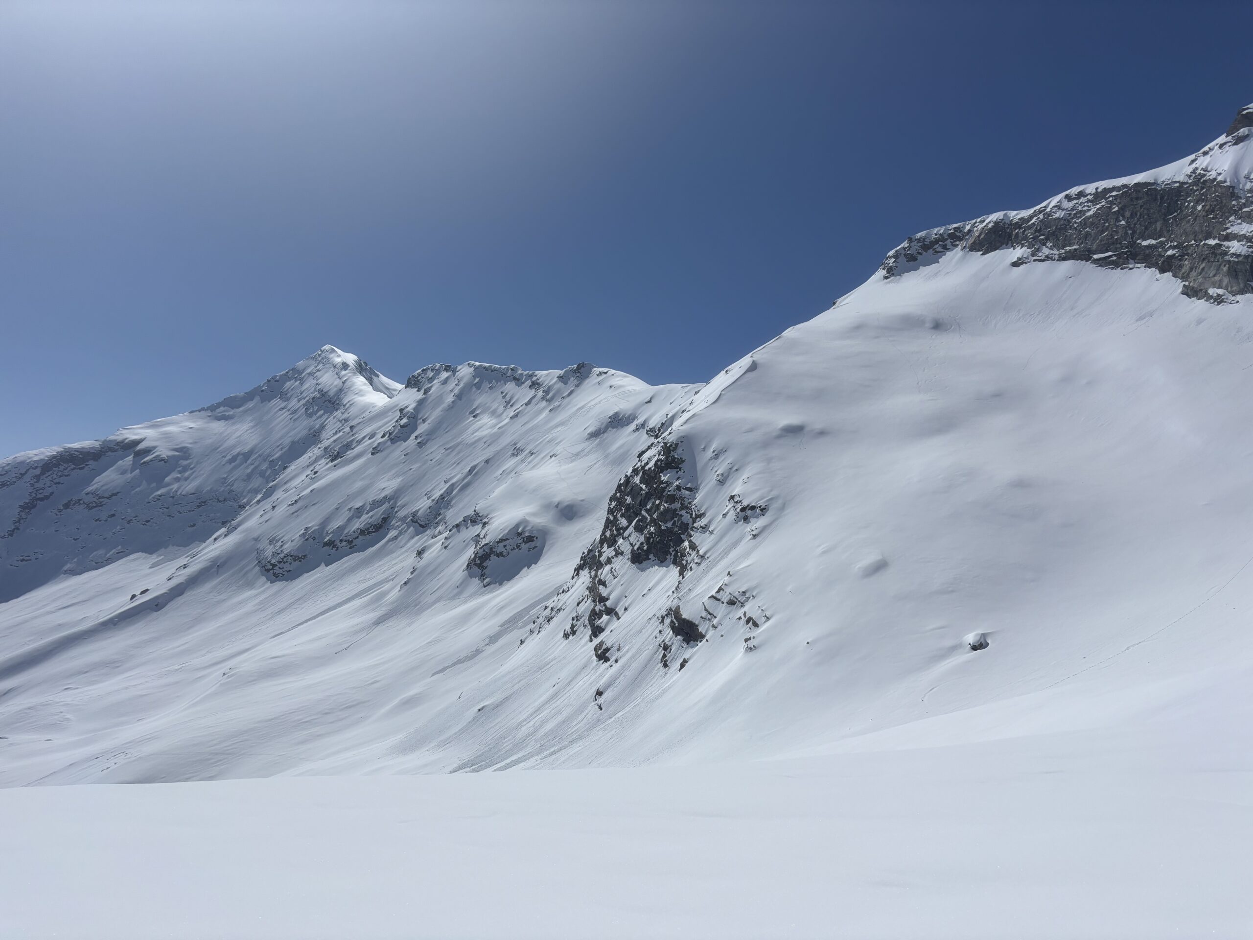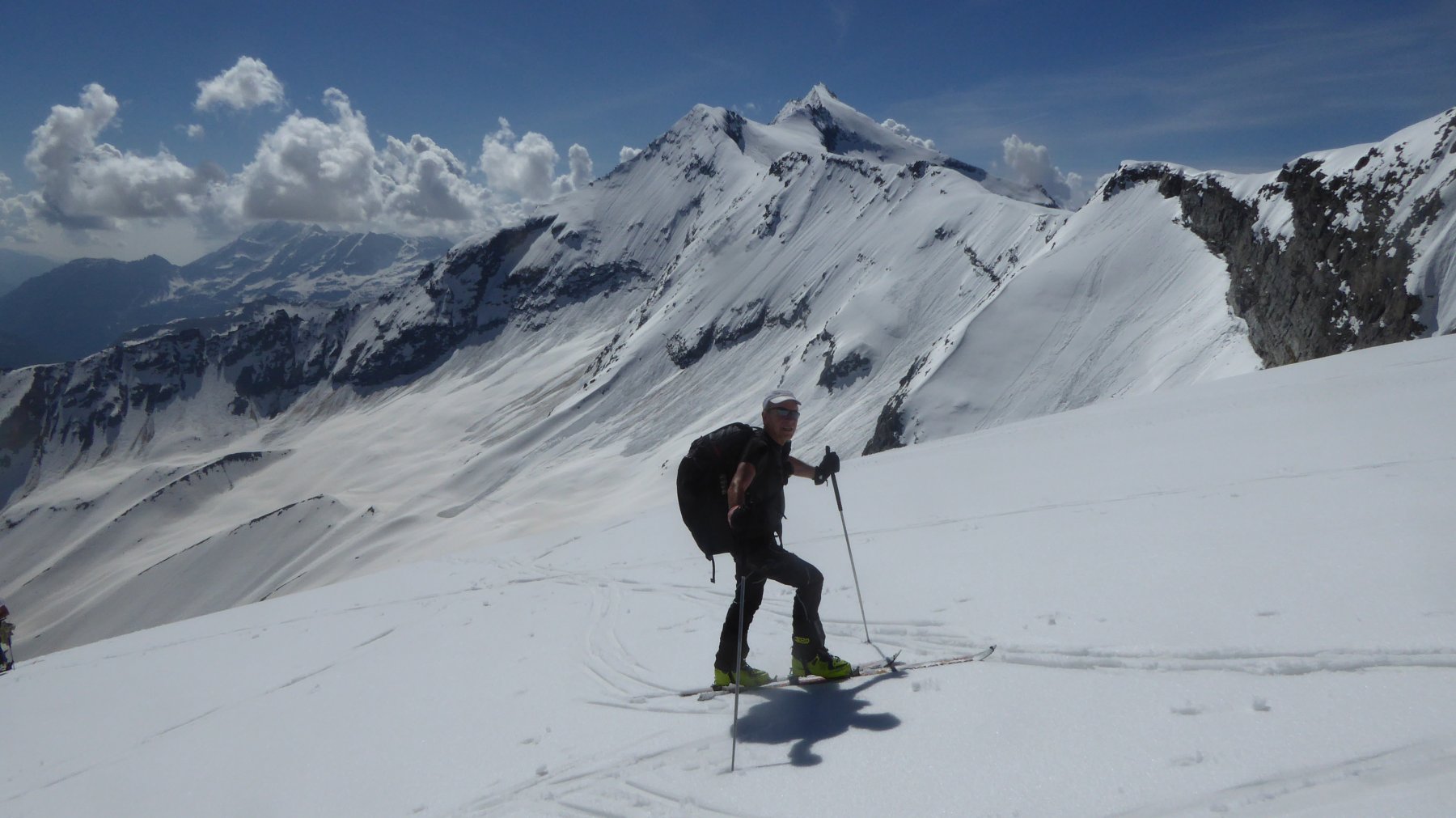 Al termine di questa rampa la pendenza diminuisce e si piega a sinistra in direzione della cima che si raggiunge agevolmente, direttamente o per la cresta di frontiera.