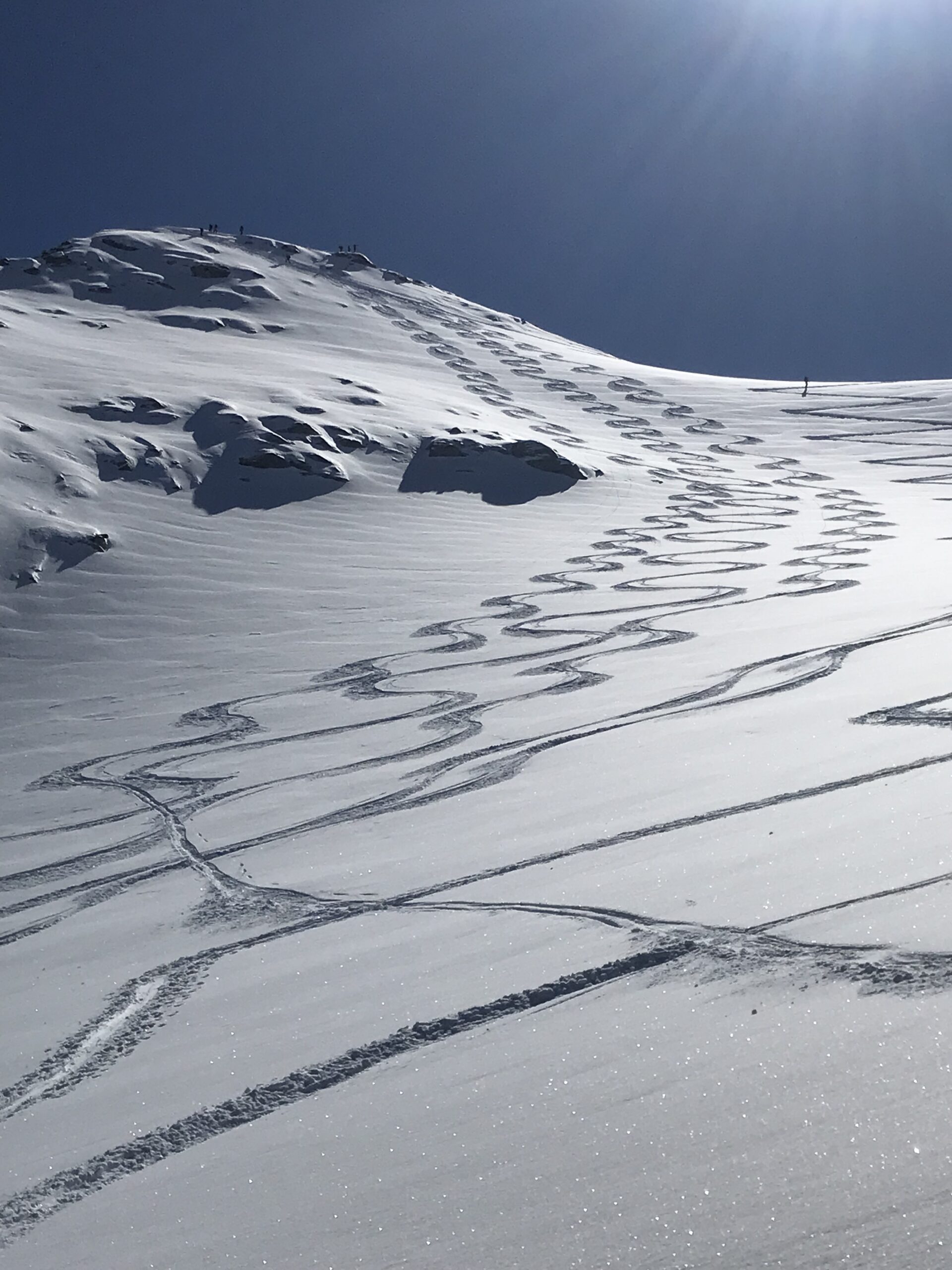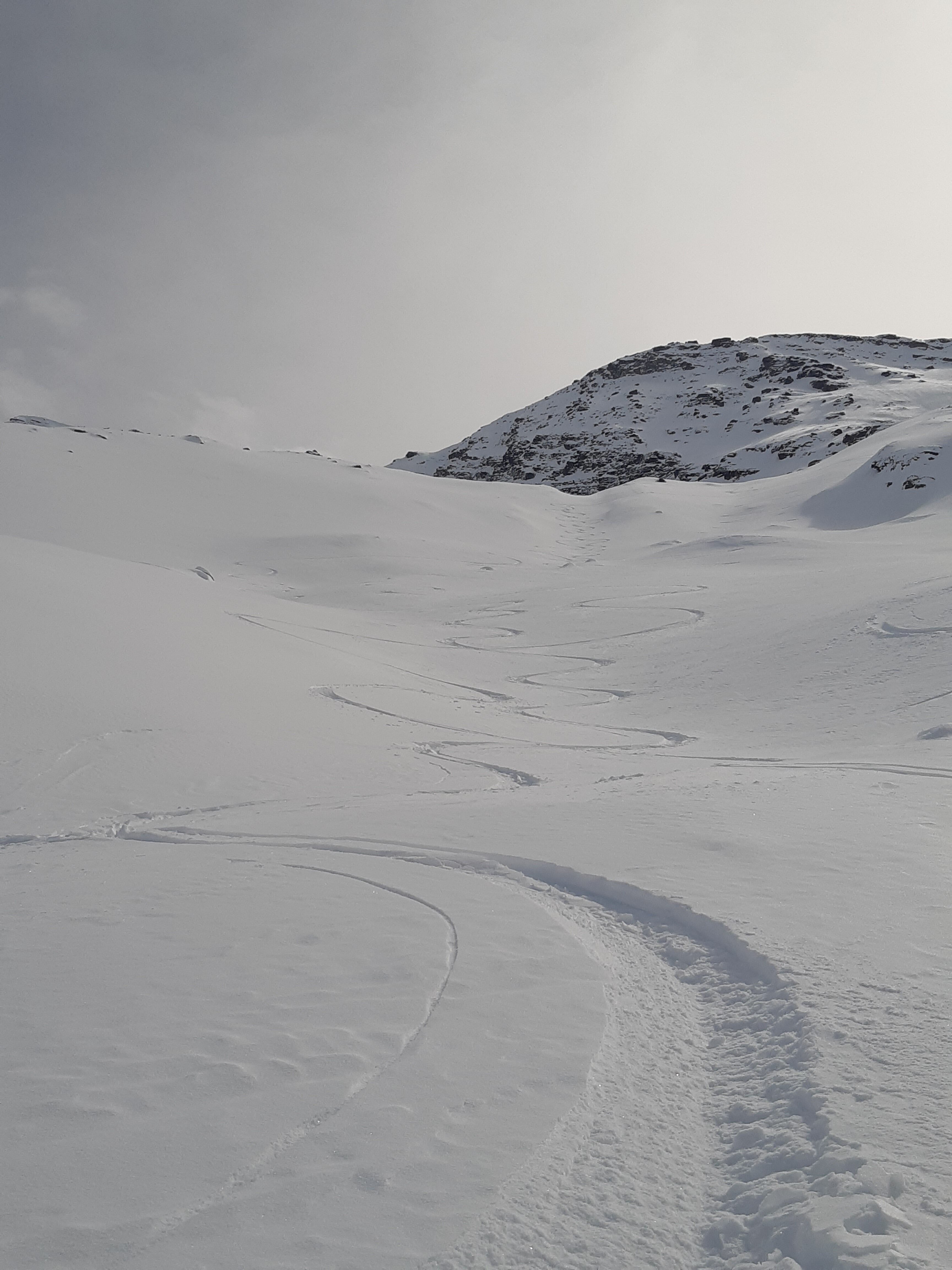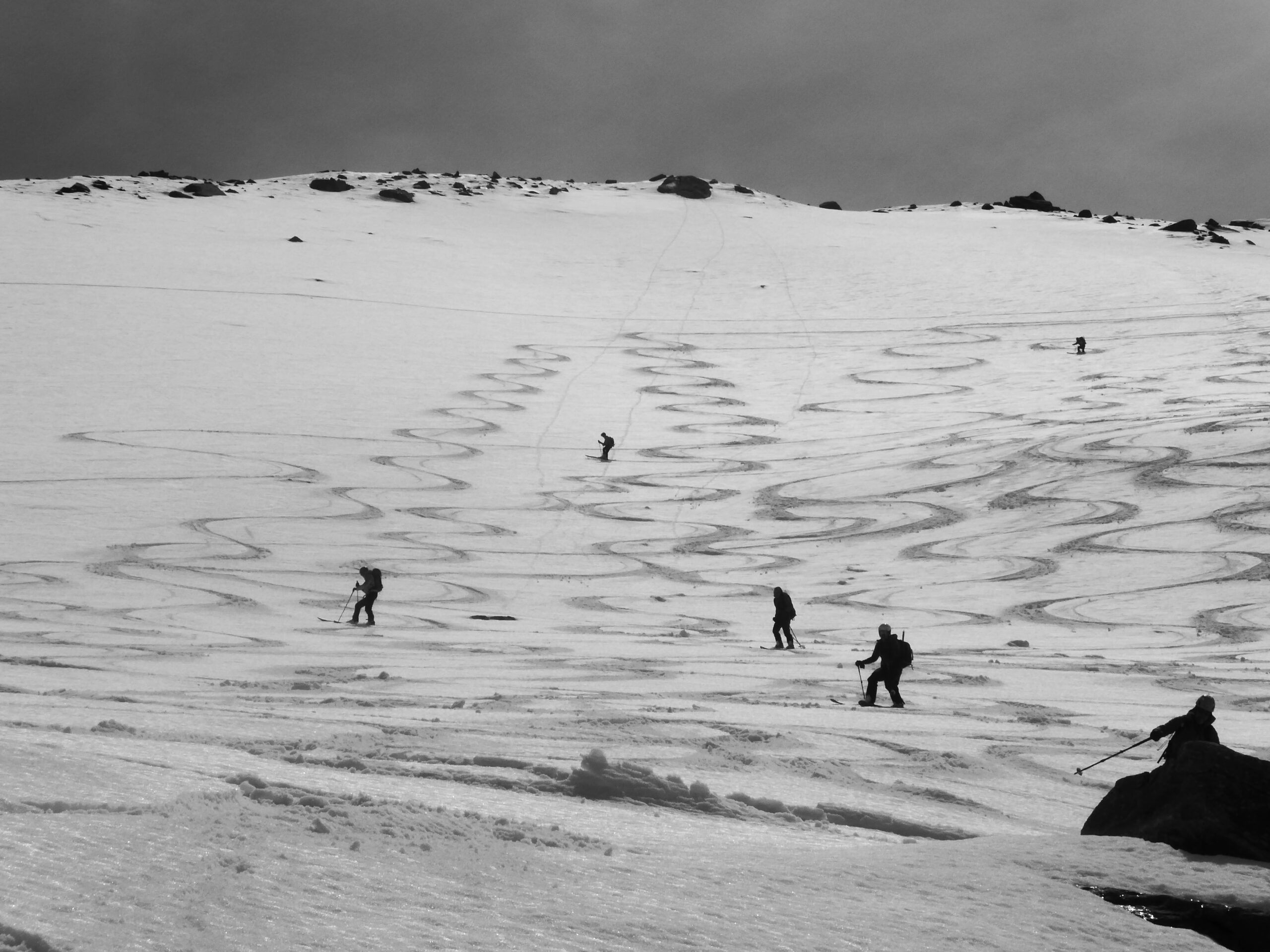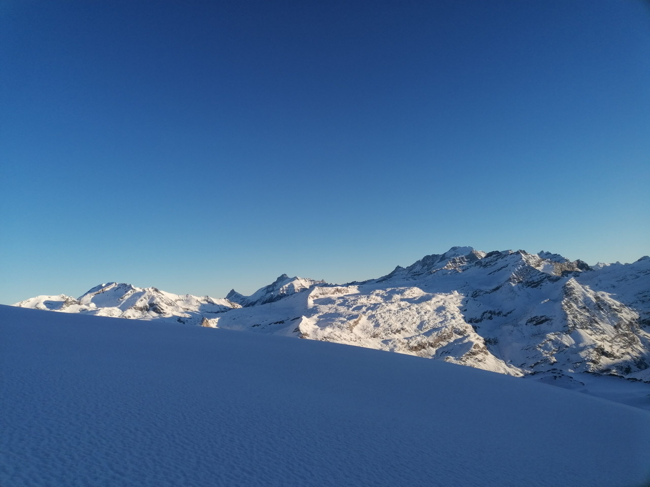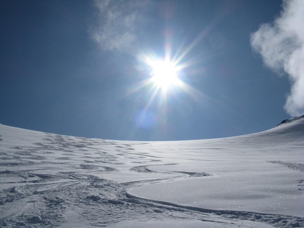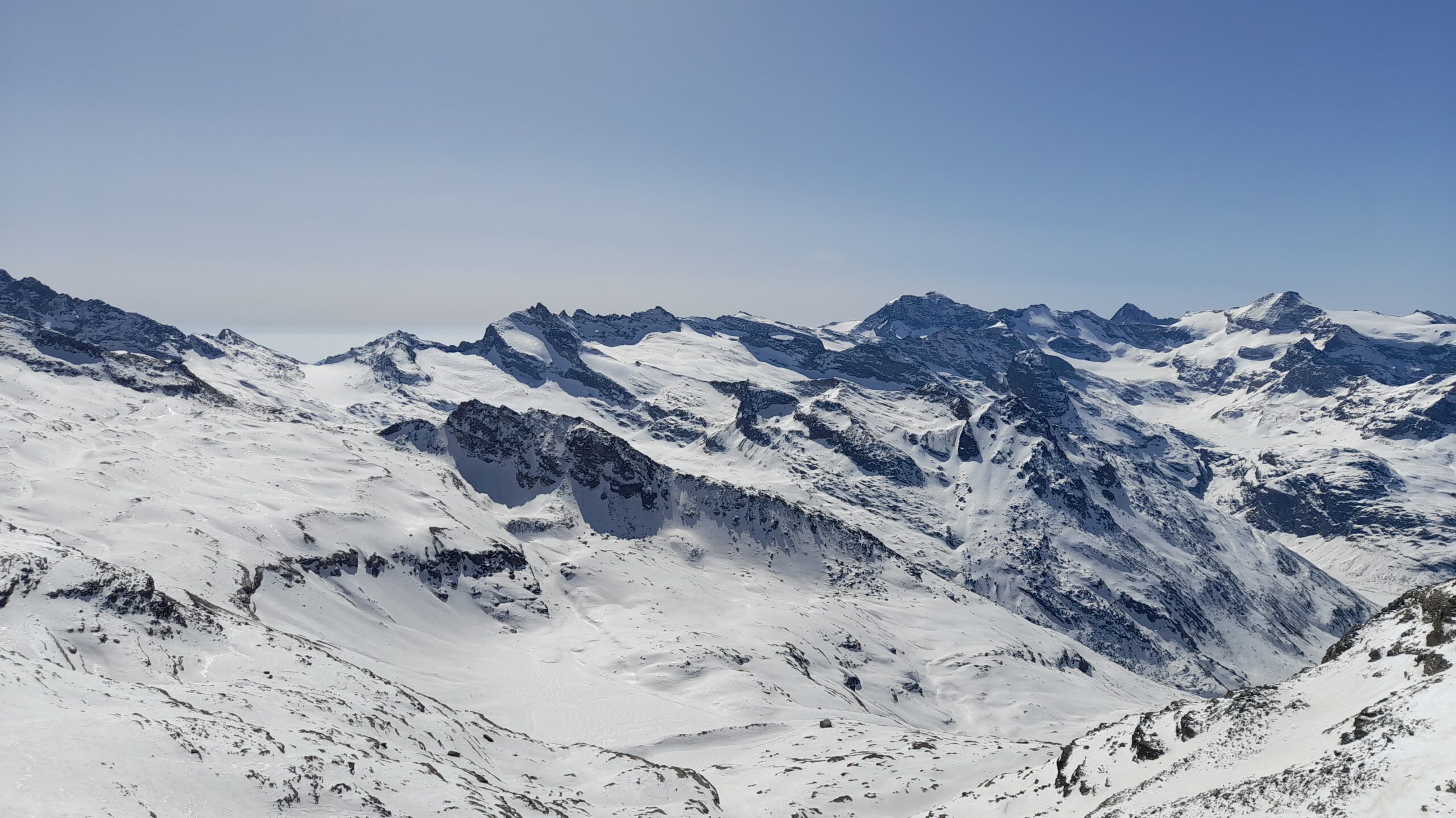 Al termine di questa rampa la pendenza diminuisce e si piega a sinistra in direzione della cima che si raggiunge agevolmente, direttamente o per la cresta di frontiera.