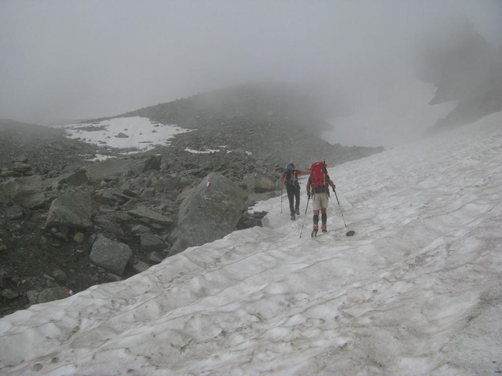 Ottima la relazione di Monica, però io sono più positivo e ci metto una stella in più in quanto la salita fino al colle diciamo che non abbiamo visto il sole ma non è neanche piovuto…se non subito dopo aver iniziato la discesa al rifugio. Al pomeriggio c’è stata una bella apertura e questo mi ha permesso di gironzolare un po’ lungo la via di salita della Levanna Occidentale, accompagnato da Beppe; siamo arrivati sopra la morena in vista del Col des Patriotes e della vetta, tanto per capire come si sarebbe svolta la salita il giorno seguente.