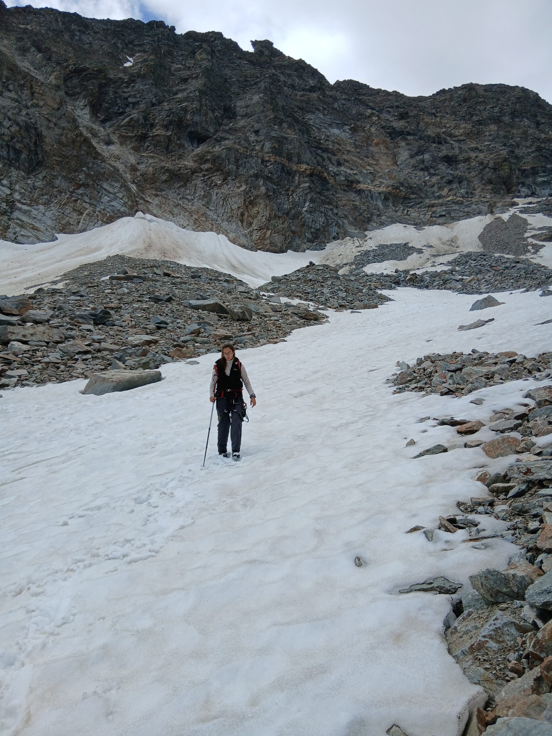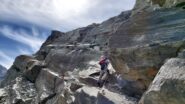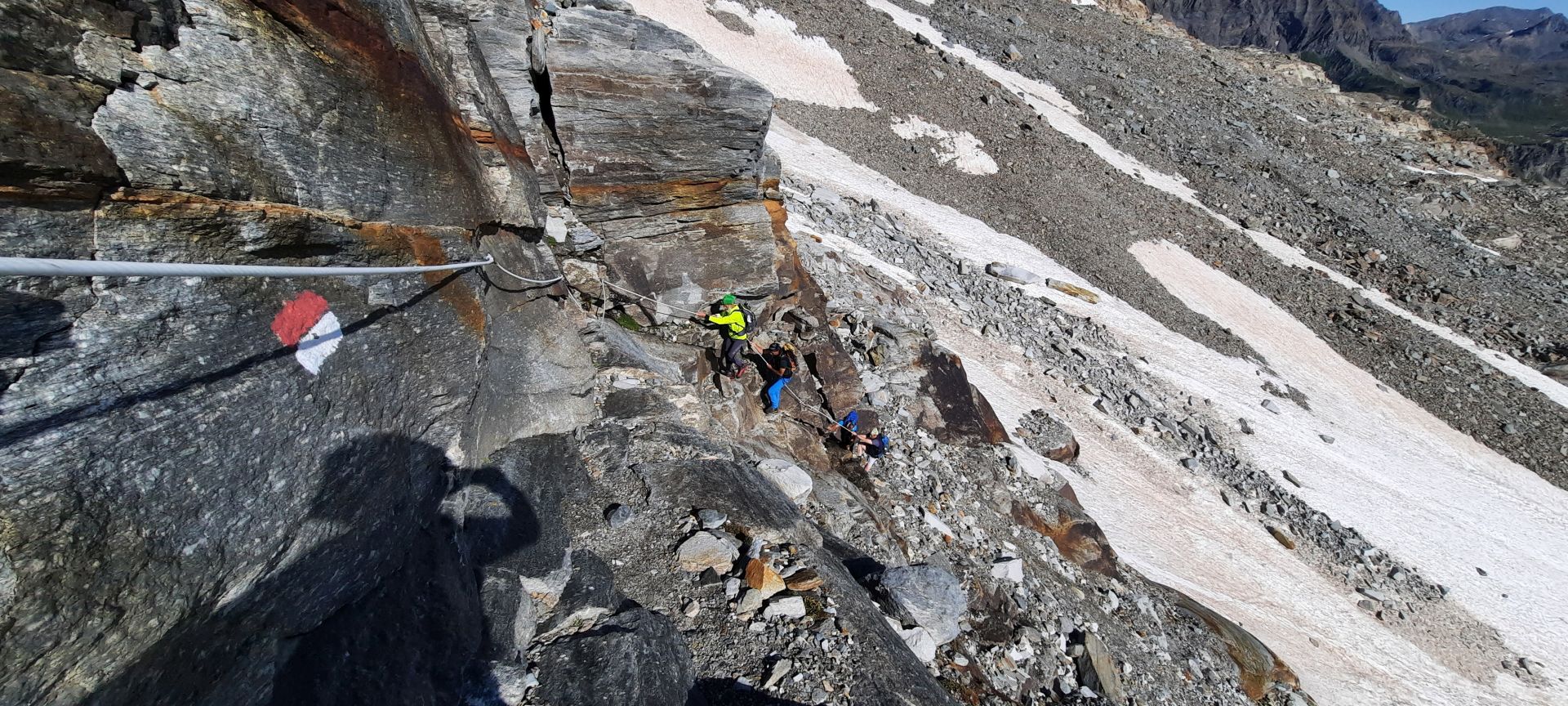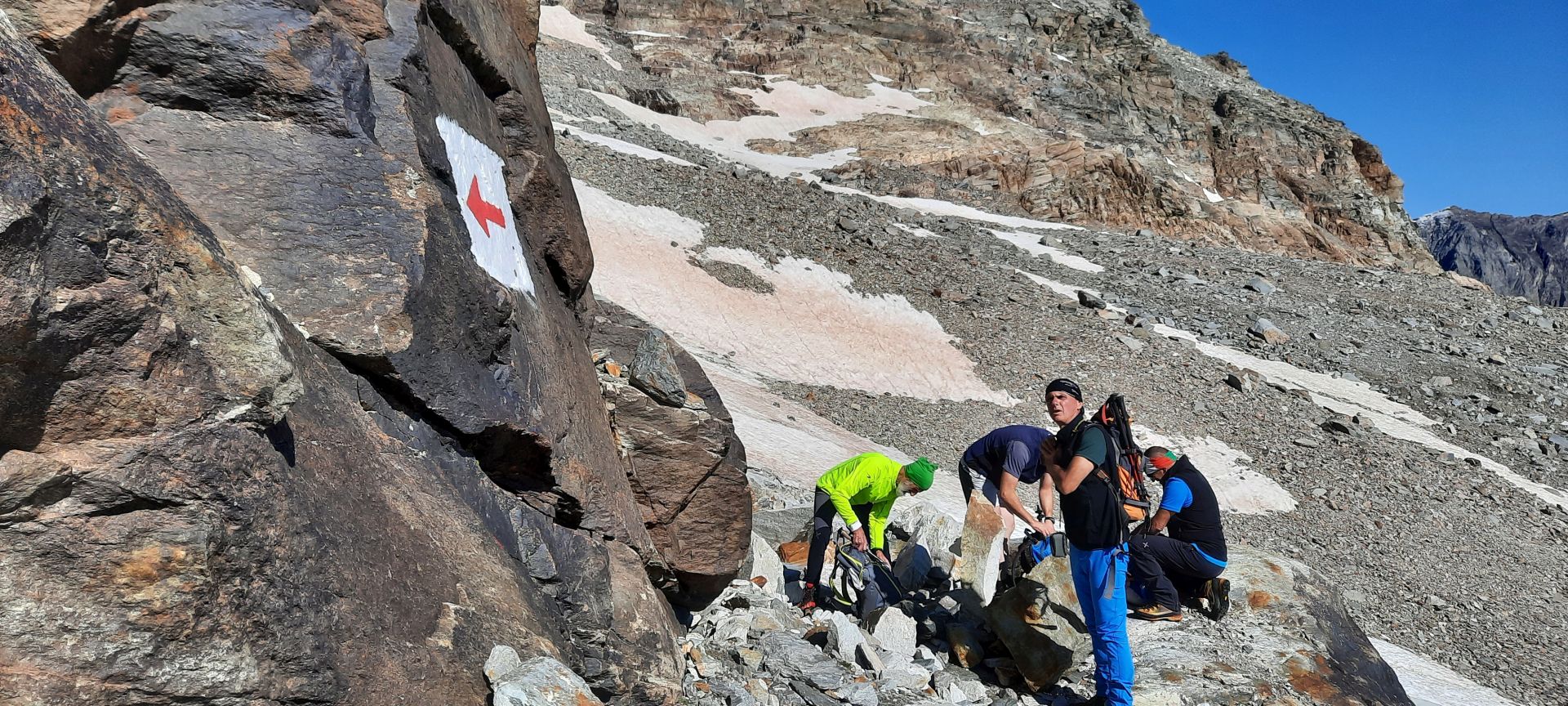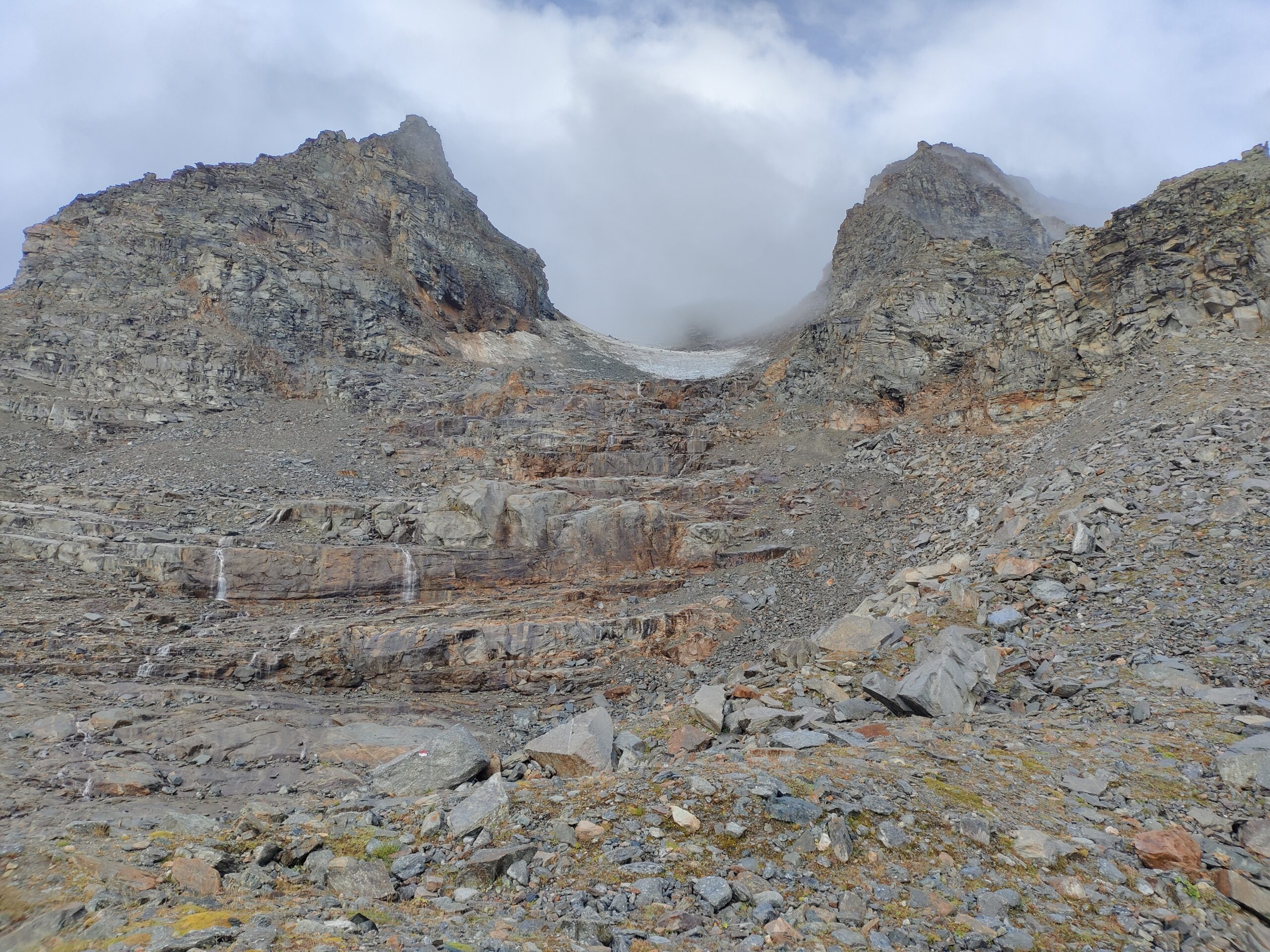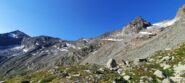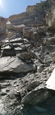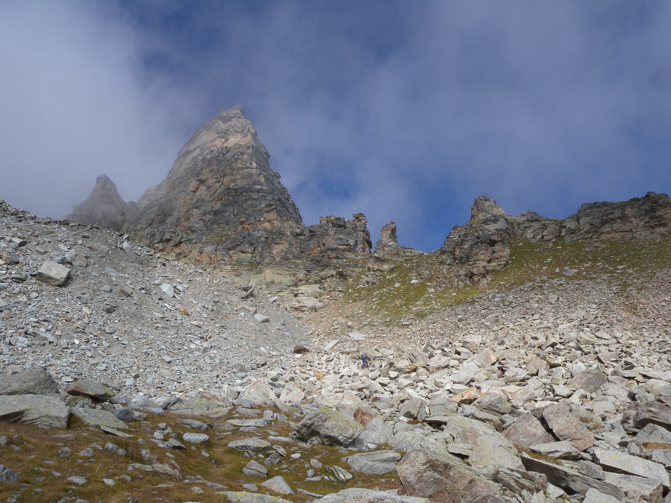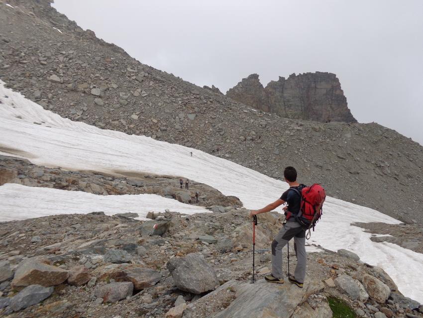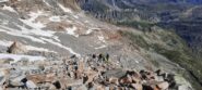 Su sentiero sempre ben segnalato si prosegue fino a passare sotto al ghiacciaio tra la cima d’oin e la quota 3183. Si attraversano alcuni rivoli d’acqua su rocce montonate e poi alcuni nevai e morene che coprono una parte del ghiacciaio occidentale del Carro. Sempre seguendo i segni, si perviene ad un secondo tratto attrezzato che permette di superare una prima balza rocciosa. Il colle del carro è ormai ben visibile e riconoscibile da una evidente palina indicatrice. Su tratti più ripidi si giunge sotto al colle che sembra quasi verticale sopra la nostra testa. Un ultimo tratto attrezzato conduce al colle.