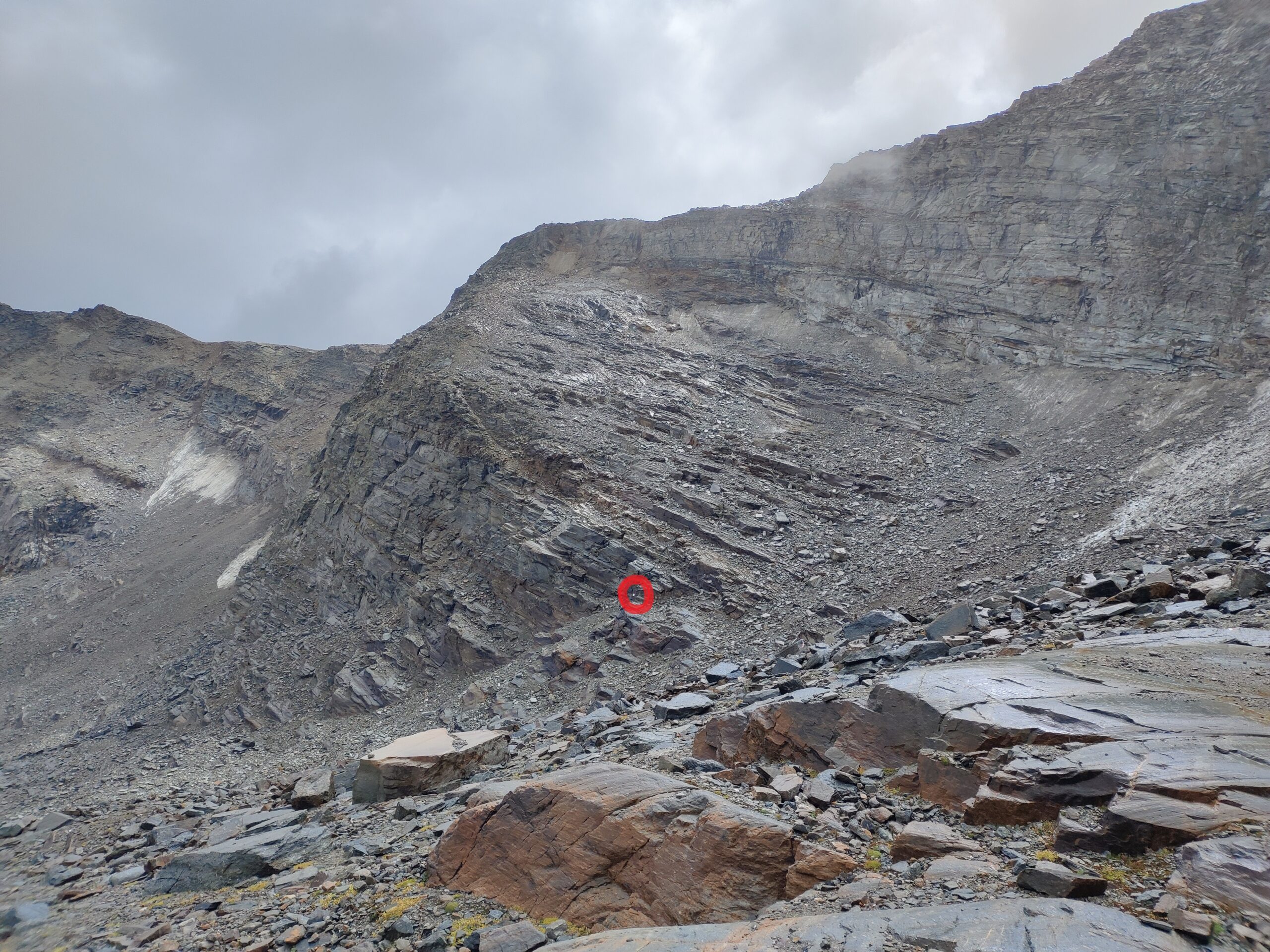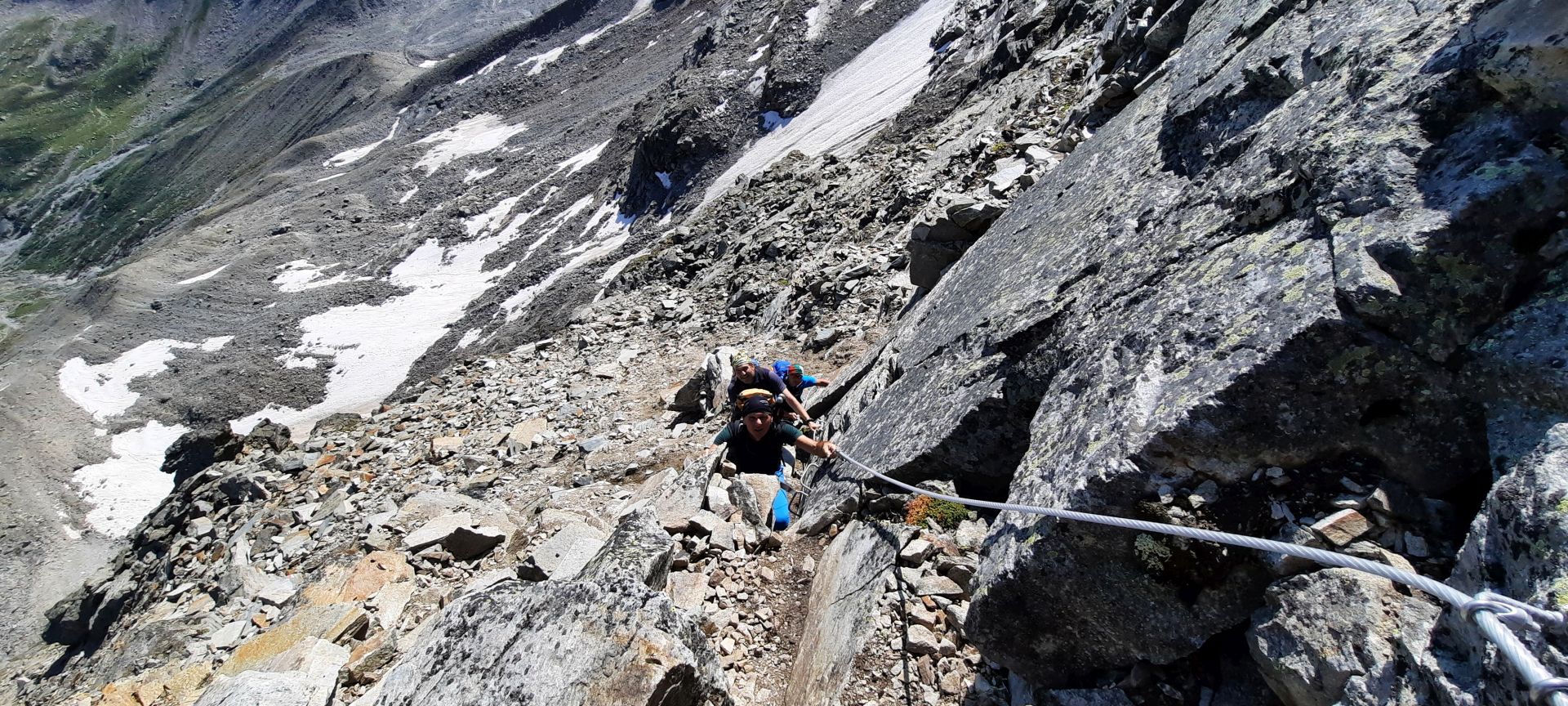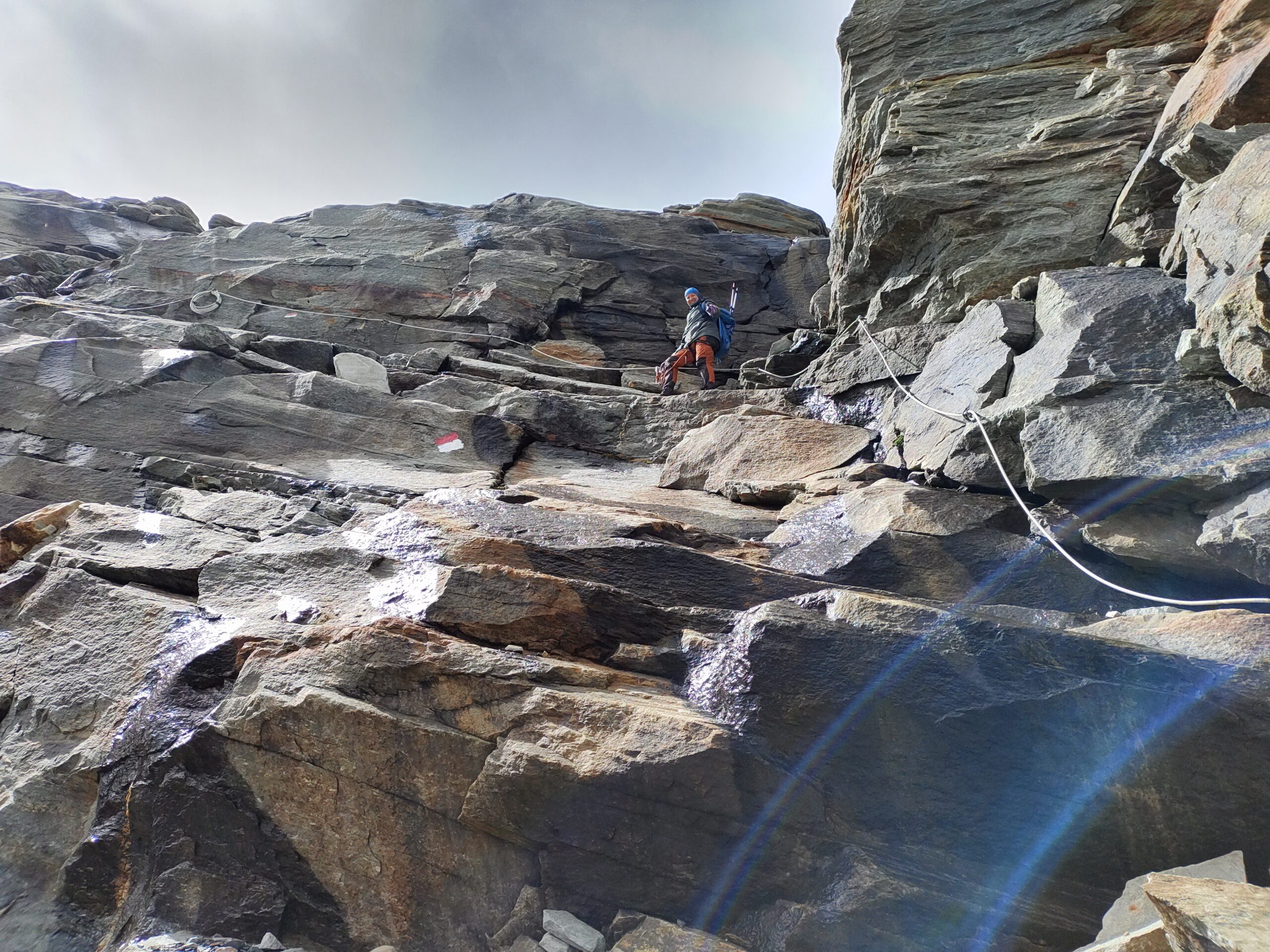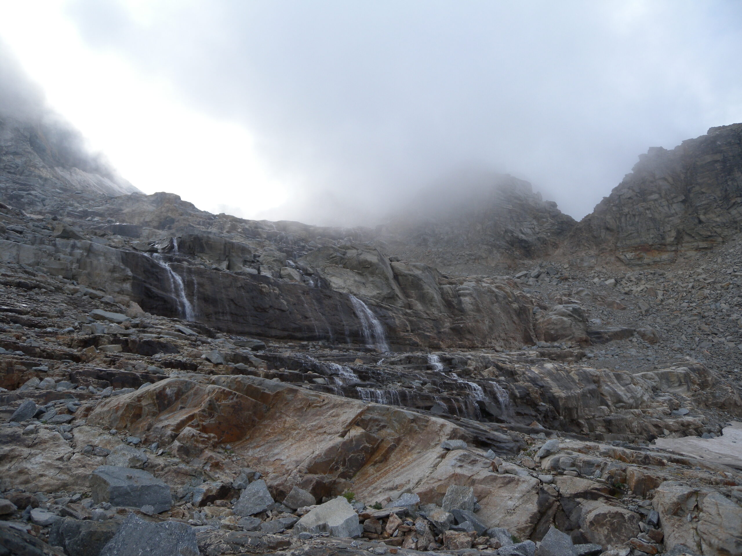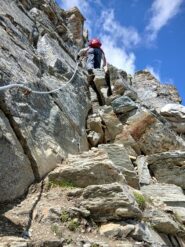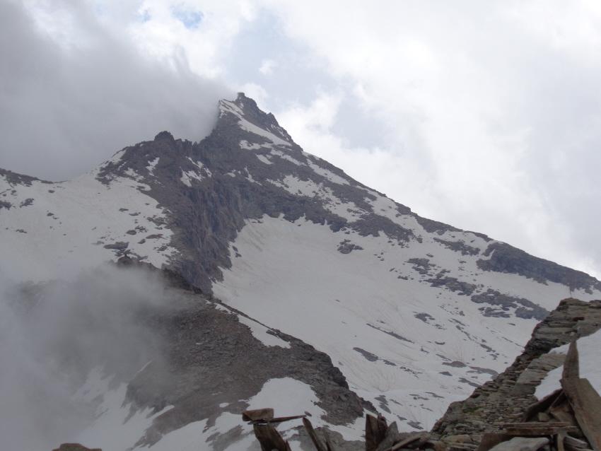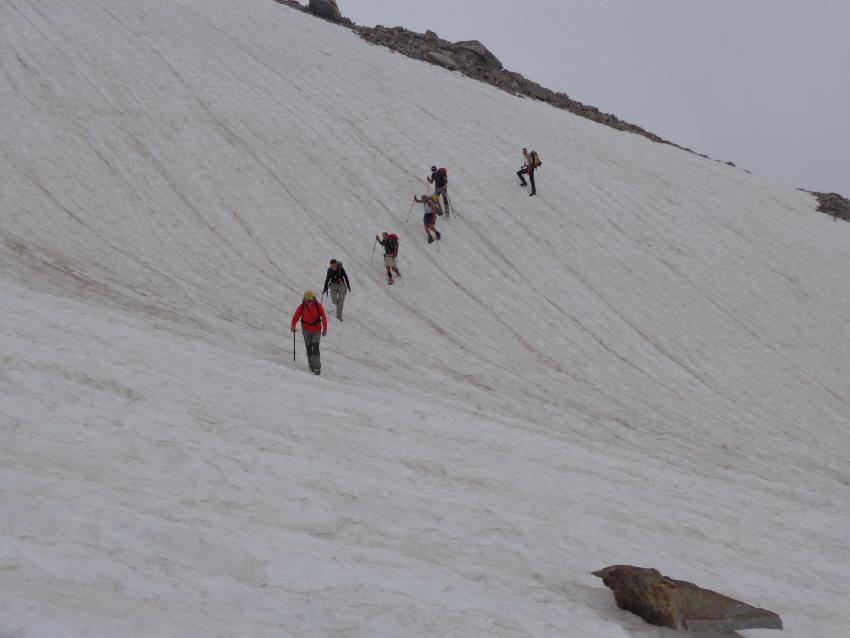 Su sentiero sempre ben segnalato si prosegue fino a passare sotto al ghiacciaio tra la cima d’oin e la quota 3183. Si attraversano alcuni rivoli d’acqua su rocce montonate e poi alcuni nevai e morene che coprono una parte del ghiacciaio occidentale del Carro. Sempre seguendo i segni, si perviene ad un secondo tratto attrezzato che permette di superare una prima balza rocciosa. Il colle del carro è ormai ben visibile e riconoscibile da una evidente palina indicatrice. Su tratti più ripidi si giunge sotto al colle che sembra quasi verticale sopra la nostra testa. Un ultimo tratto attrezzato conduce al colle.
