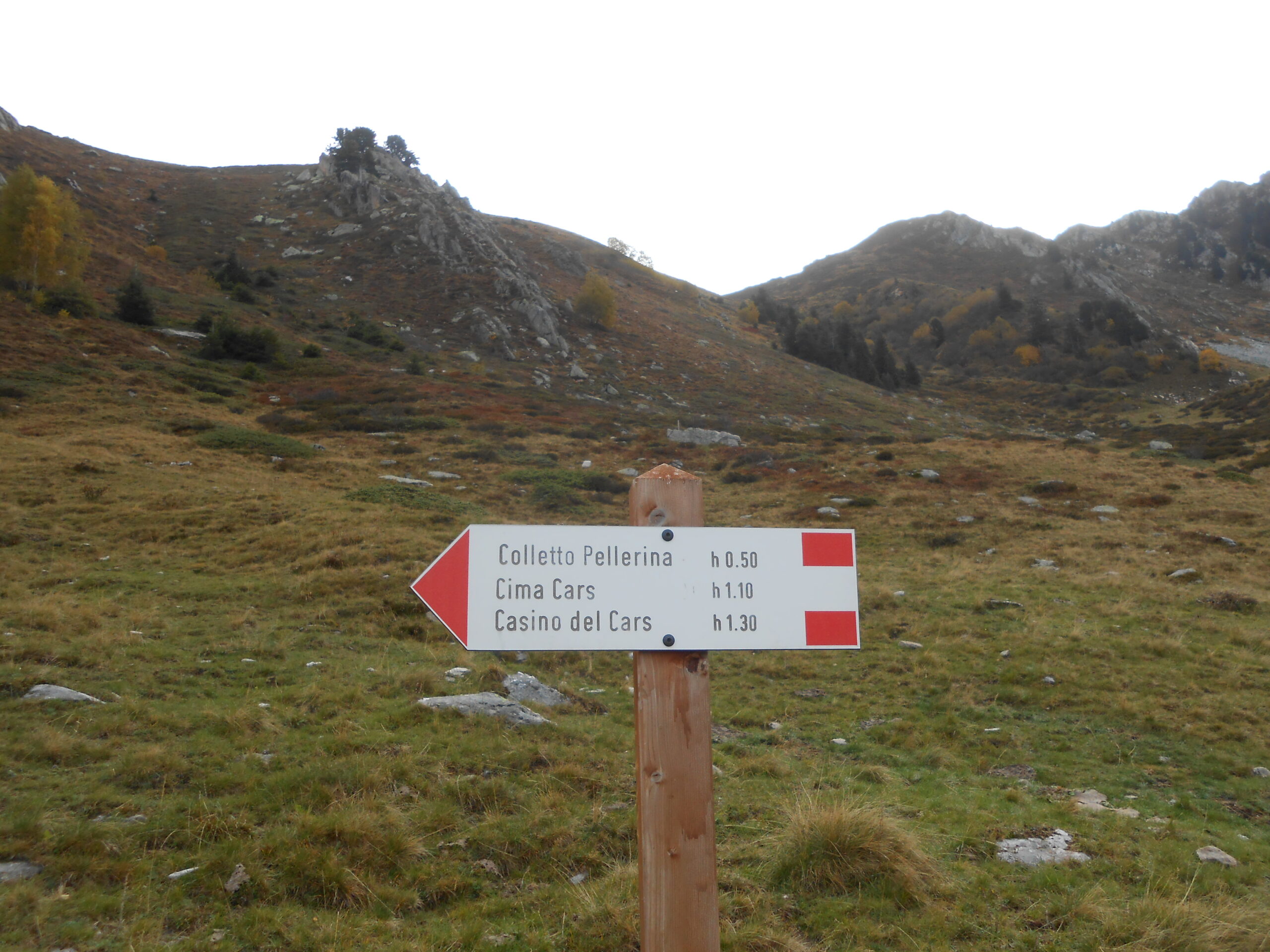 Itinerario consigliato in veste autunnale. Il tratto superiore, dal Gias Serpentera Soprano al Colletto Pellerina, è stato di recente segnalato con nuove tacche bianco-rosse, che poi proseguono sul pendio Ovest del Cars fino alle vetta. La quota massima, corrispondente allo spuntone fessurato, è indicata 2217 m dalla carta IGM, mentre il punto 2204 m è poco più a Est, dove c’era un vecchio cippo trigonometrico. Sulle rocce sommitali sono incise diverse firme di pastori, oltre alla croce del confine comunale con le iniziali di Chiusa e Roccaforte.