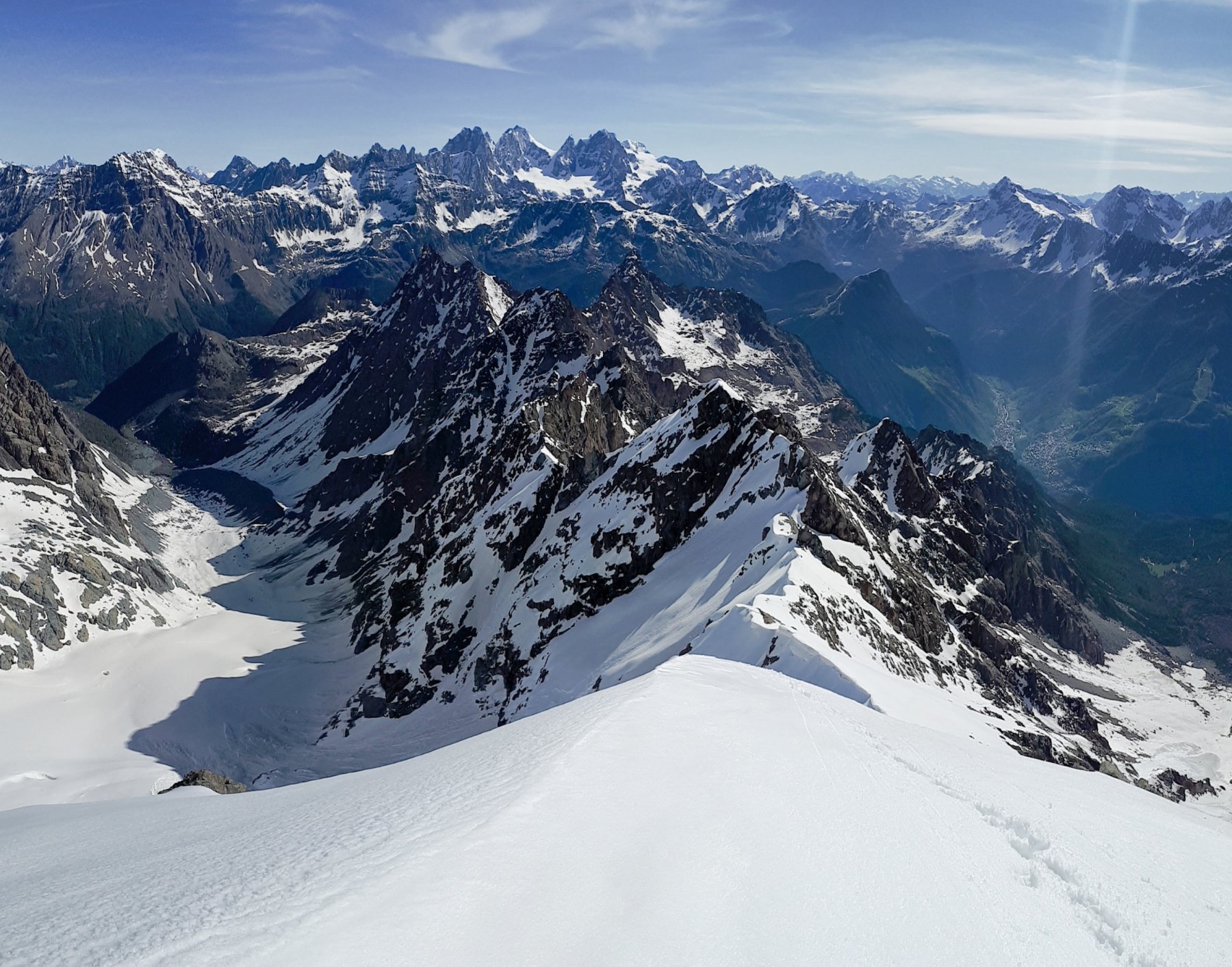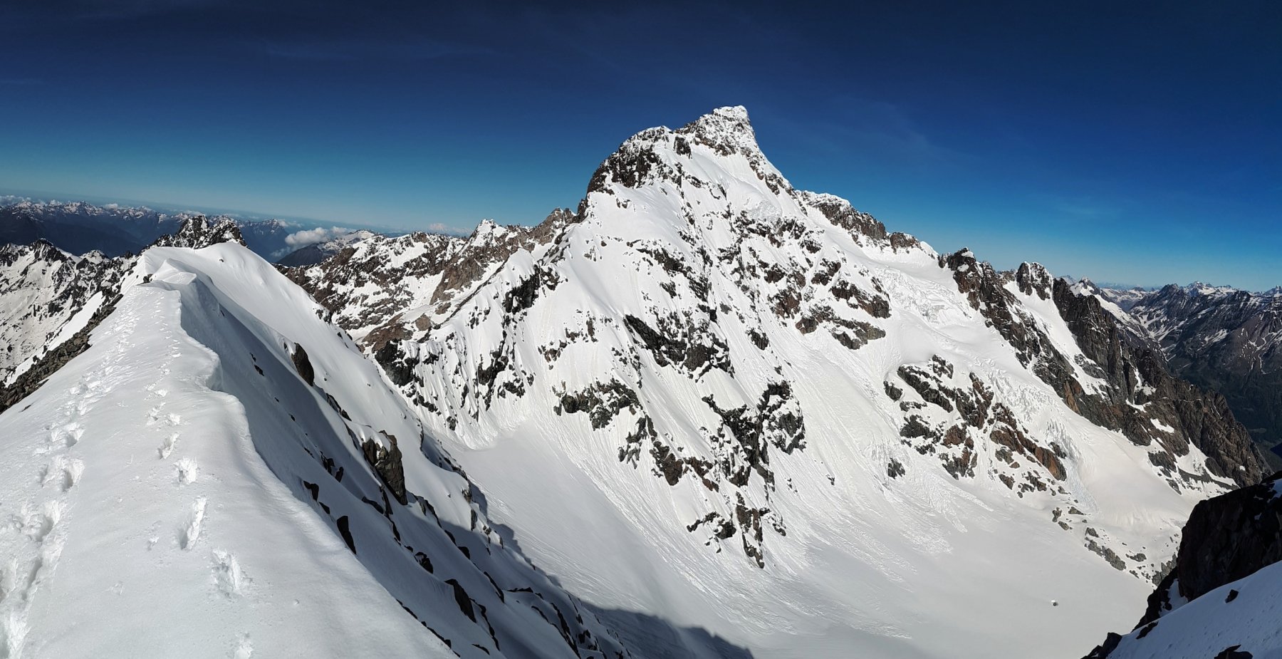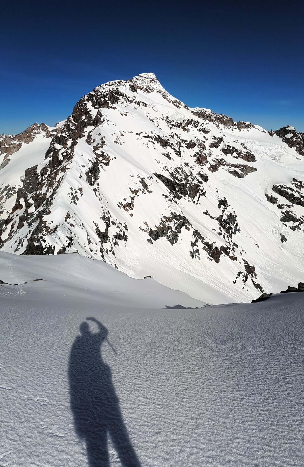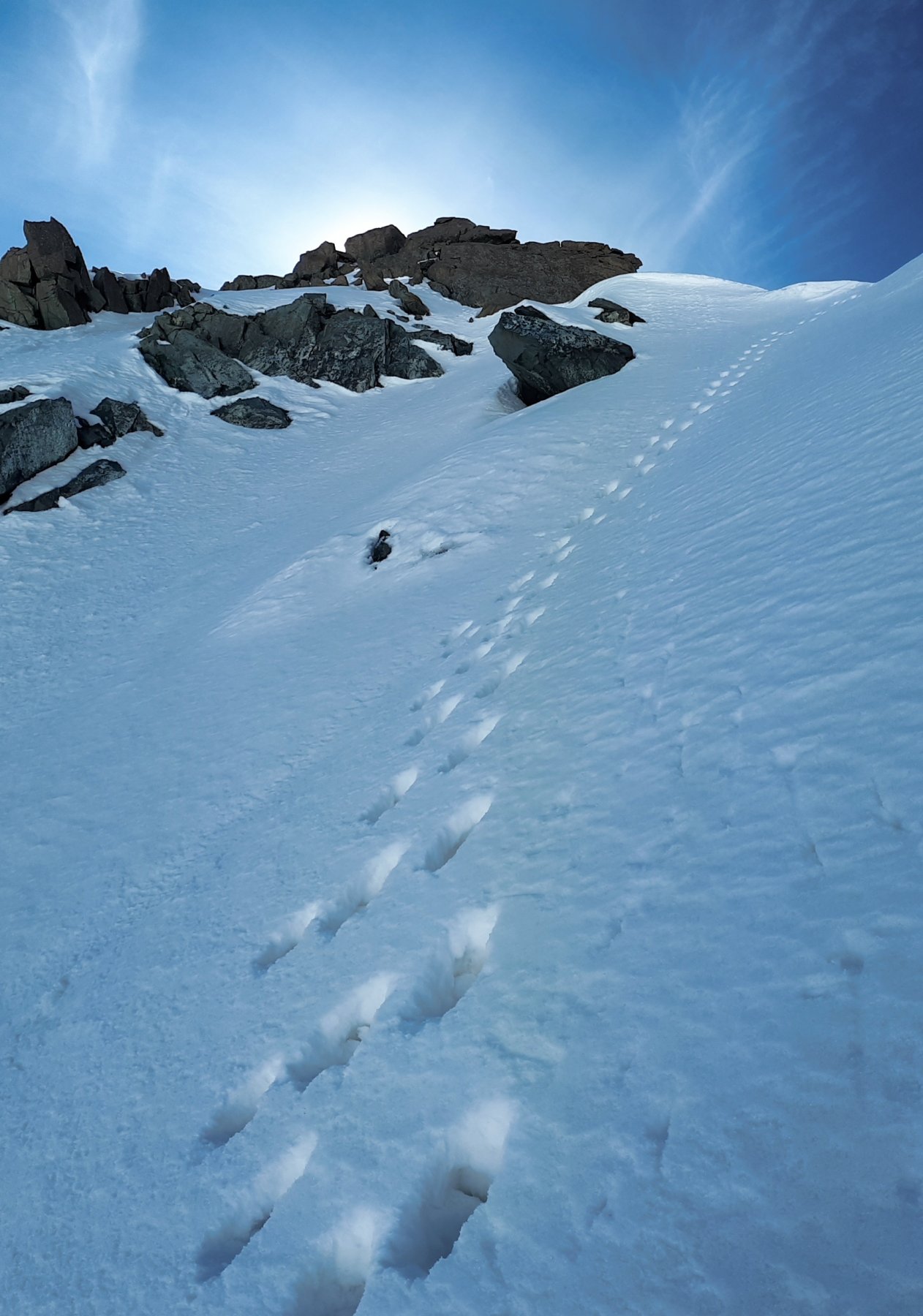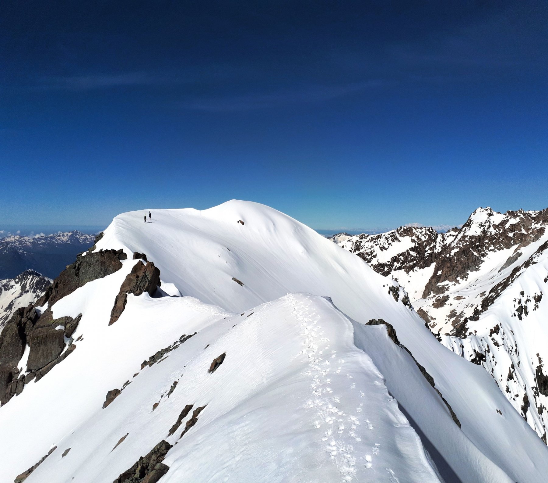 Da qui seguire la cresta rocciosa che può presentare difficoltà diverse a seconda dell’innevamento. Dopo un paio di salti, la pendenza diminuisce e la cresta diventa nevosa ed estetica. Da qui facilmente in pochi minuti fino in cima.
