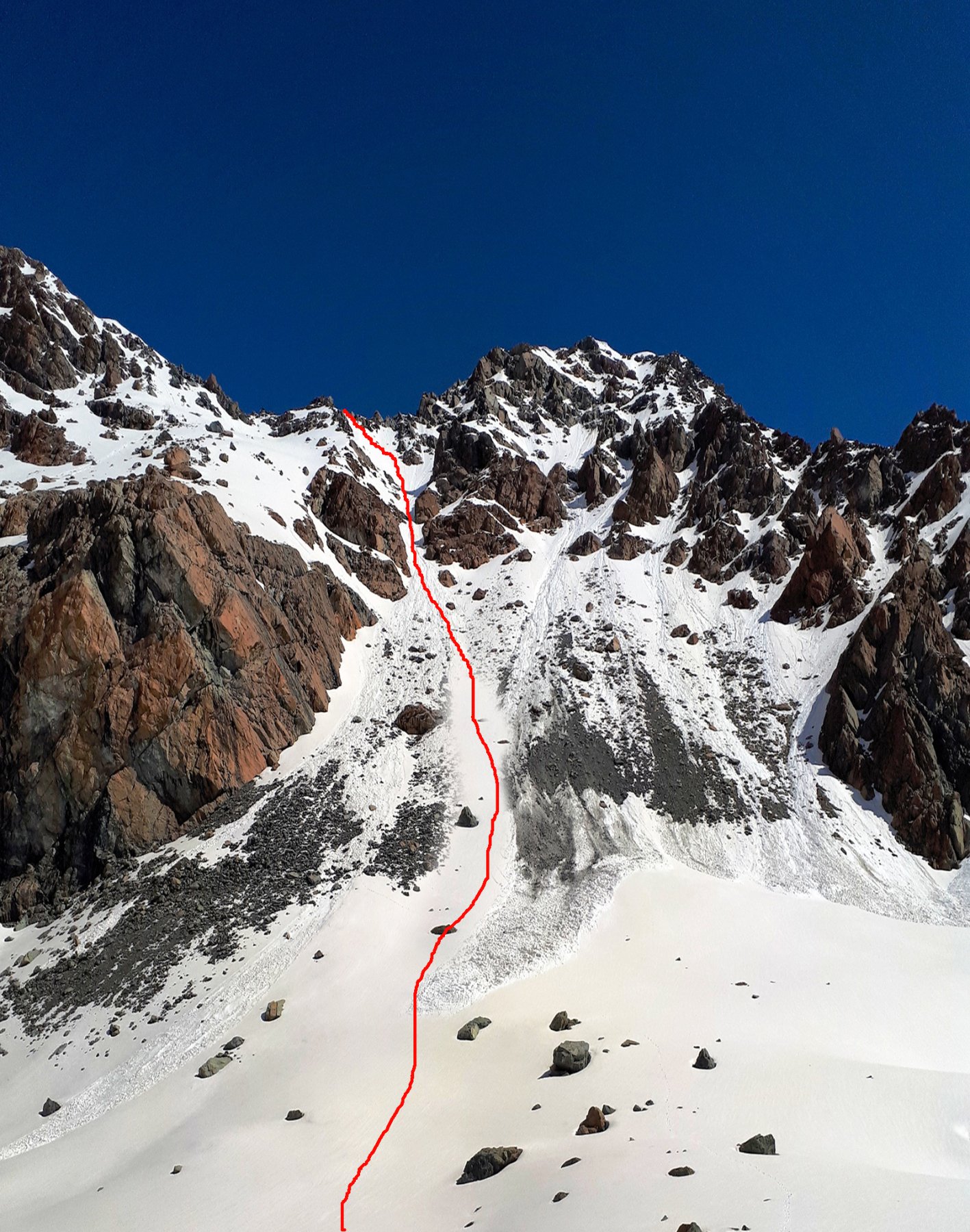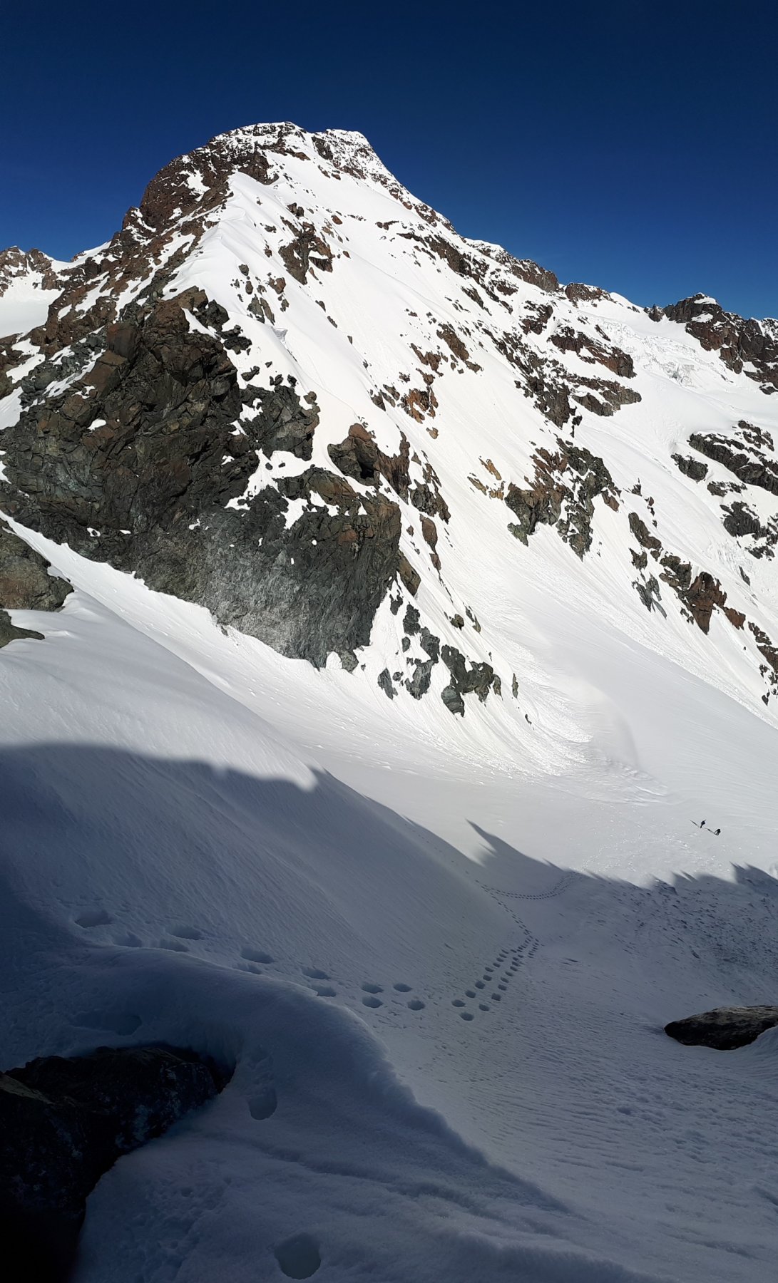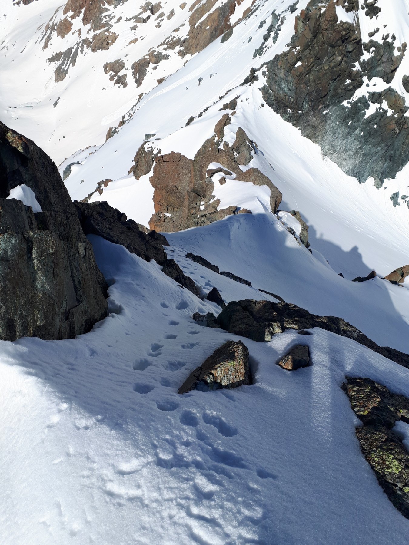 Raggiunto il passo, evitare di scavalcare i vari denti rocciosi a destra, ma di scendere una ventina di metri sul ghiacciaio del Ventina per poi spostarsi verso la cima e risalire un canalino nevoso fino ad una forcella.