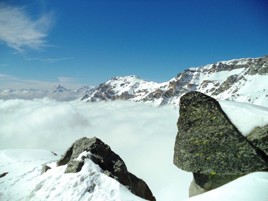 Salito da Eclause su traccia con molte varianti, soprattutto sui pendii superiori. Buon rigelo notturno al mattino e neve molle solo fuori dalla traccia nel bosco. I pendii superiori sono davvero uno spettacolo: lisci e uniformi solo con qualche roccione che spezza la monotonia, peccato però che una volta arrivato in vetta si sia coperto tutto e abbia fatto gran parte della discesa (fino alla parte bassa del canale) in completo white-out con visibilità non pessima… peggio ancora, per fortuna per l’appunto che ci sono i roccioni così da poter prendere qualche riferimento. In alto neve strana: crosta/farinaccia umida, stando dove ci sono le vecchie tracce rigelate di ieri non era malaccio alla fine. Dopo 150/200m firn perfetto ben mollato per tutto il “canale” fino al fondo sotto la bergeria, in alto sciata controllata a causa della nebbia ma in basso belle contro-pendenze e terreno da snowpark naturale: gobbe, saltini, molto divertente. Da sotto l’alpeggio seguito la sterrata che riporta ad Eclause (un solo vero togli/metti, 5/6 passaggi con 2-3m senza neve fattibili con attenzione sci ai piedi). Gita assolutamente da ripetere con condizioni di visibilità migliori.
