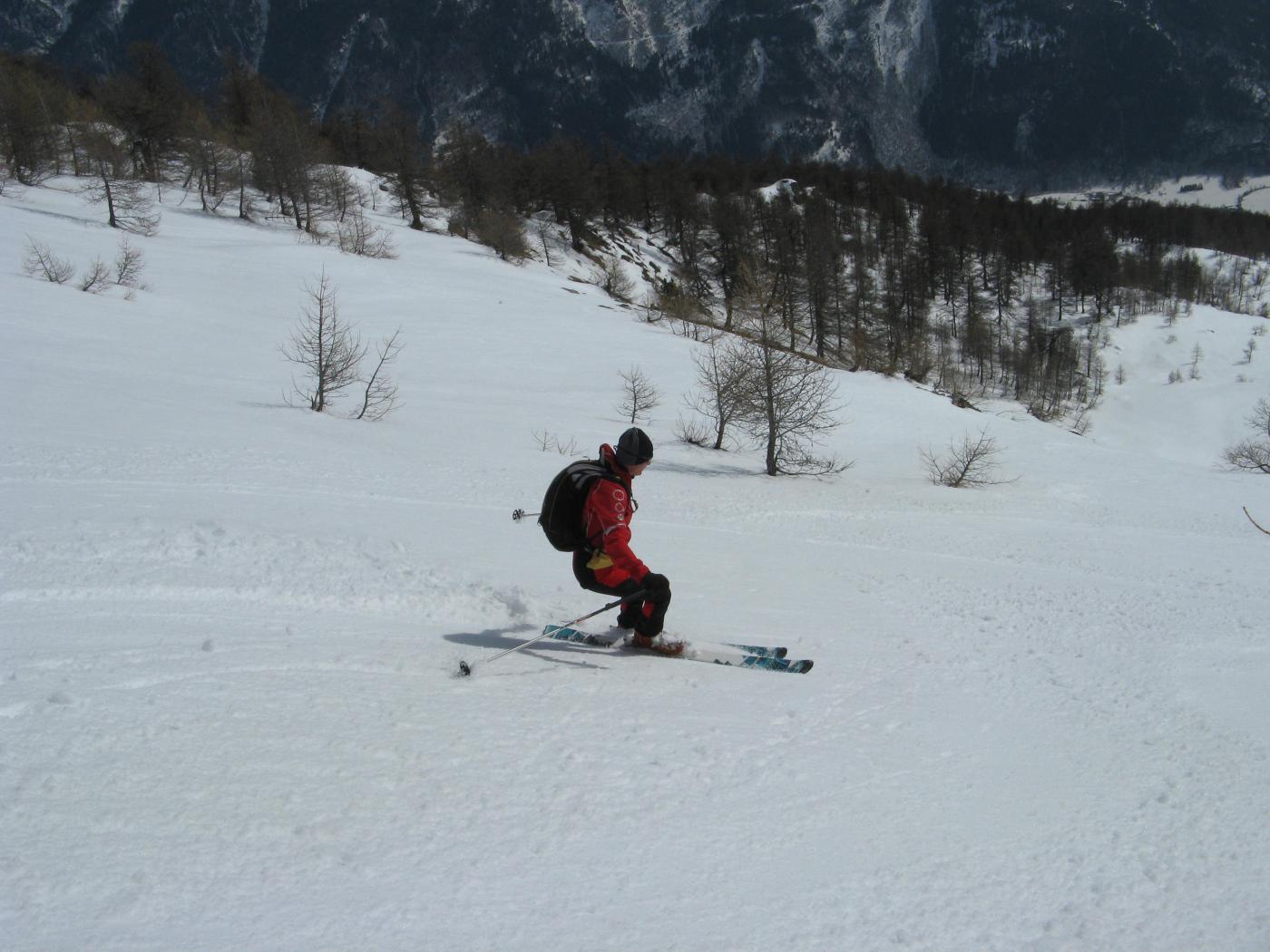 Giornata molto calda, un pò meglio sopra i 2300 con una brezzolina rinfrescante;si parte sci ai piedi dalla macchina, strada con qualche interruzione nei primi 200 mt.di dislivello poi neve continua.Saliti nel bosco Davalle con neve un pò al limite all’inizio poi buona. Condiviso la salita con il gruppo Mountain che saluto. Scesi tenendoci tutti a dx. in un canalone che porta alla borgata Caselle con neve primaverile un pò sfondosa all’inizio poi primaverile ottima sin quasi alla borgata;poi tutto a sx su strada con brevi tratti scoperti e ultimi prati prima della macchina ottimi. Se continua questo caldo la strada iniziale durerà poco.
