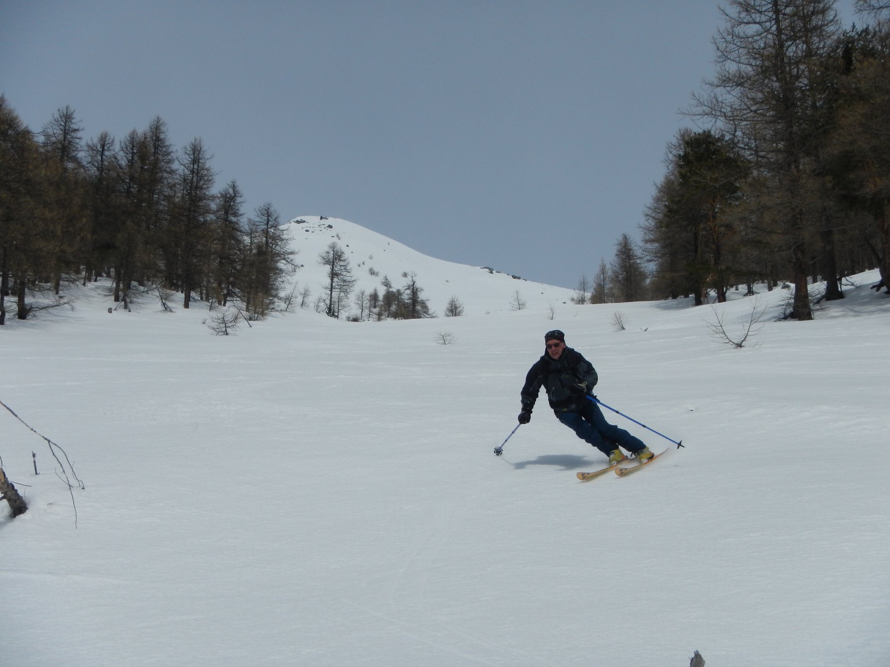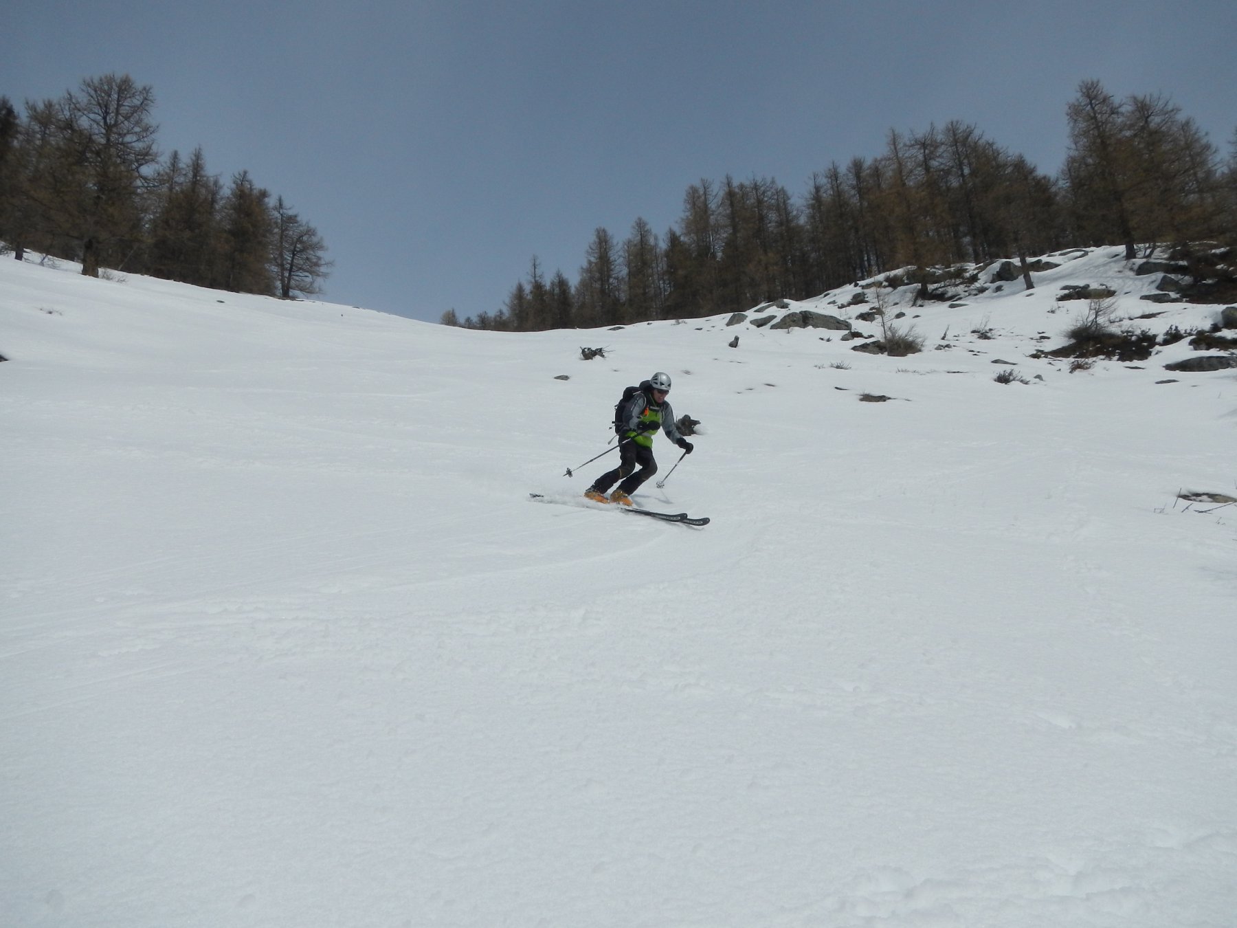 Prima parte della discesa (circa 200 m.) su crosta non portante e difficile da sciare poi neve bella, inizialmente crosta portante e poi primaverile, nel lungo e lineare vallone, con pochi e radi larici, esposto a sud ovest e percorso fino alle Grange Lacù a 1725 m.