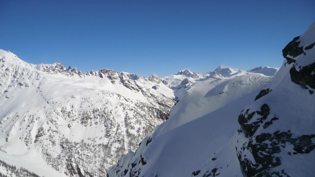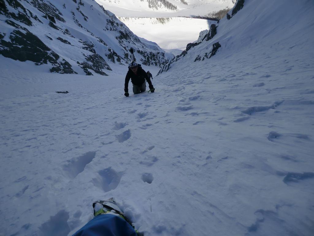 il conoide del canale si trova tra il petit davin e il davin,per uscire alla breche ci sono 50m di arrampicata su misto
